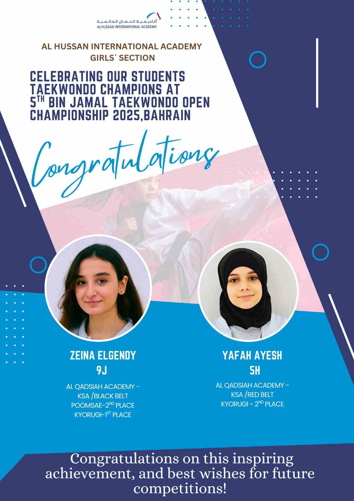 At the Academy – Girls’ Section, we proudly celebrate our students’ outstanding achievements at the 5th Bin Jamal Taekwondo Open Championship 2025 – National Day (Bahrain) .