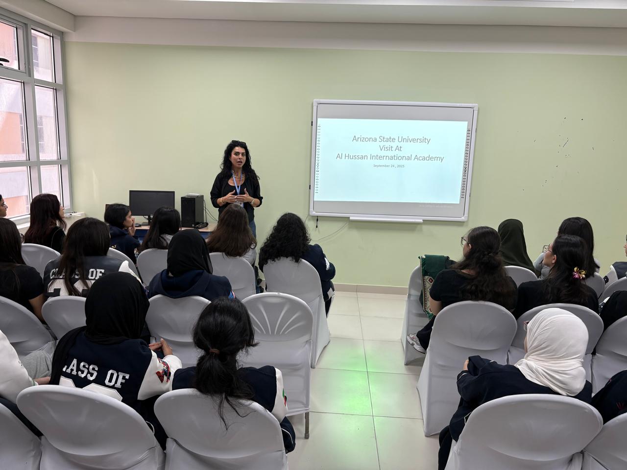 Arizona State University (ASU), one of the top-ranked public universities in the United States, visited Al Hussan International Academy HIA on 24-9-2025. The event, held on campus, featured an in-depth college counseling session from Grade 11 and Grade 12.