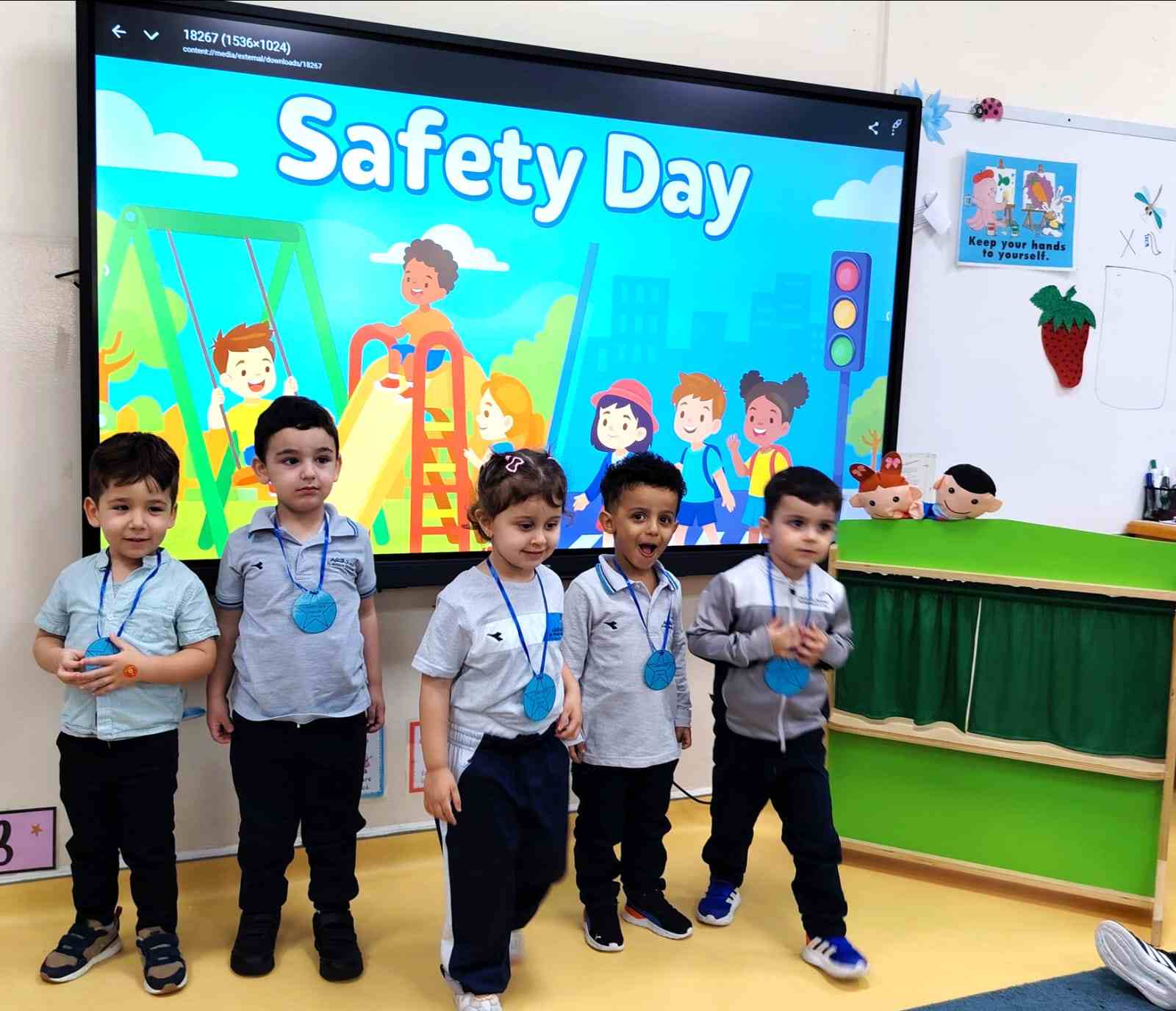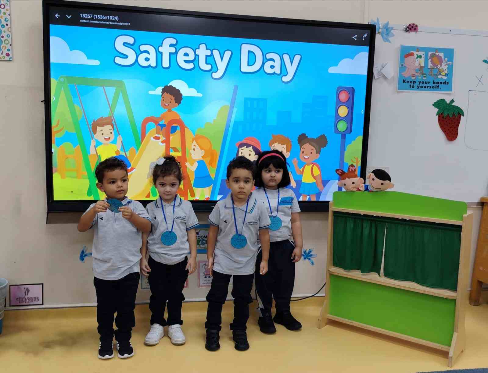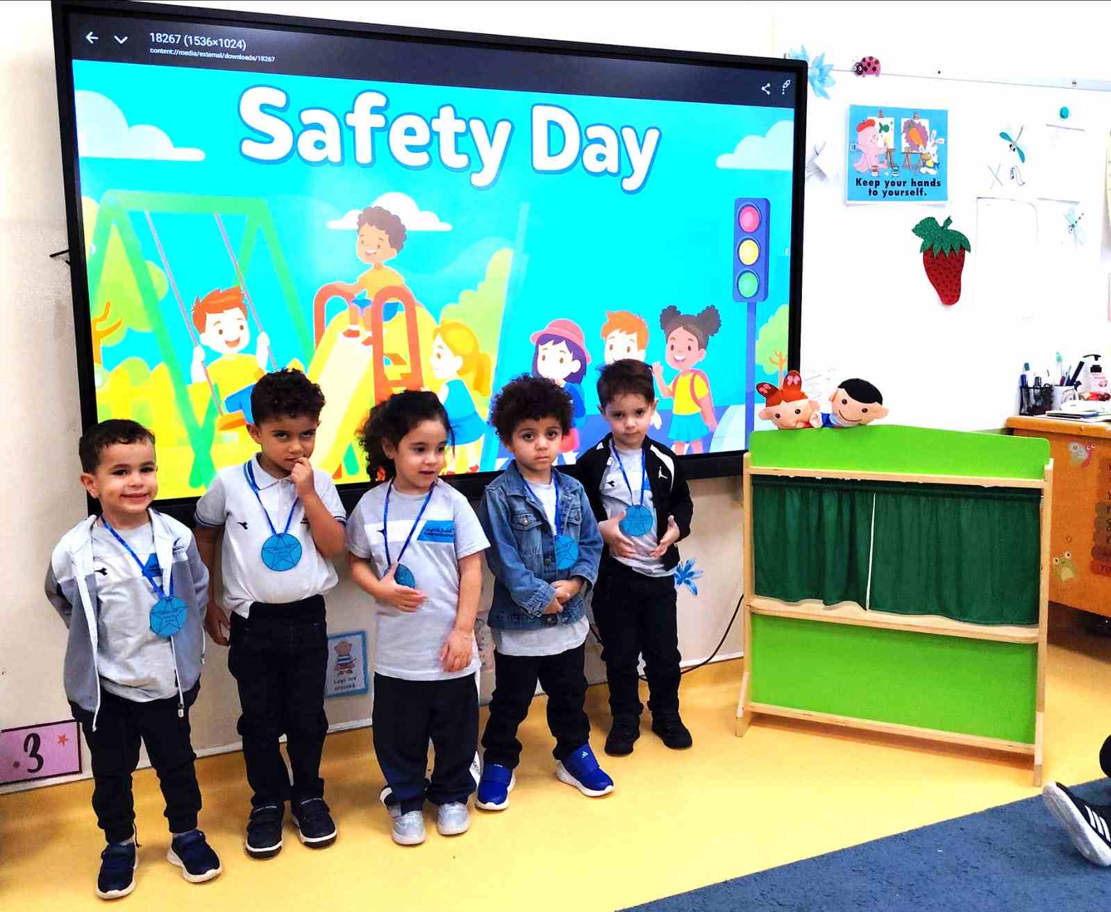 Kindergarten students participated in a fun and educational Safety Day, focusing on important safety topics related to classroom, playground, home, strangers, road, and transportation.