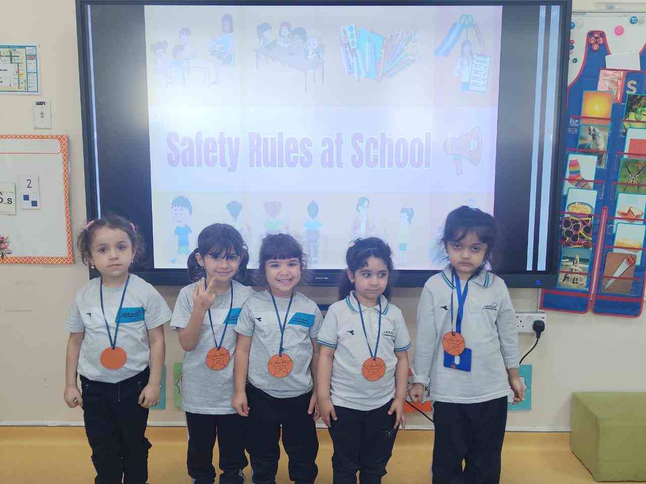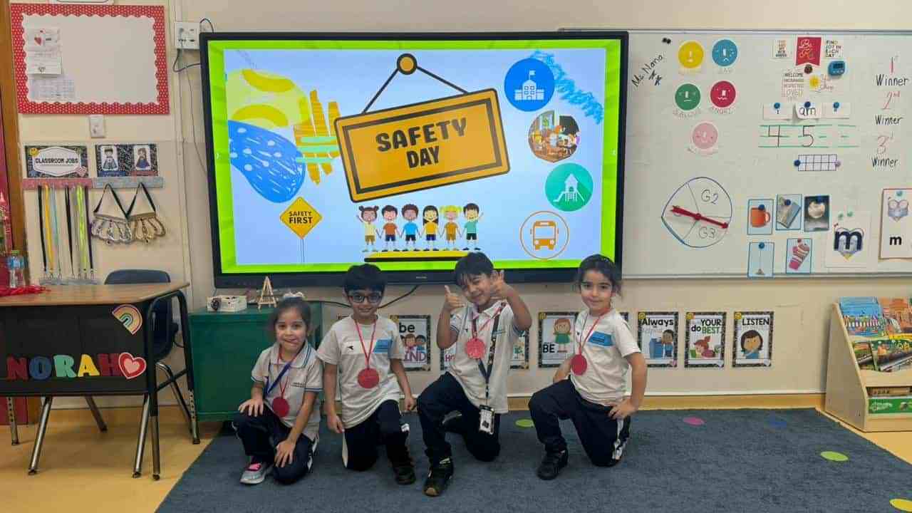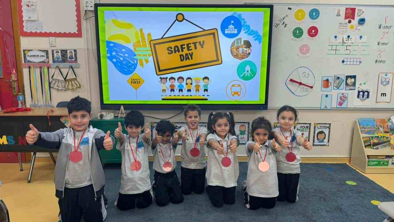 Kindergarten students participated in a fun and educational Safety Day, focusing on important safety topics related to classroom, playground, home, strangers, road, and transportation.