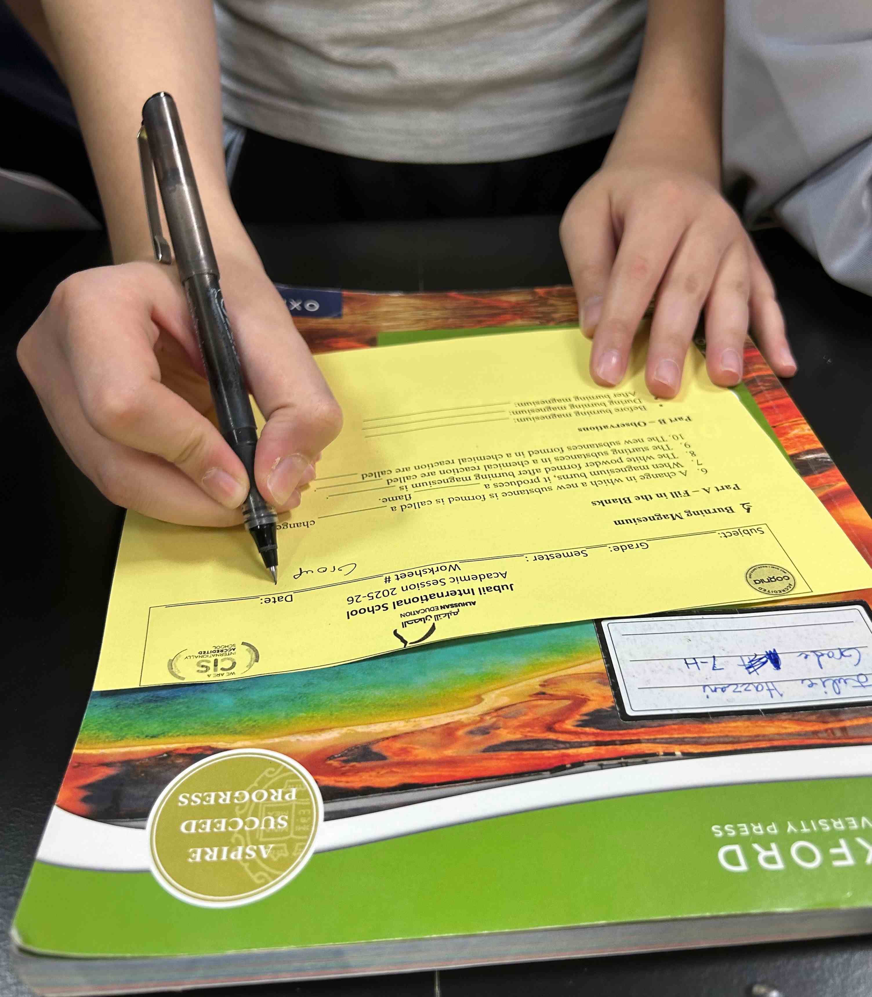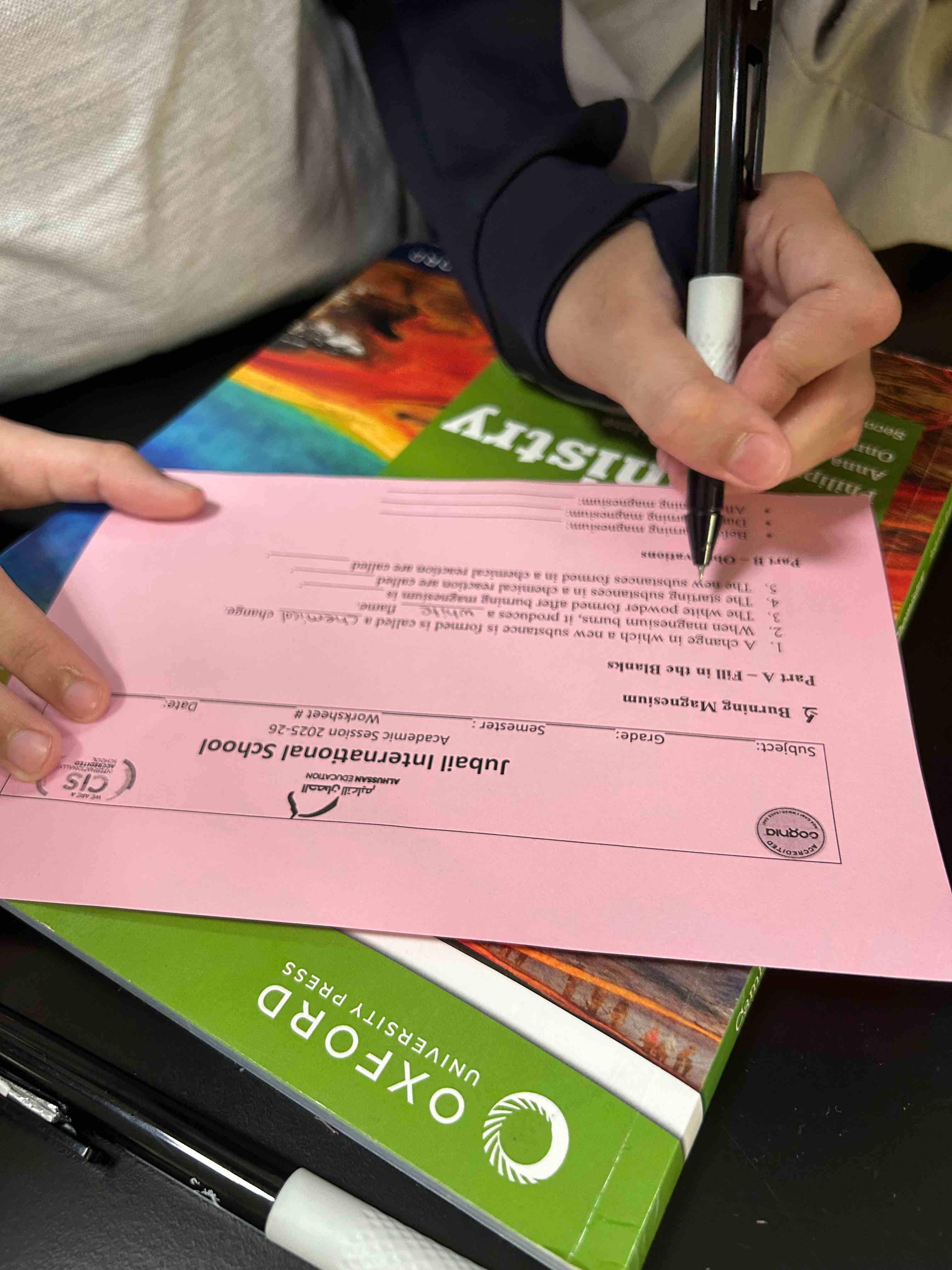Grade 7 girls observed the burning of magnesium ribbon during their lab session and reinforced their learning with a worksheet.