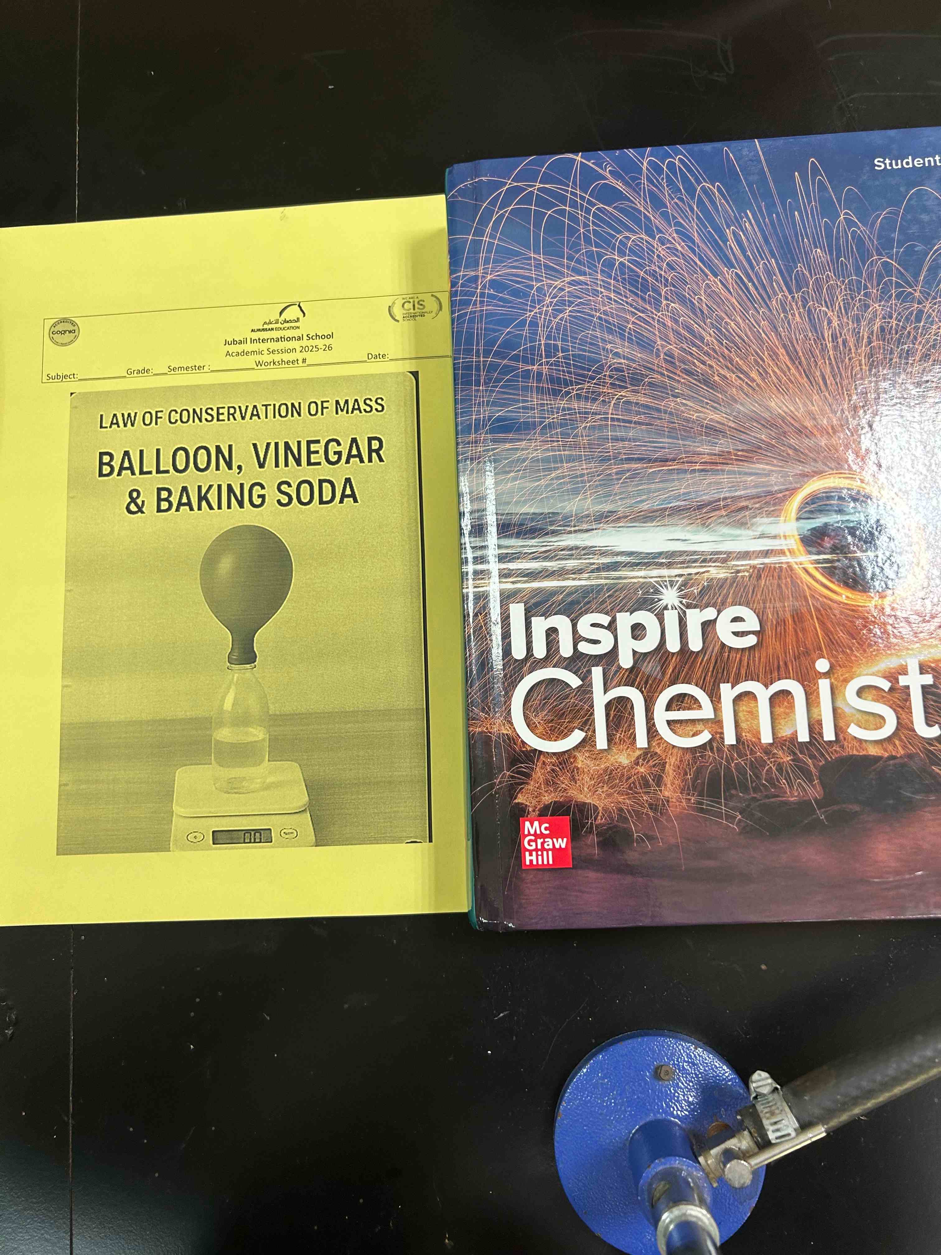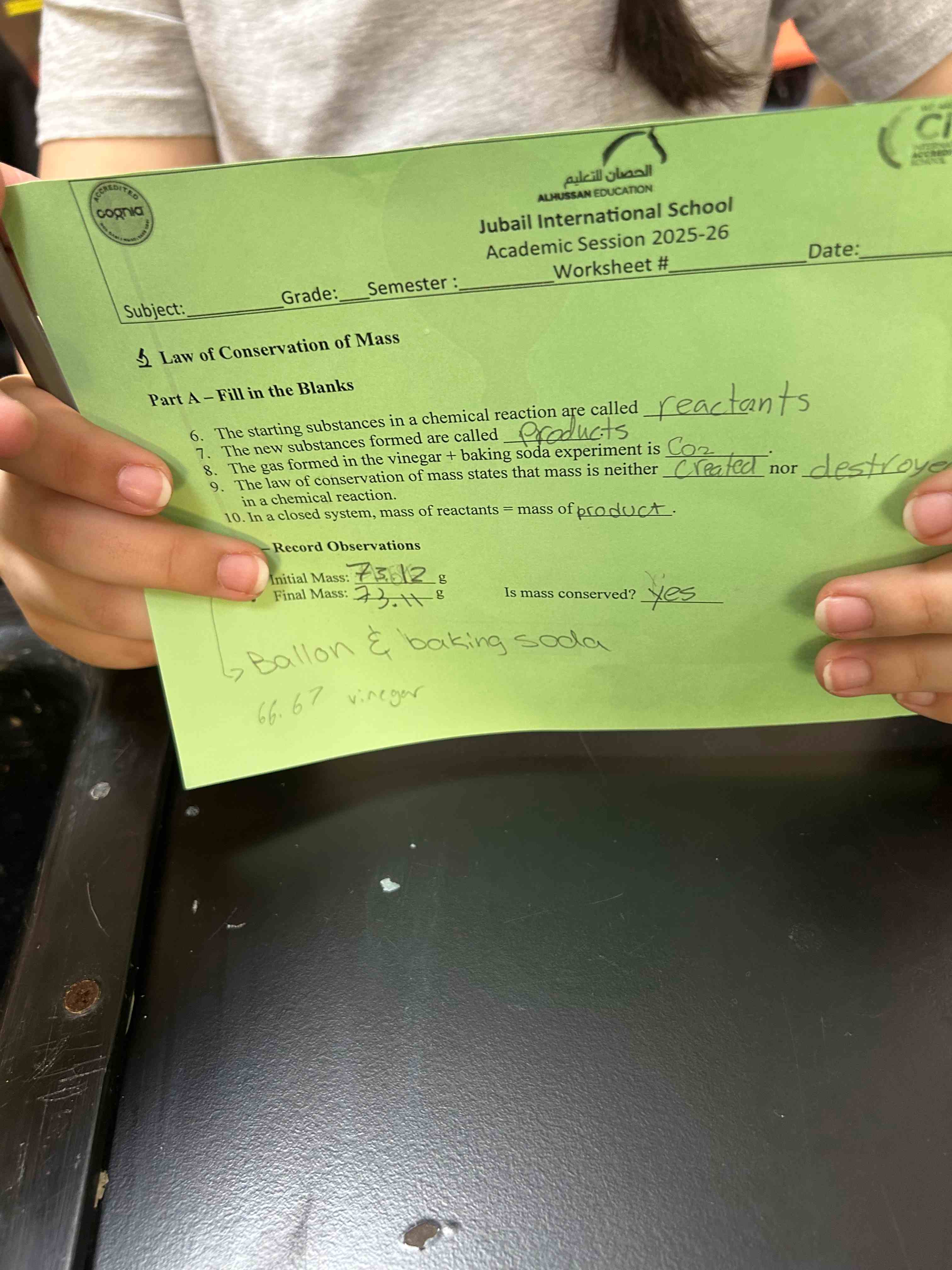 Law of Conservation of Mass, Grade 9A took a part in Lab activity on 1st October. They did a reaction with Baking Soda and Vinegar to check the mass of Reactants is equal to mass of products. They also re-boost their knowledge by solve an activity after the lab.