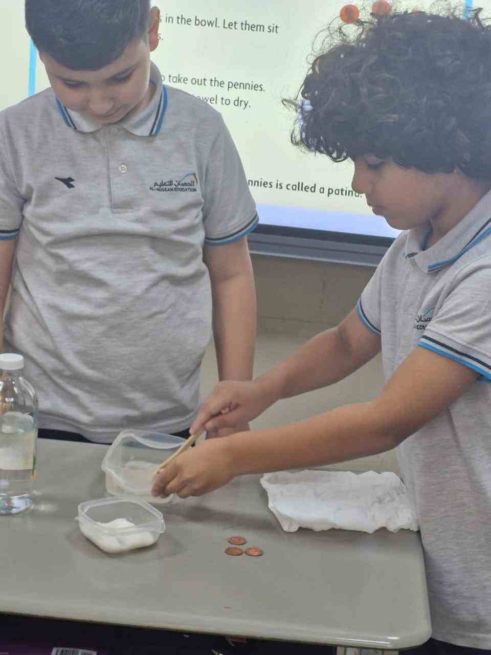The Statue of Liberty is made of copper, and when it was first built, it had the same color as a penny. Over time, exposure to the weather caused a green layer, known as patina, to form on its surface. After reading the story "Why is the Statue of Liberty Green?", grade 3 students conducted an experiment to change the color of pennies, transforming them to match the Statue of Liberty's green patina.
