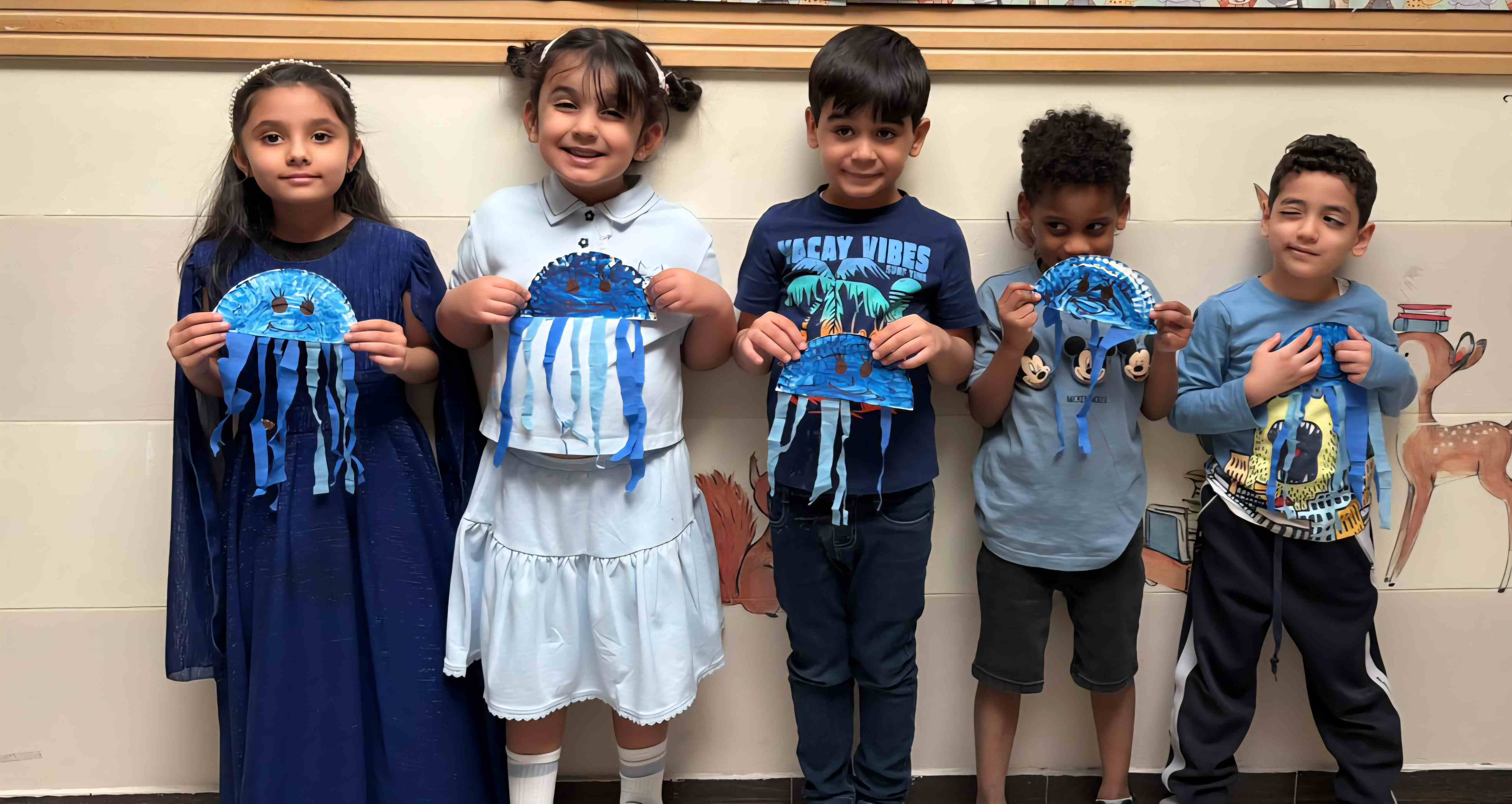 Our little learners participated in exciting hands-on activities such as fishing games, feeding the hungry shark, and creating lovely blue flowers using sponges. They also enjoyed rowing boats with straws, making rain with shaving cream and food coloring, and exploring blue bubbles to discover the magic of science and color.