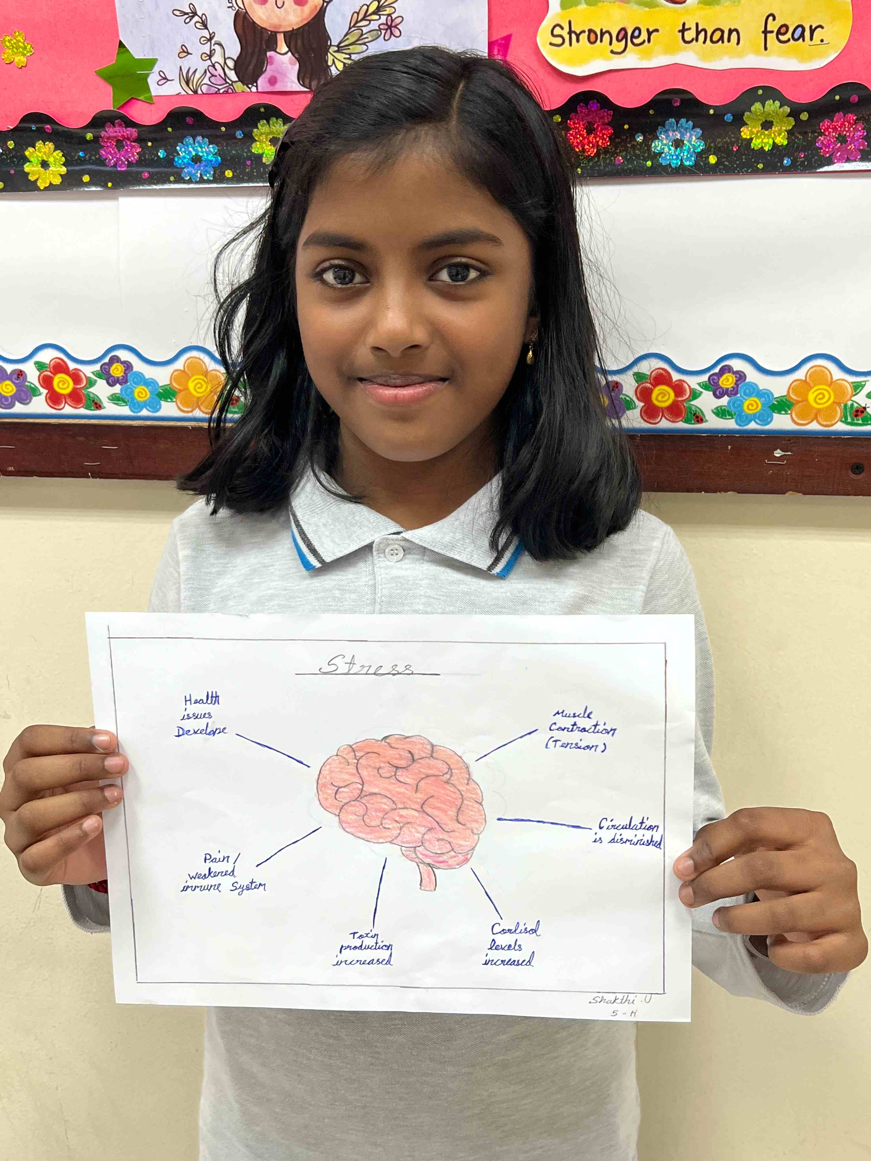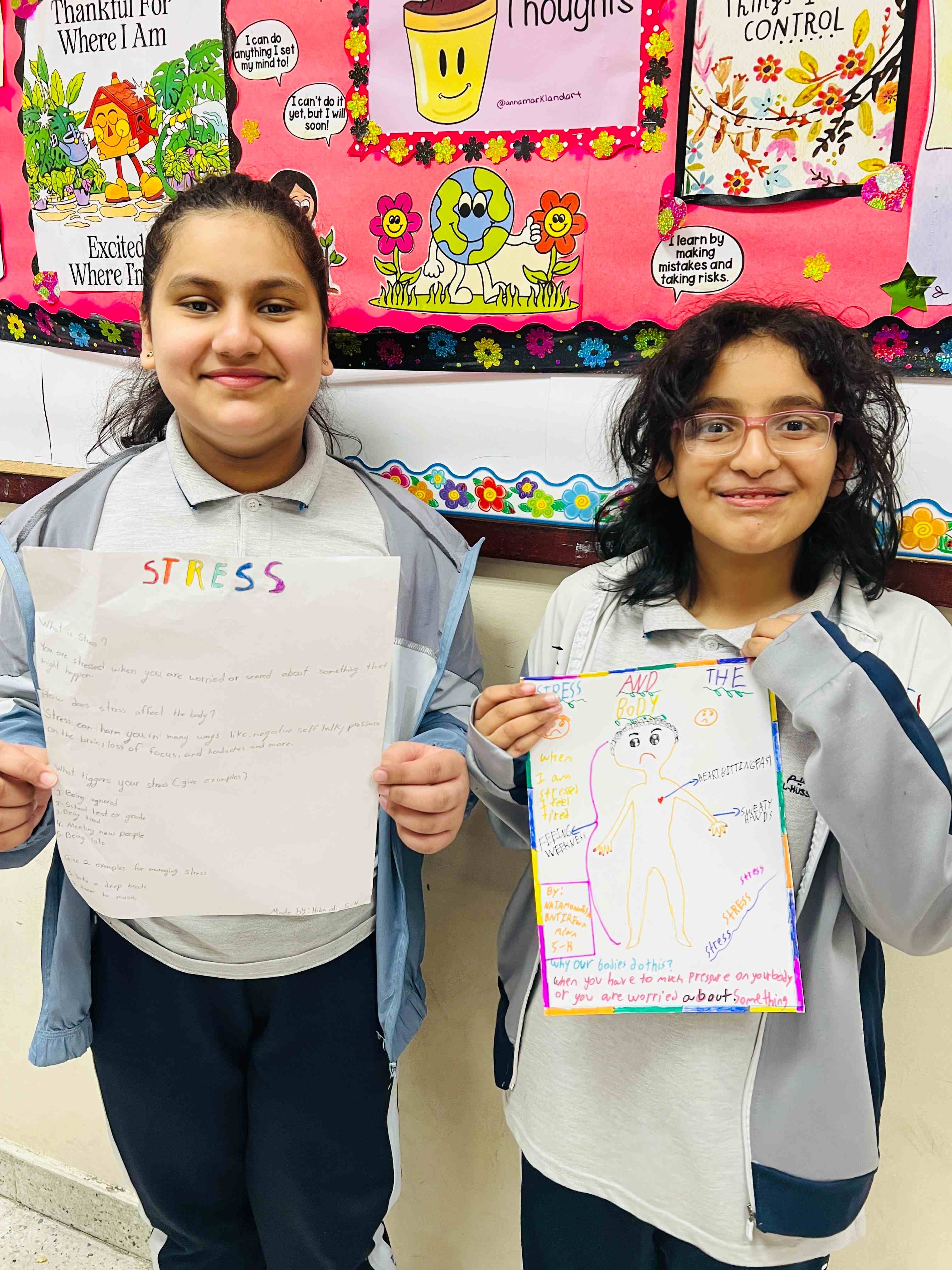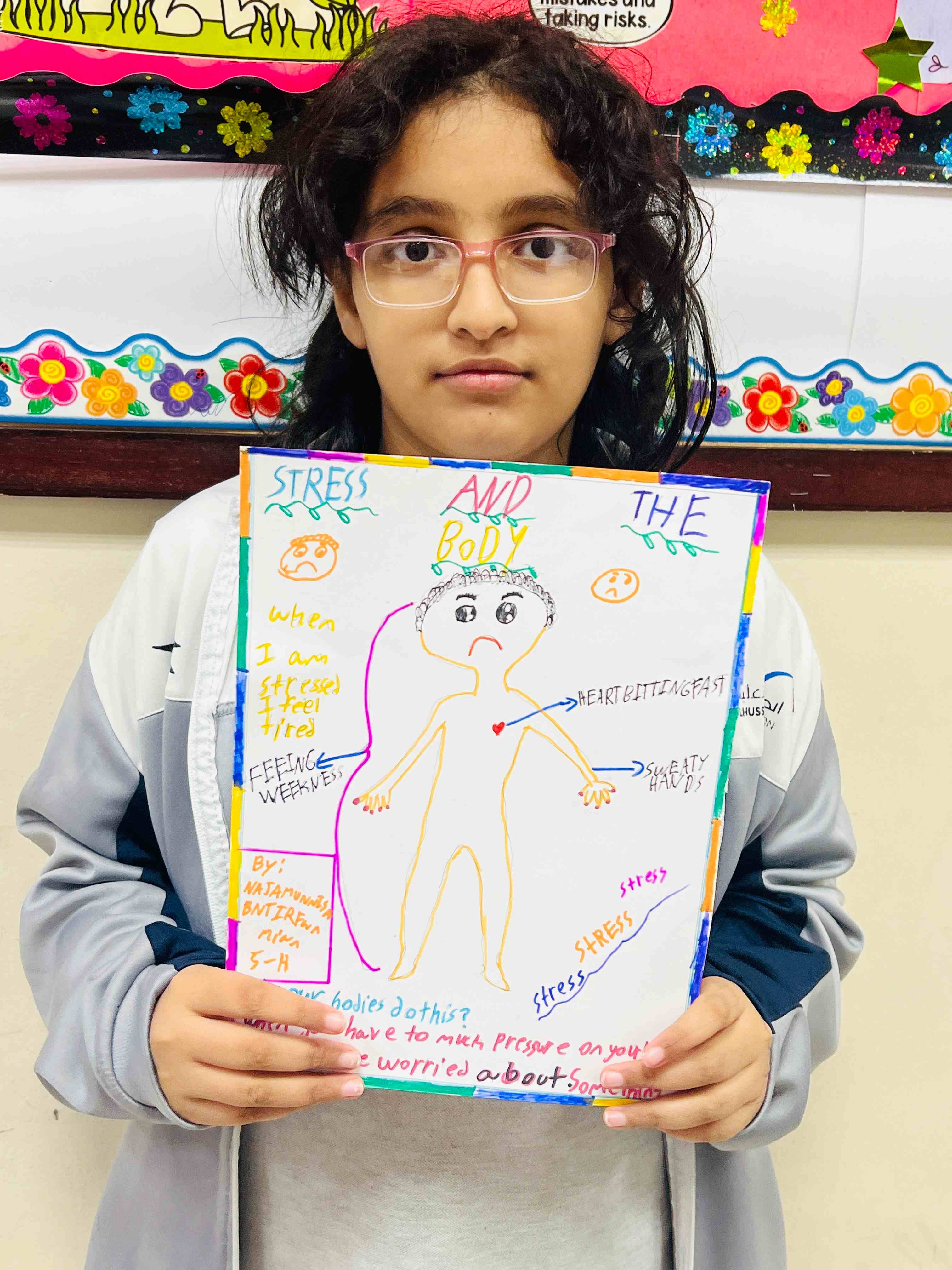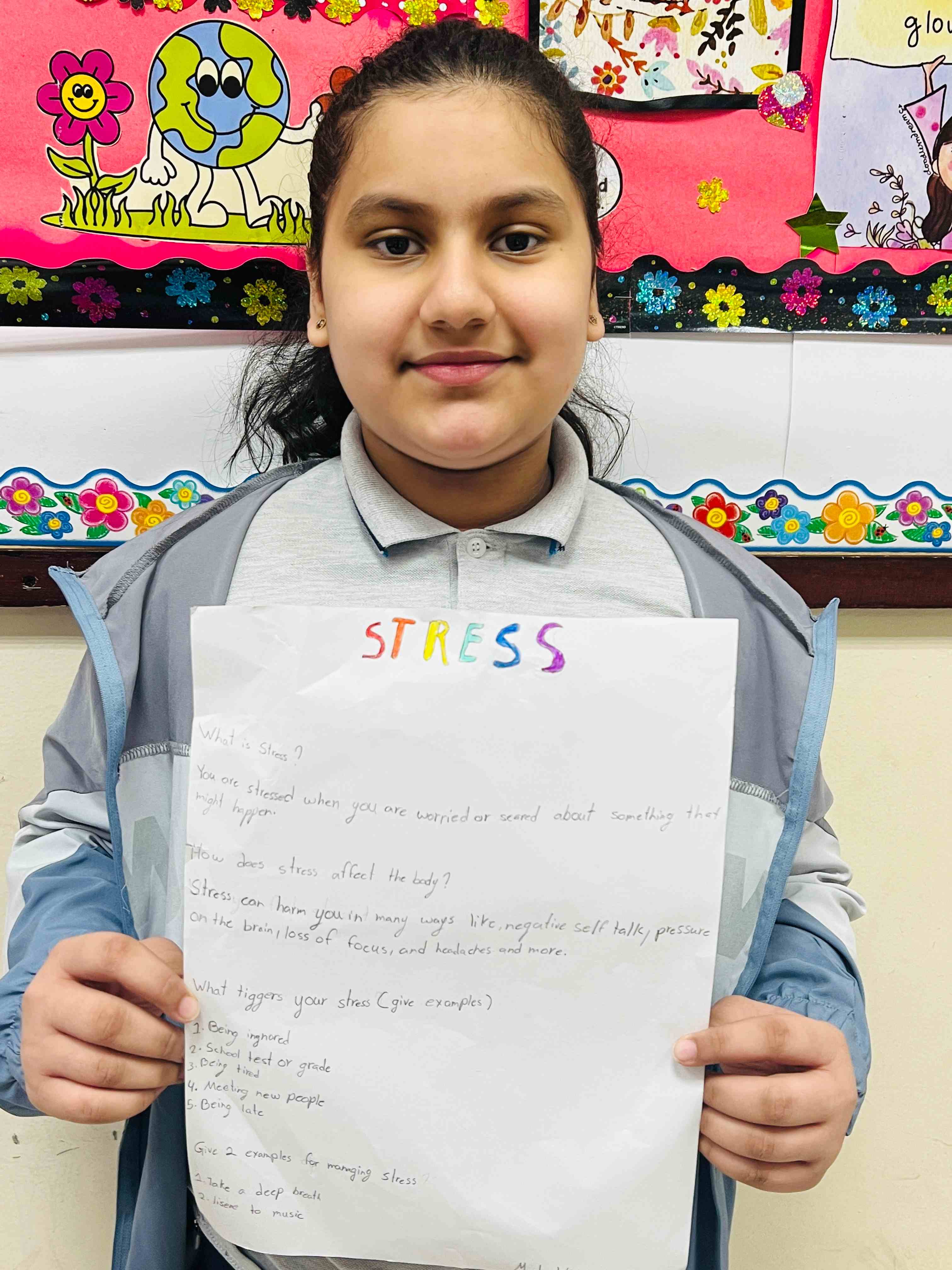 Are Grade 5 students took part in a well-being activity on stress management, creating colorful posters and charts to share positive ways to cope — like staying active, practicing mindfulness, and maintaining balance. The activity promoted creativity, open discussion, and self-awareness, highlighting the importance of emotional well-being