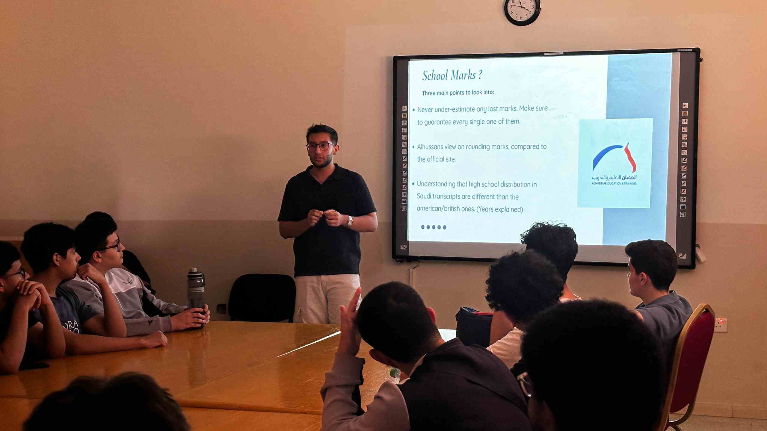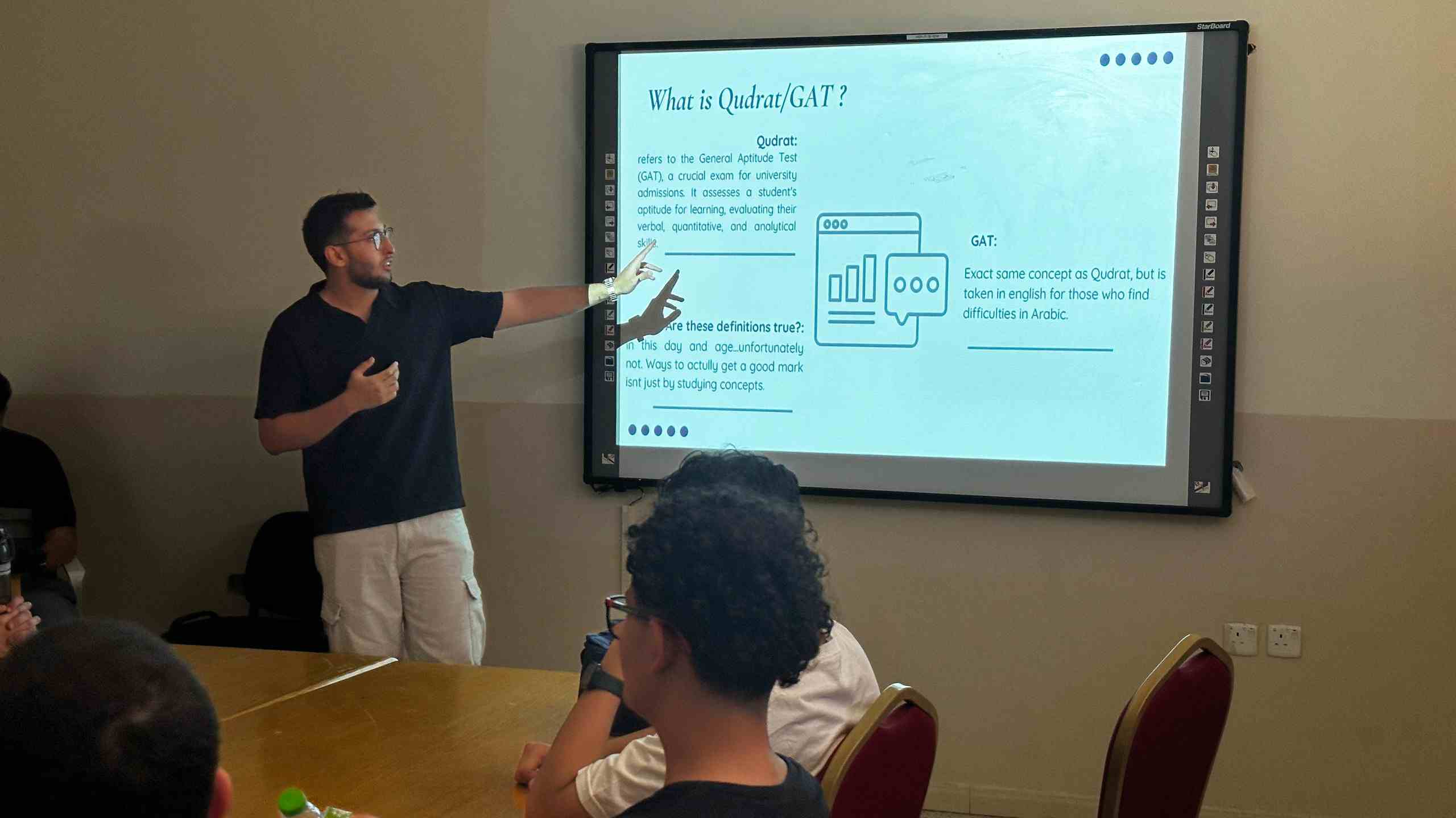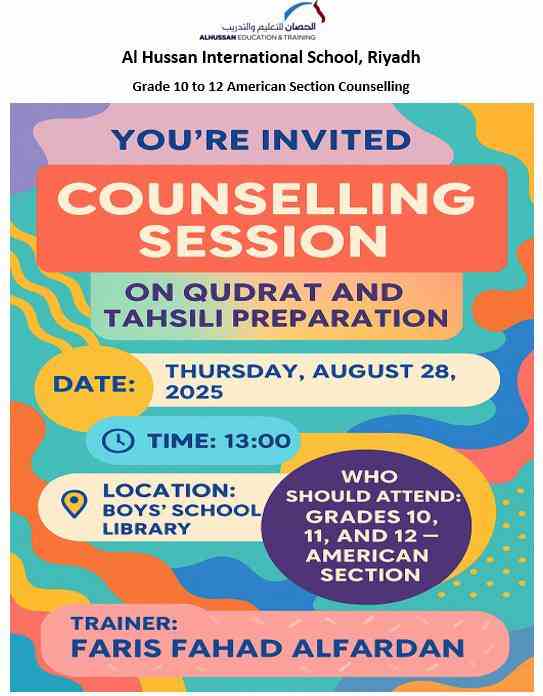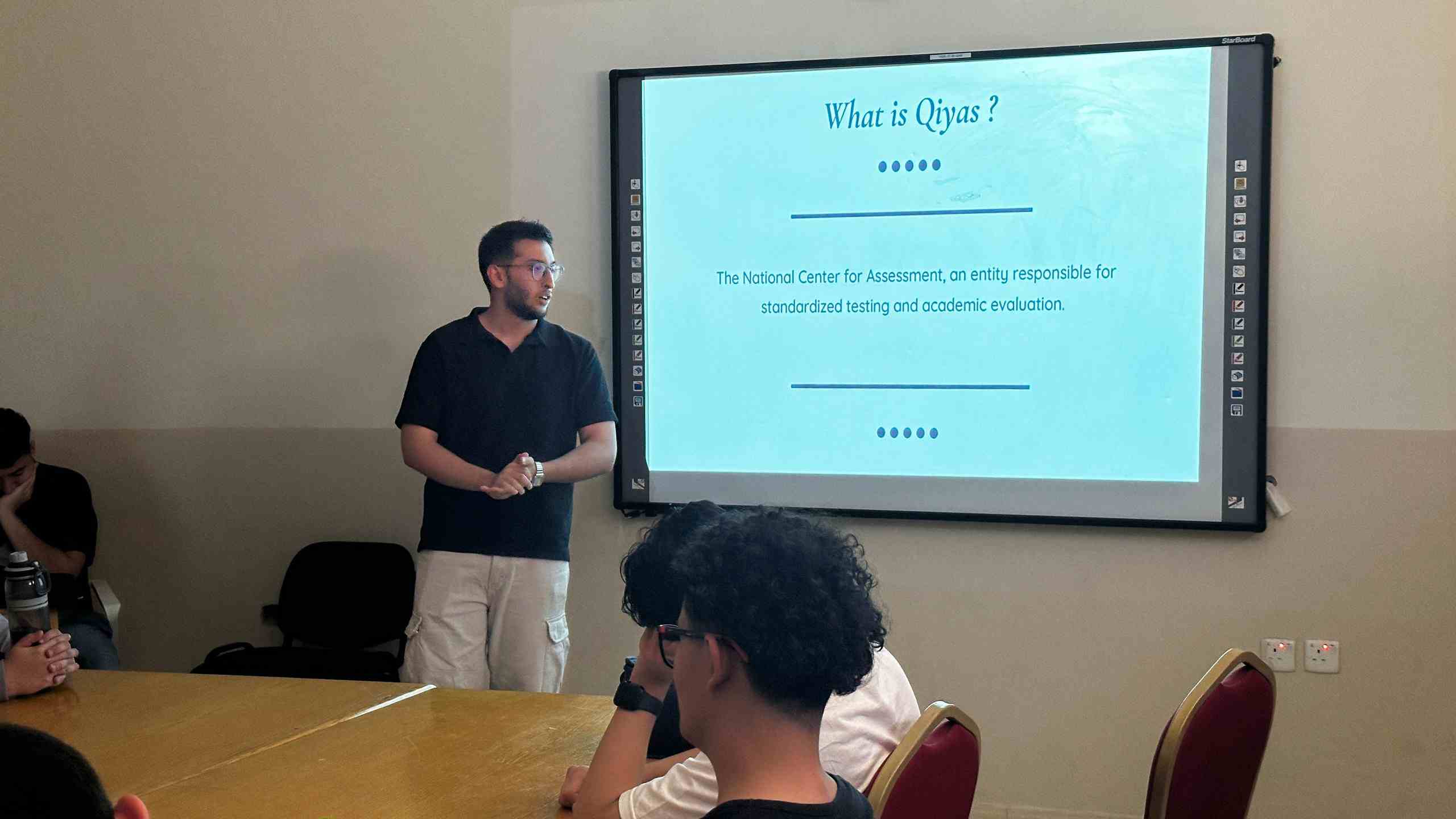 Our Grade 10–12 students attended a Counselling Session on Qudrat/GAT, Tahsili/SAAT, and SAT preparation, led by our outstanding graduate Faris Fahad Alfardan (Class of 2025).