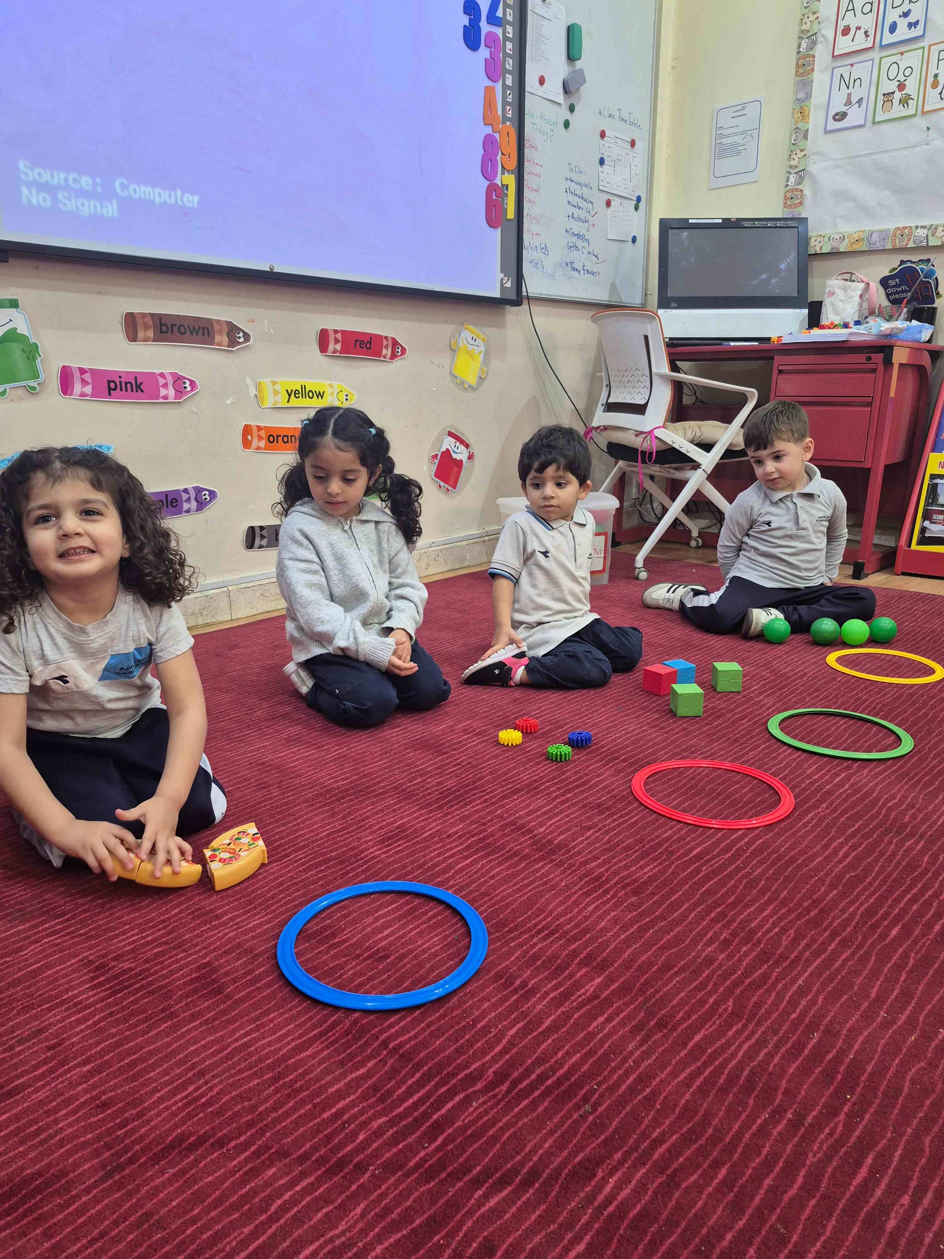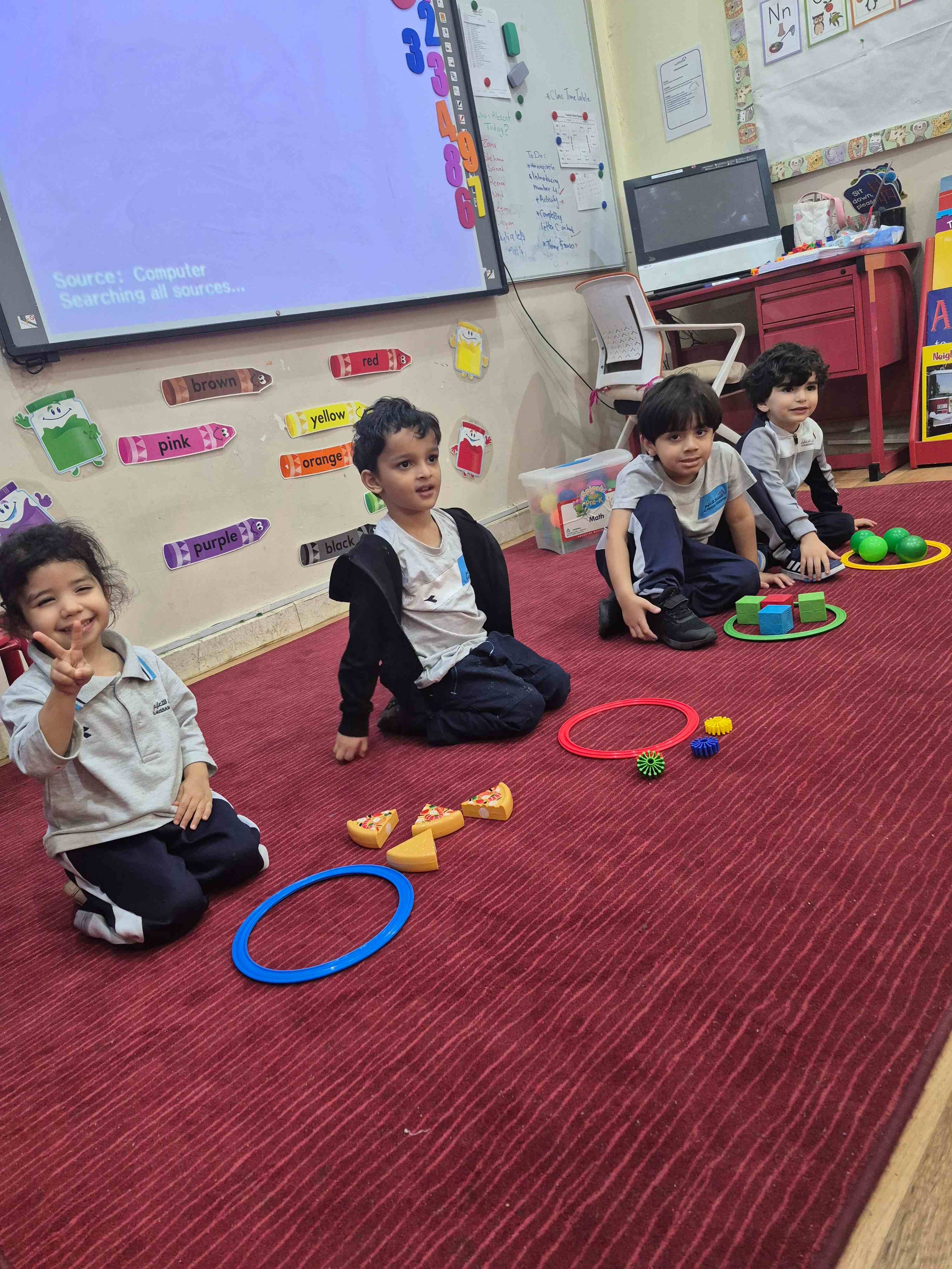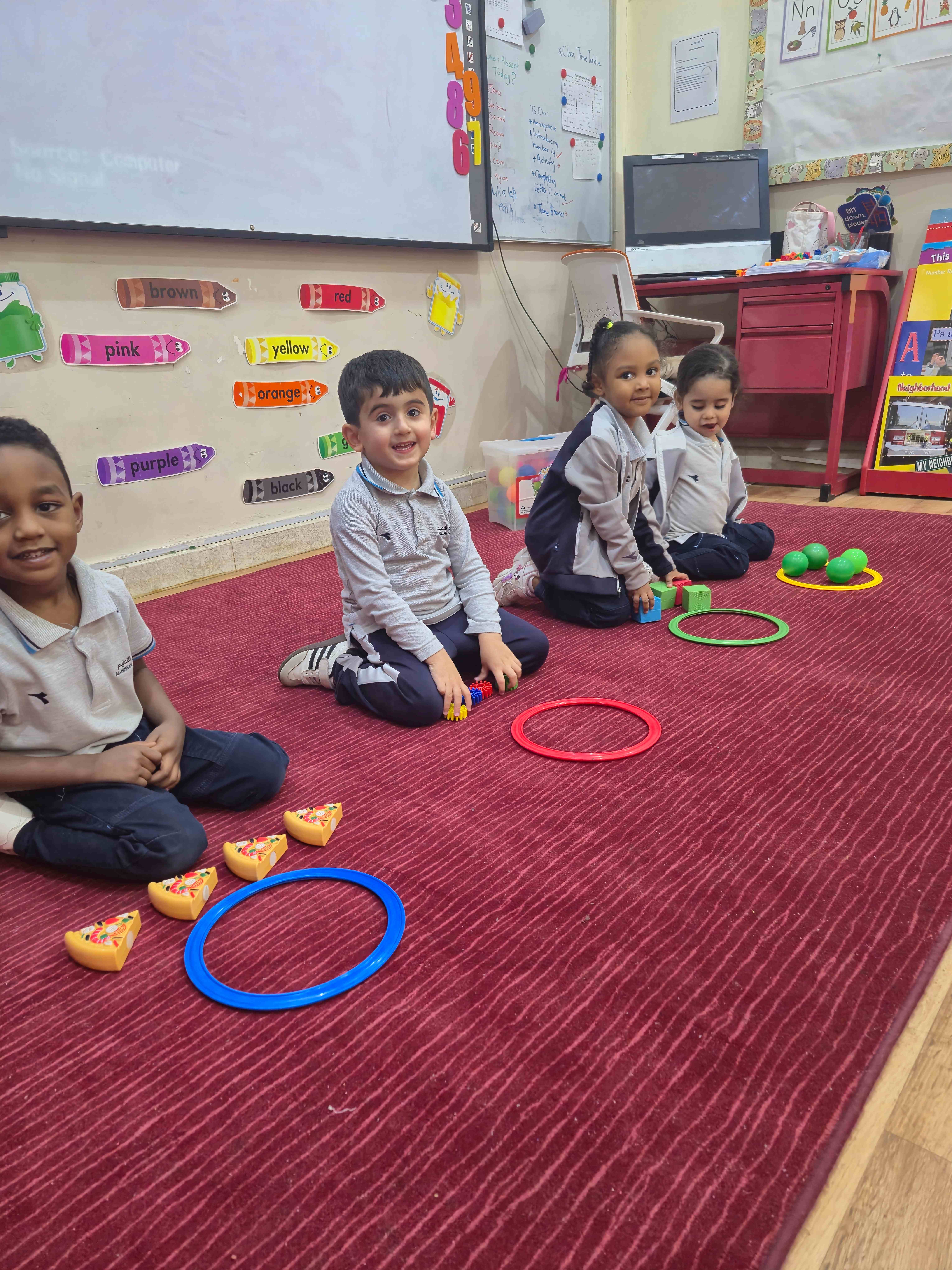 KG1 students practiced counting numbers 1 to 4 through fun, hands-on activities. Using various objects such as balls, blocks, stars, and pizza slice pictures, students worked in small groups to count and match the items with the correct number cards. The teacher displayed each number (1, 2, 3, or 4), and students carefully counted the objects, then placed the correct amount into trays or circles labelled with those numbers.