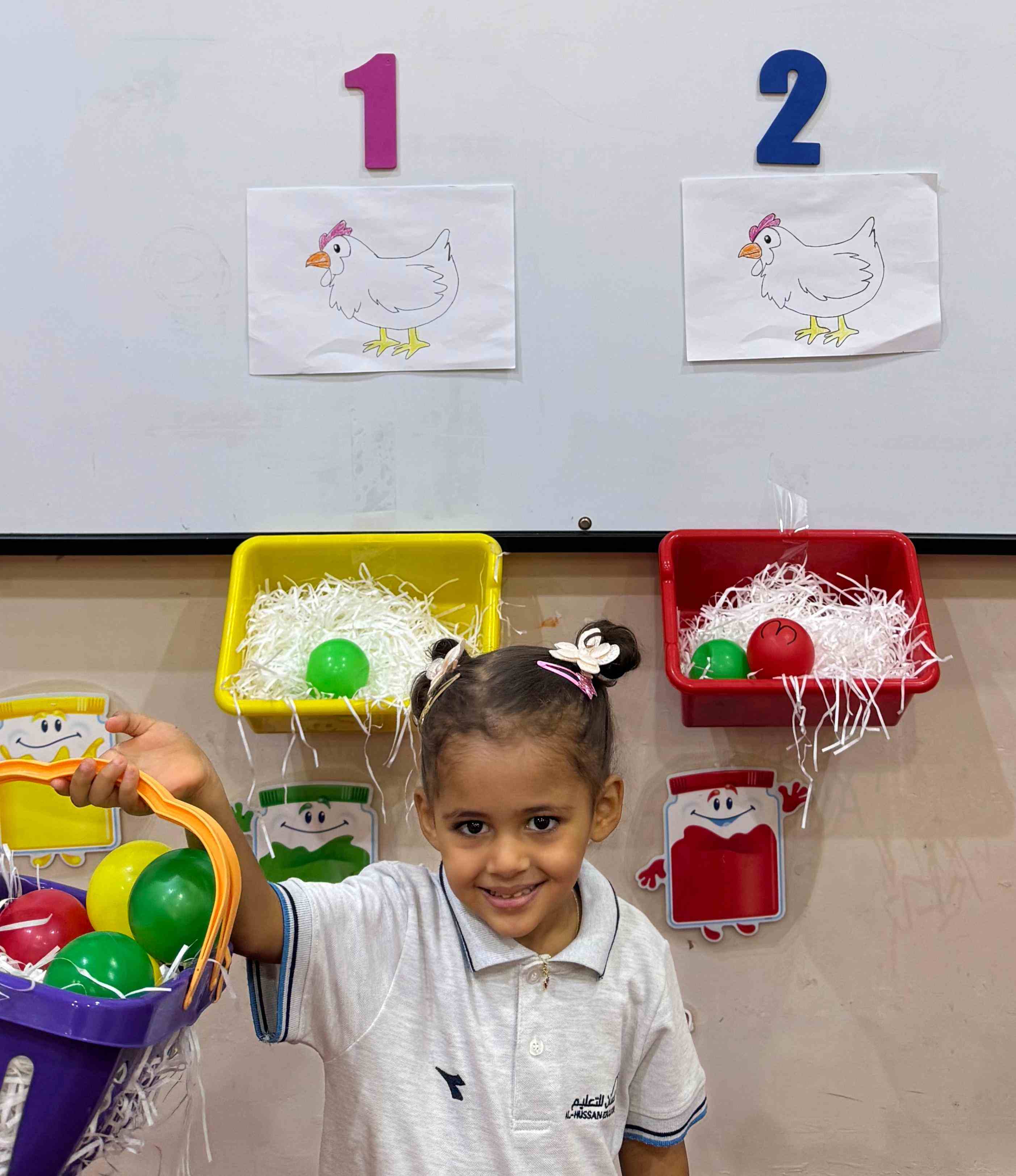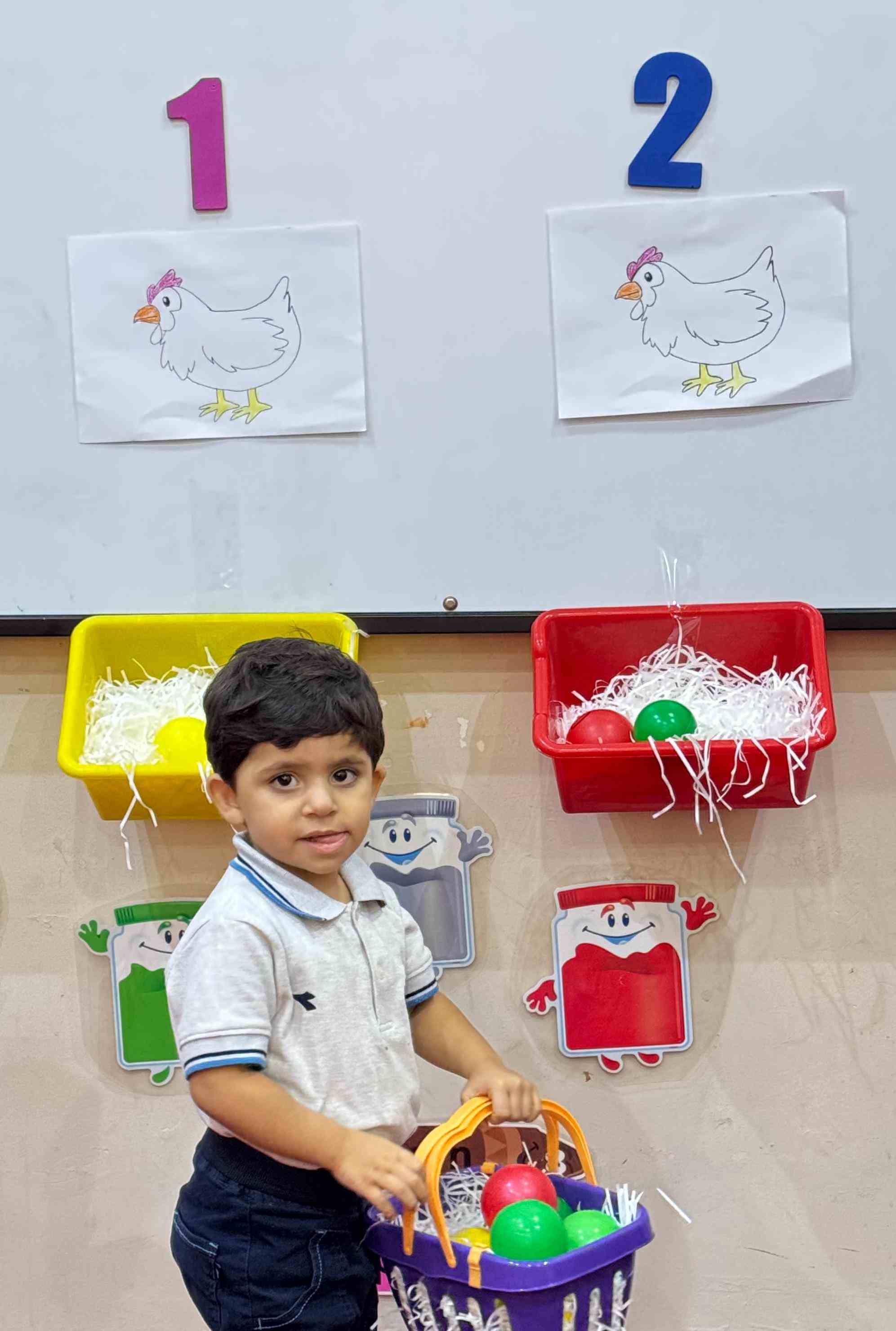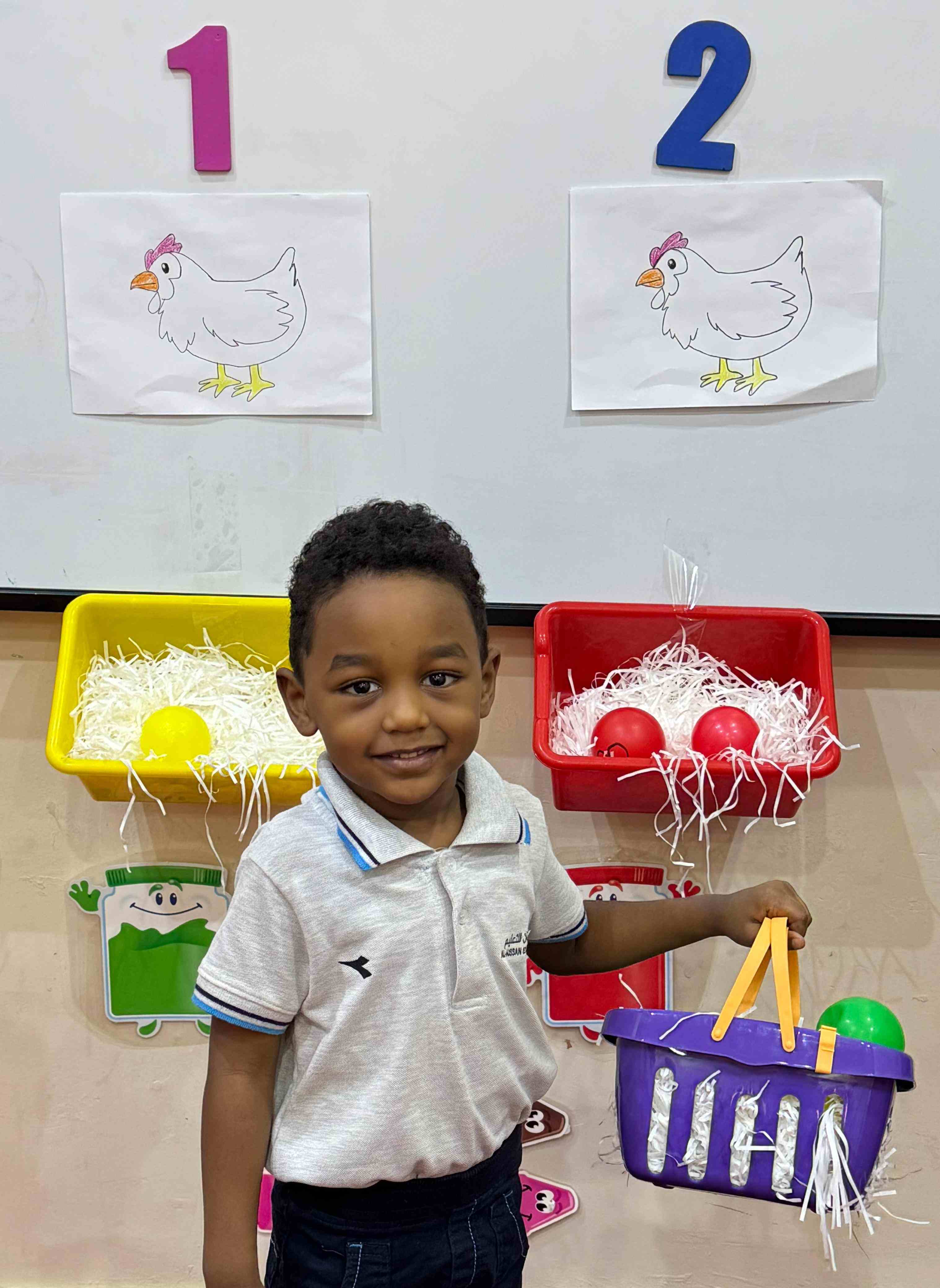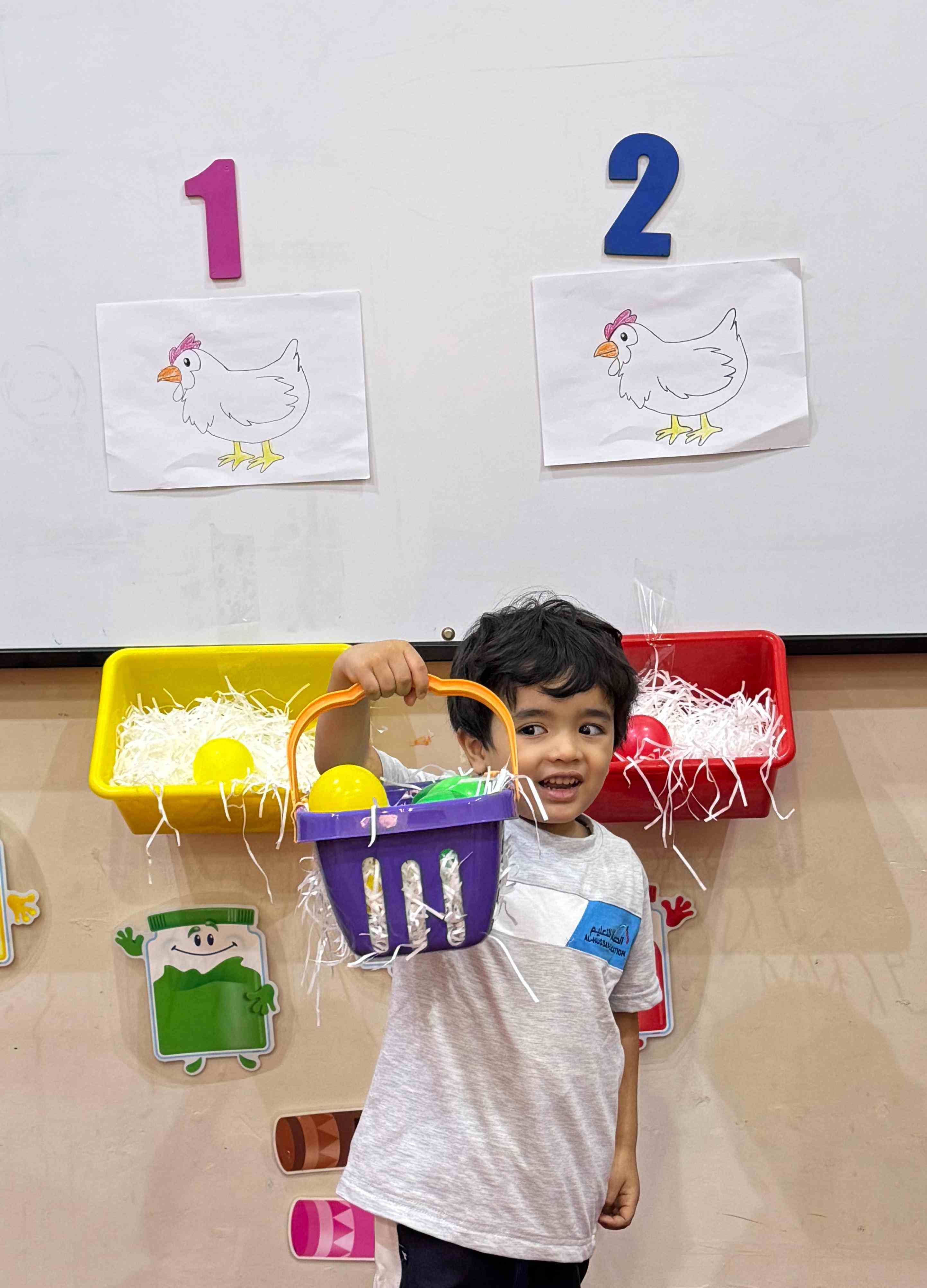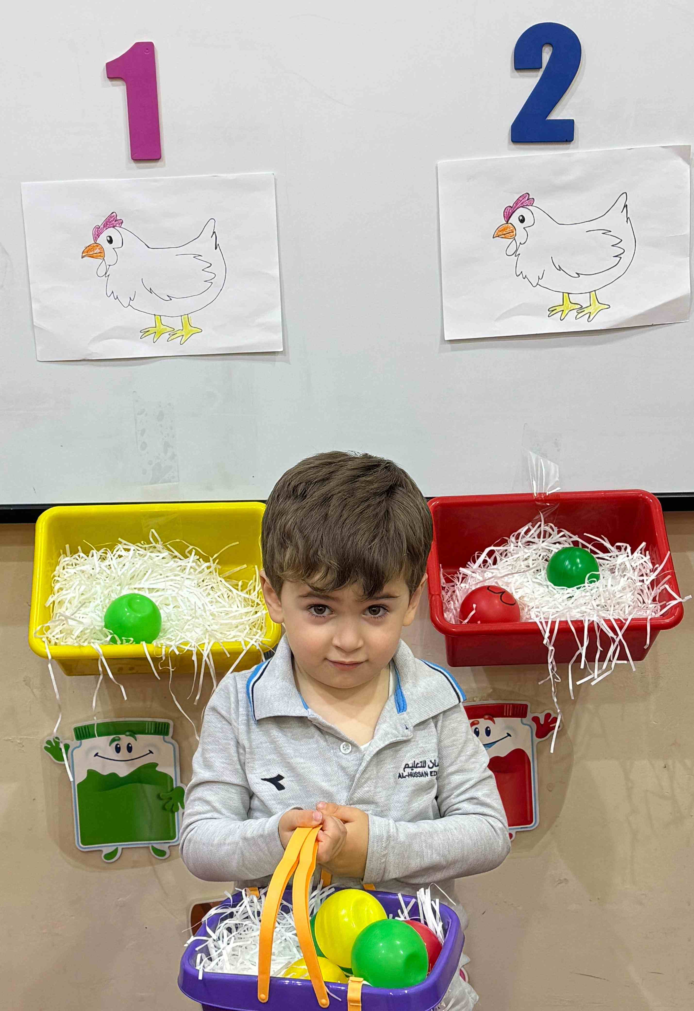 The KG1 students practiced counting by placing eggs under the chicken nests. They counted 1 egg and placed it under chicken 1’s nest, then counted 2 eggs and placed them under chicken 2’s nest. This fun hands-on activity helped them learn counting and number recognition in an engaging and playful way.