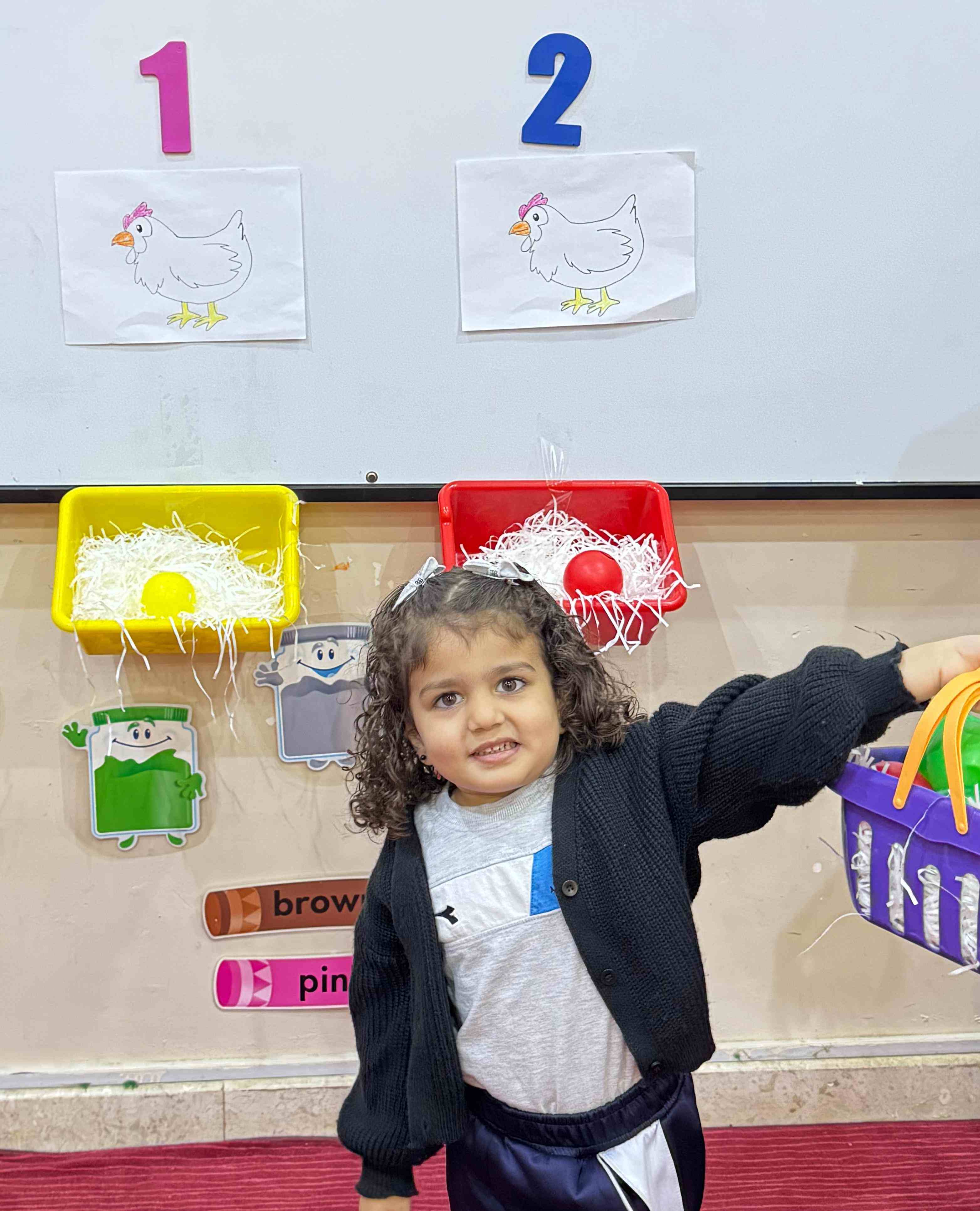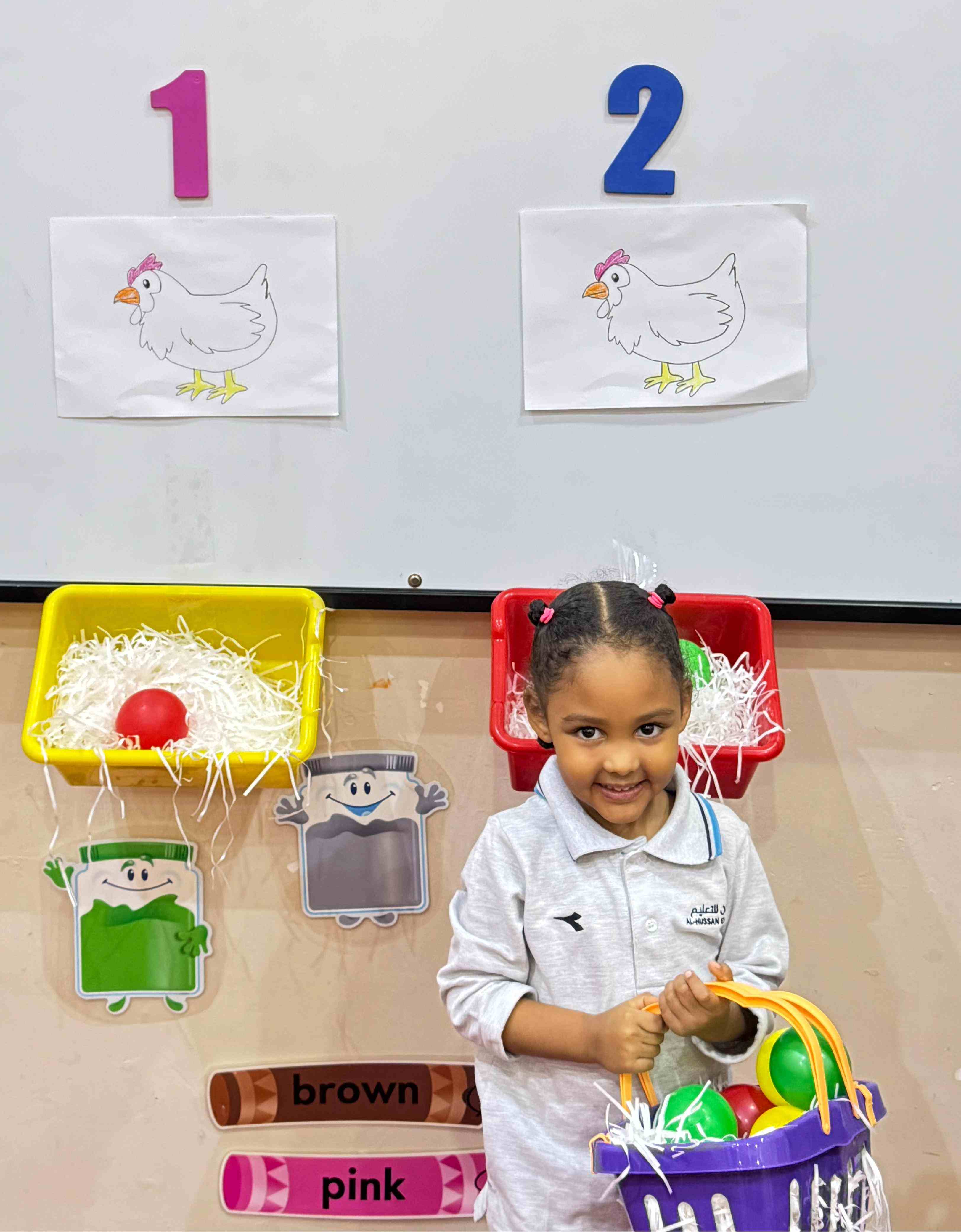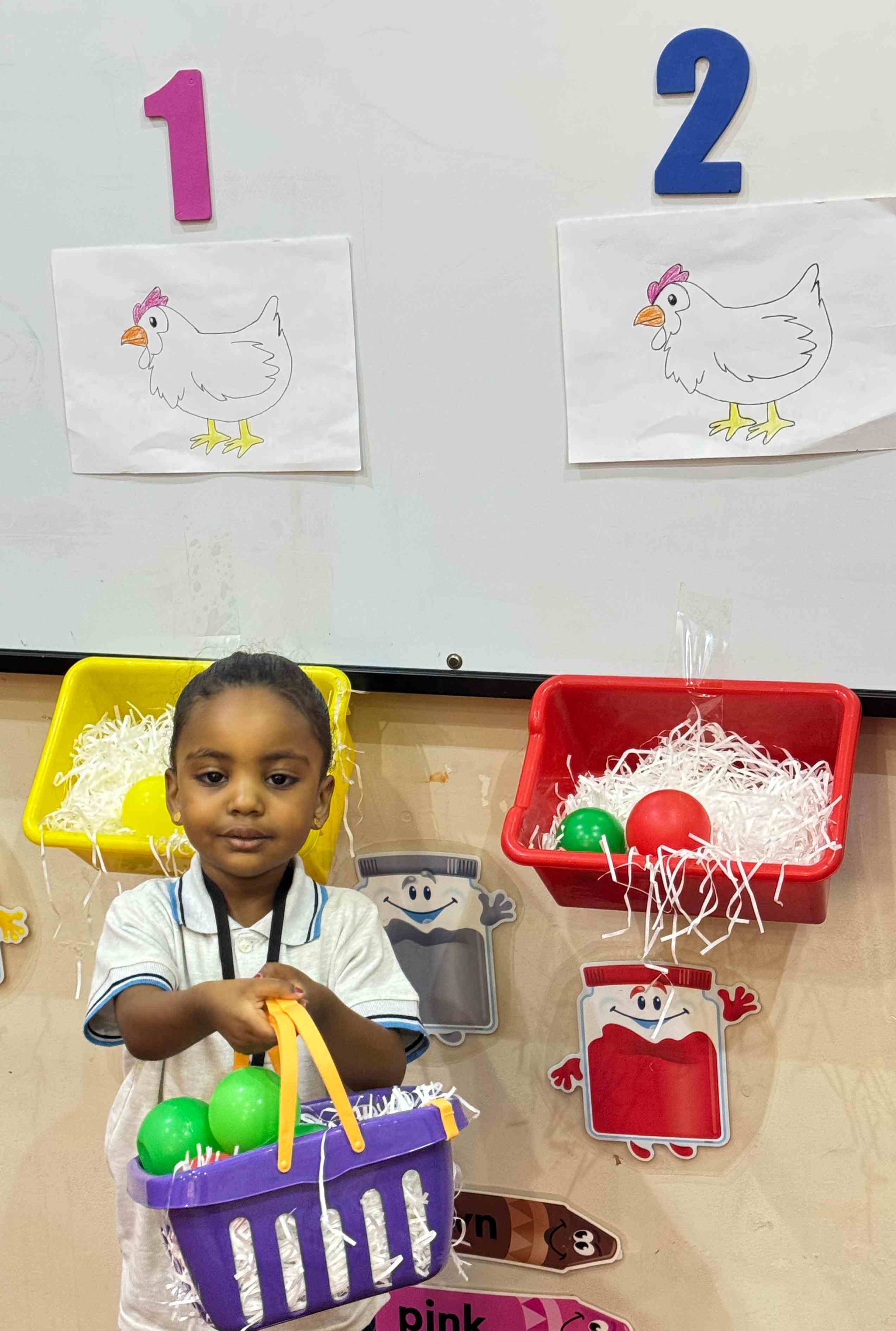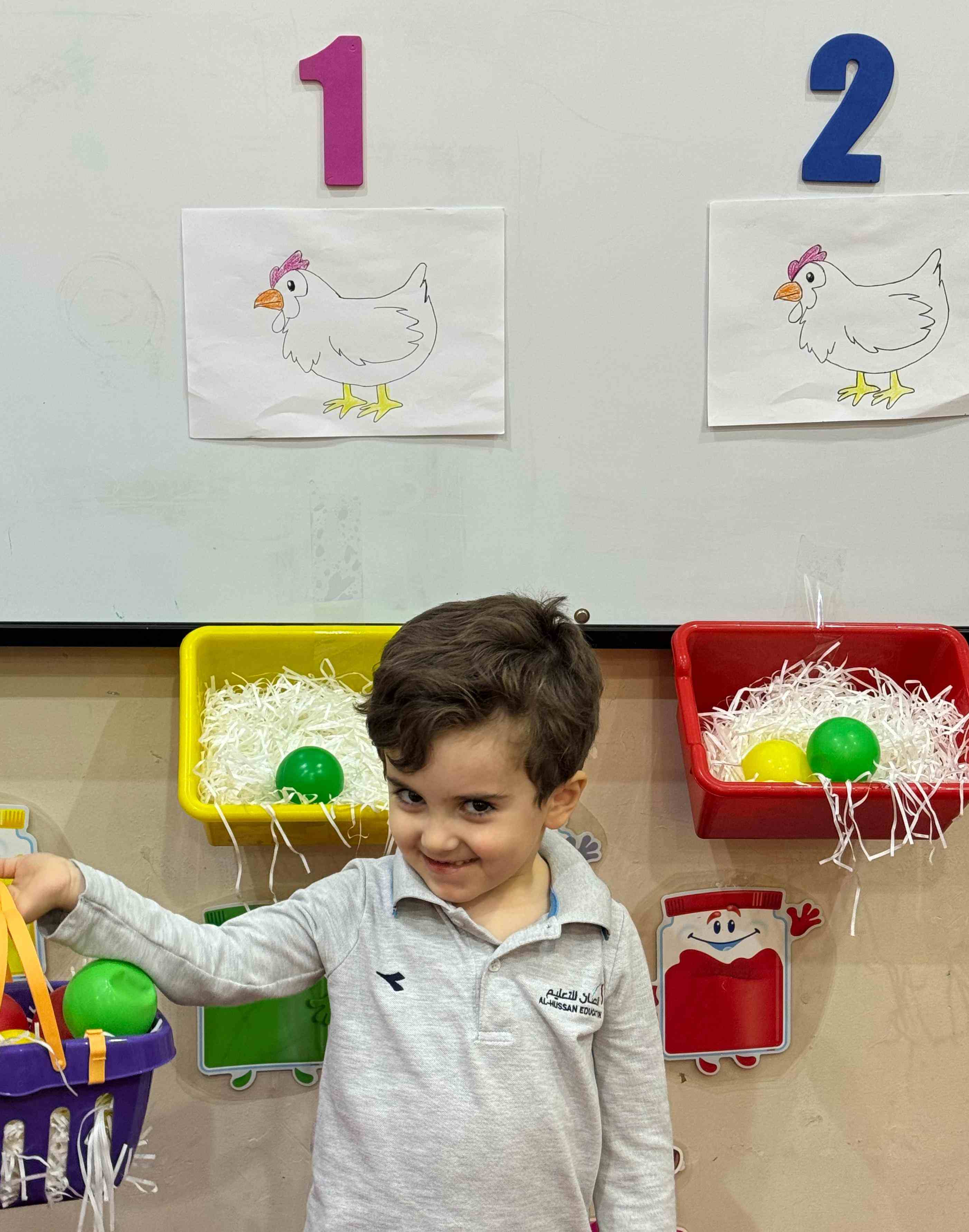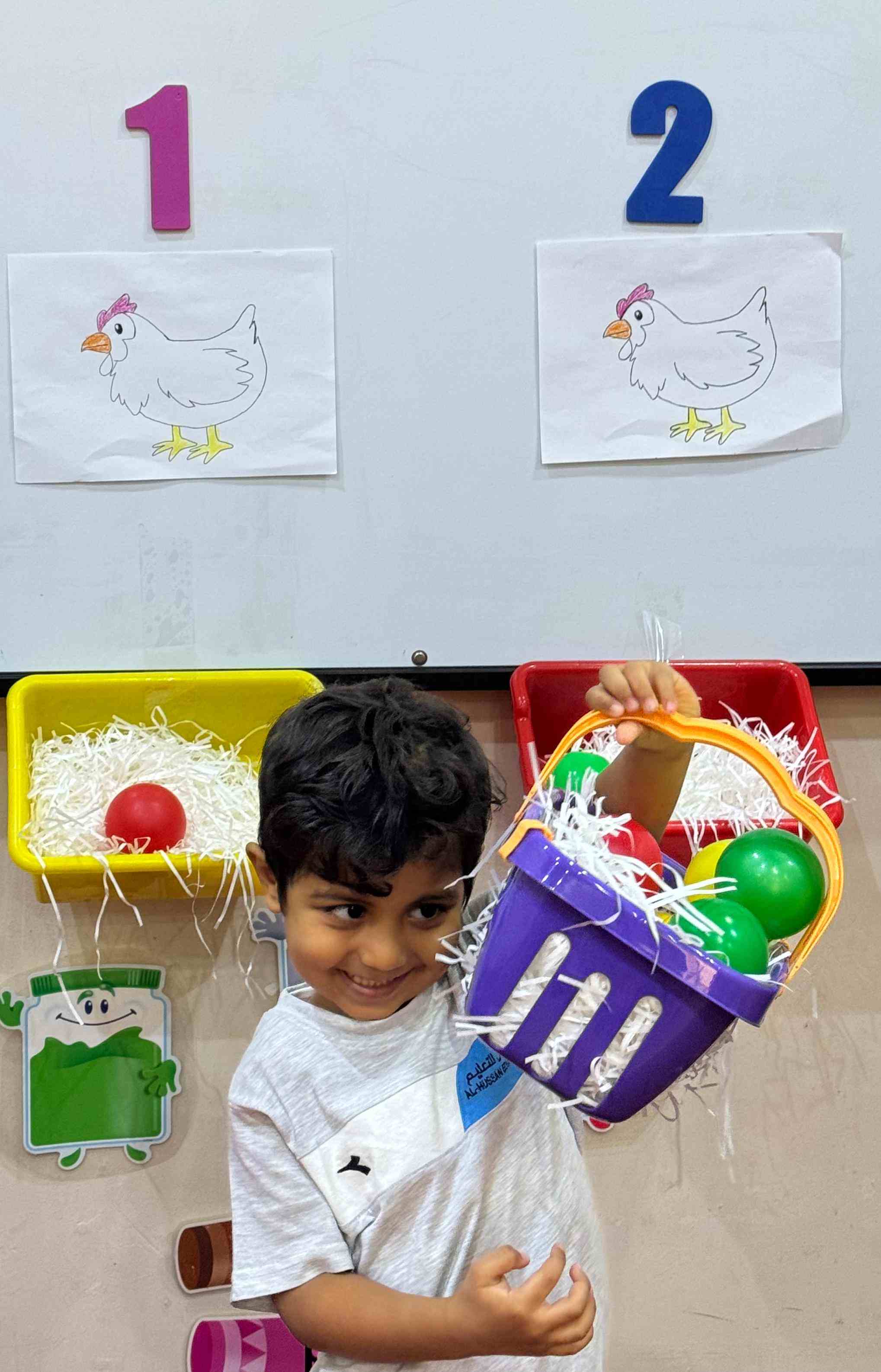 The KG1 students practiced counting by placing eggs under the chicken nests. They counted 1 egg and placed it under chicken 1’s nest, then counted 2 eggs and placed them under chicken 2’s nest. This fun hands-on activity helped them learn counting and number recognition in an engaging and playful way.