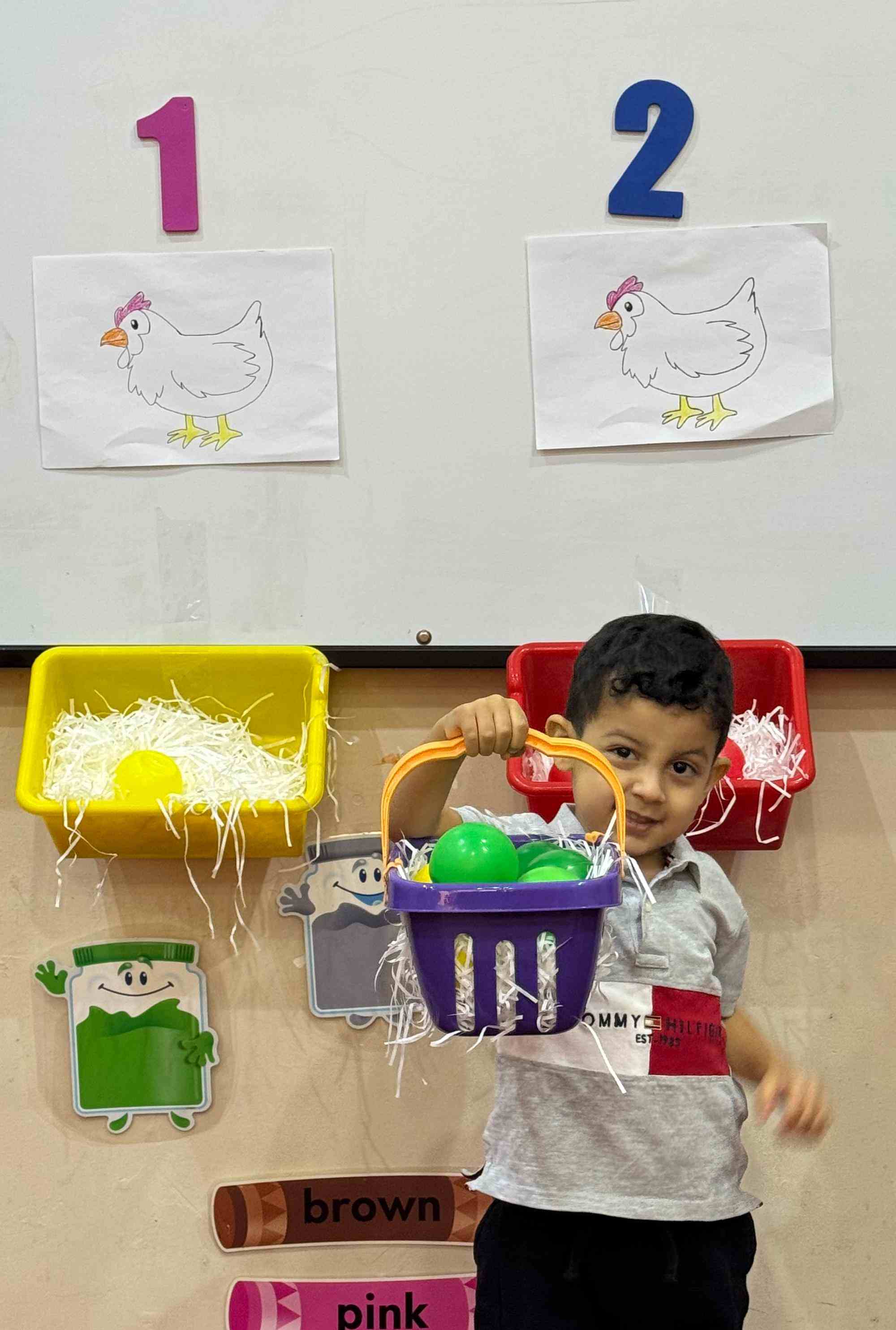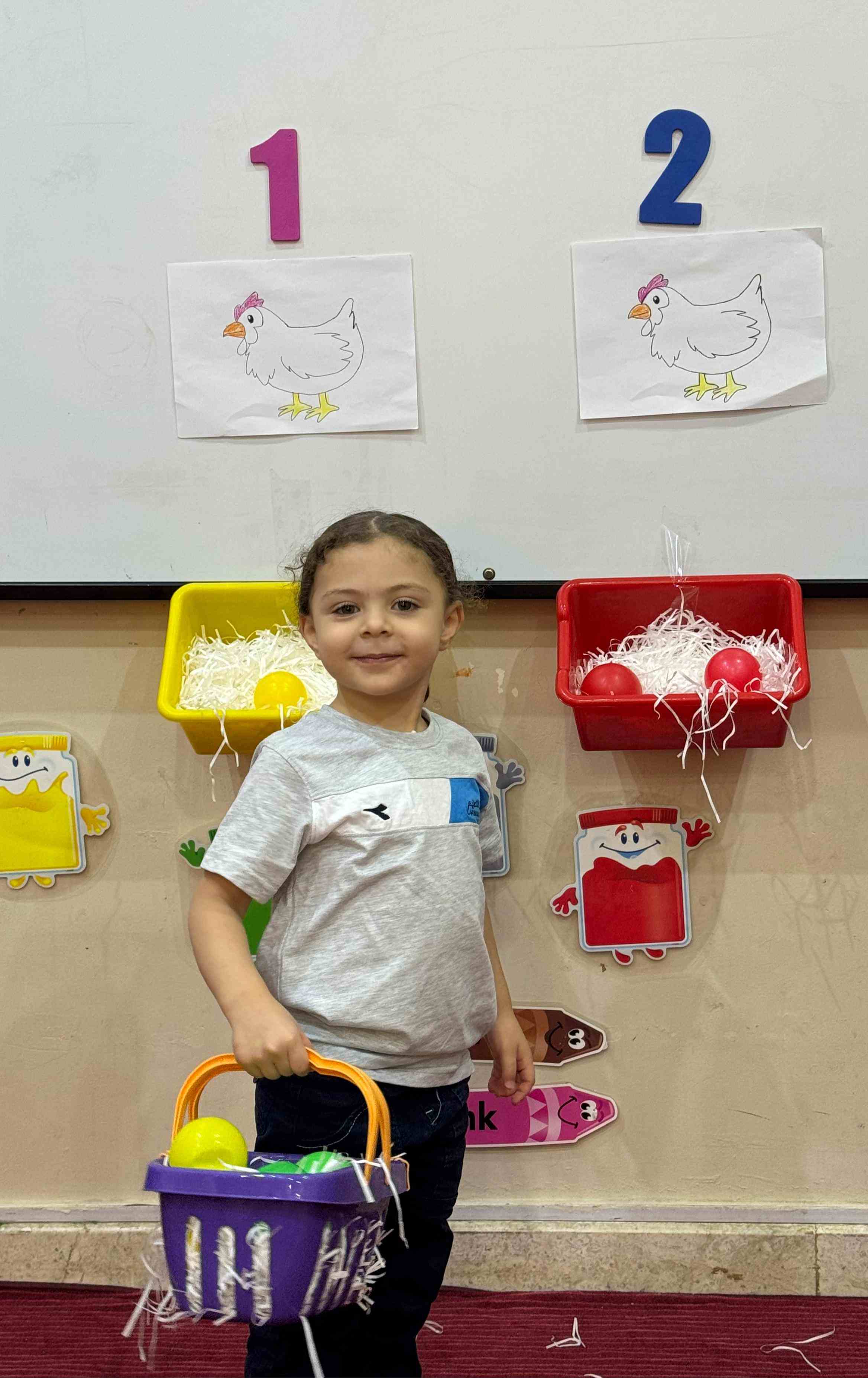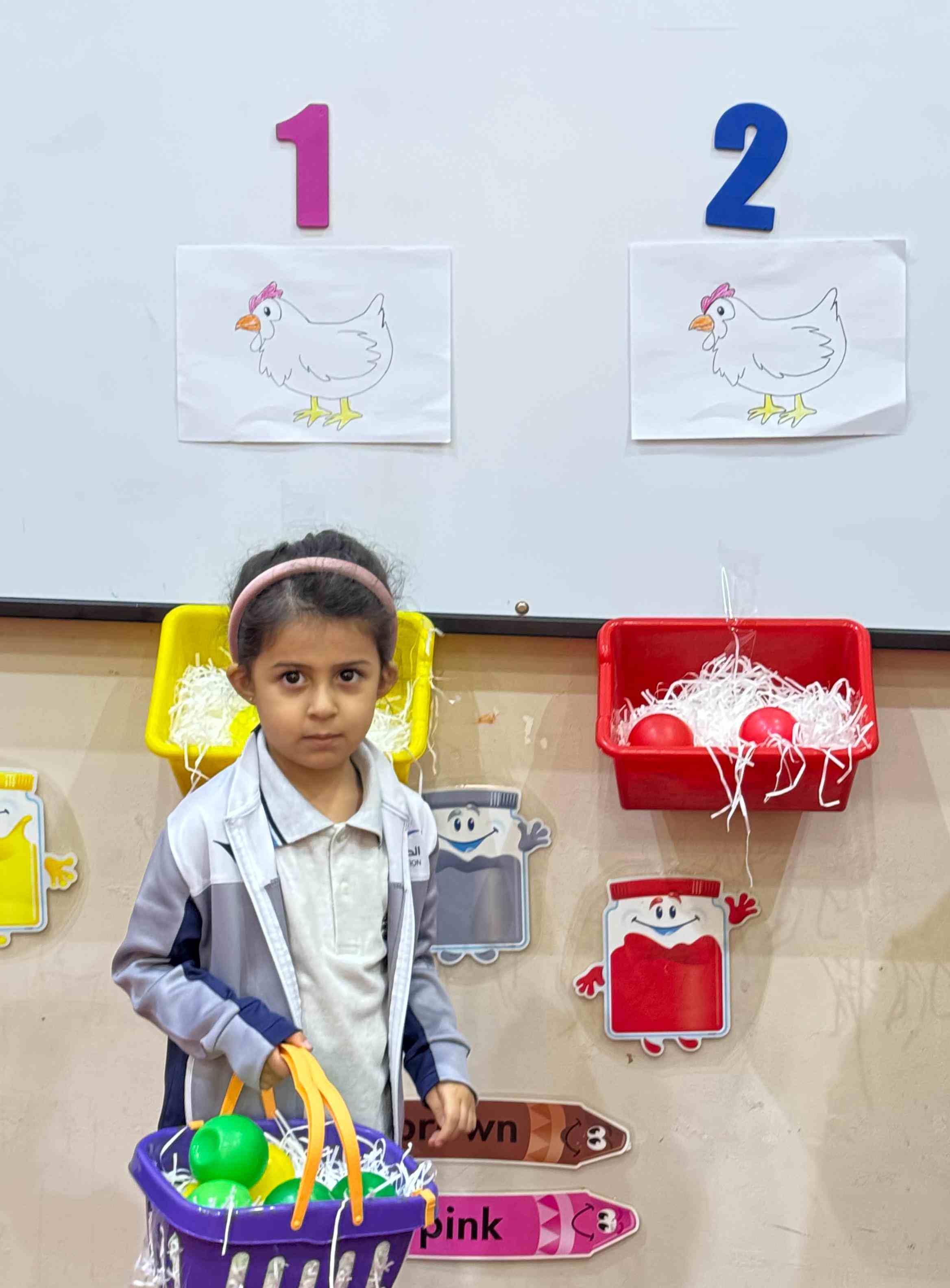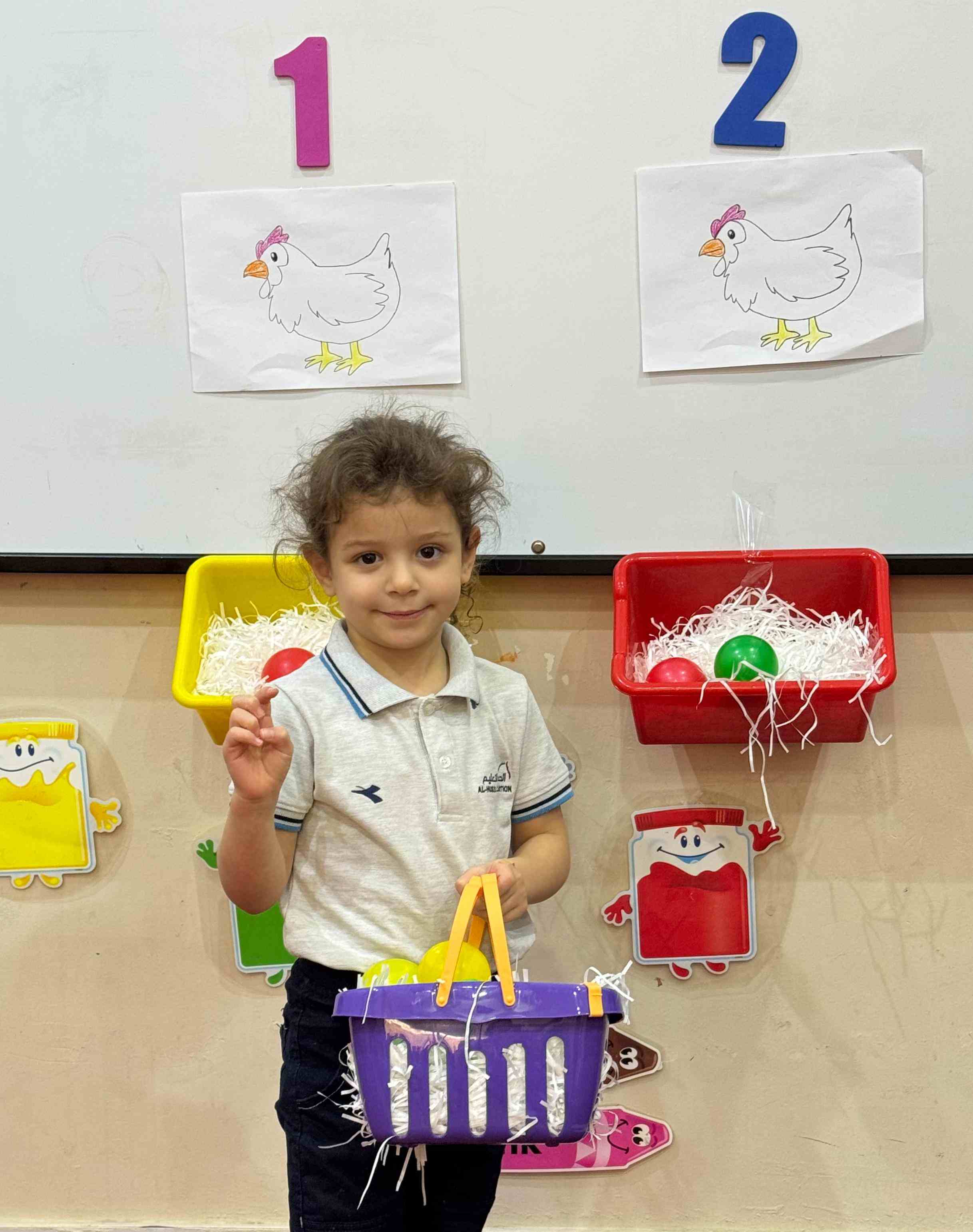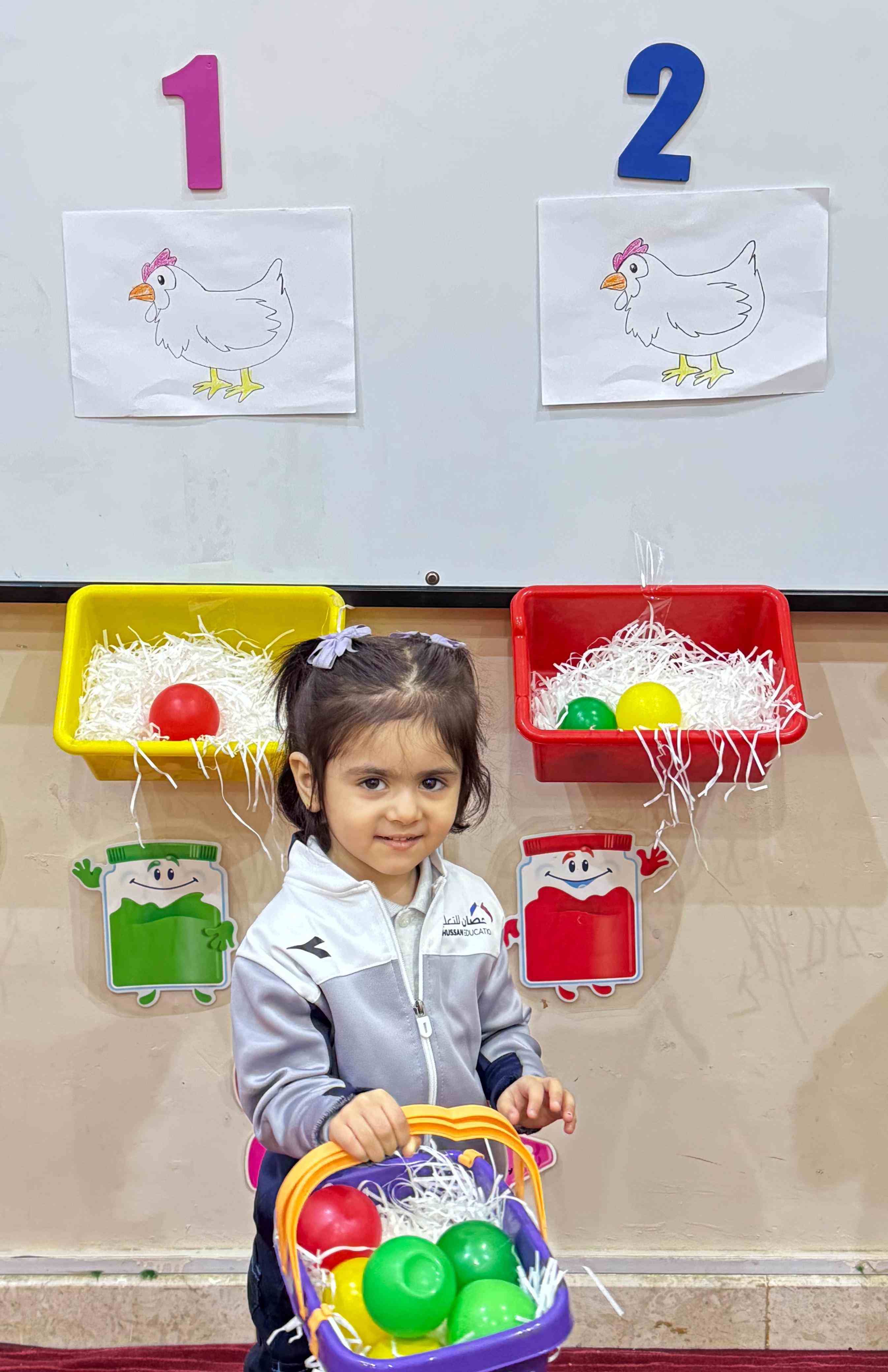 The KG1 students practiced counting by placing eggs under the chicken nests. They counted 1 egg and placed it under chicken 1’s nest, then counted 2 eggs and placed them under chicken 2’s nest. This fun hands-on activity helped them learn counting and number recognition in an engaging and playful way.