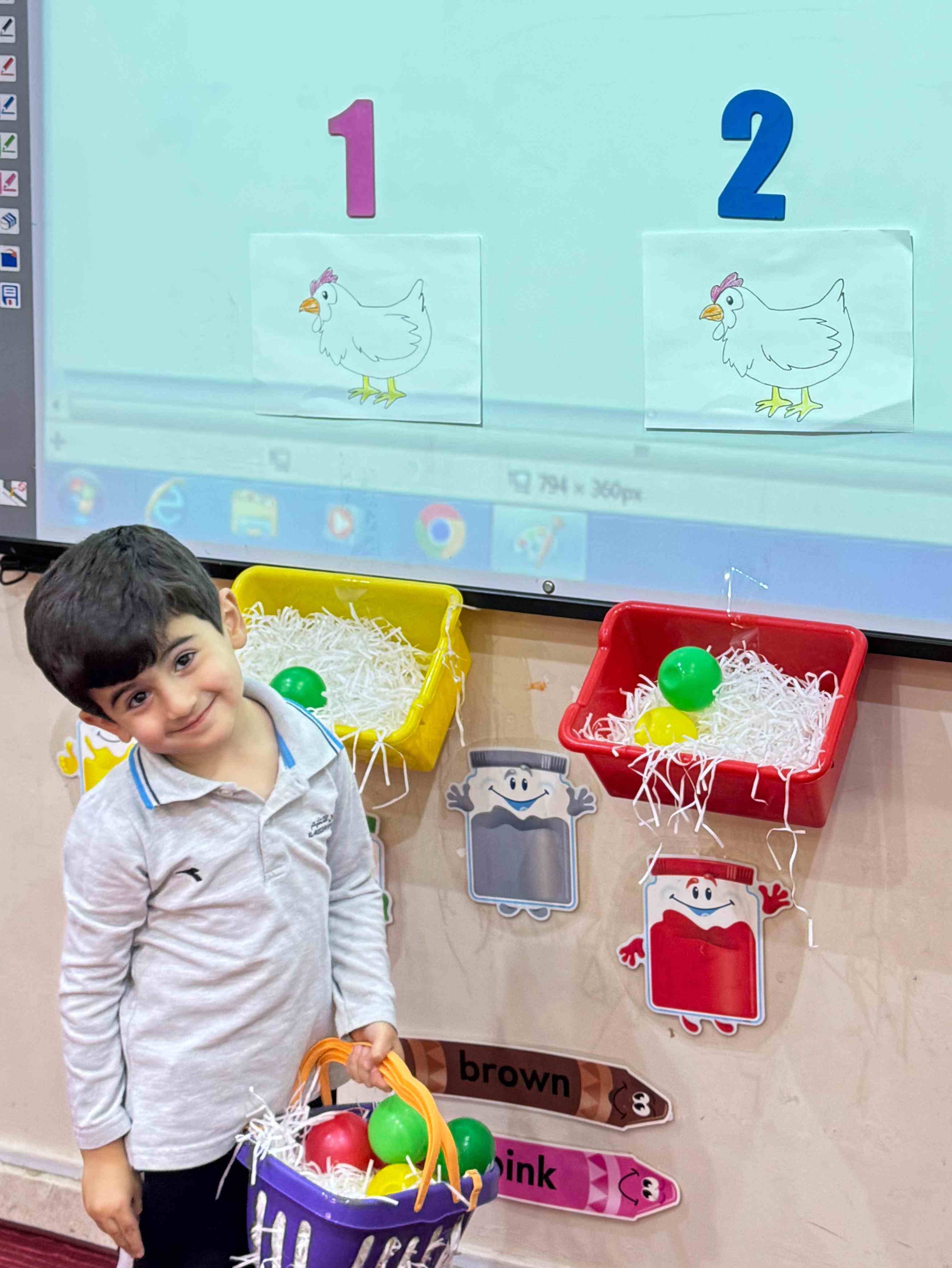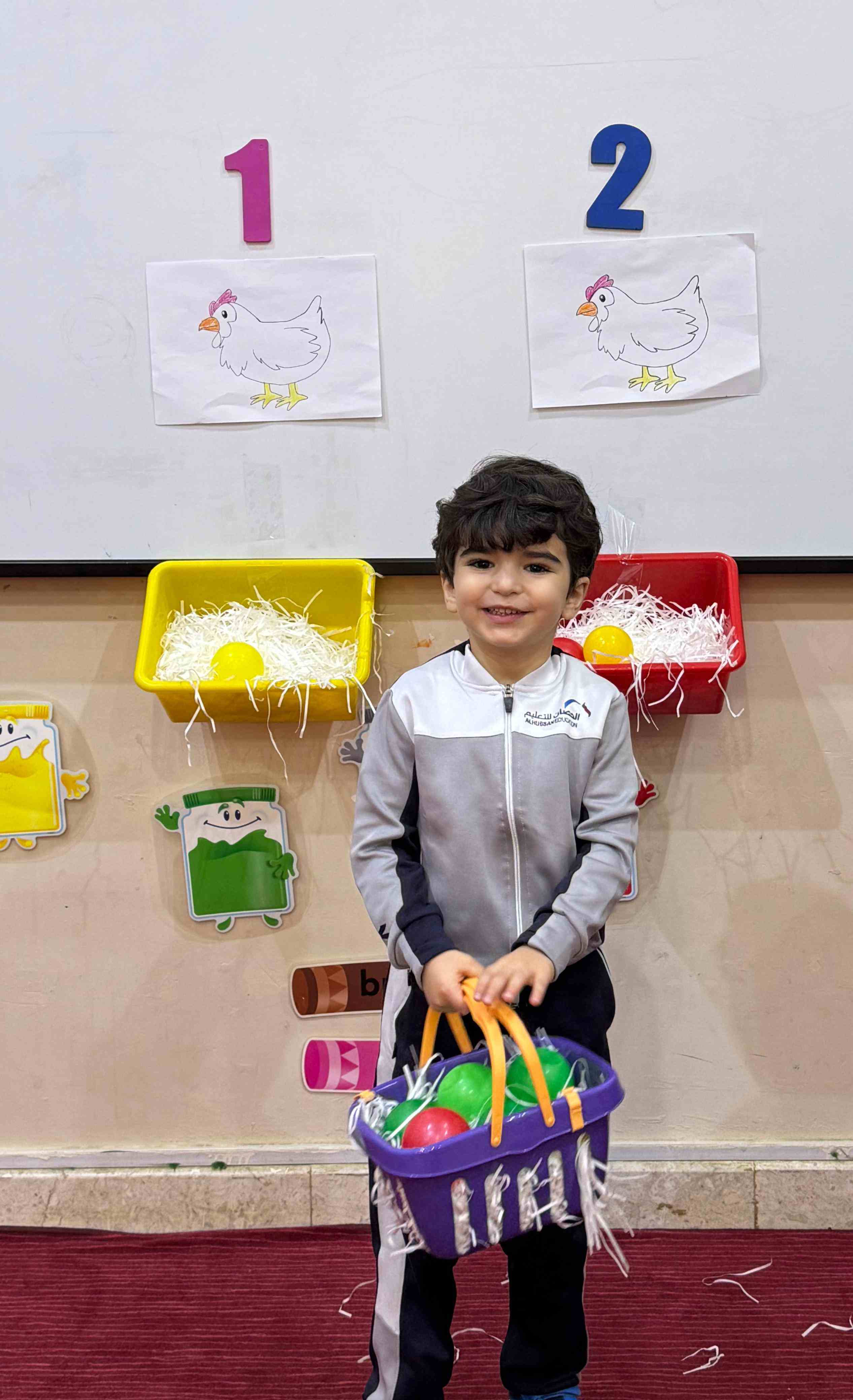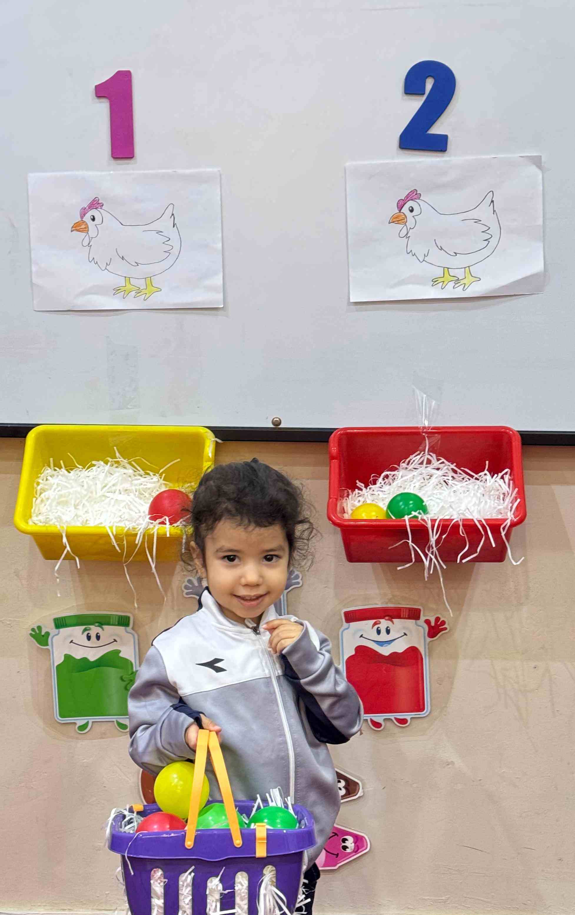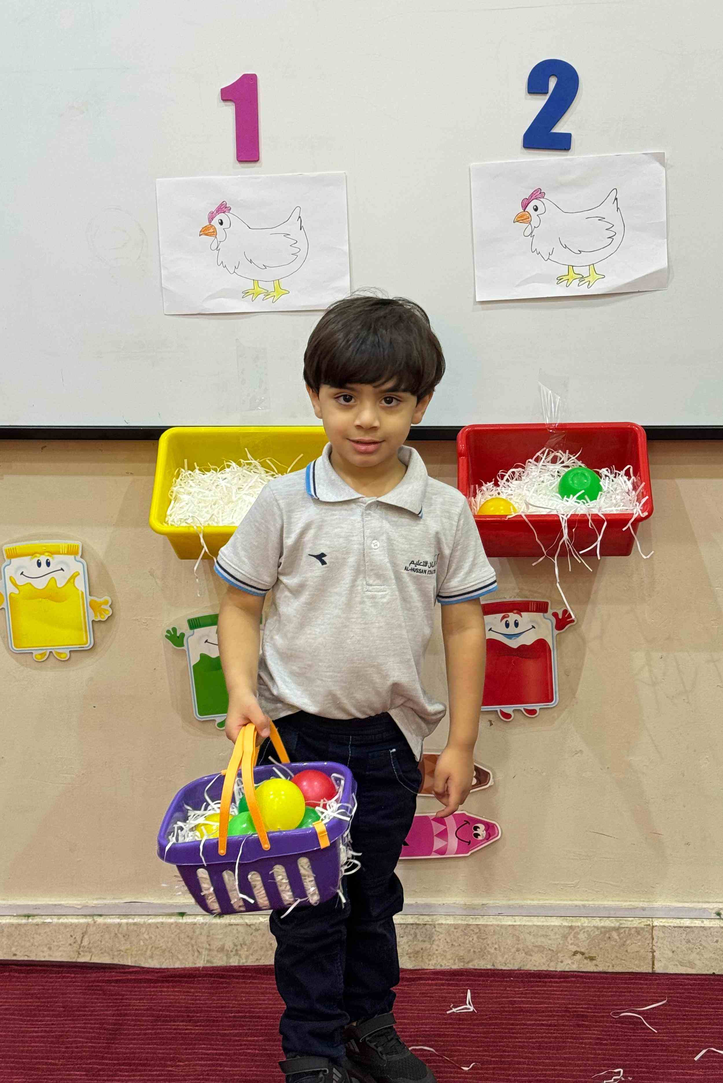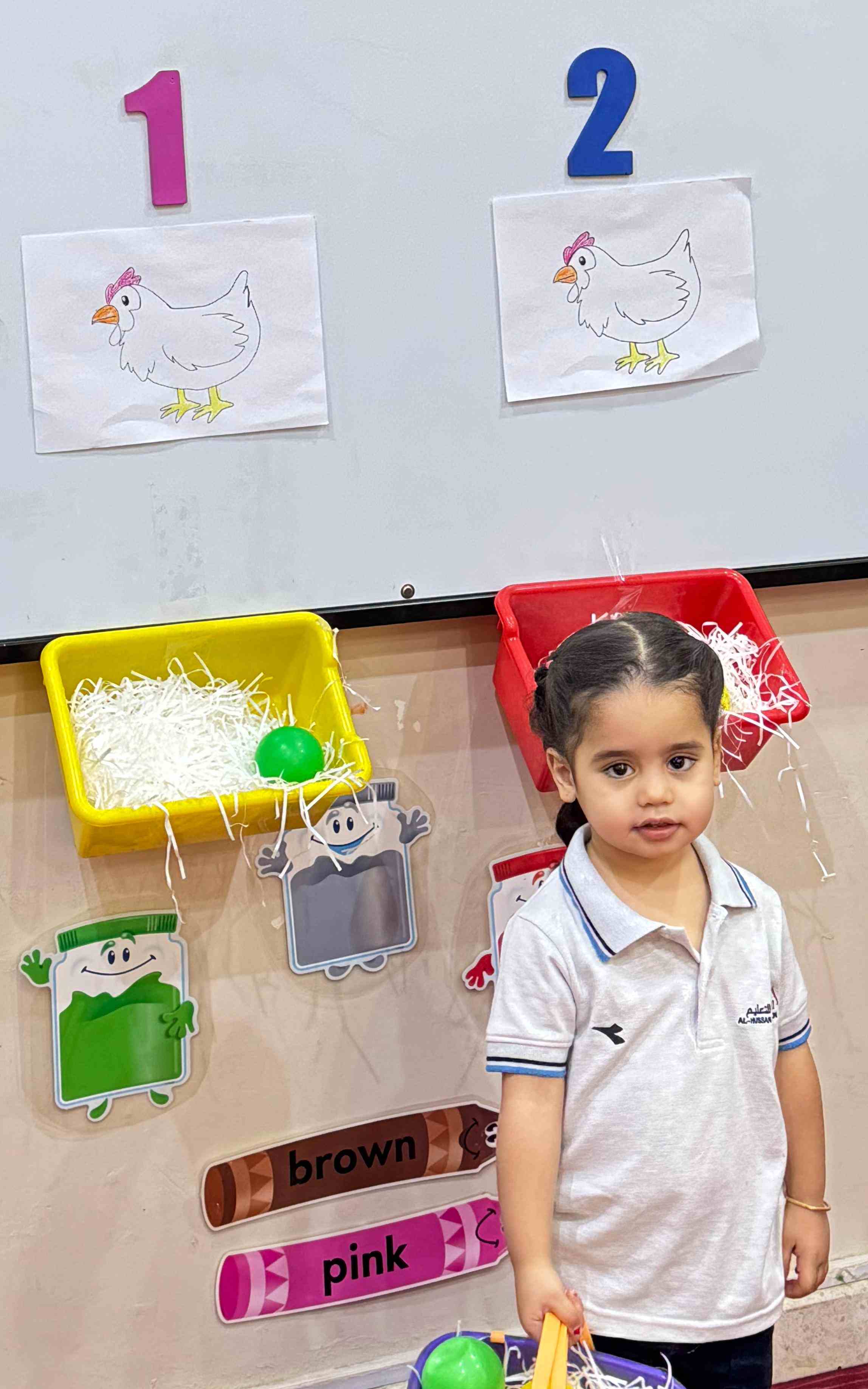 The KG1 students practiced counting by placing eggs under the chicken nests. They counted 1 egg and placed it under chicken 1’s nest, then counted 2 eggs and placed them under chicken 2’s nest. This fun hands-on activity helped them learn counting and number recognition in an engaging and playful way.