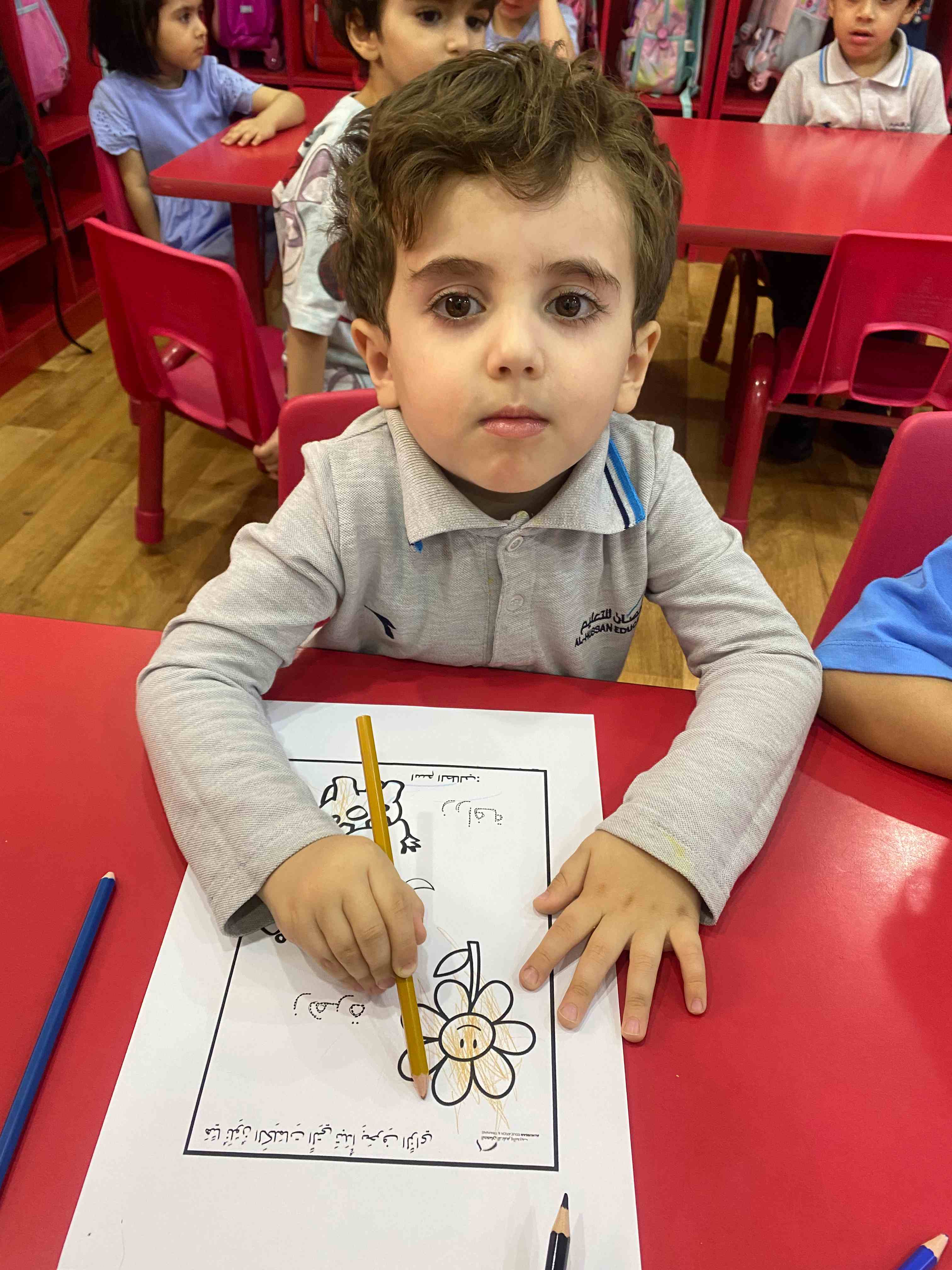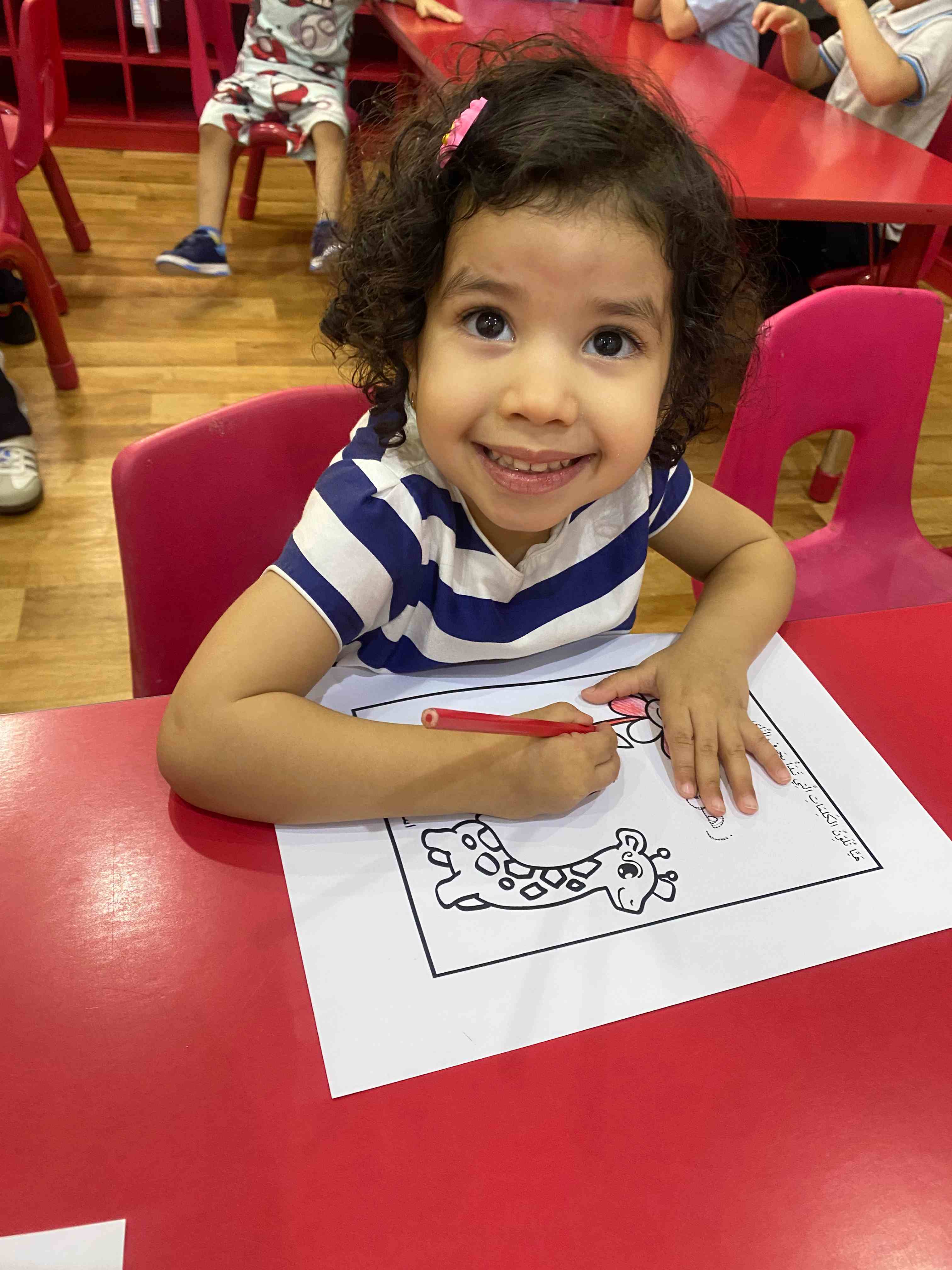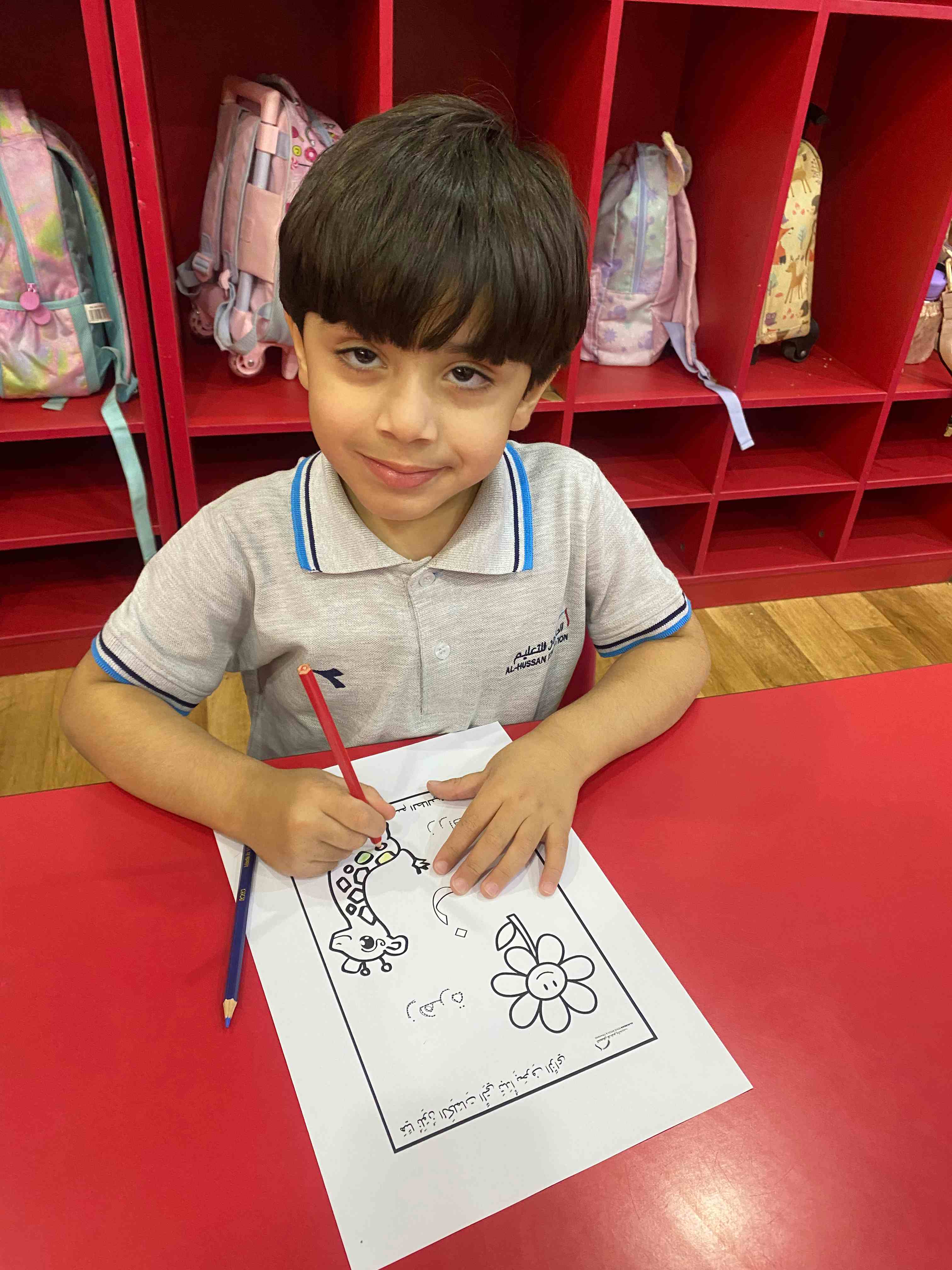 The KG 1 students at Al-Hussan International Schools in Riyadh were introduced to the Arabic letter " "زthrough a presentation of the letter along with a set of images of objects that begin with it, such as "Zarafa" (giraffe).