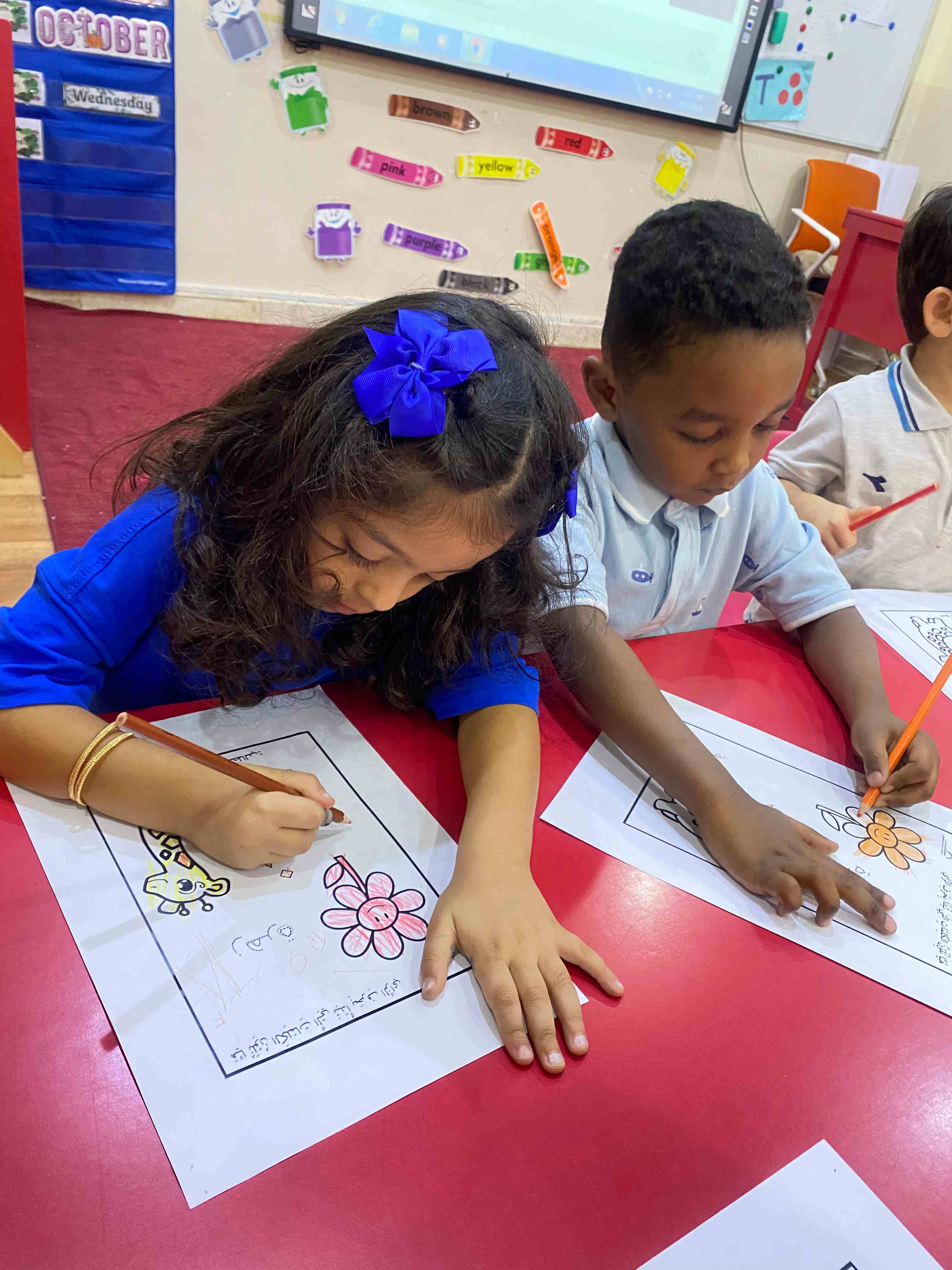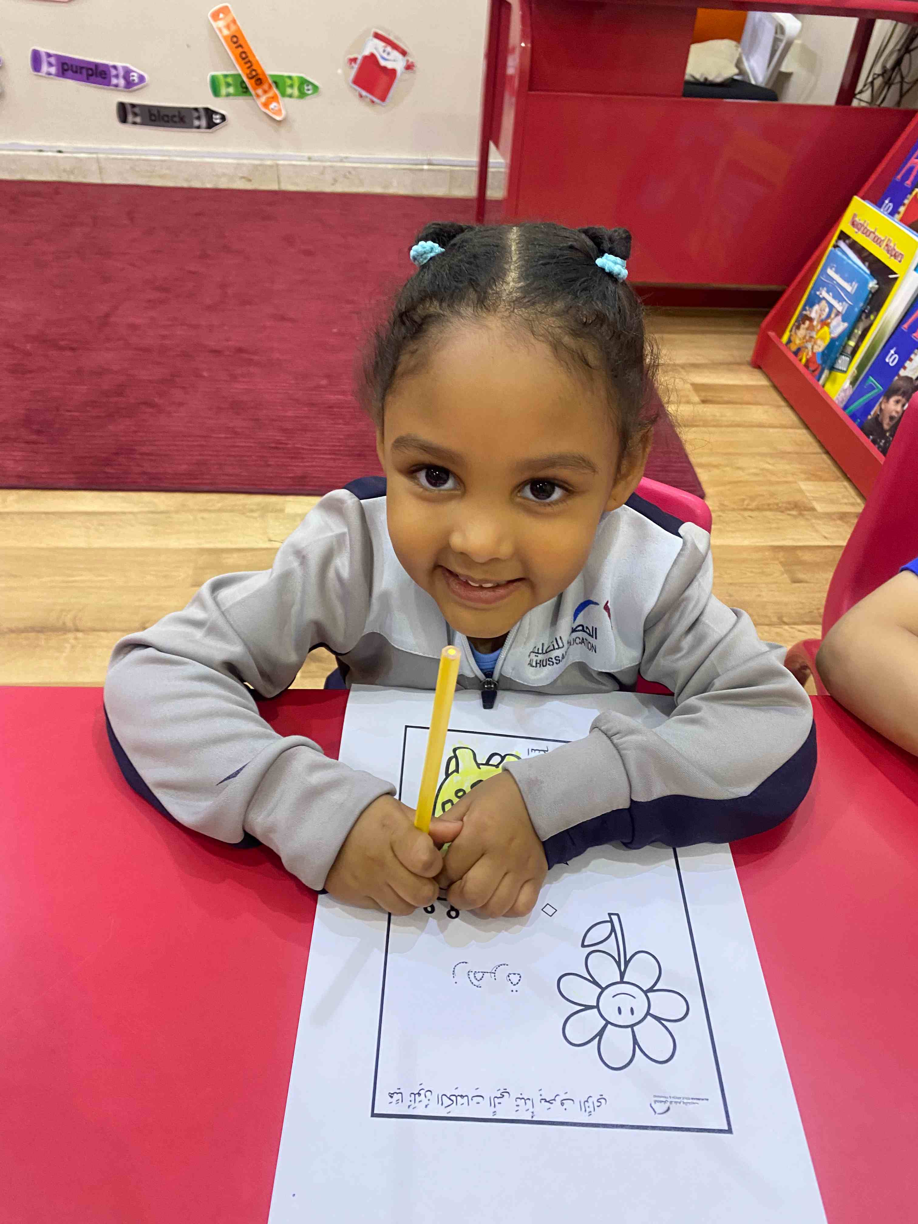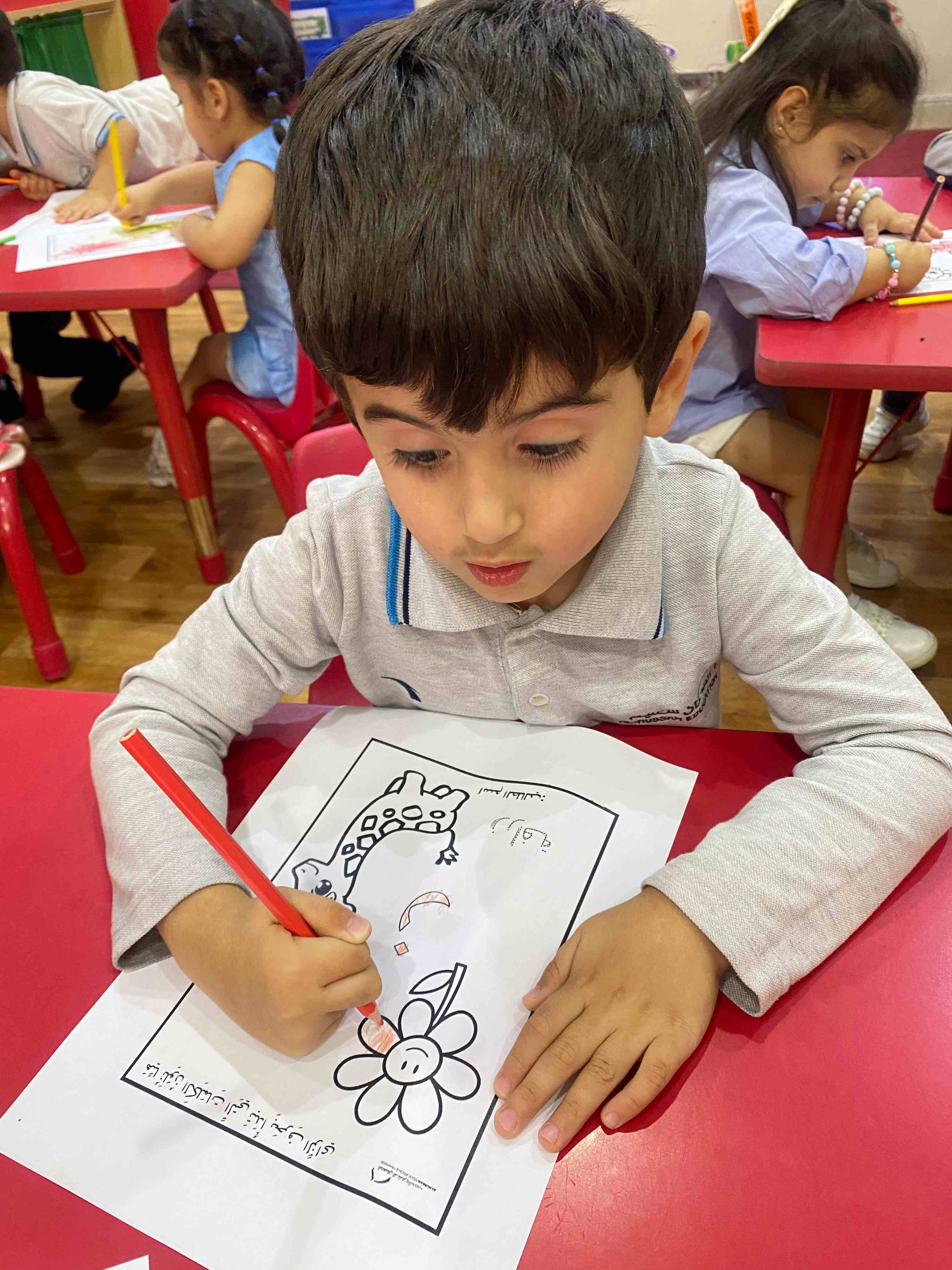 The KG 1 students at Al-Hussan International Schools in Riyadh were introduced to the Arabic letter " "زthrough a presentation of the letter along with a set of images of objects that begin with it, such as "Zarafa" (giraffe).
