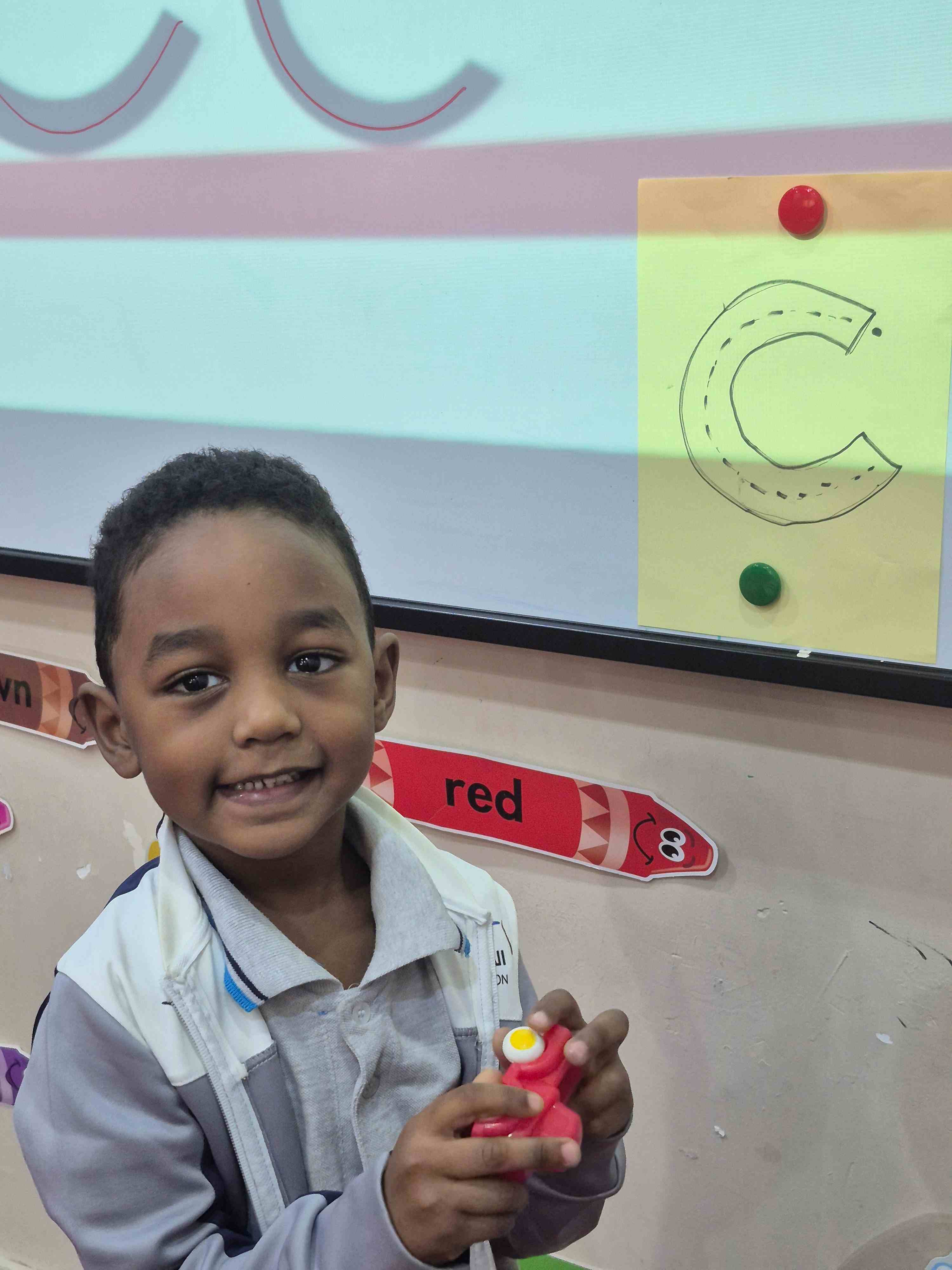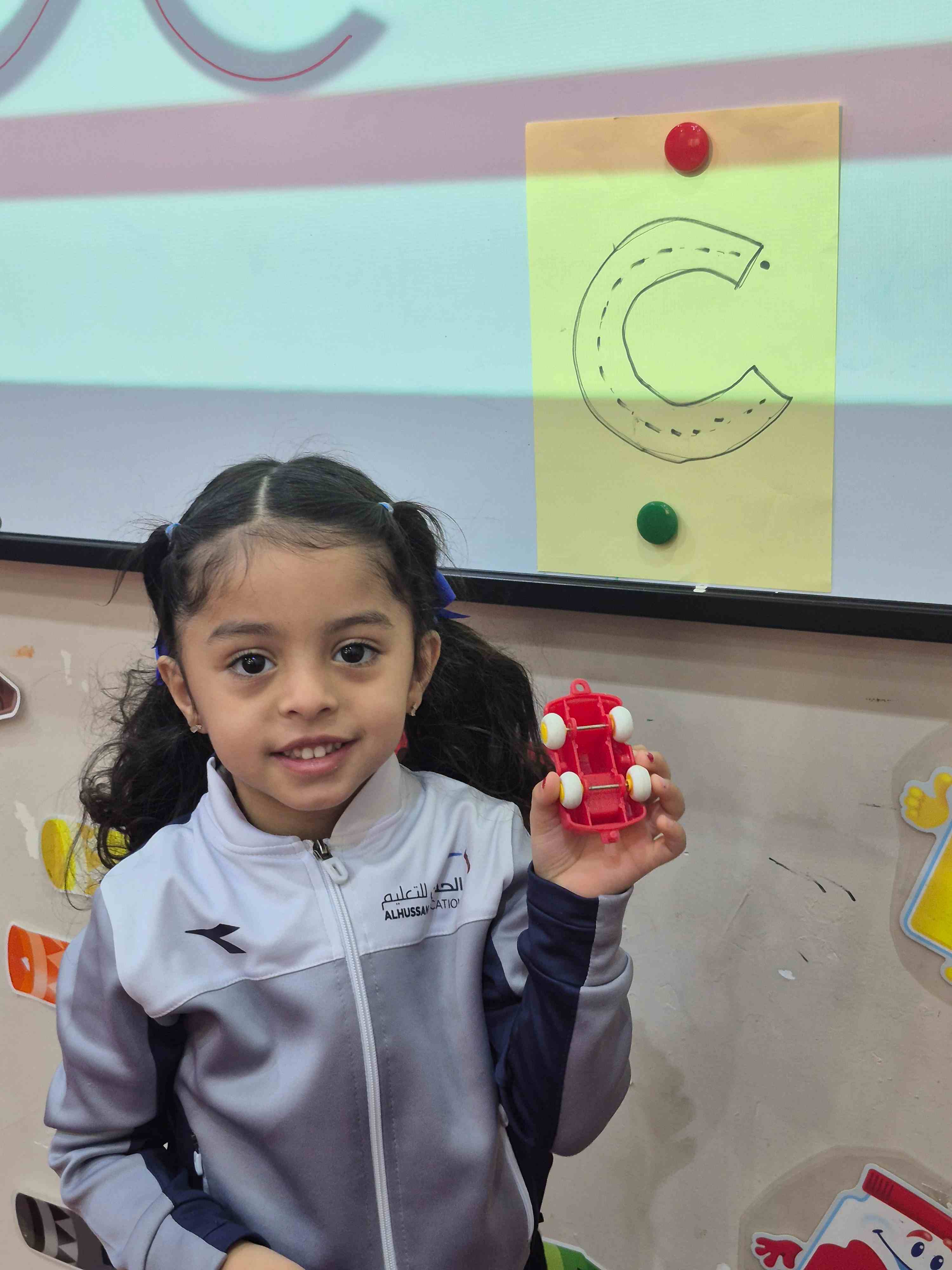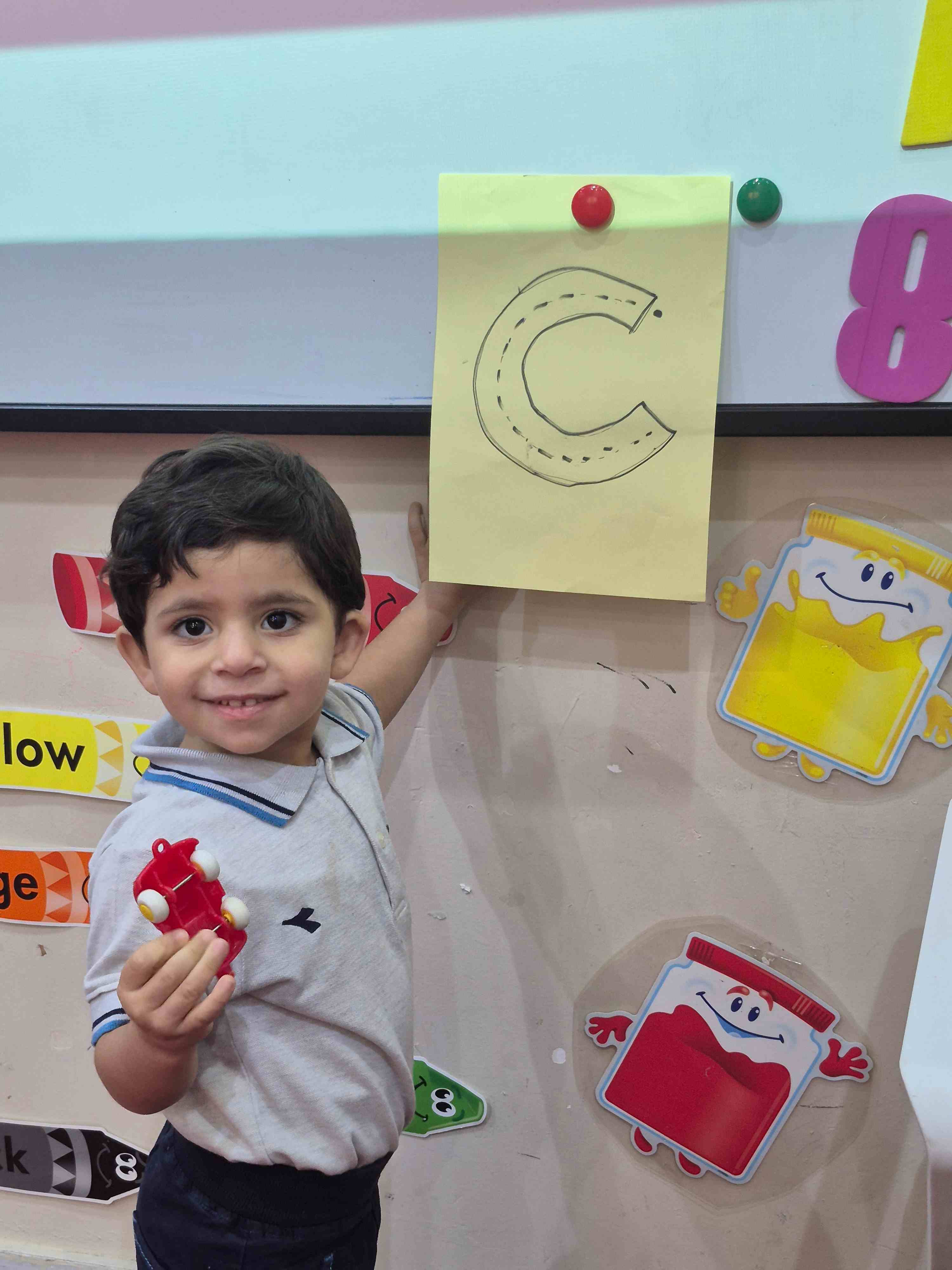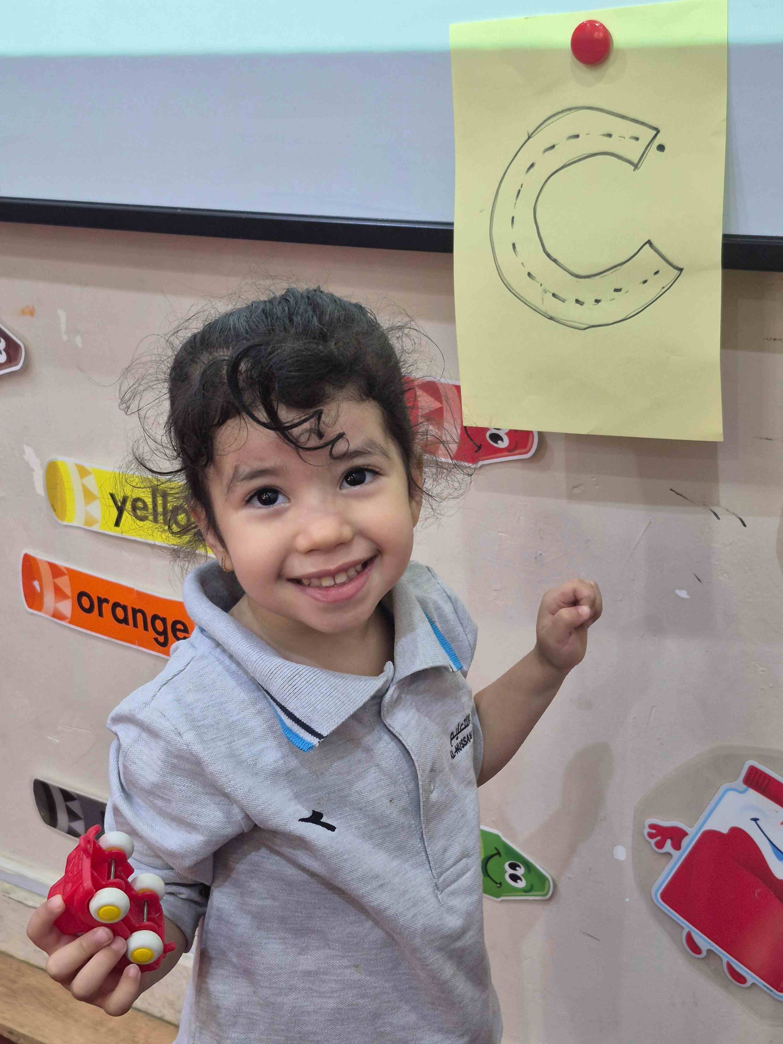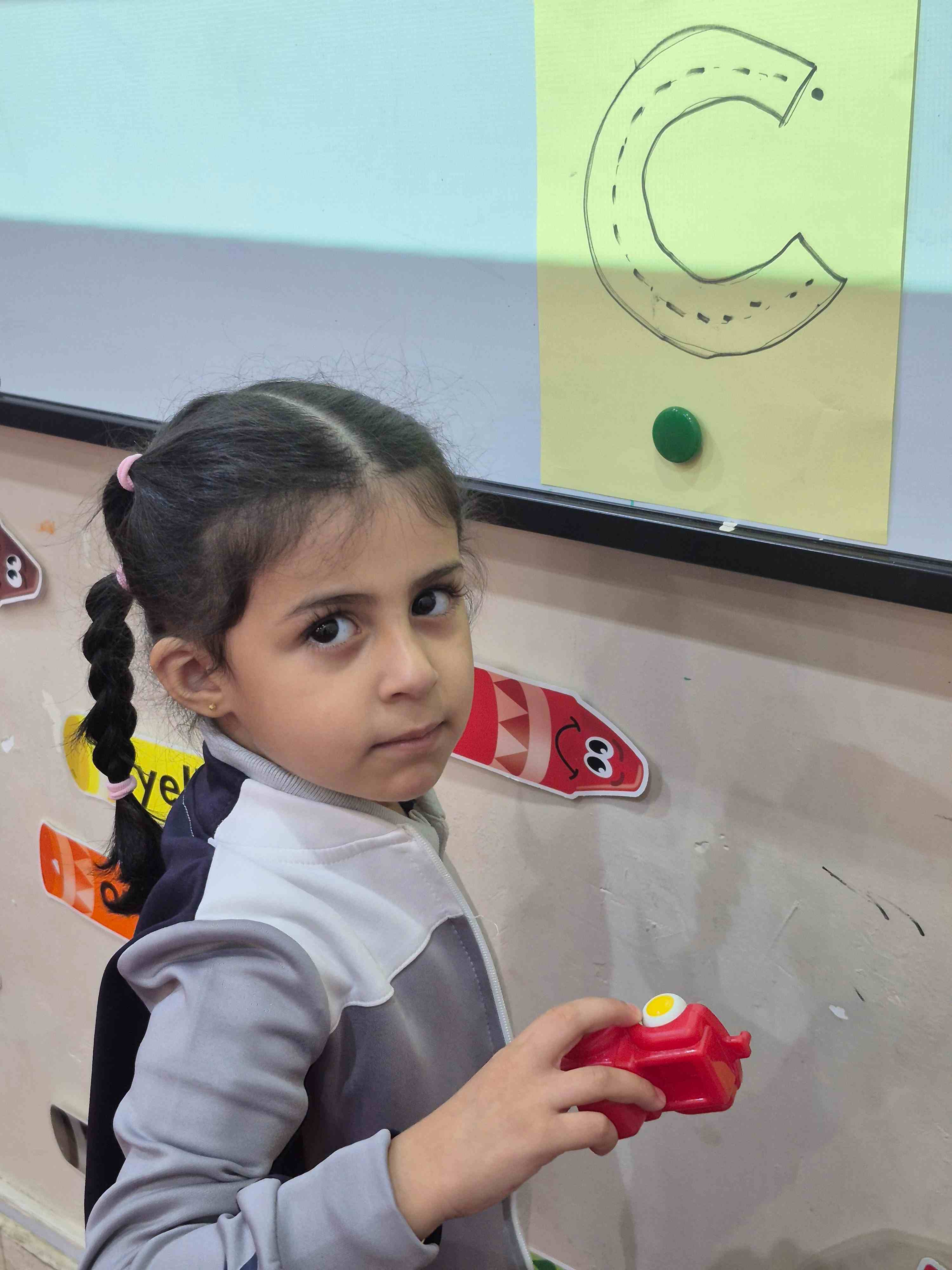 KG1 students practiced tracing the uppercase letter C in a fun and engaging way. A large capital C was printed on paper with a road drawn along its shape. Each student used a toy car to trace along the road, starting from the top and following the curve carefully. This activity helped students develop fine motor skills and letter recognition while enjoying a hands-on learning experience.