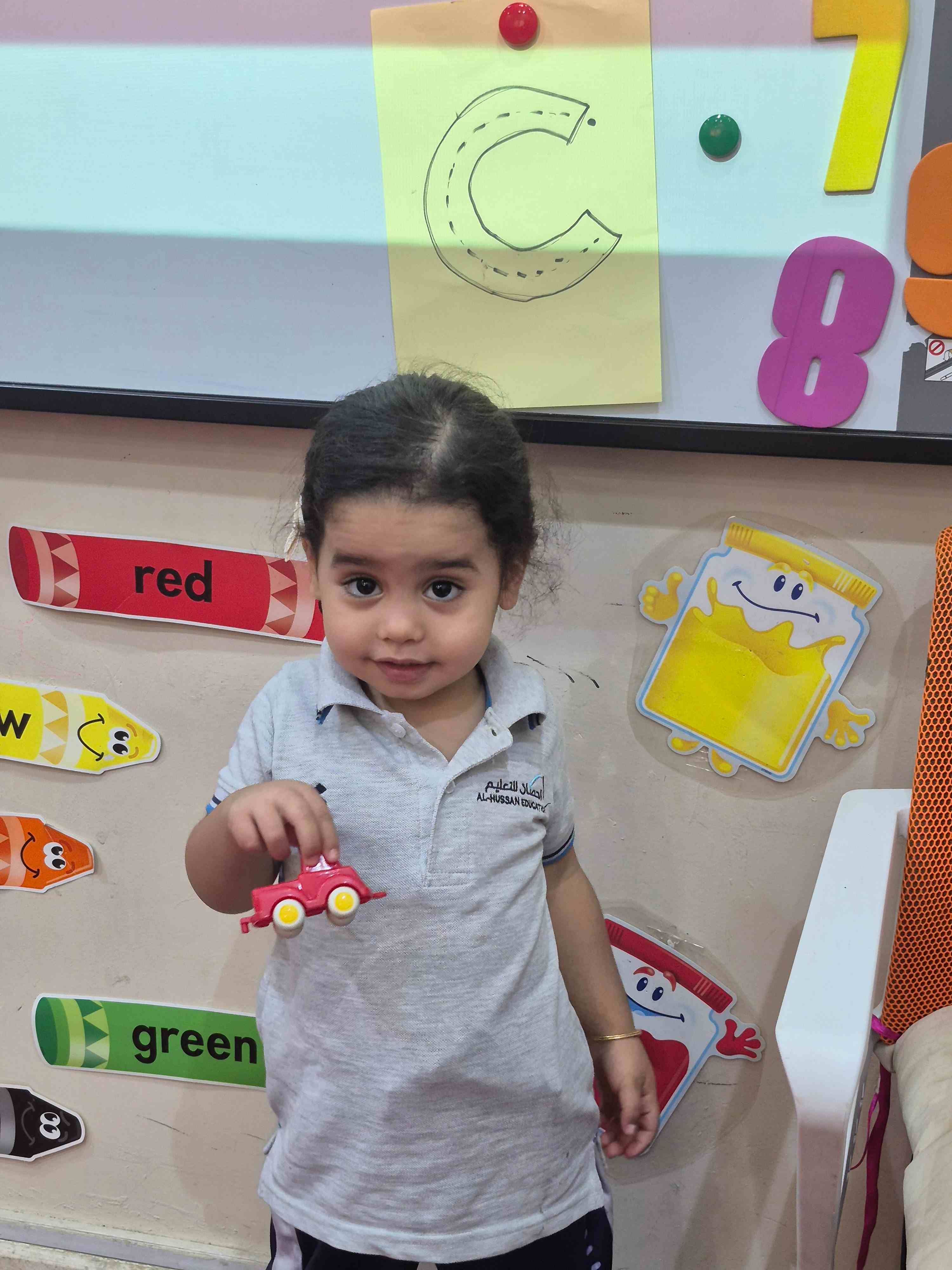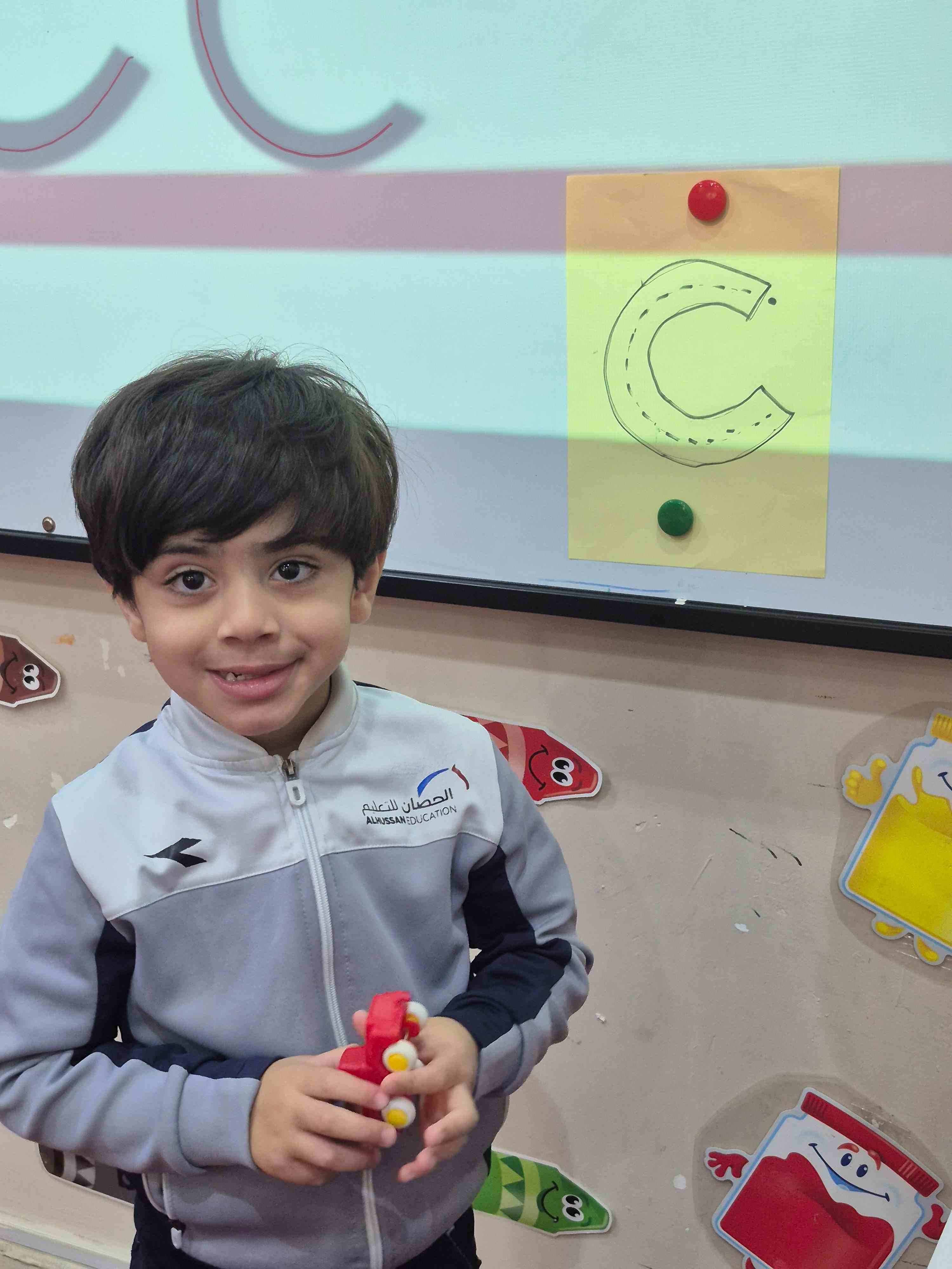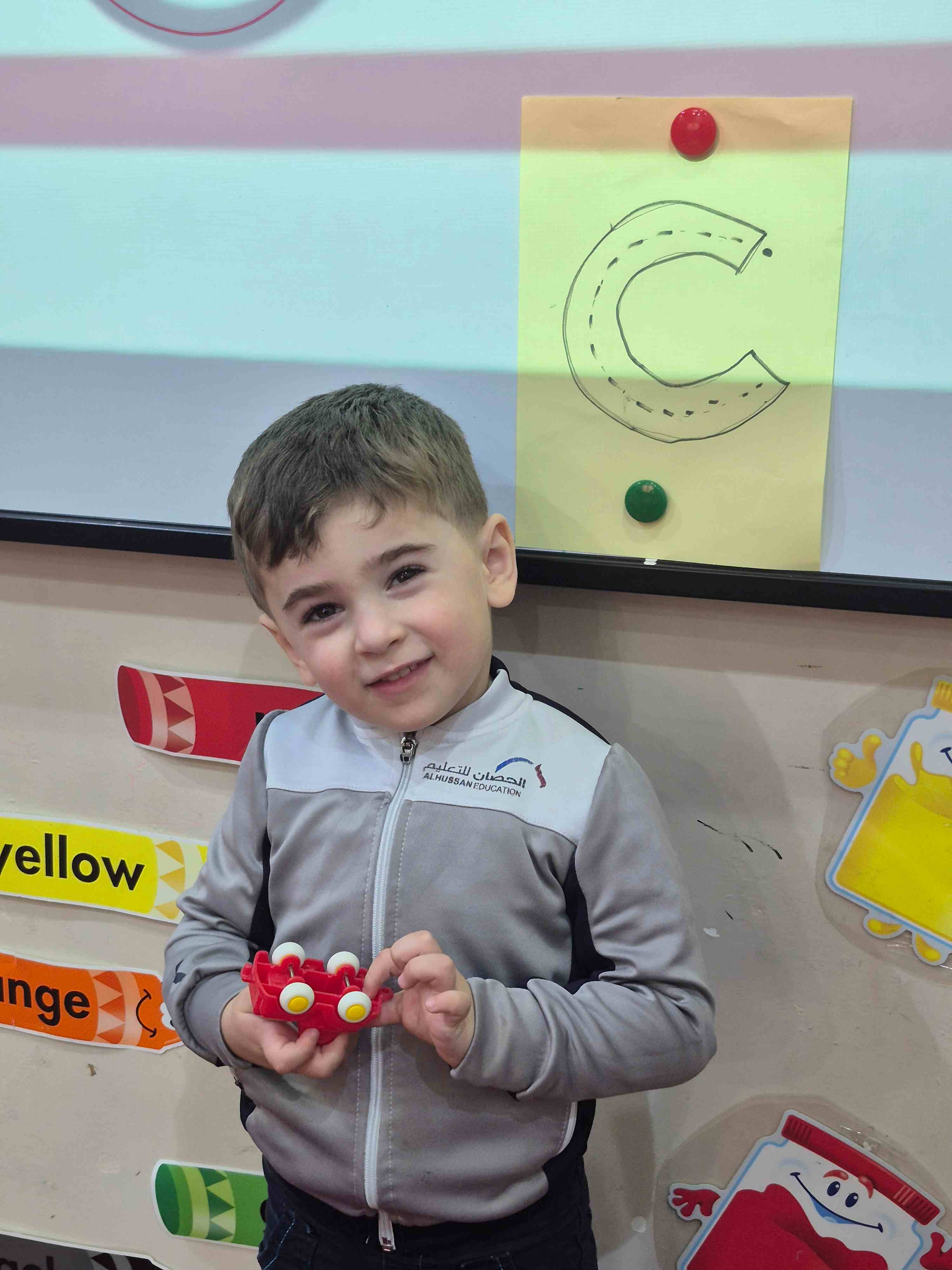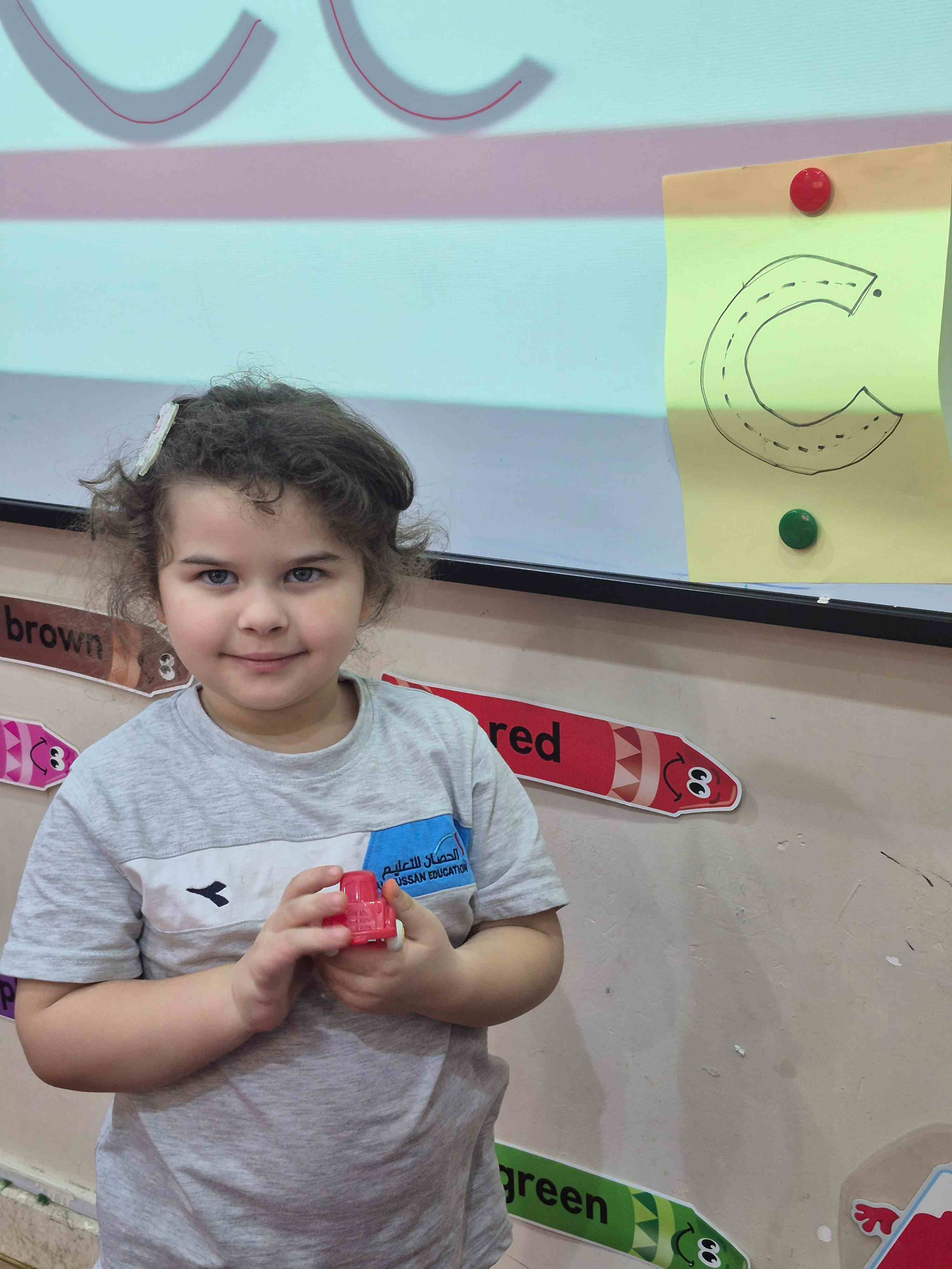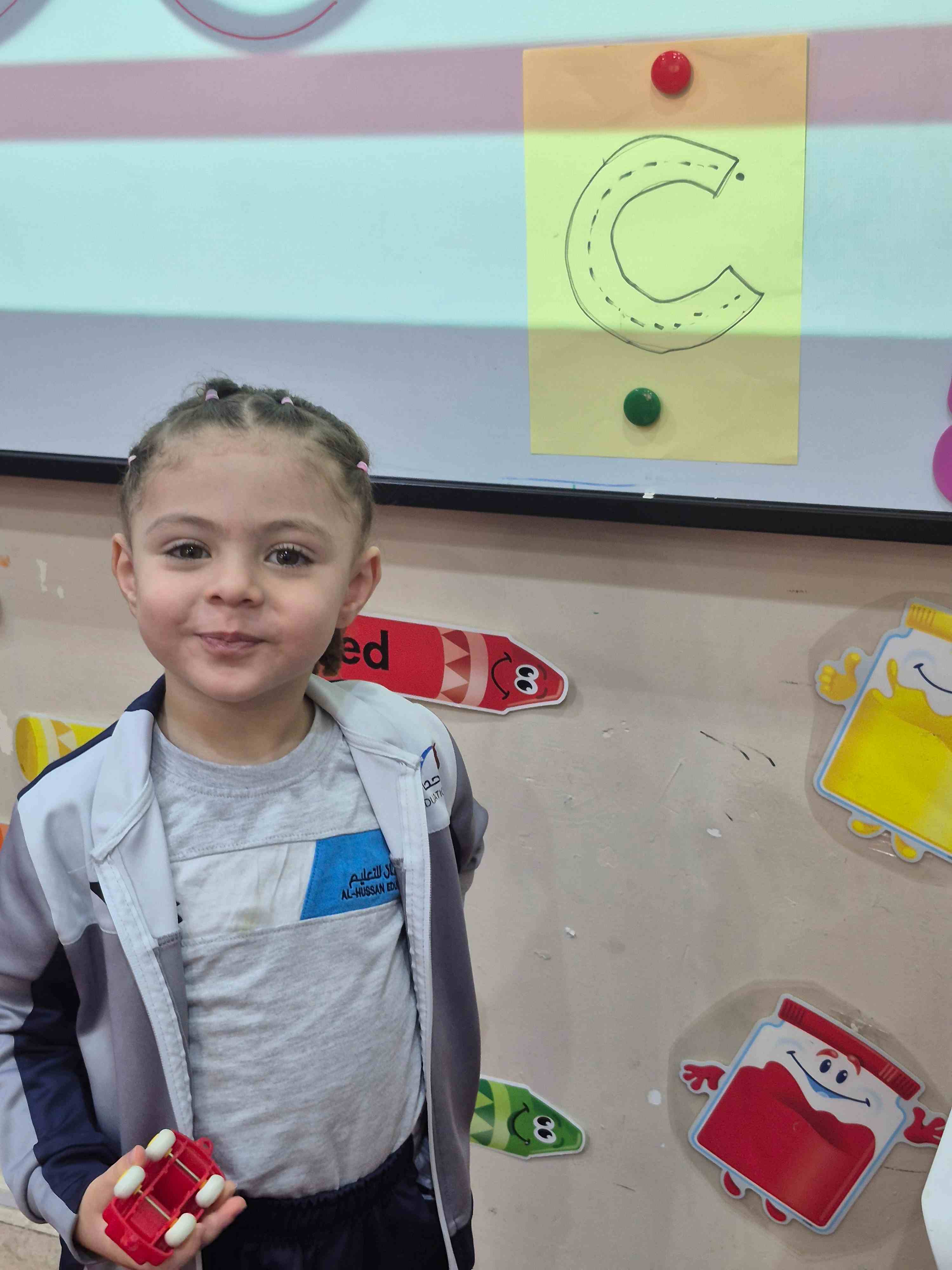 KG1 students practiced tracing the uppercase letter C in a fun and engaging way. A large capital C was printed on paper with a road drawn along its shape. Each student used a toy car to trace along the road, starting from the top and following the curve carefully. This activity helped students develop fine motor skills and letter recognition while enjoying a hands-on learning experience.