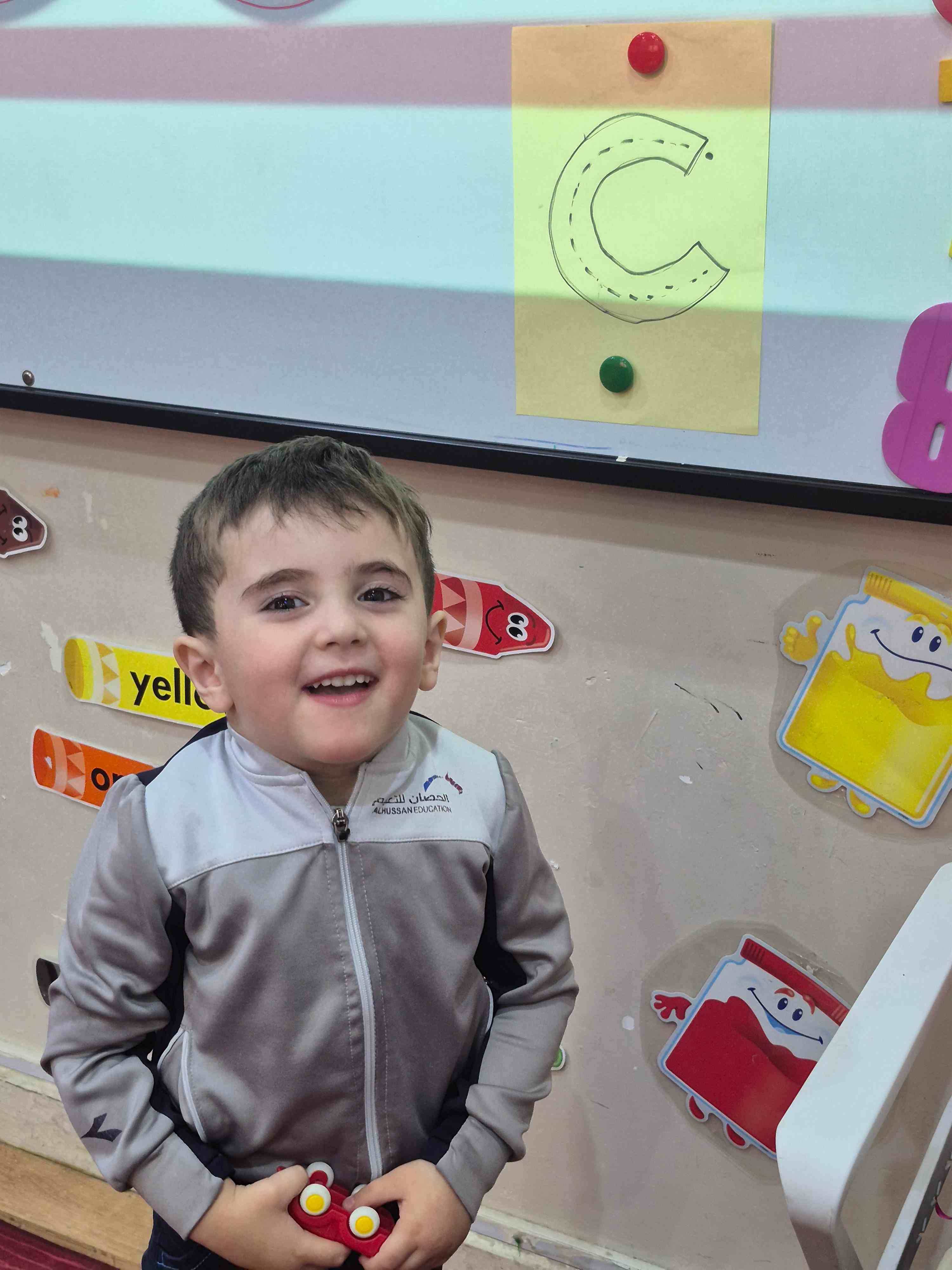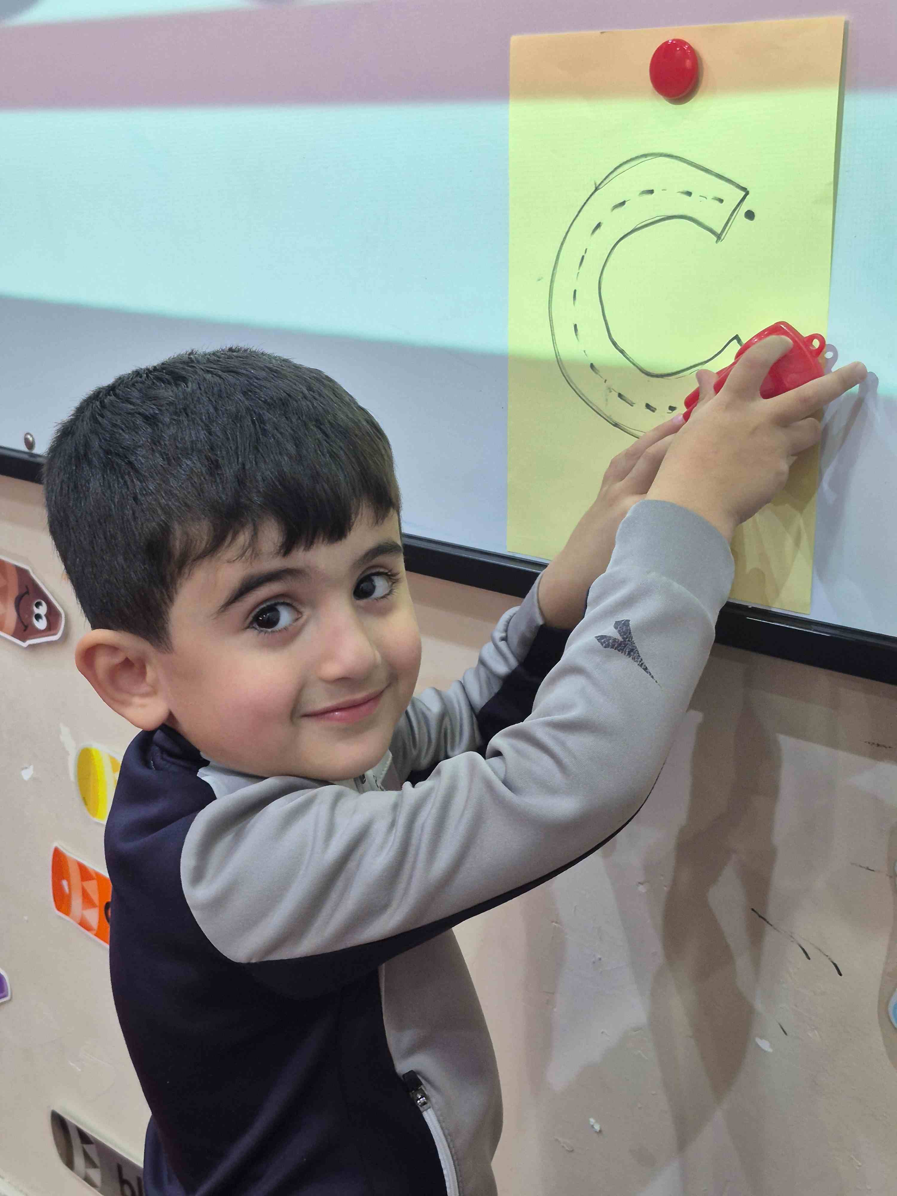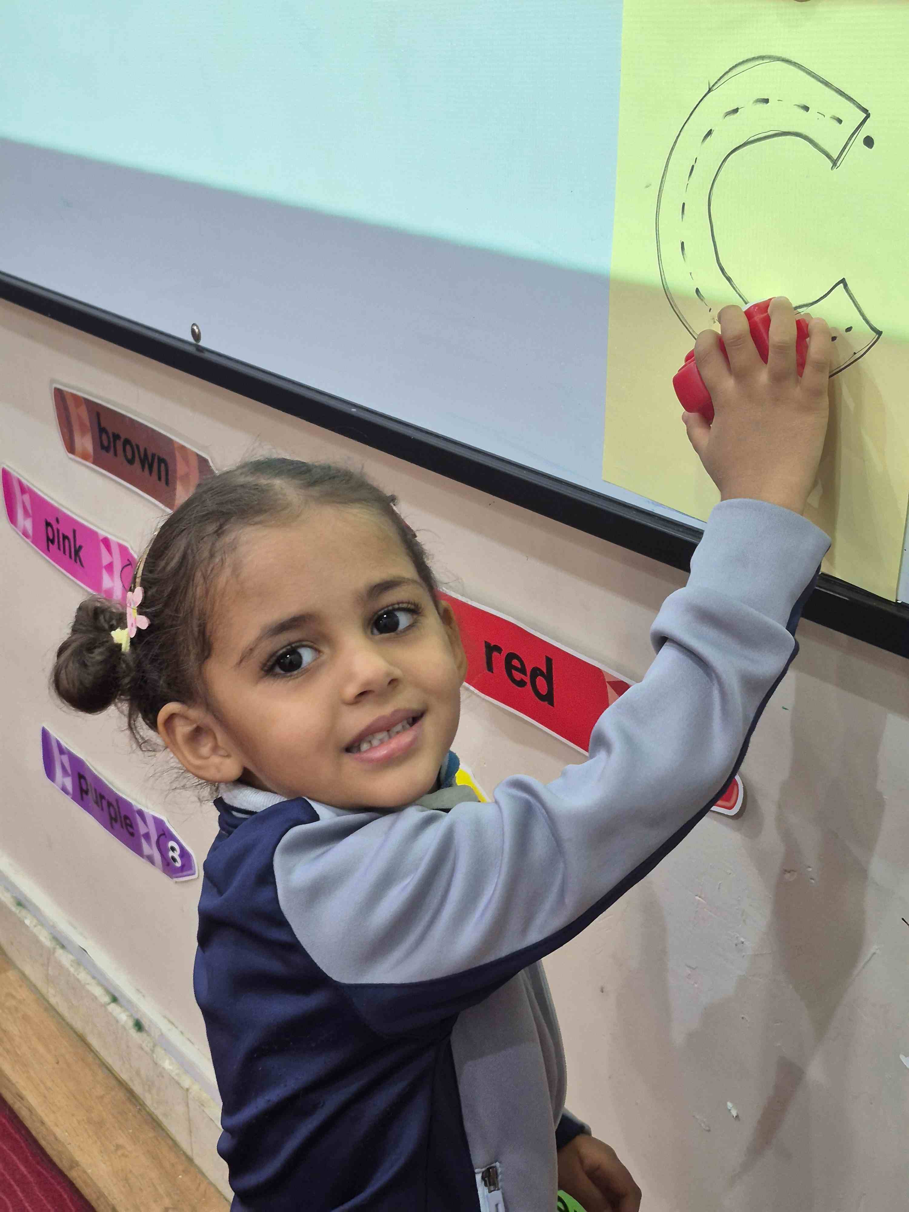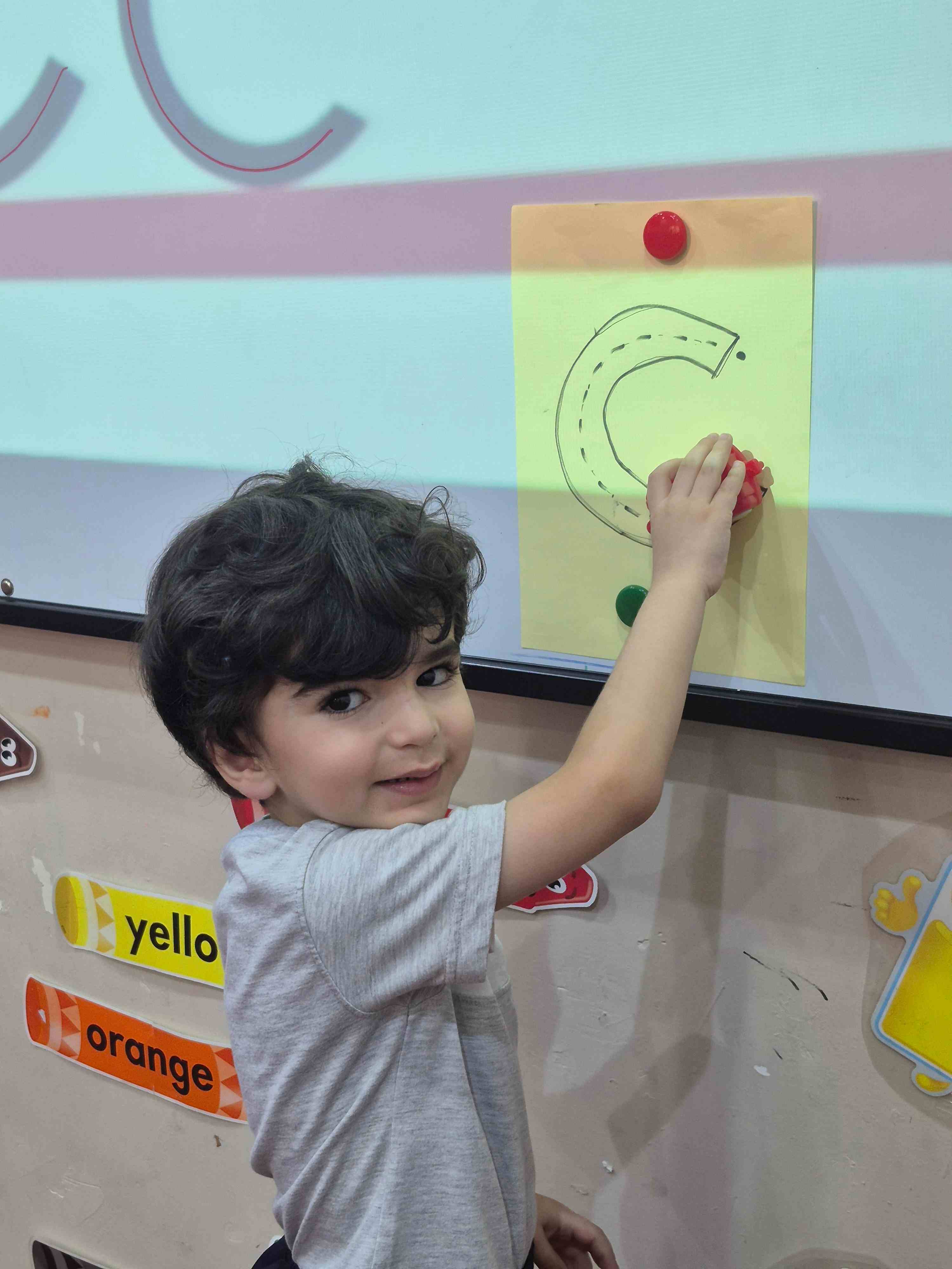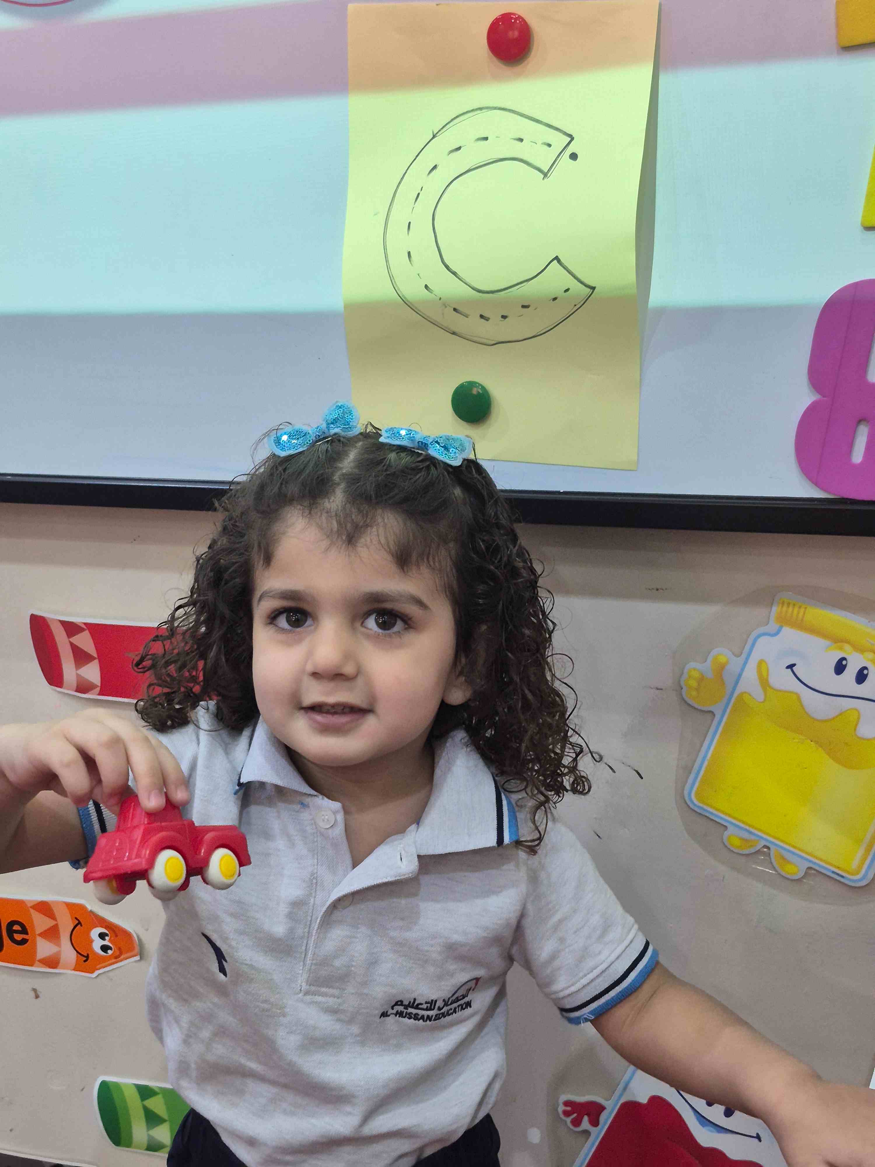KG1 students practiced tracing the uppercase letter C in a fun and engaging way. A large capital C was printed on paper with a road drawn along its shape. Each student used a toy car to trace along the road, starting from the top and following the curve carefully. This activity helped students develop fine motor skills and letter recognition while enjoying a hands-on learning experience.