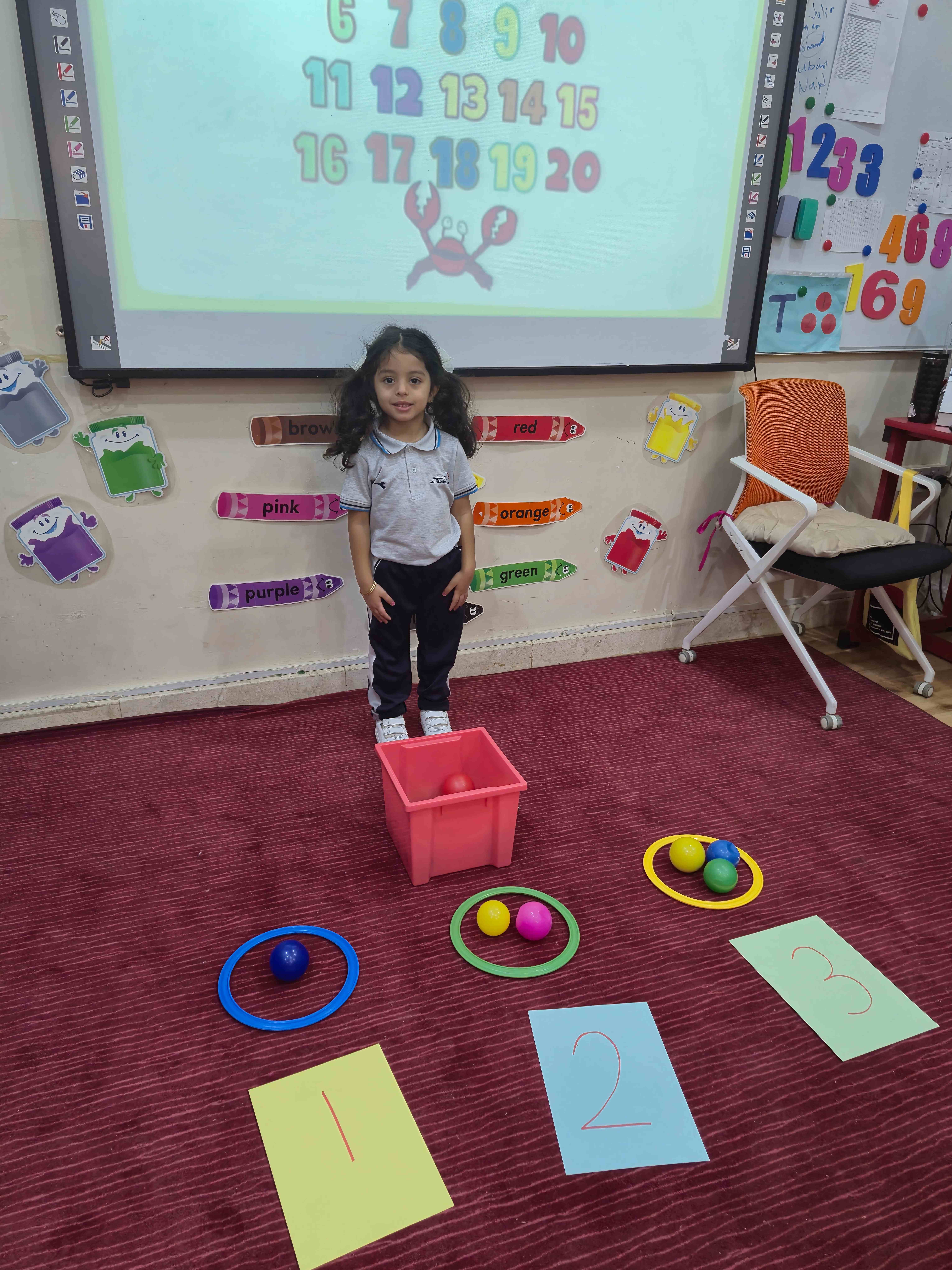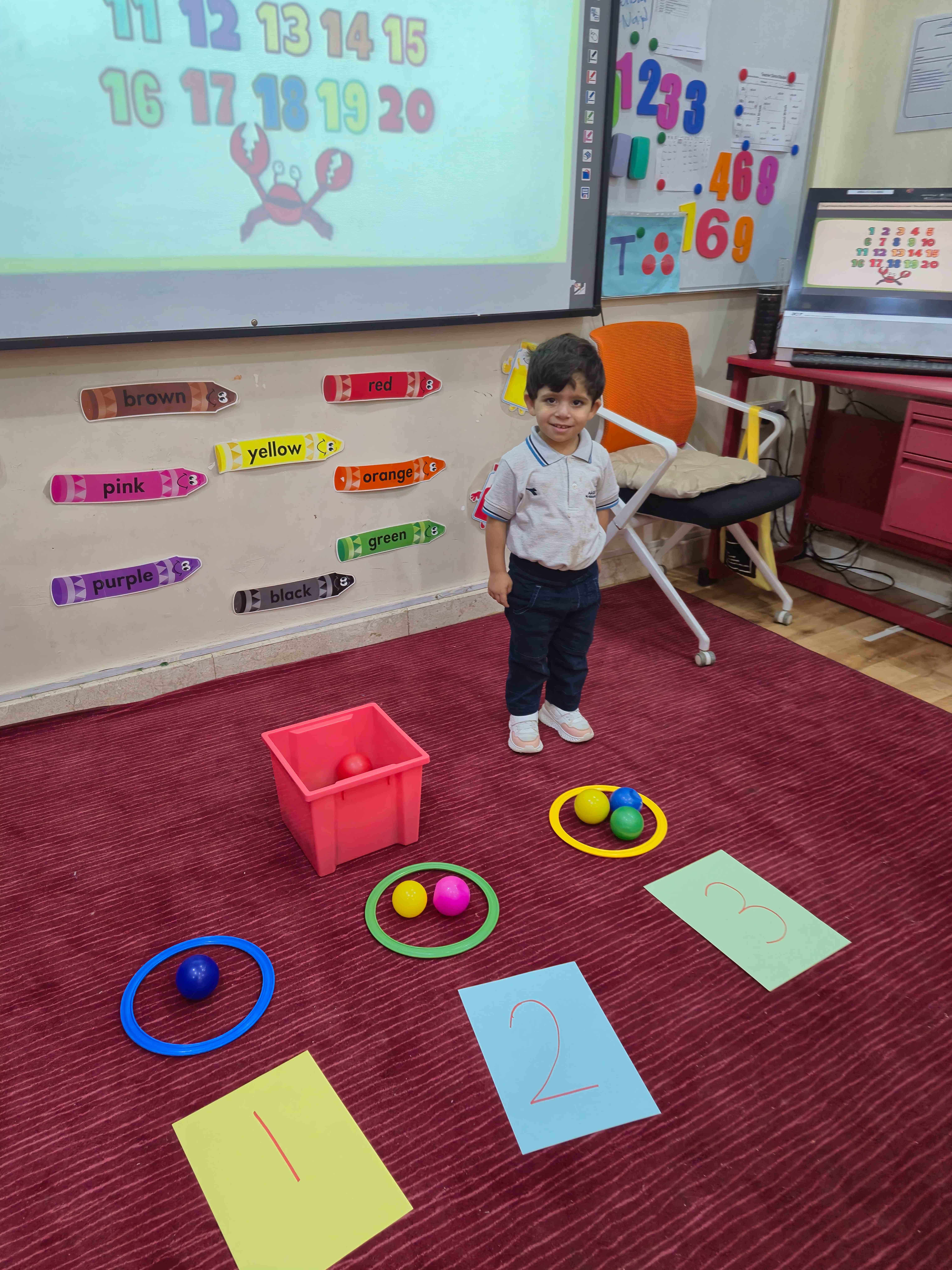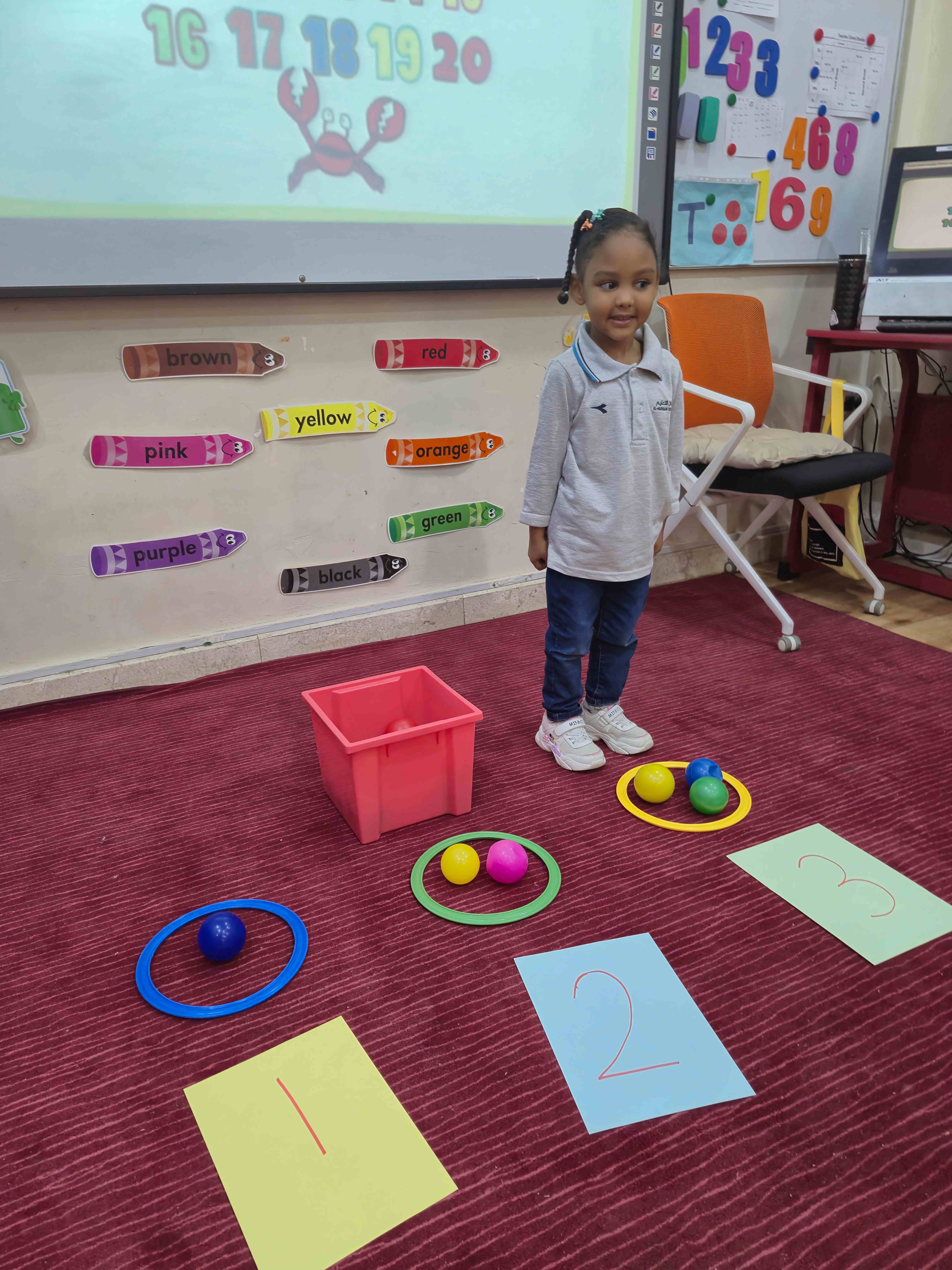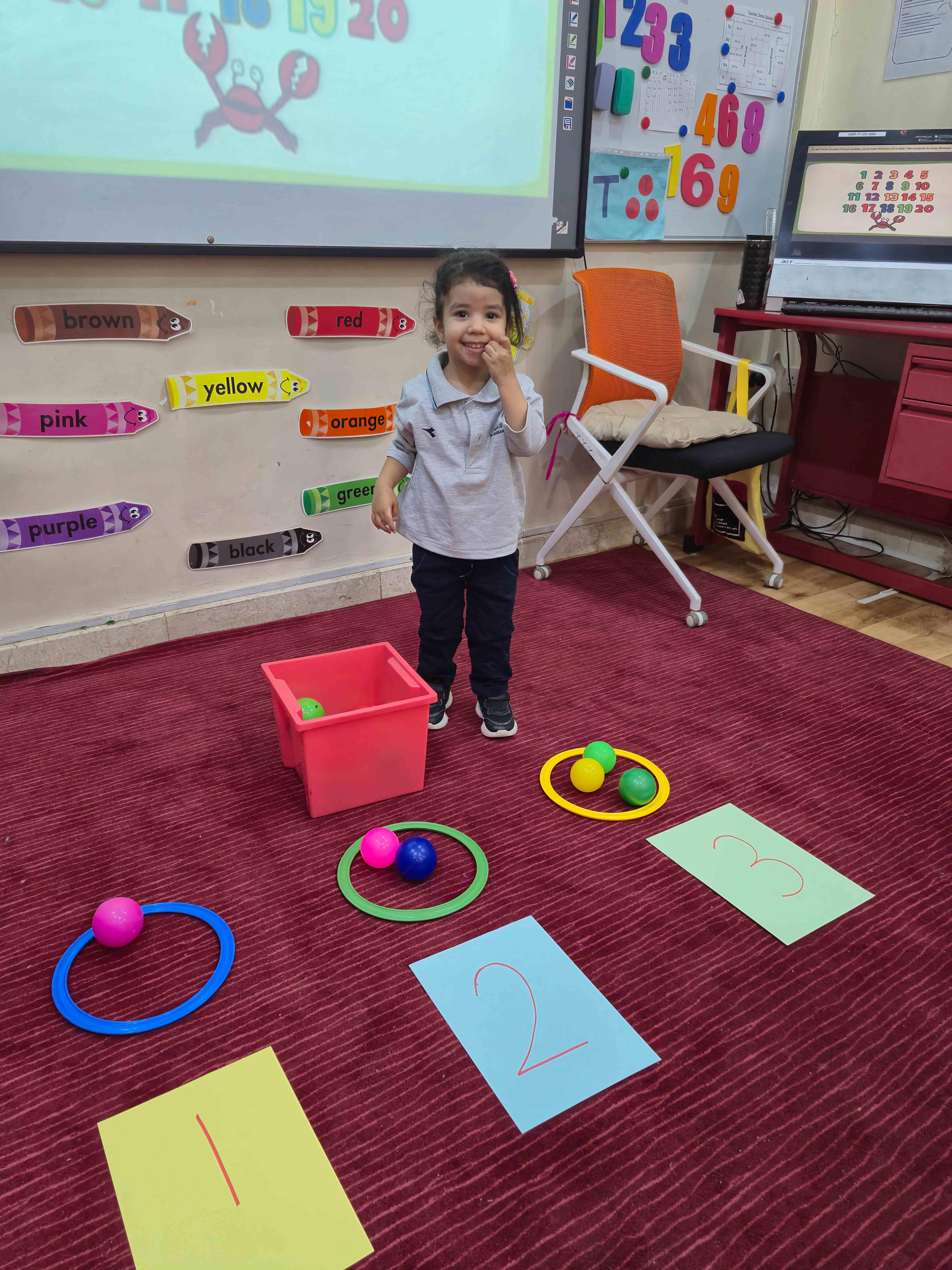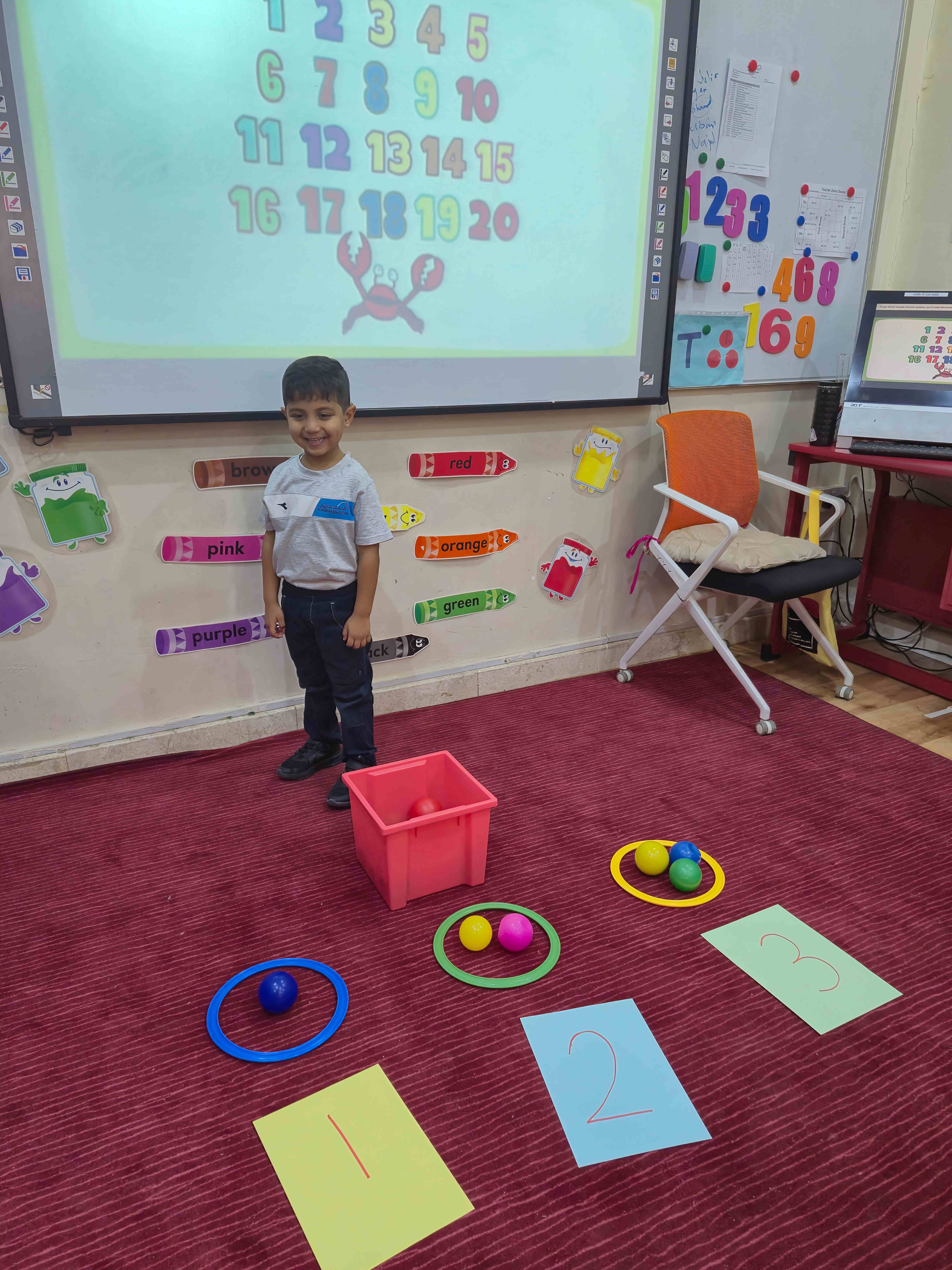 The KG1 students practiced number recognition and counting skills. Each student looked at the written number and matched it with the correct number of balls. They picked balls from a box—one, two, or three—according to the number shown, and placed them inside the circle above the written number. This fun, hands-on activity helped students understand counting quantities and number-symbol connection while improving fine motor skills.