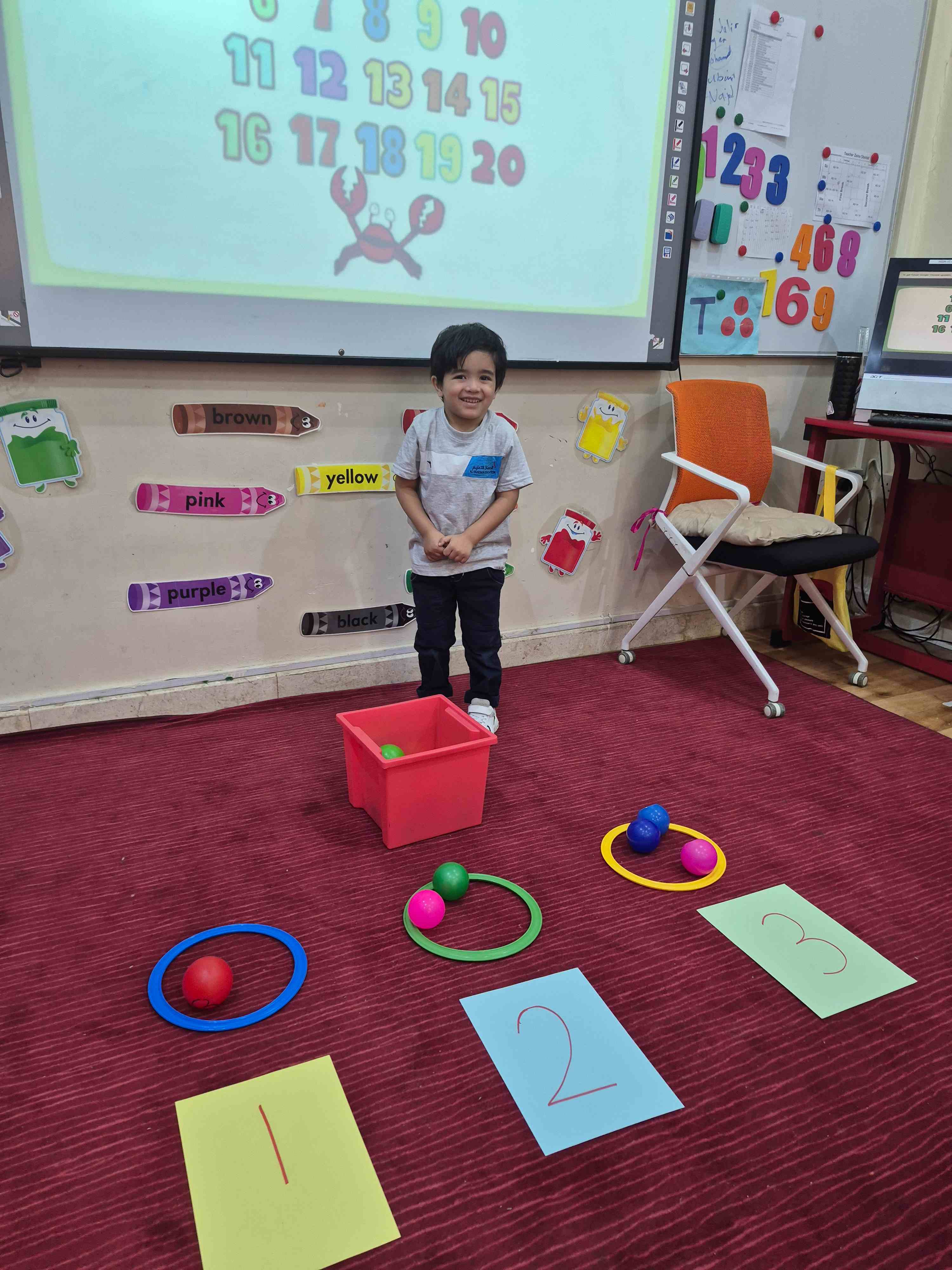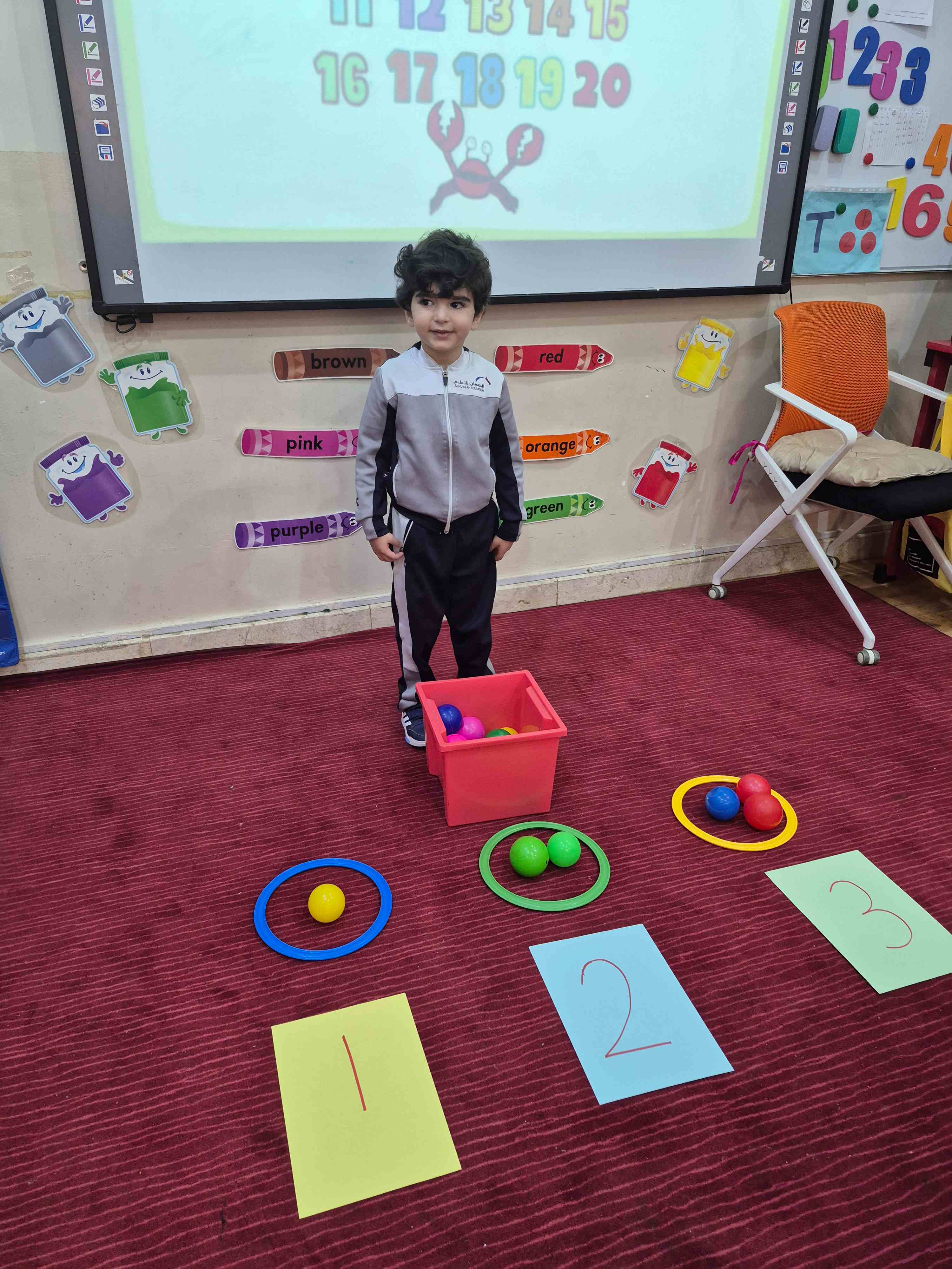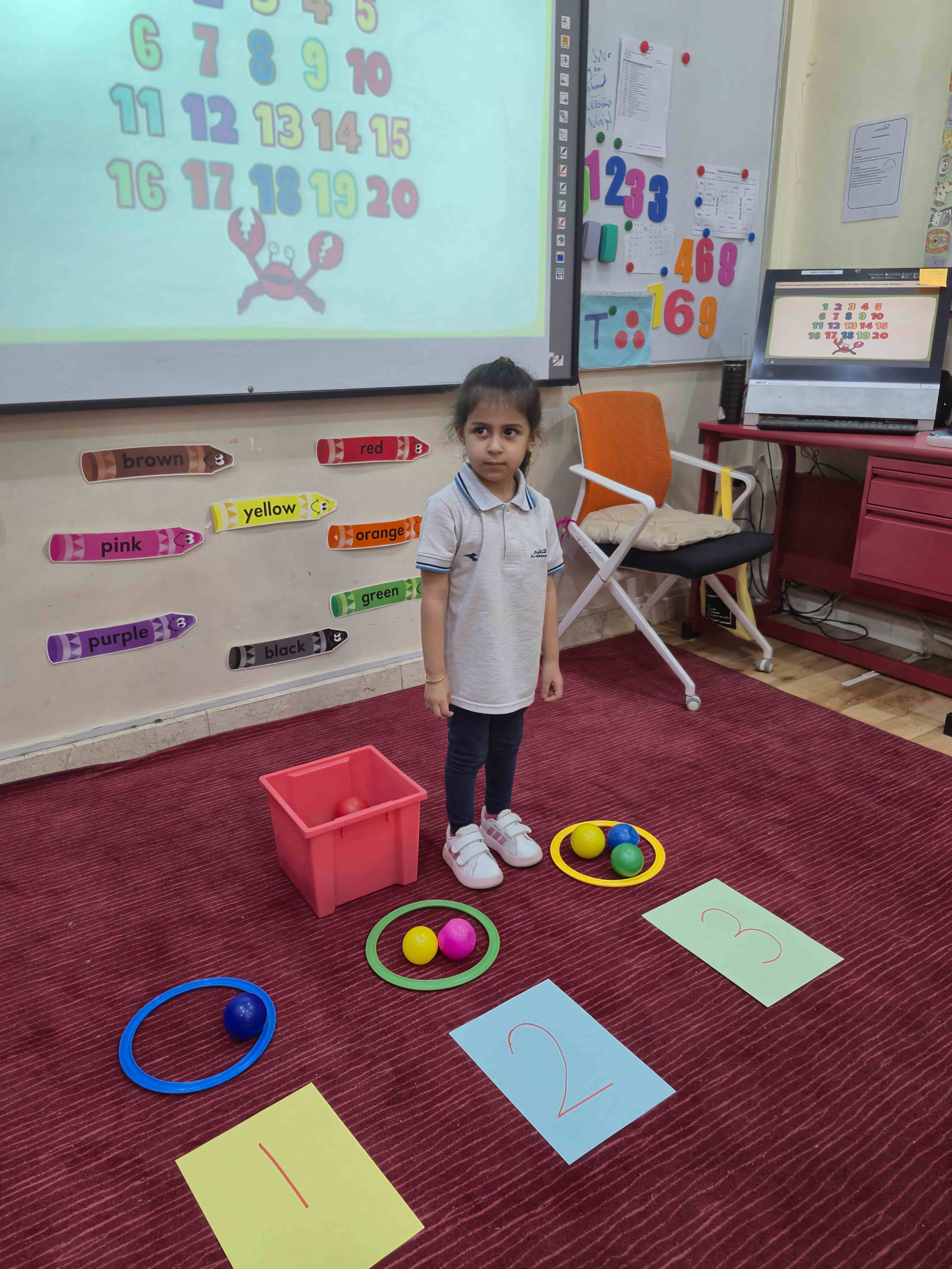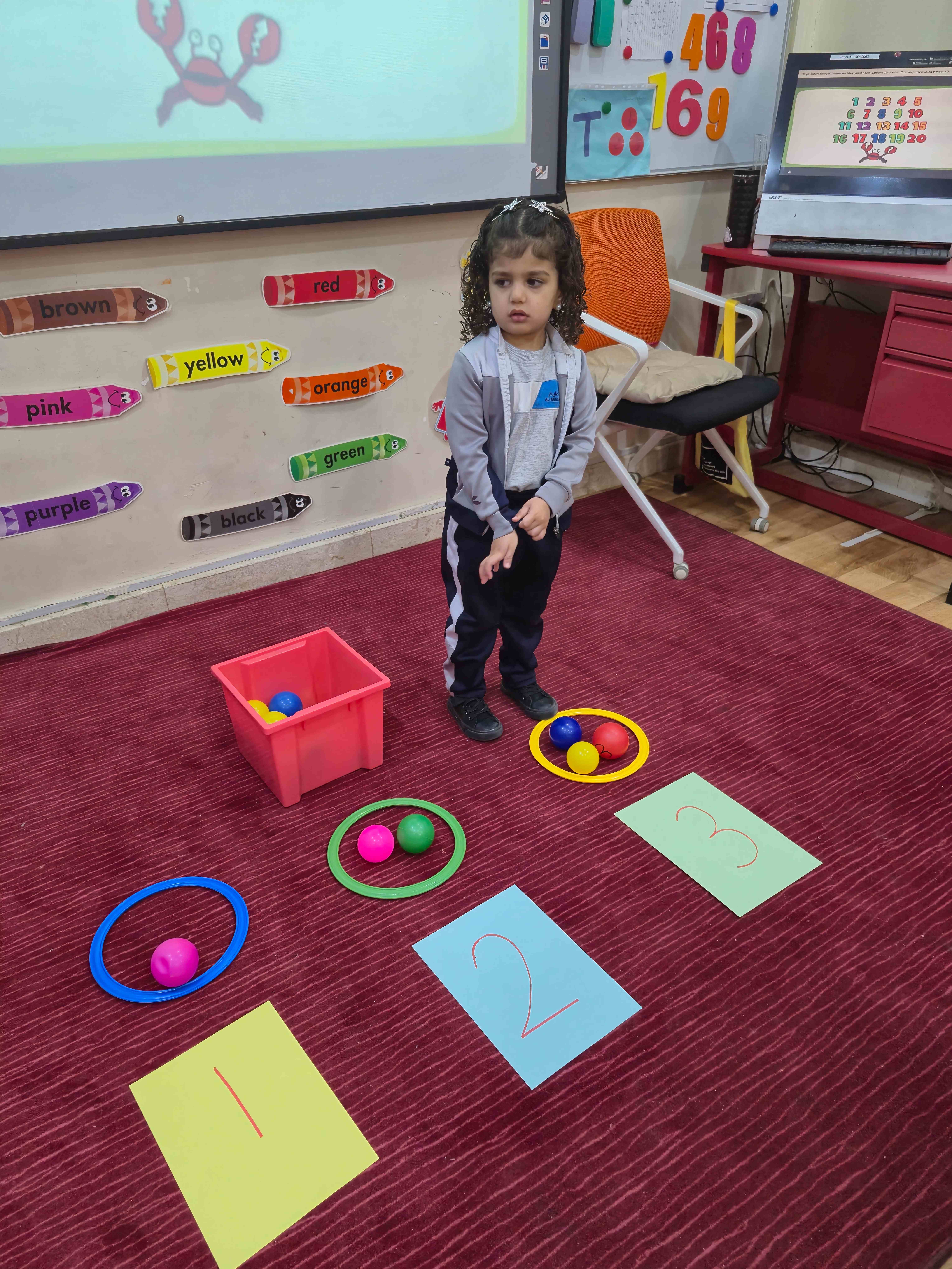 The KG1 students practiced number recognition and counting skills. Each student looked at the written number and matched it with the correct number of balls. They picked balls from a box—one, two, or three—according to the number shown, and placed them inside the circle above the written number. This fun, hands-on activity helped students understand counting quantities and number-symbol connection while improving fine motor skills.