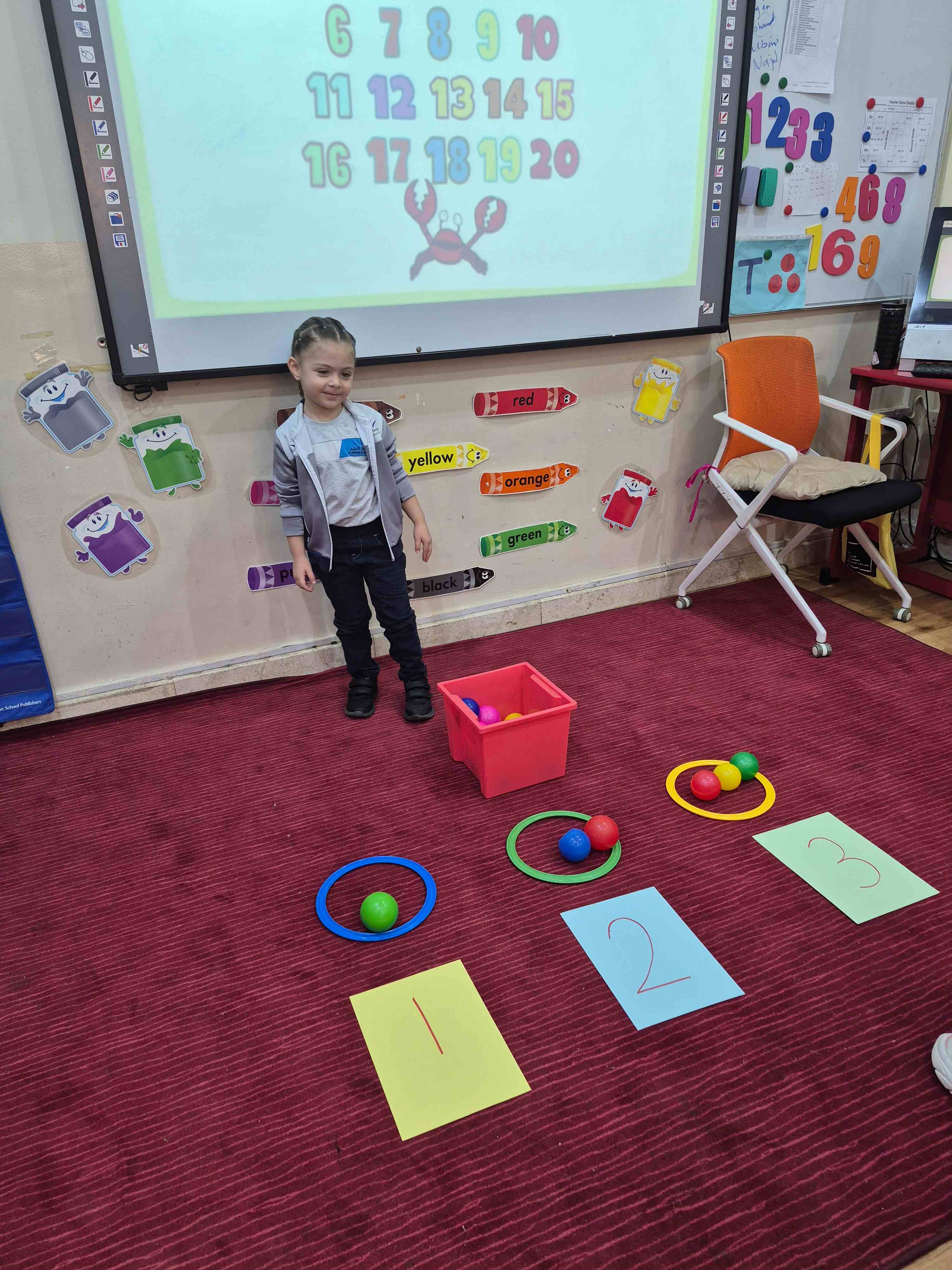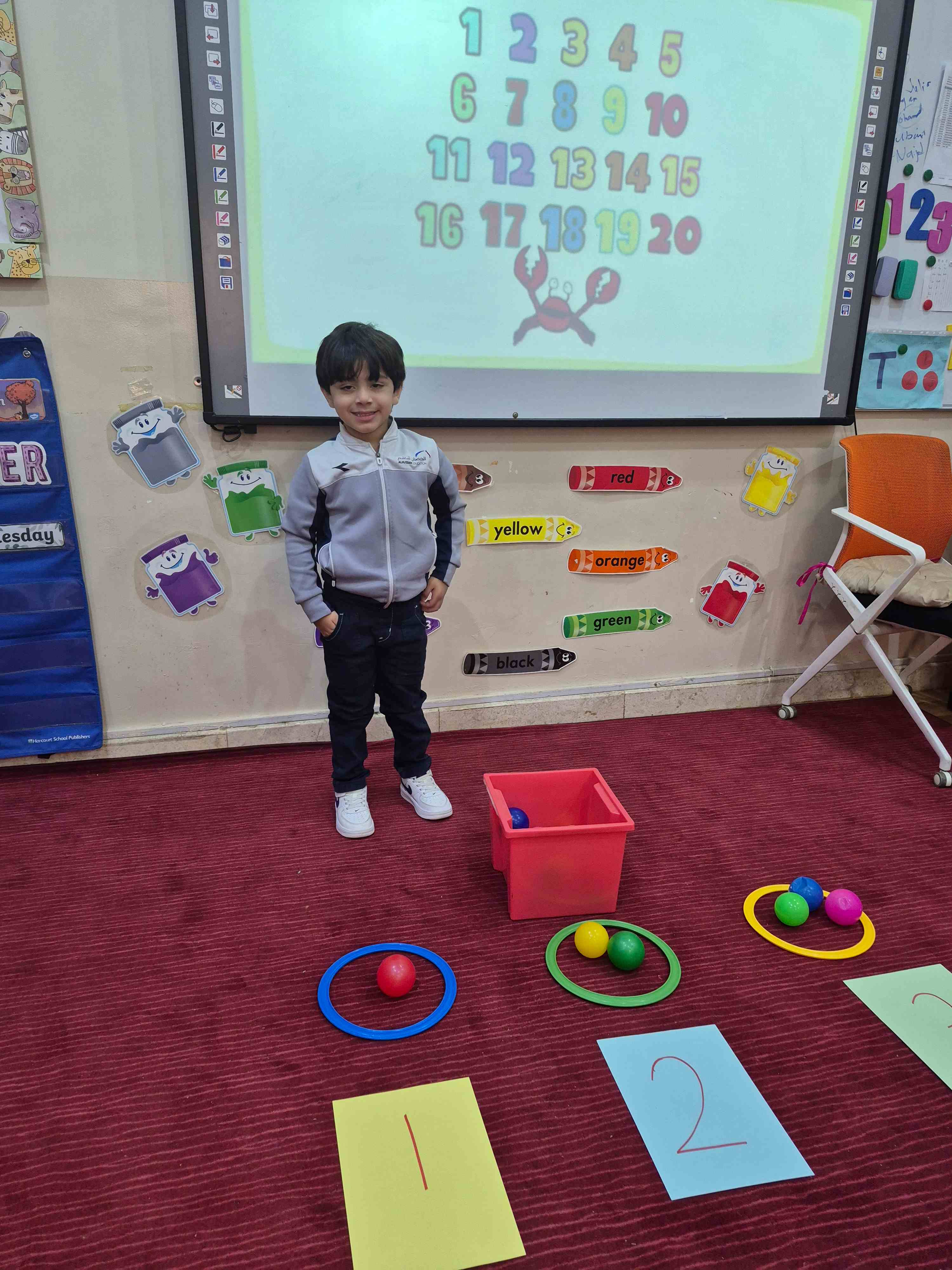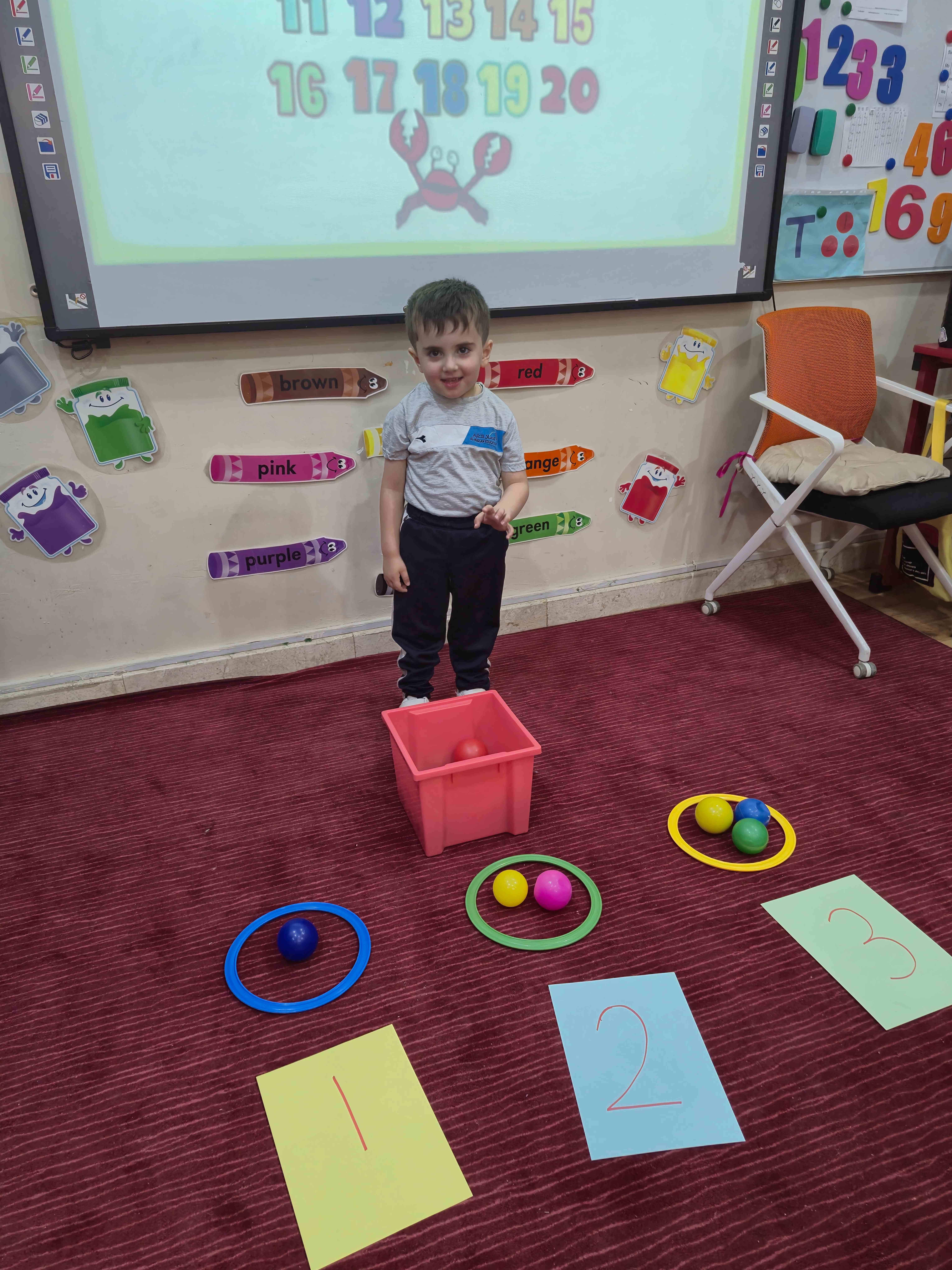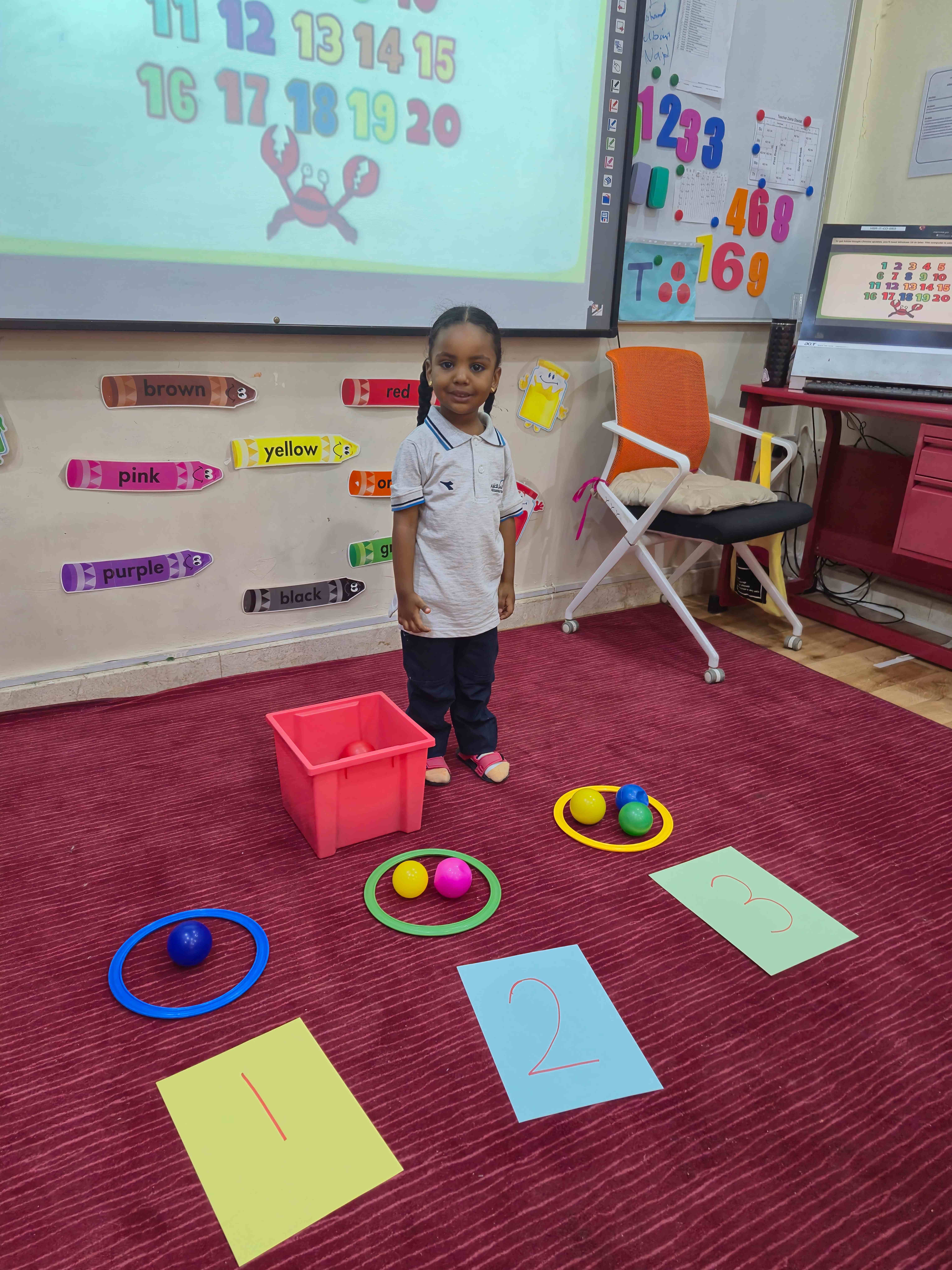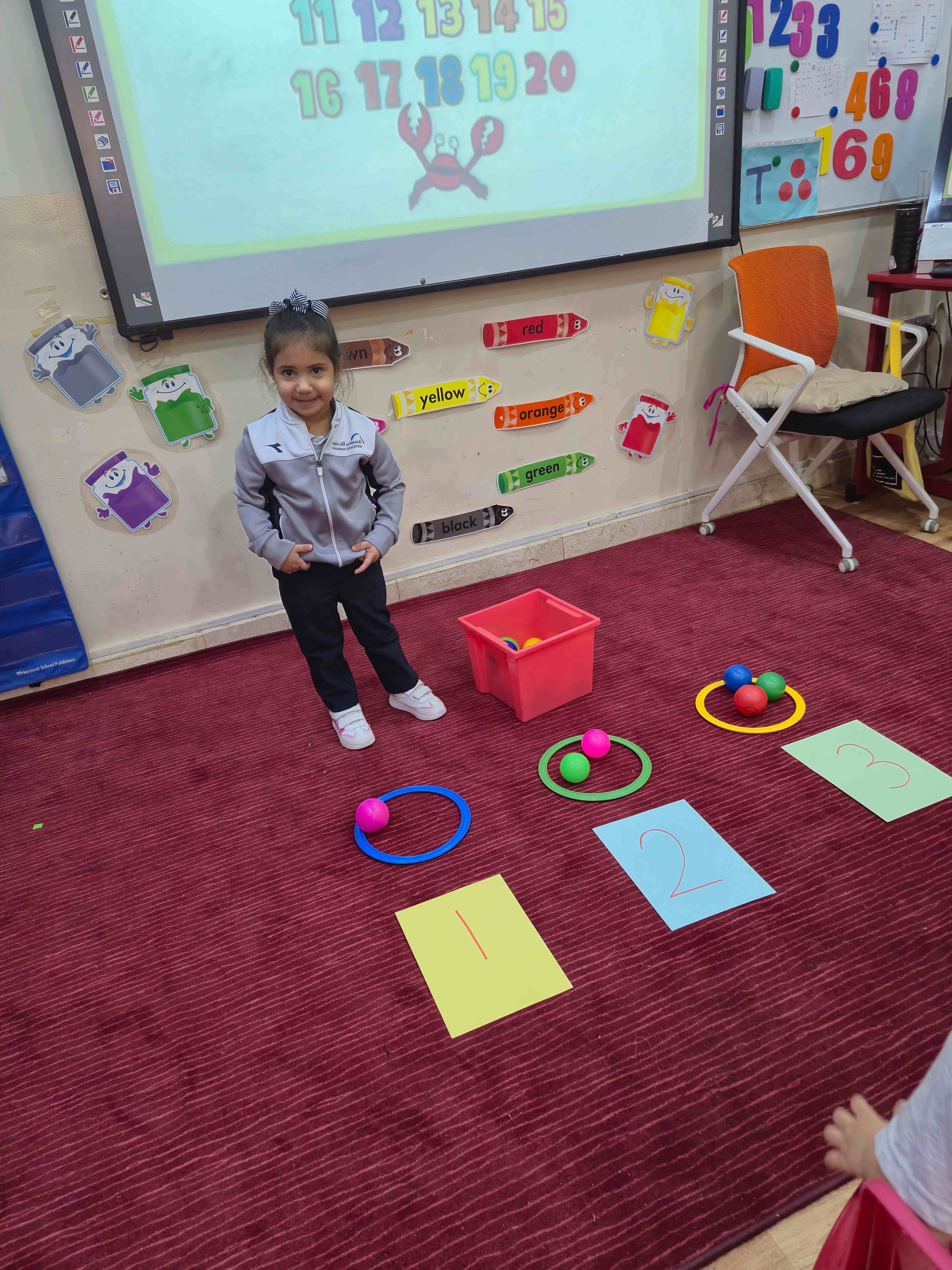 The KG1 students practiced number recognition and counting skills. Each student looked at the written number and matched it with the correct number of balls. They picked balls from a box—one, two, or three—according to the number shown, and placed them inside the circle above the written number. This fun, hands-on activity helped students understand counting quantities and number-symbol connection while improving fine motor skills.