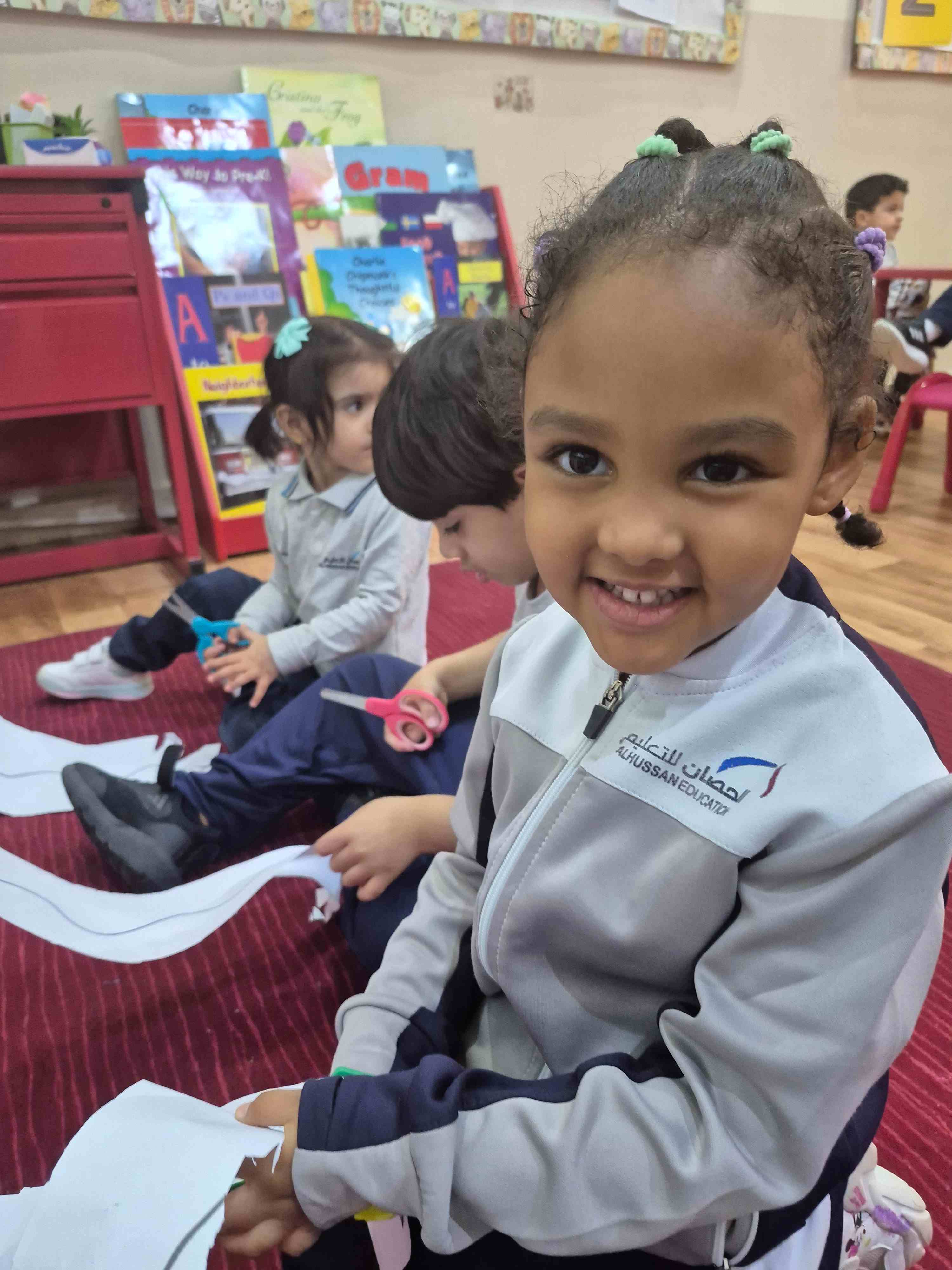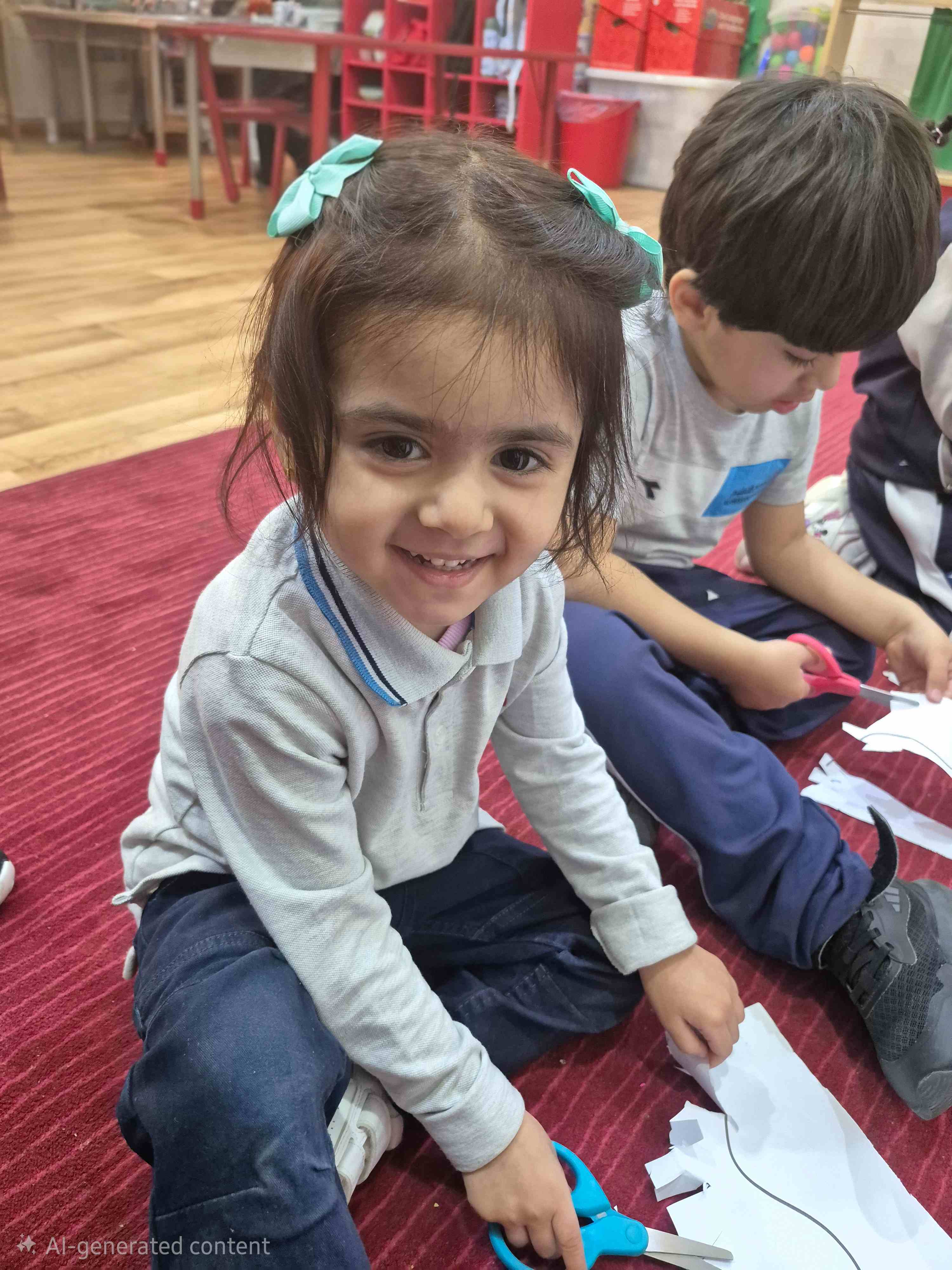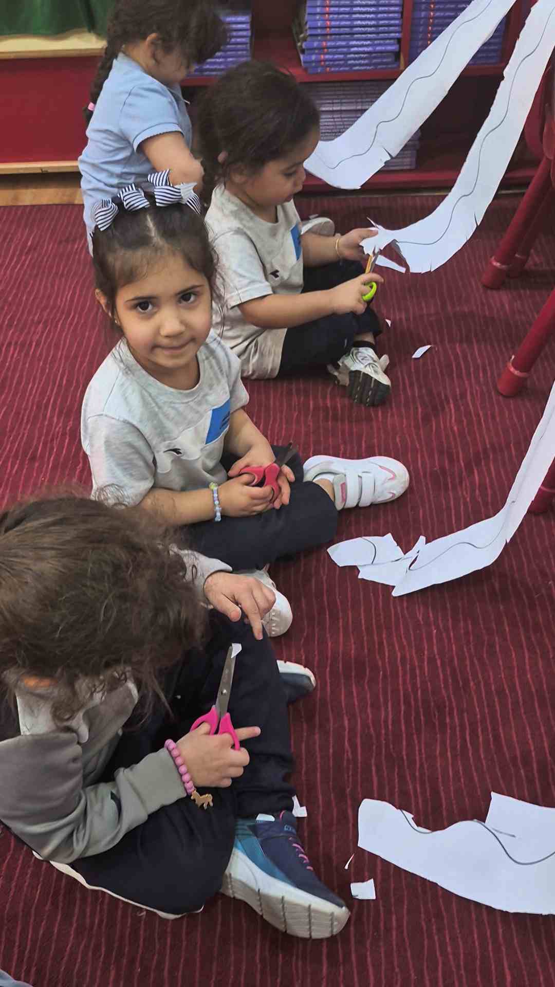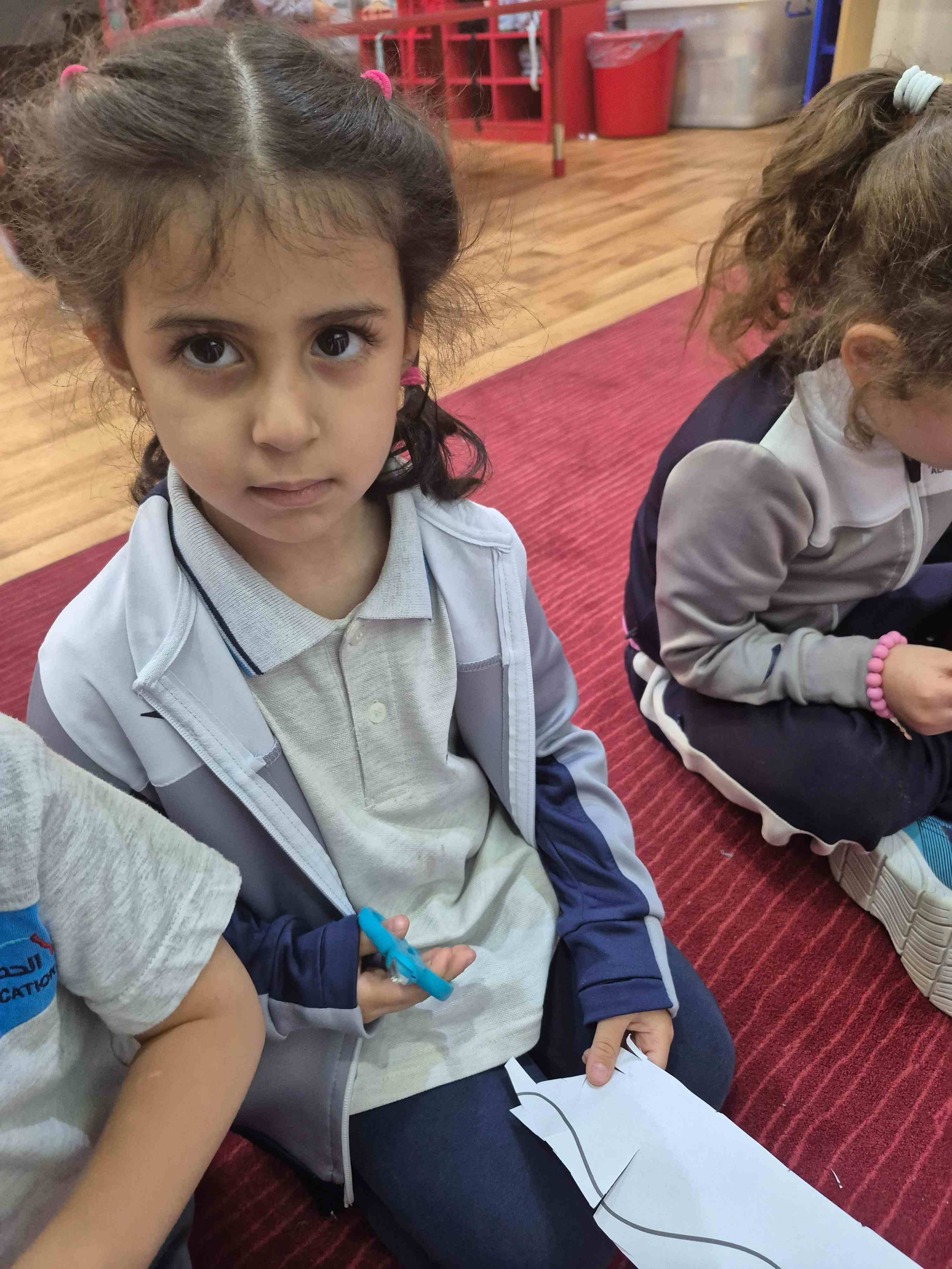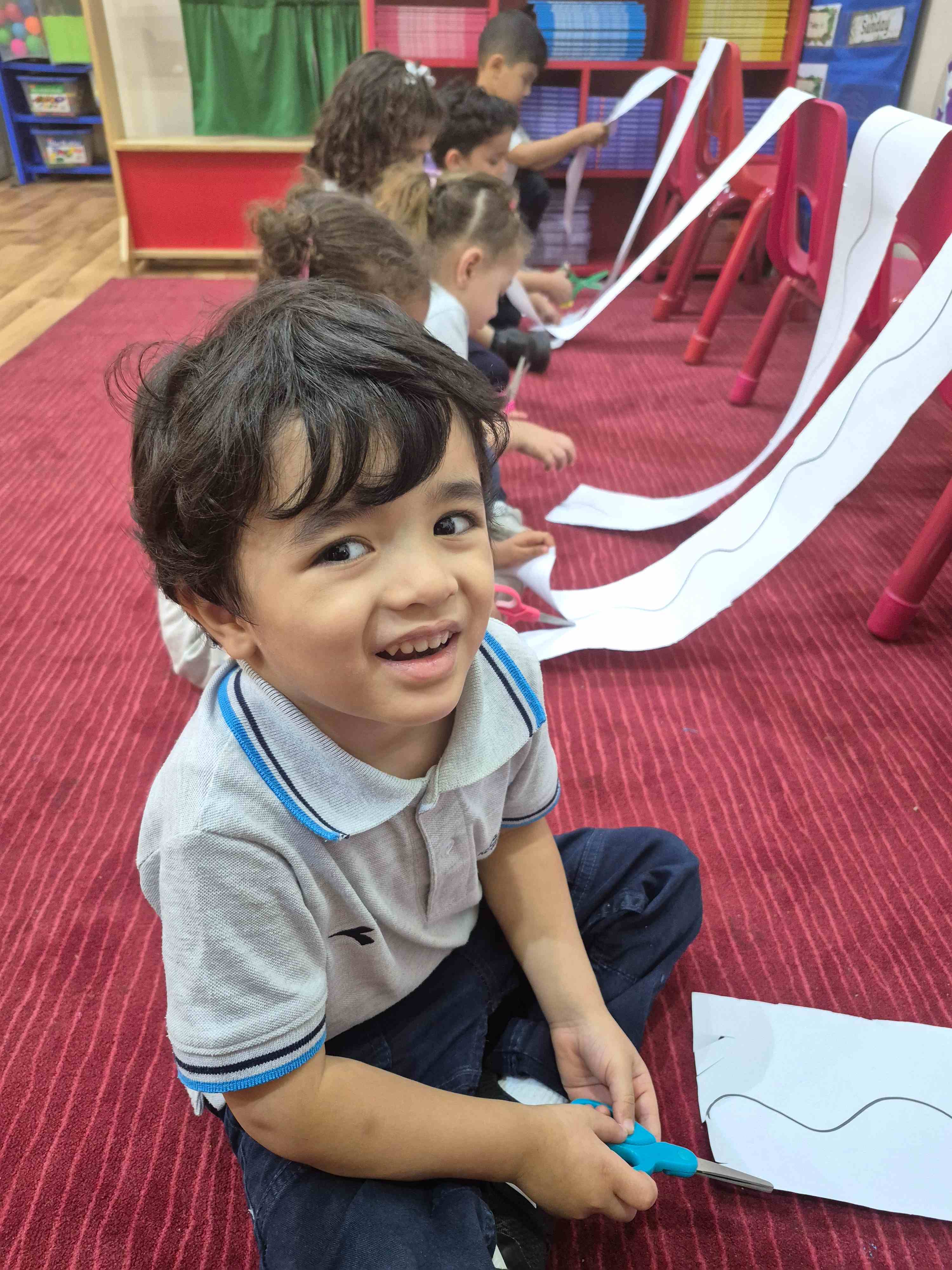 The KG1 students took part in a cutting activity to practice their fine motor skills. Each child was given a strip of paper with a curved line drawn on it. Using safe kid-friendly scissors, students carefully cut along the curved line, following the shape from one end to the other. This activity helped them develop hand–eye coordination, scissor control, and concentration while having fun cutting along the wavy path.
