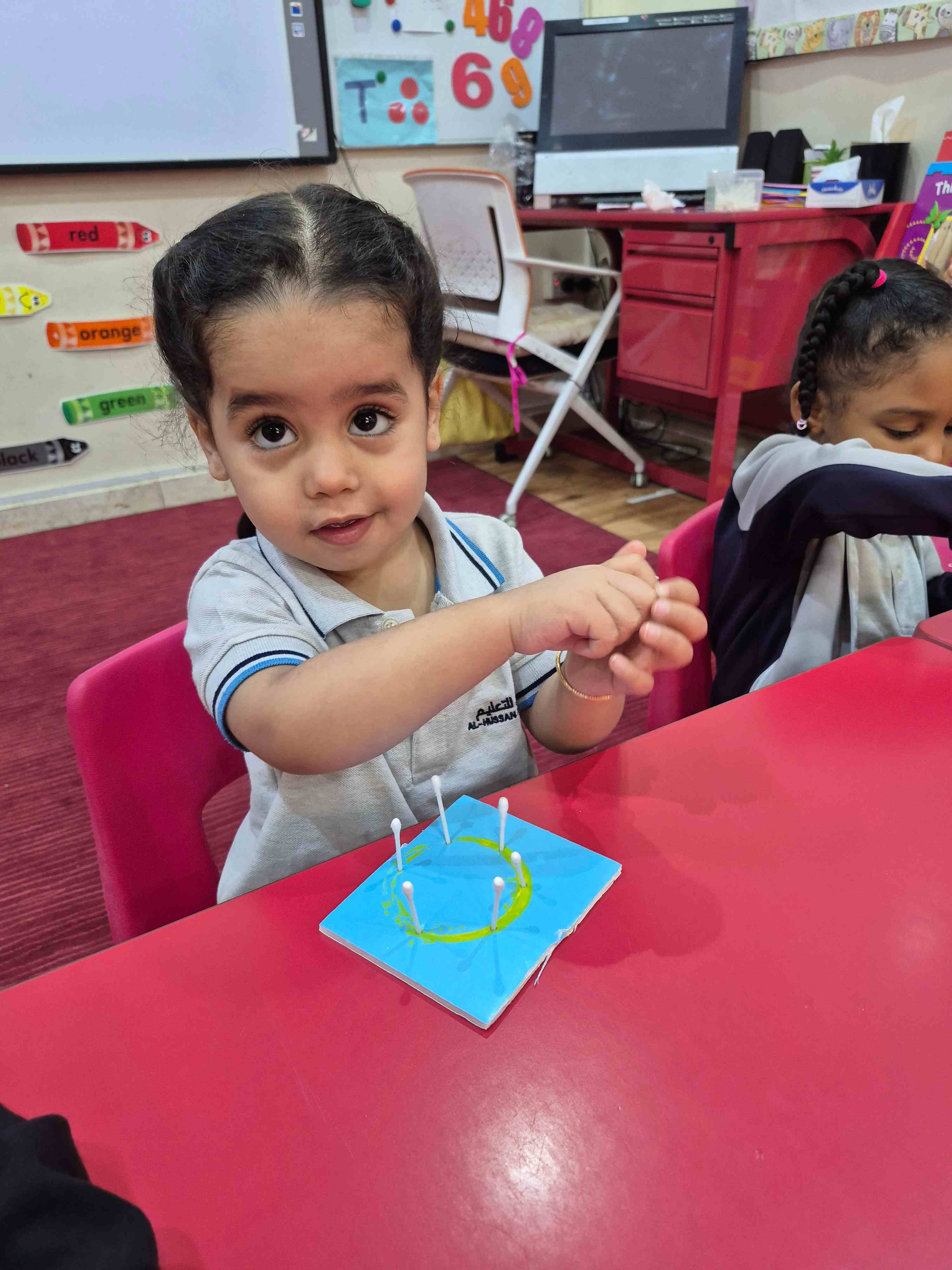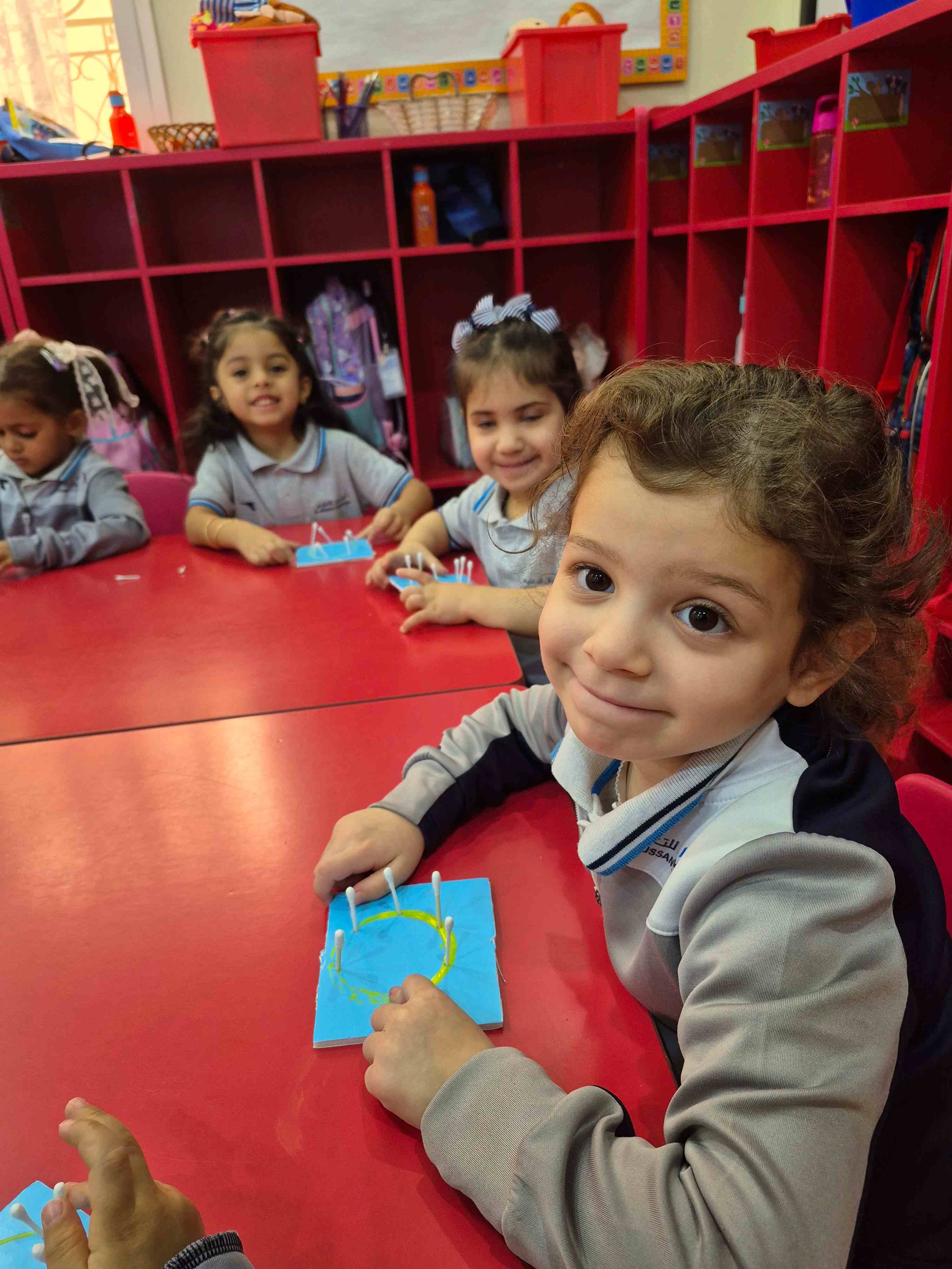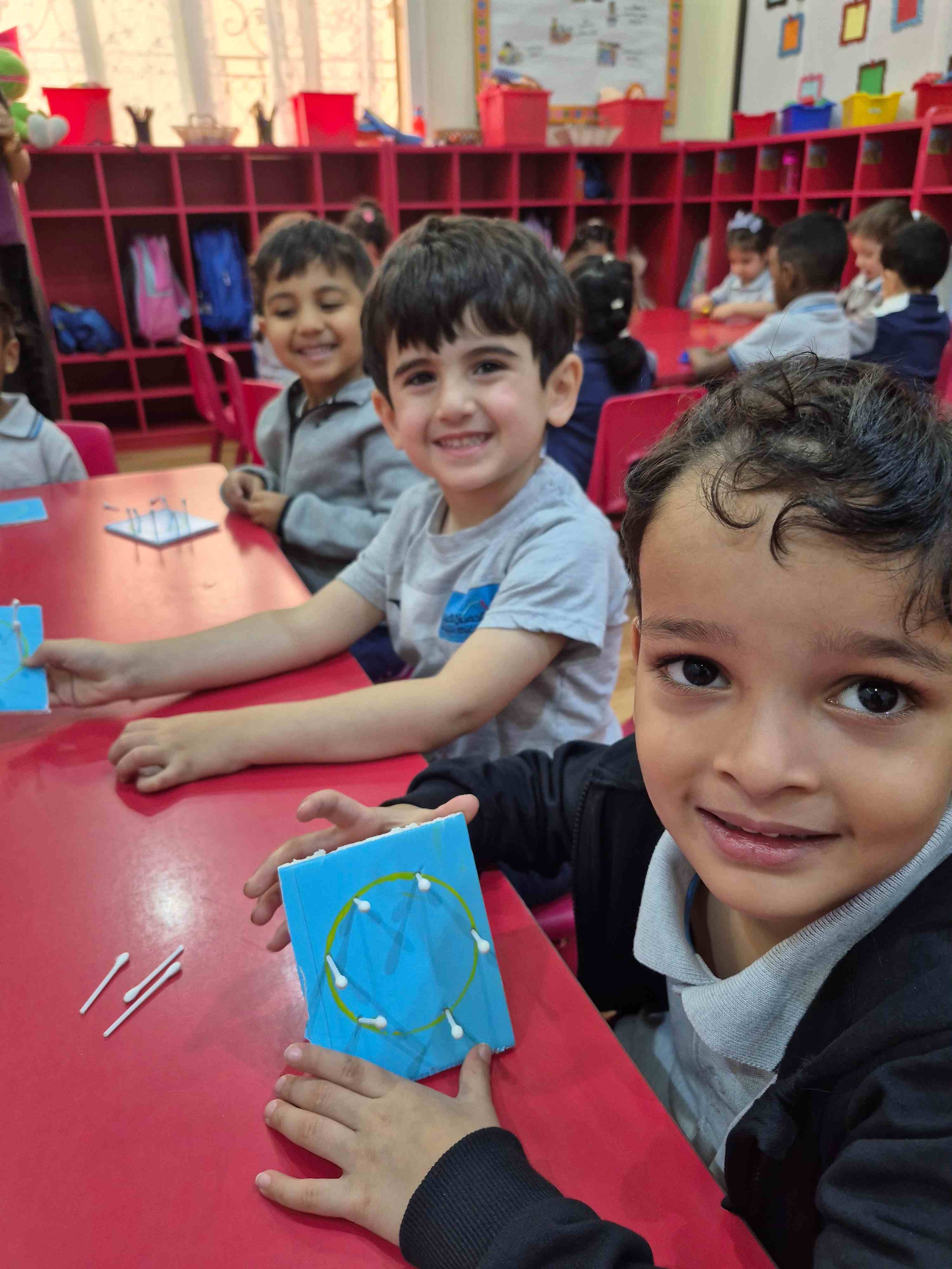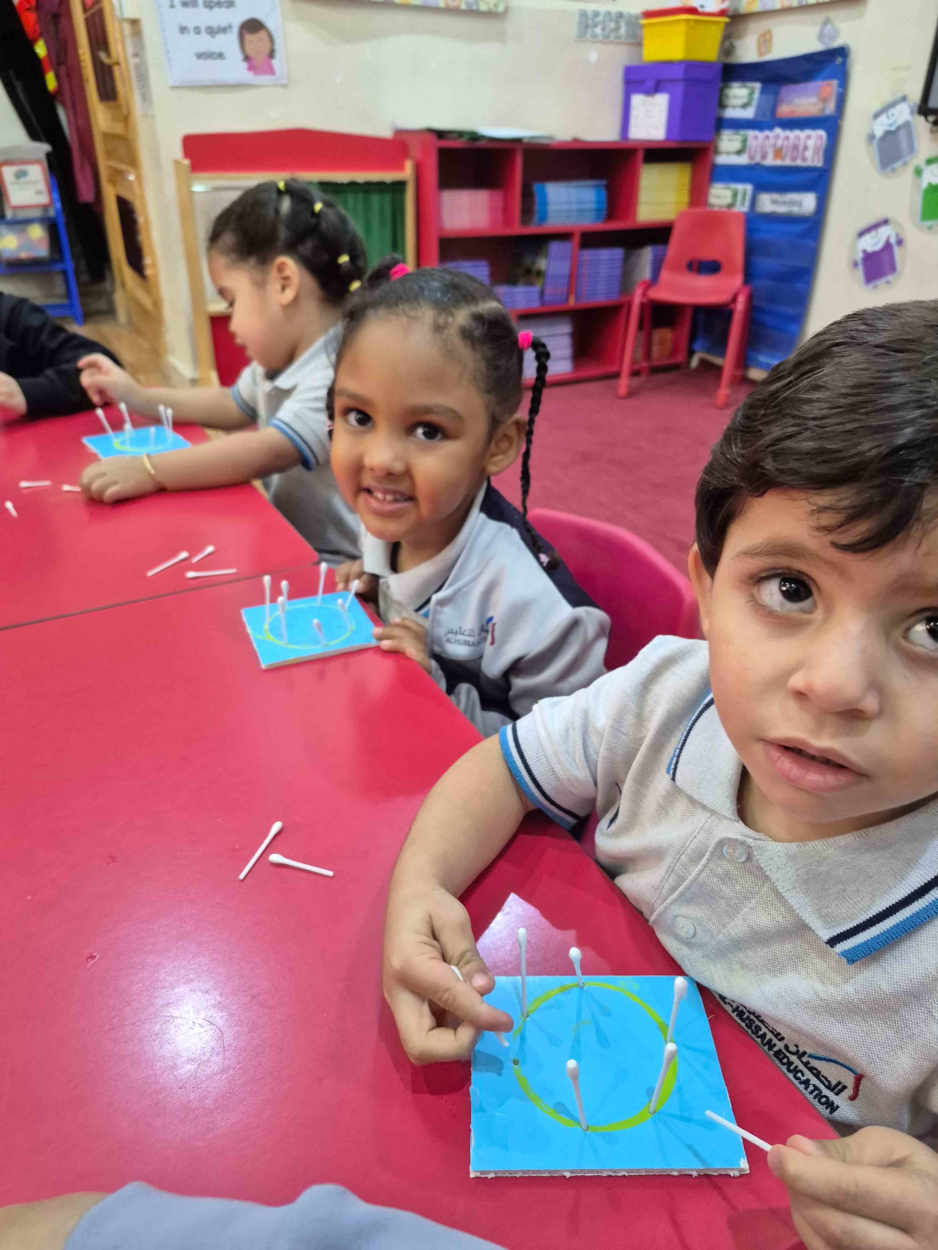 KG1 students explored the circle shape using a fun hands-on method. Each child received a piece of hard cardboard with a circle shape printed on it. Around the circle, small holes were made along the outline. The students used Q-tips cut in half and carefully inserted them into the holes, tracing the circle’s outline. This engaging fine motor activity helped children recognize the circle shape, develop hand–eye coordination, and strengthen their finger muscles while having fun.