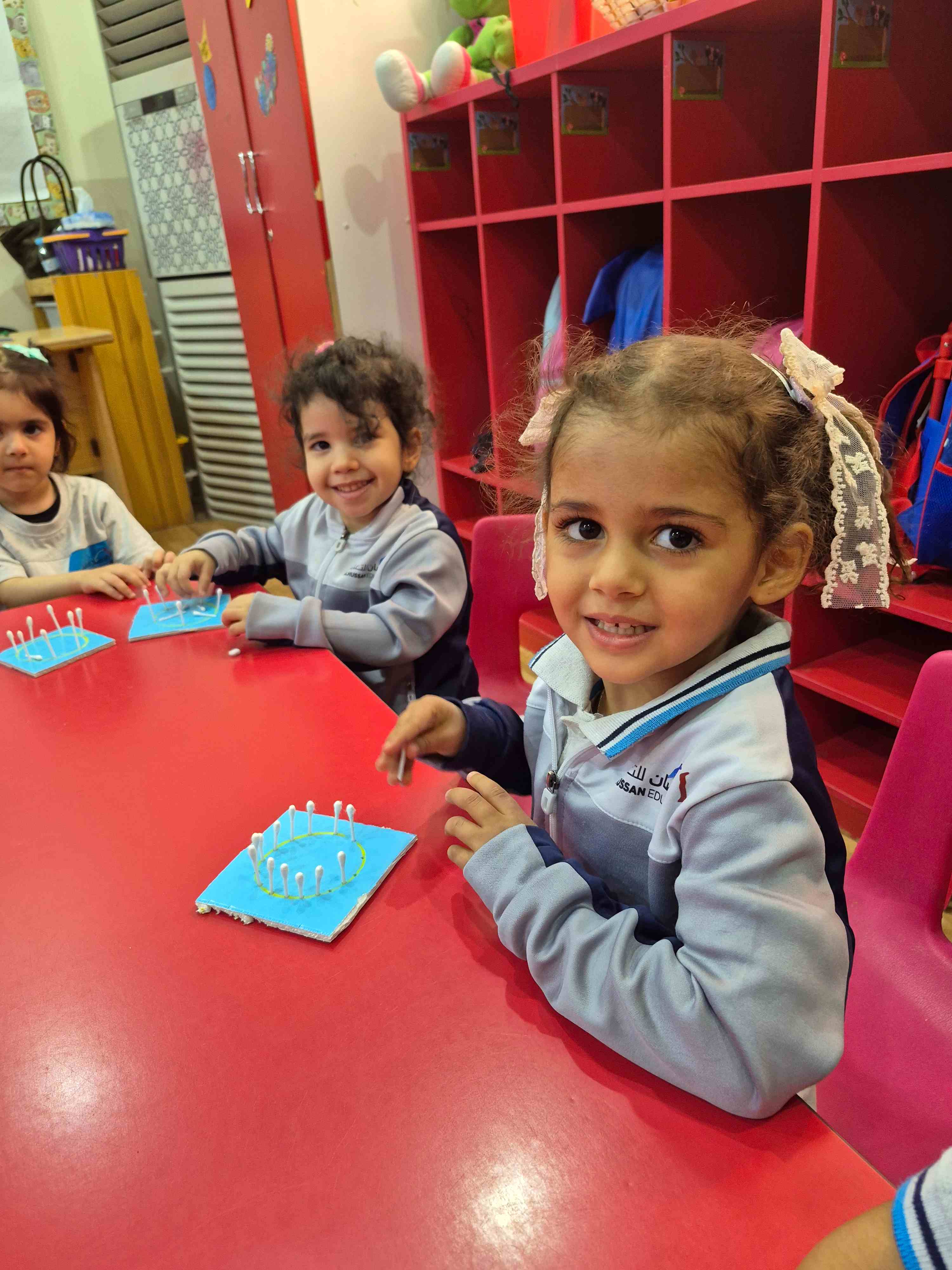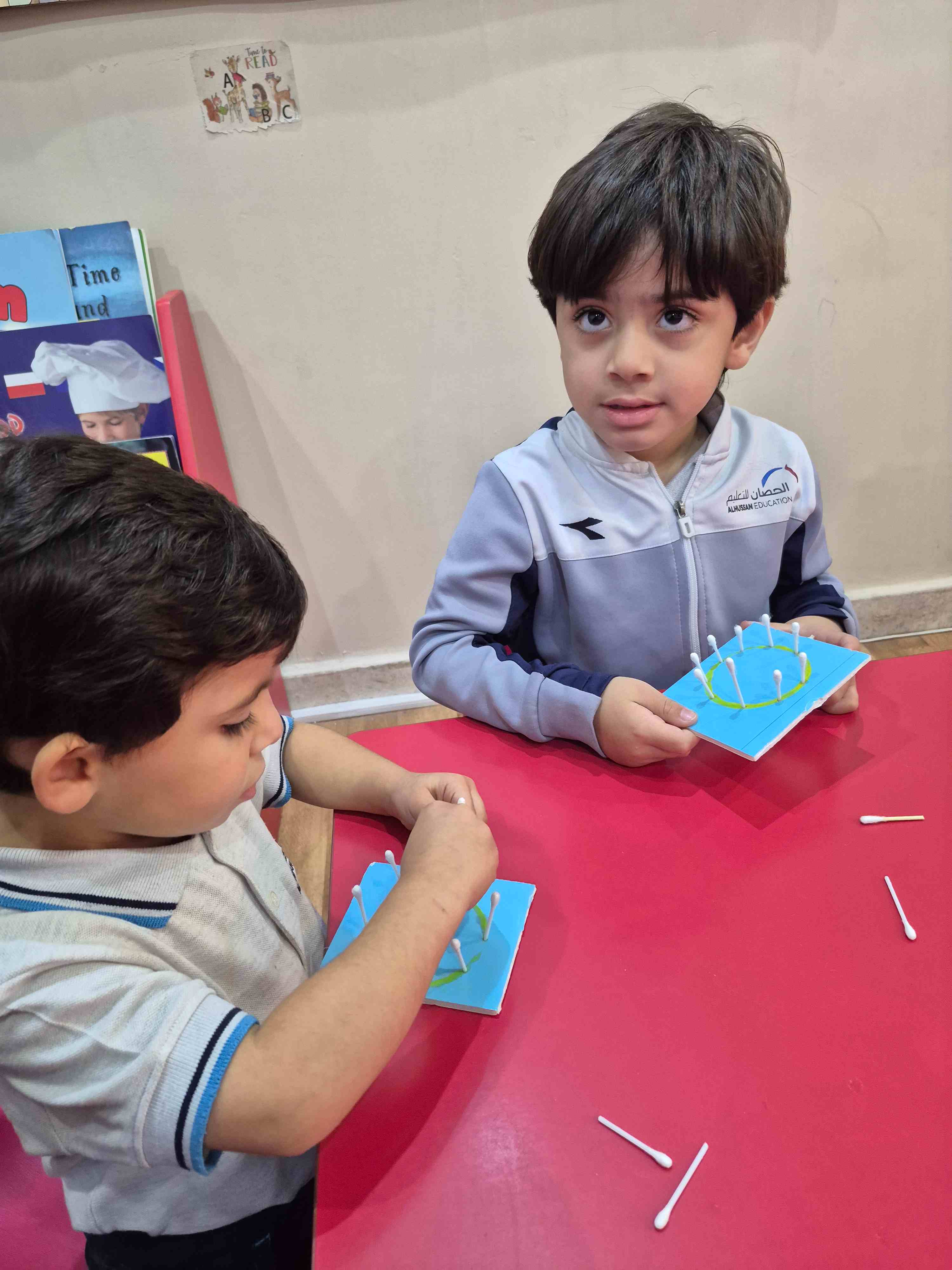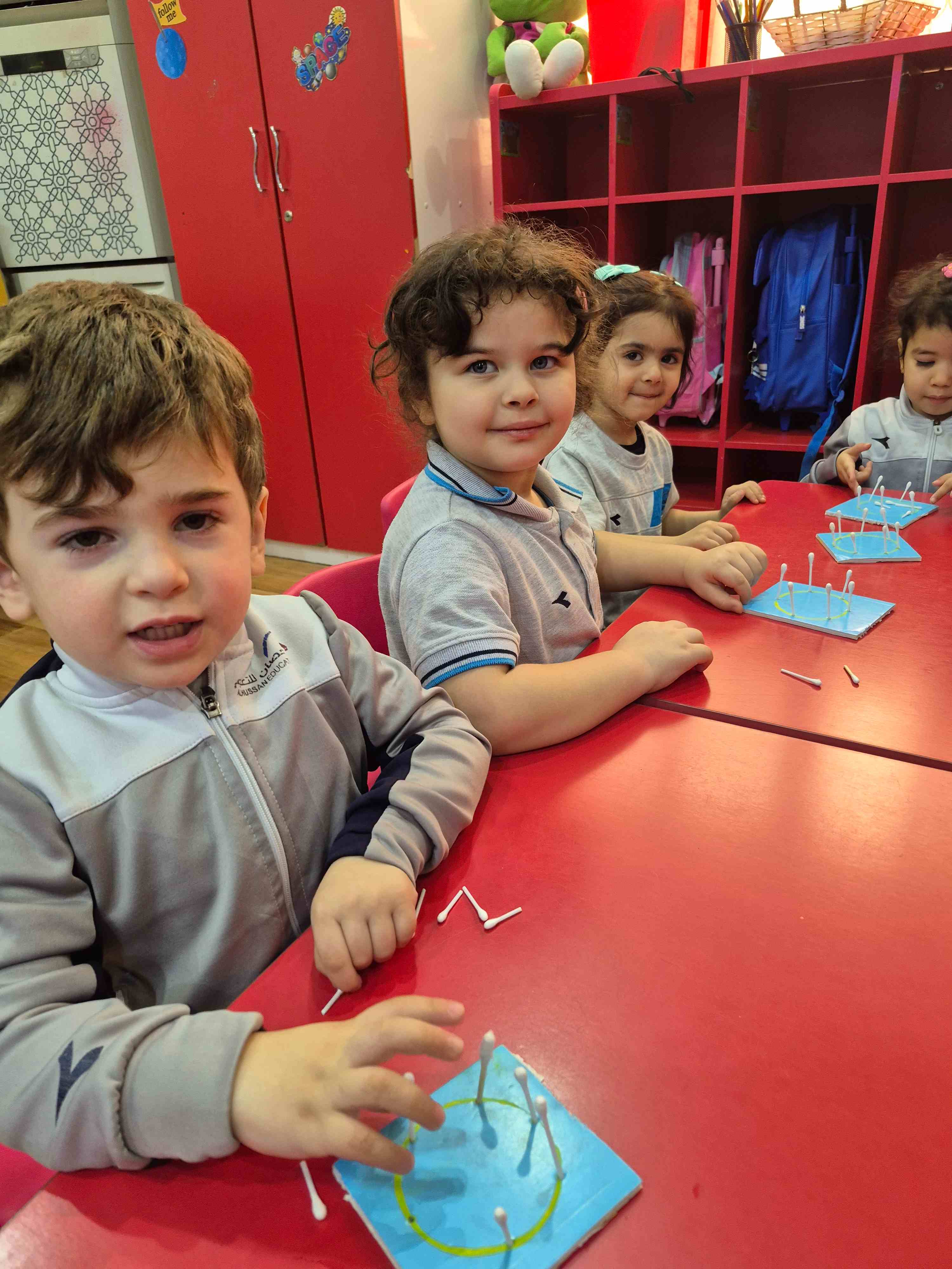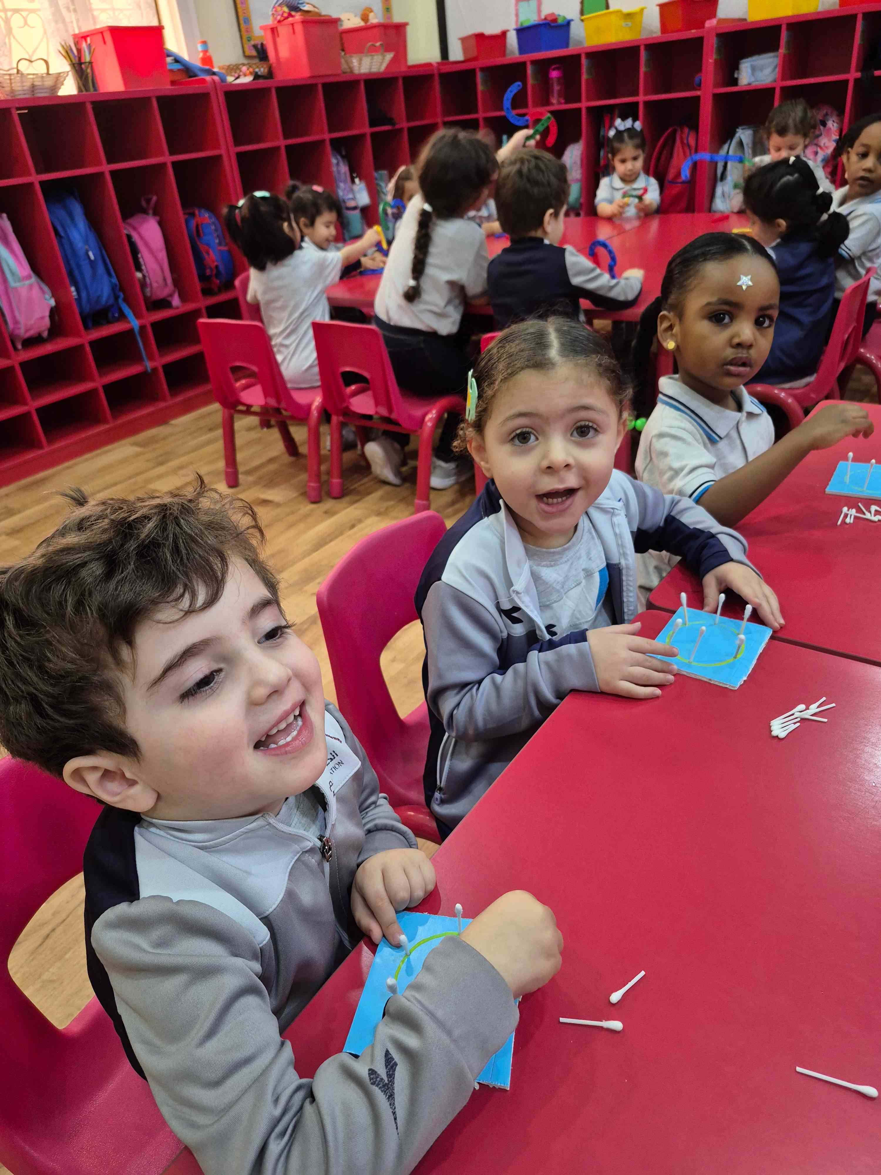 KG1 students explored the circle shape using a fun hands-on method. Each child received a piece of hard cardboard with a circle shape printed on it. Around the circle, small holes were made along the outline. The students used Q-tips cut in half and carefully inserted them into the holes, tracing the circle’s outline. This engaging fine motor activity helped children recognize the circle shape, develop hand–eye coordination, and strengthen their finger muscles while having fun.
