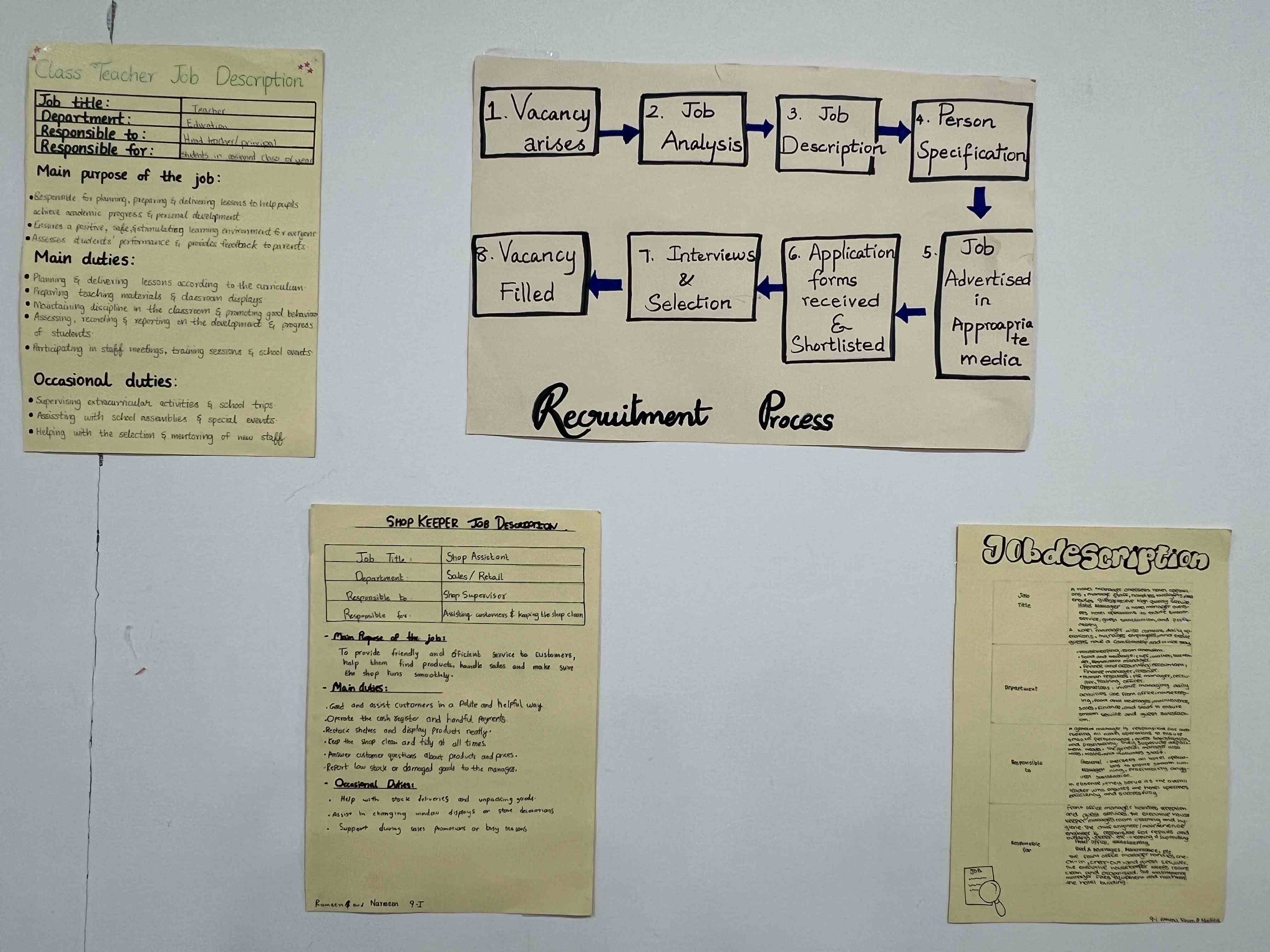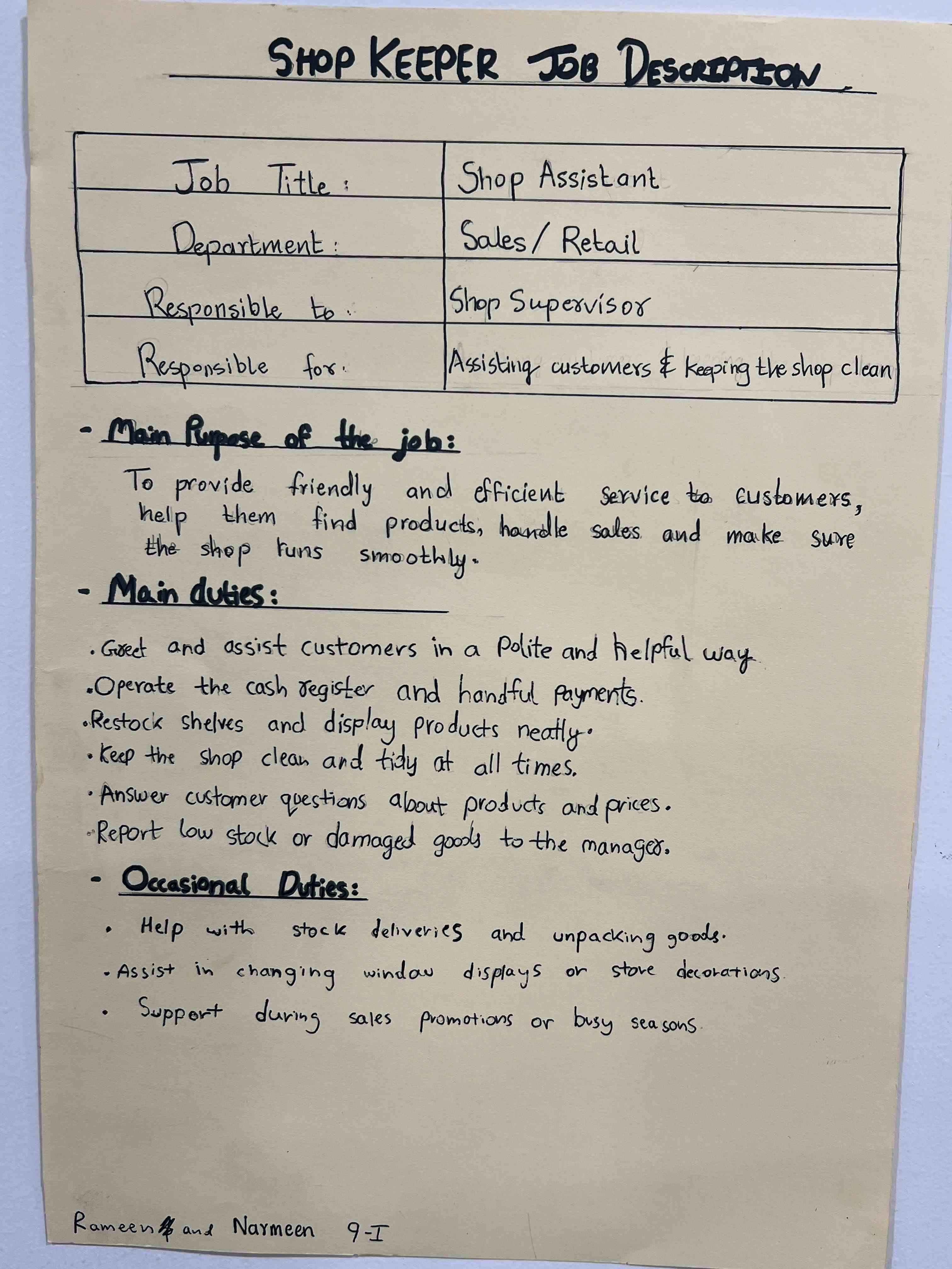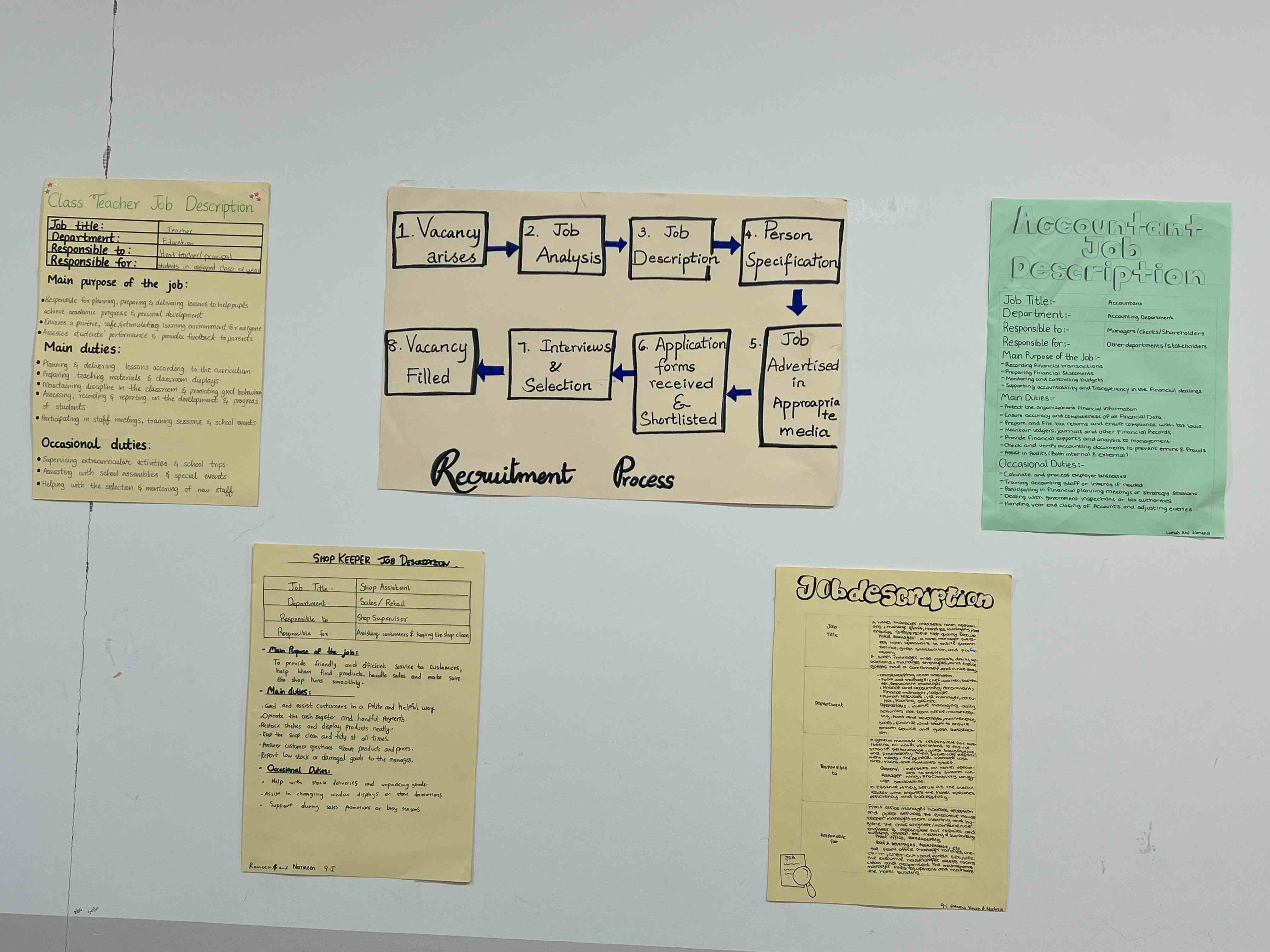Grade 9 girls took part in an engaging Business Studies activity where they created job descriptions for roles like shopkeeper, class teacher, accountant, and manager. They worked in groups to list responsibilities, skills, and qualifications, gaining a clear understanding of how each role supports smooth business operations.