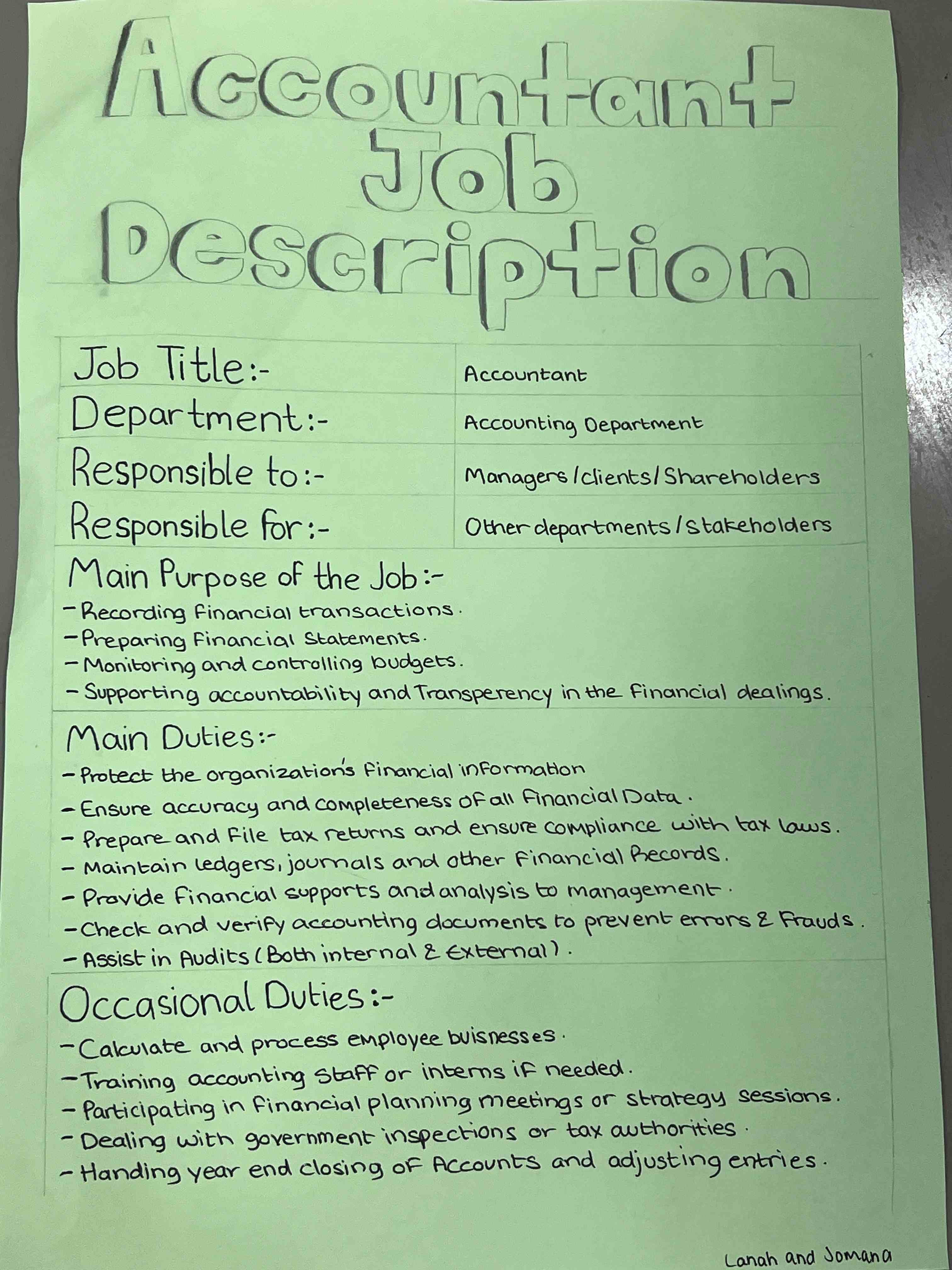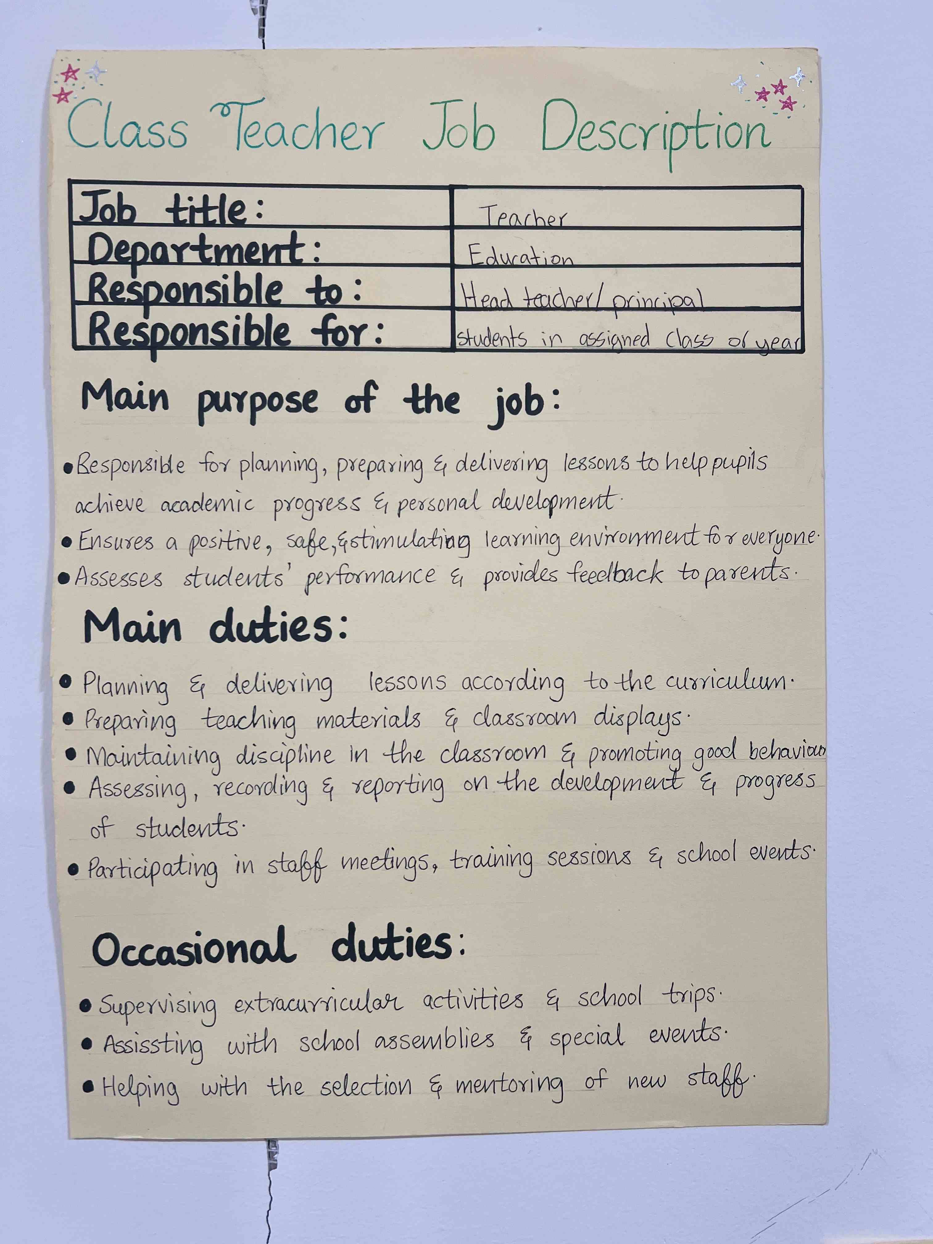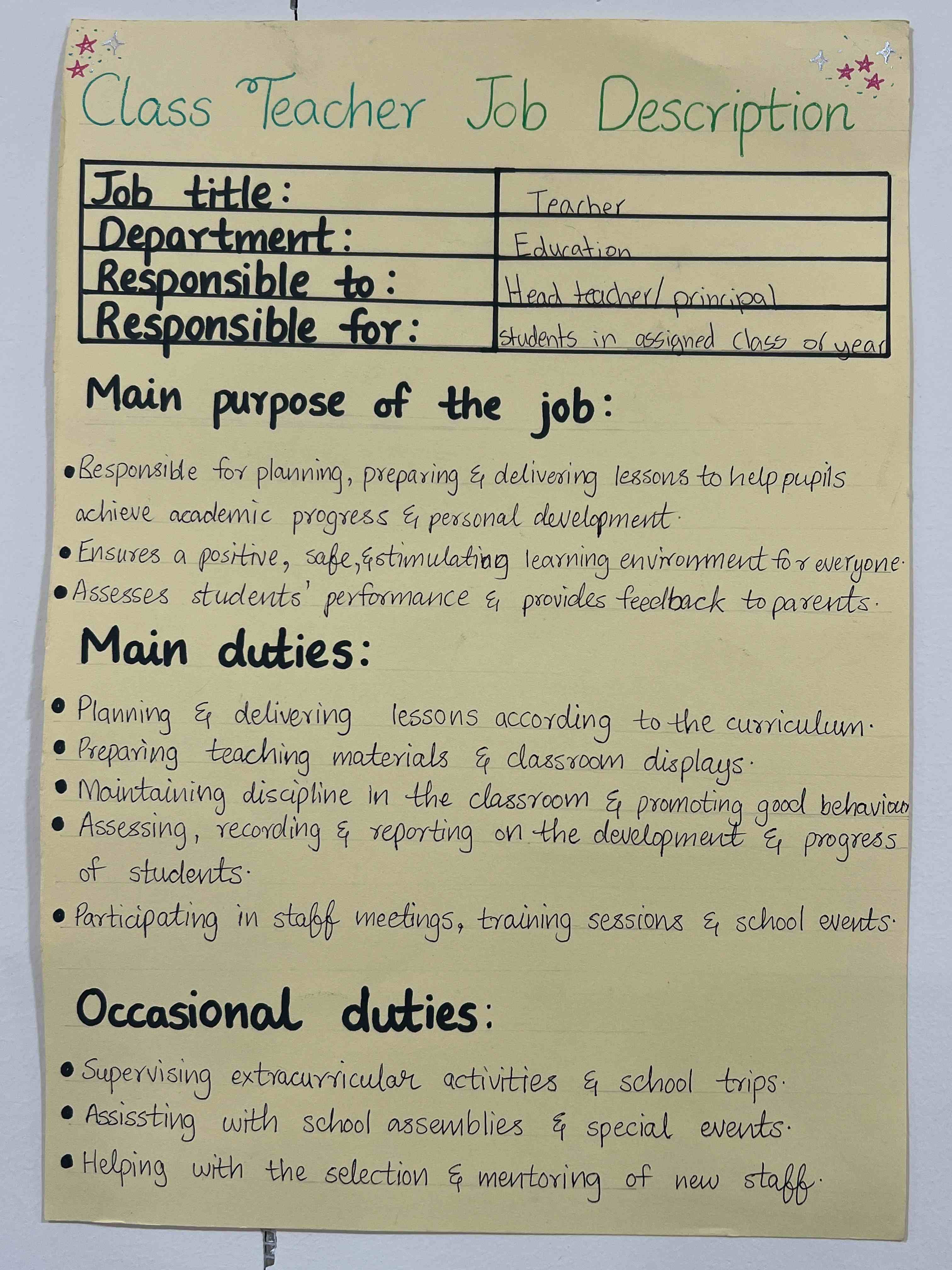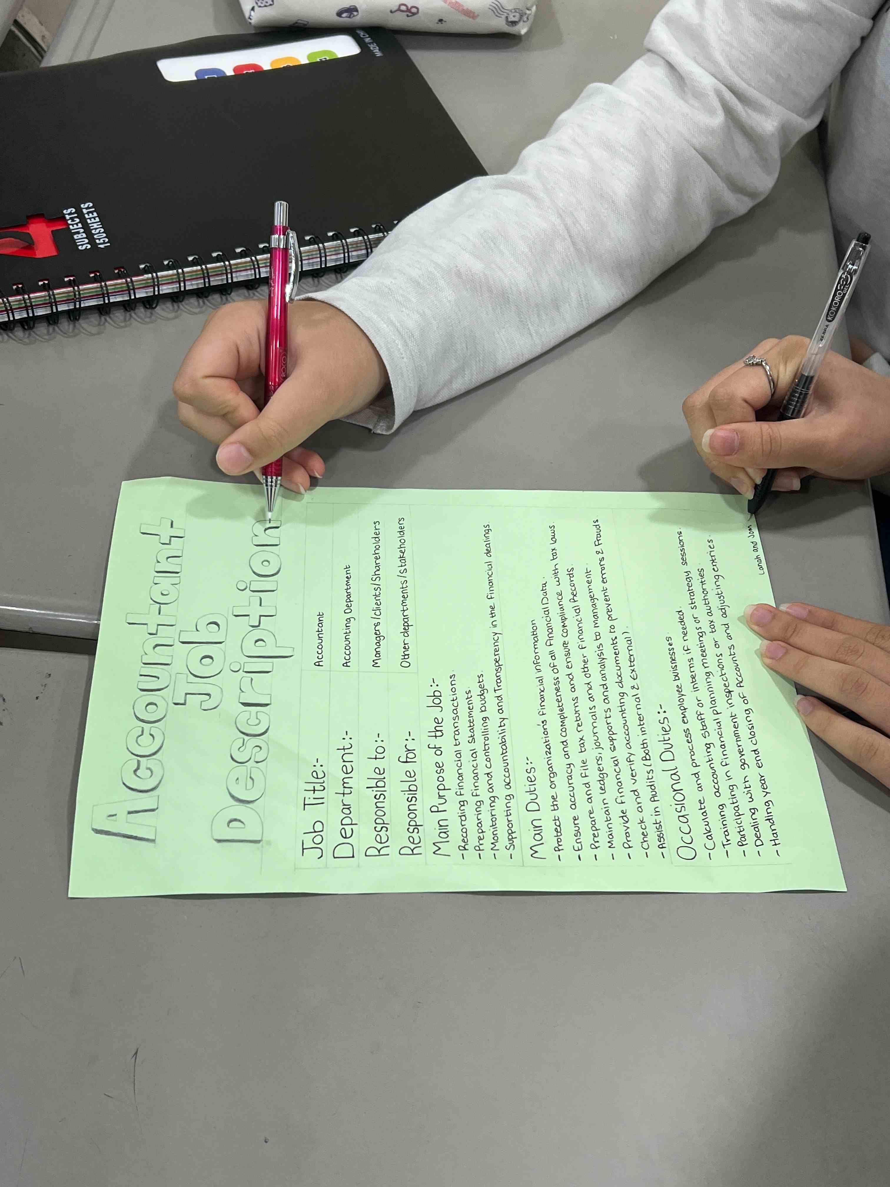 Grade 9 girls took part in an engaging Business Studies activity where they created job descriptions for roles like shopkeeper, class teacher, accountant, and manager. They worked in groups to list responsibilities, skills, and qualifications, gaining a clear understanding of how each role supports smooth business operations.