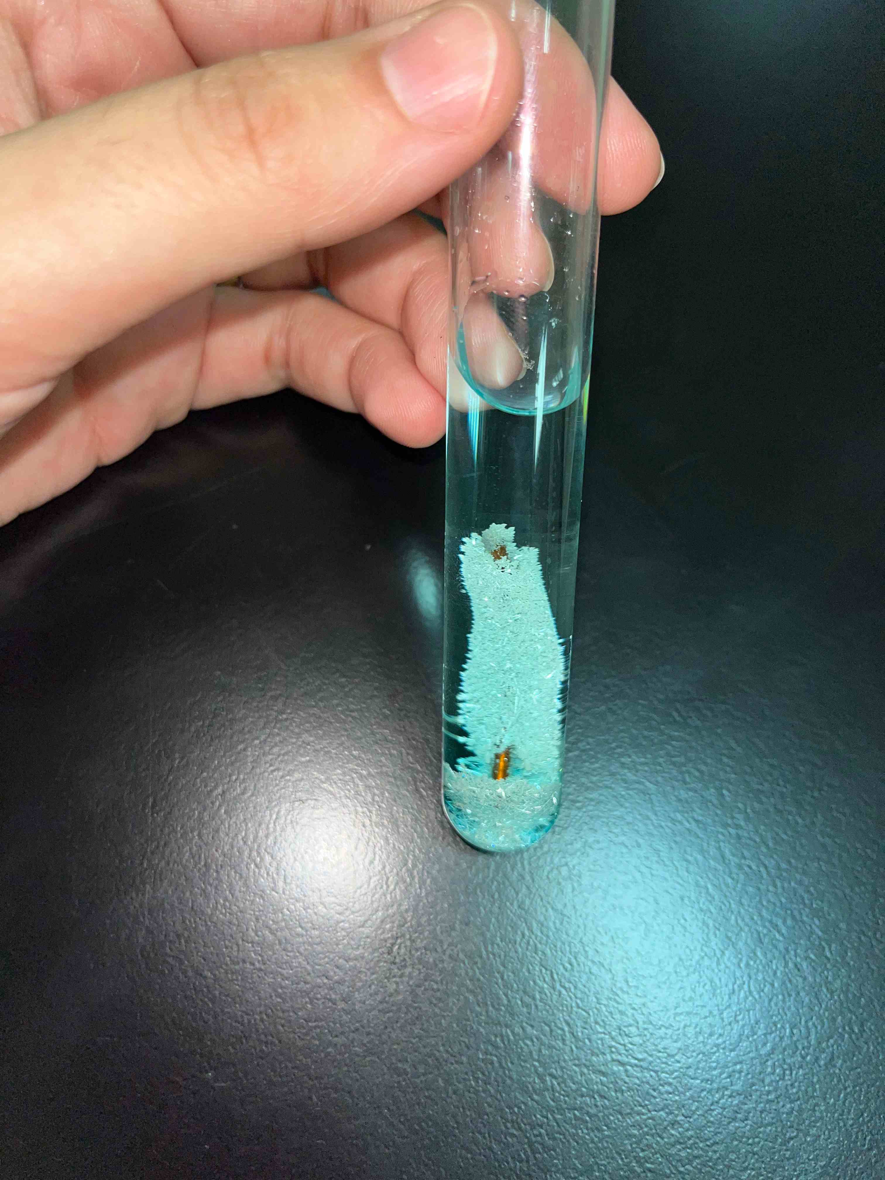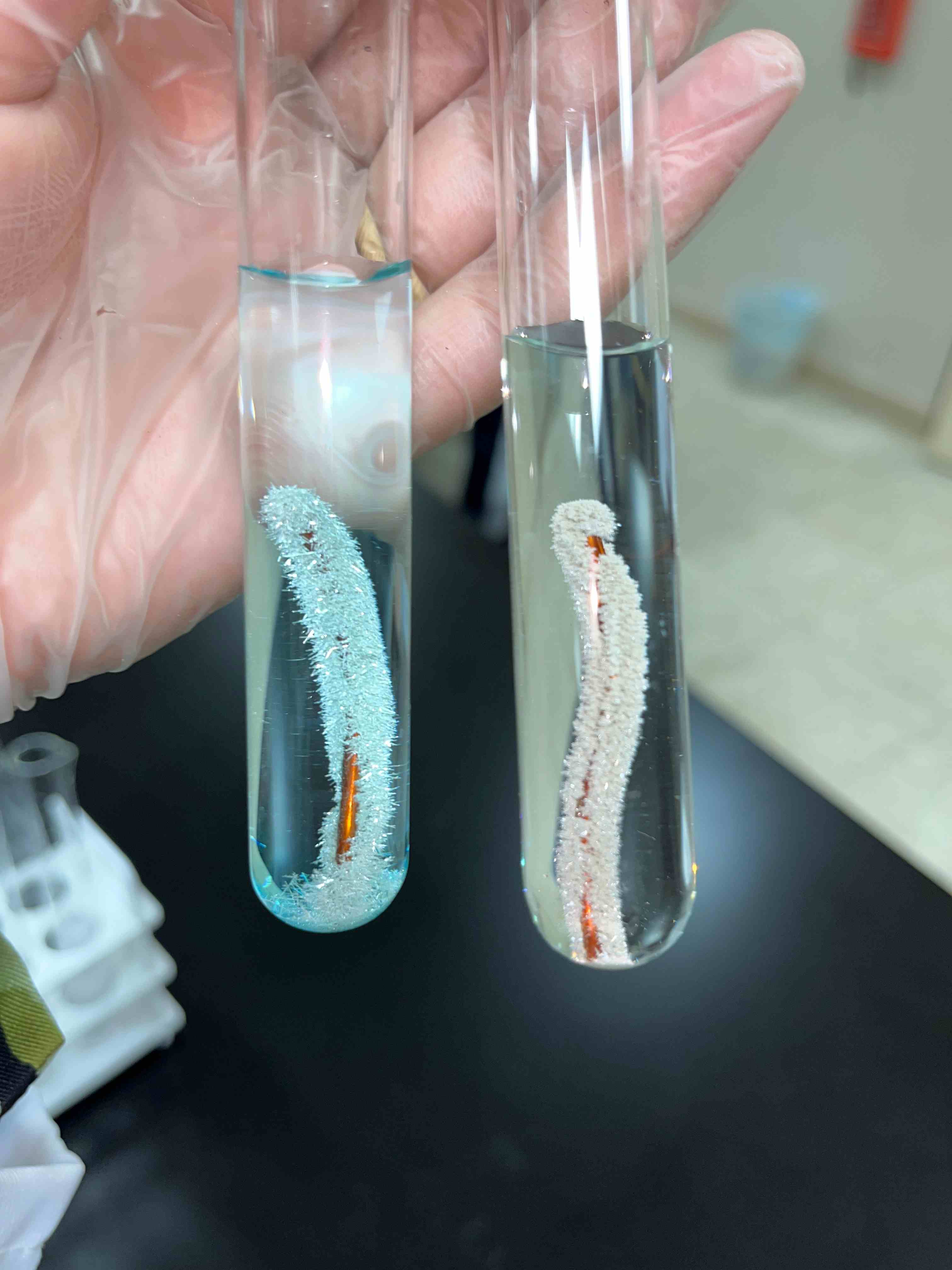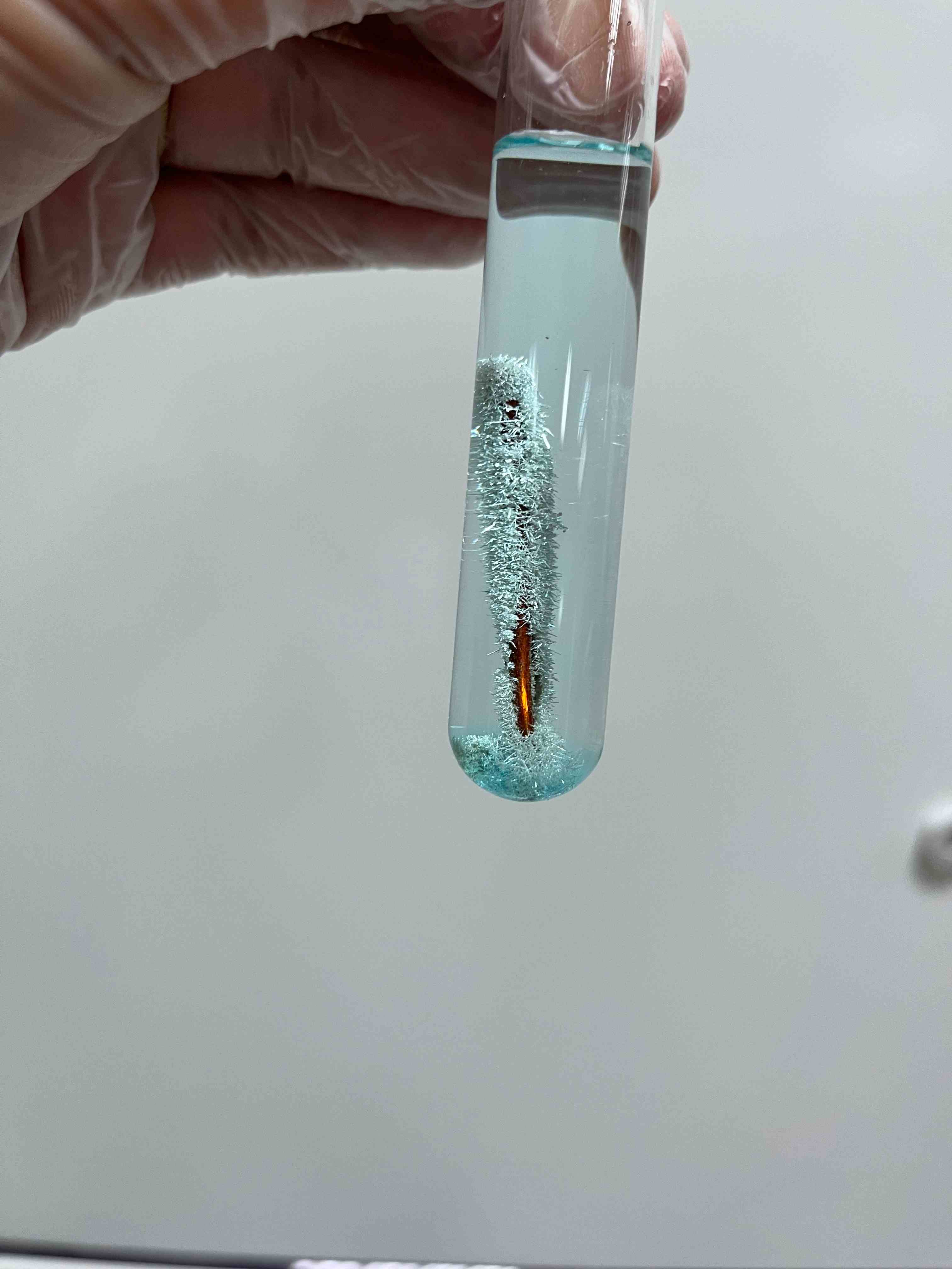 Our Grade 10 American Chemistry students witnessed a fascinating redox reaction between copper and silver nitrate, resulting in a vivid blue copper nitrate solution while shiny silver crystals formed beautifully on the copper wire — creating a “silver tree”! 🌳💫