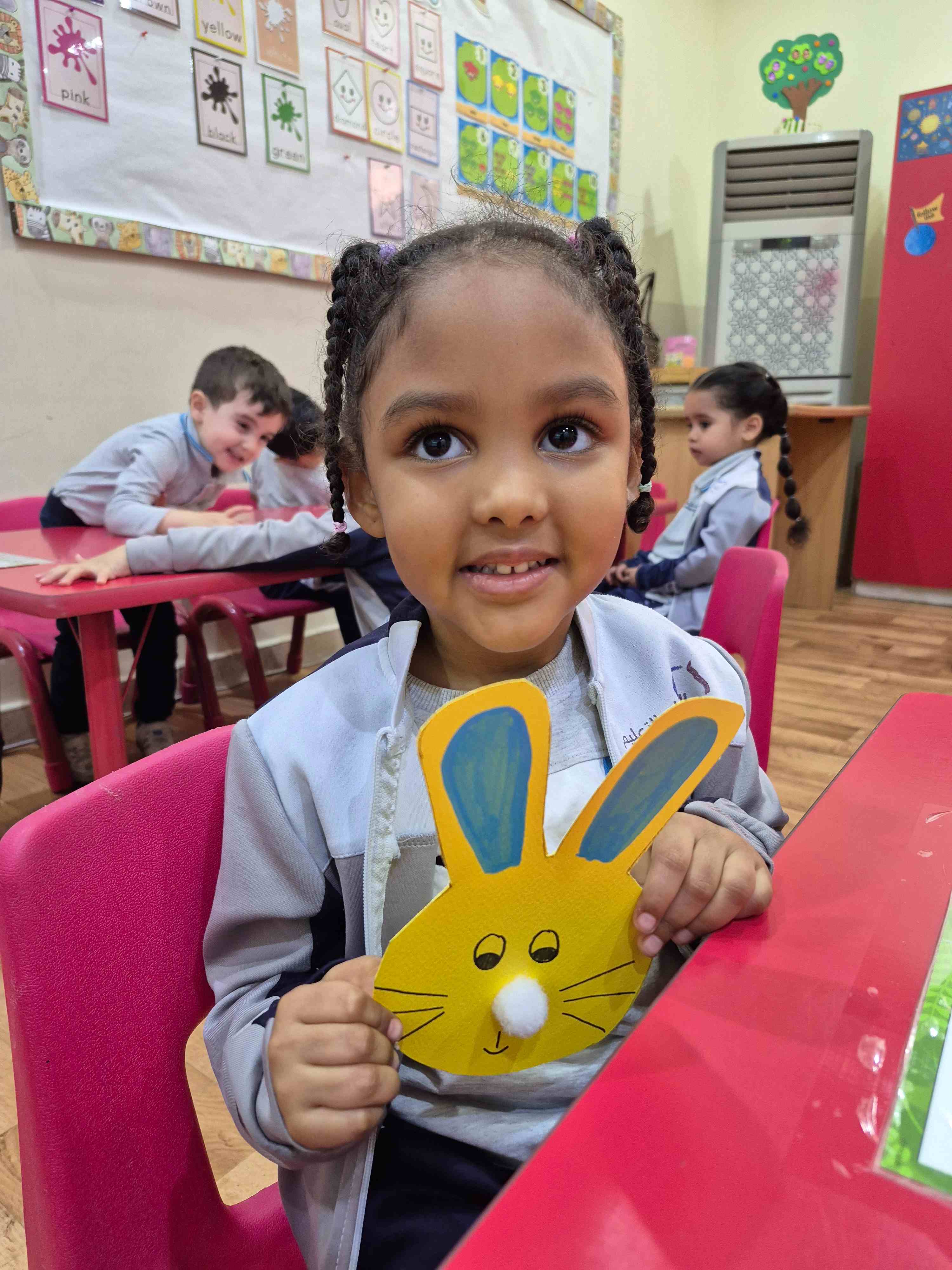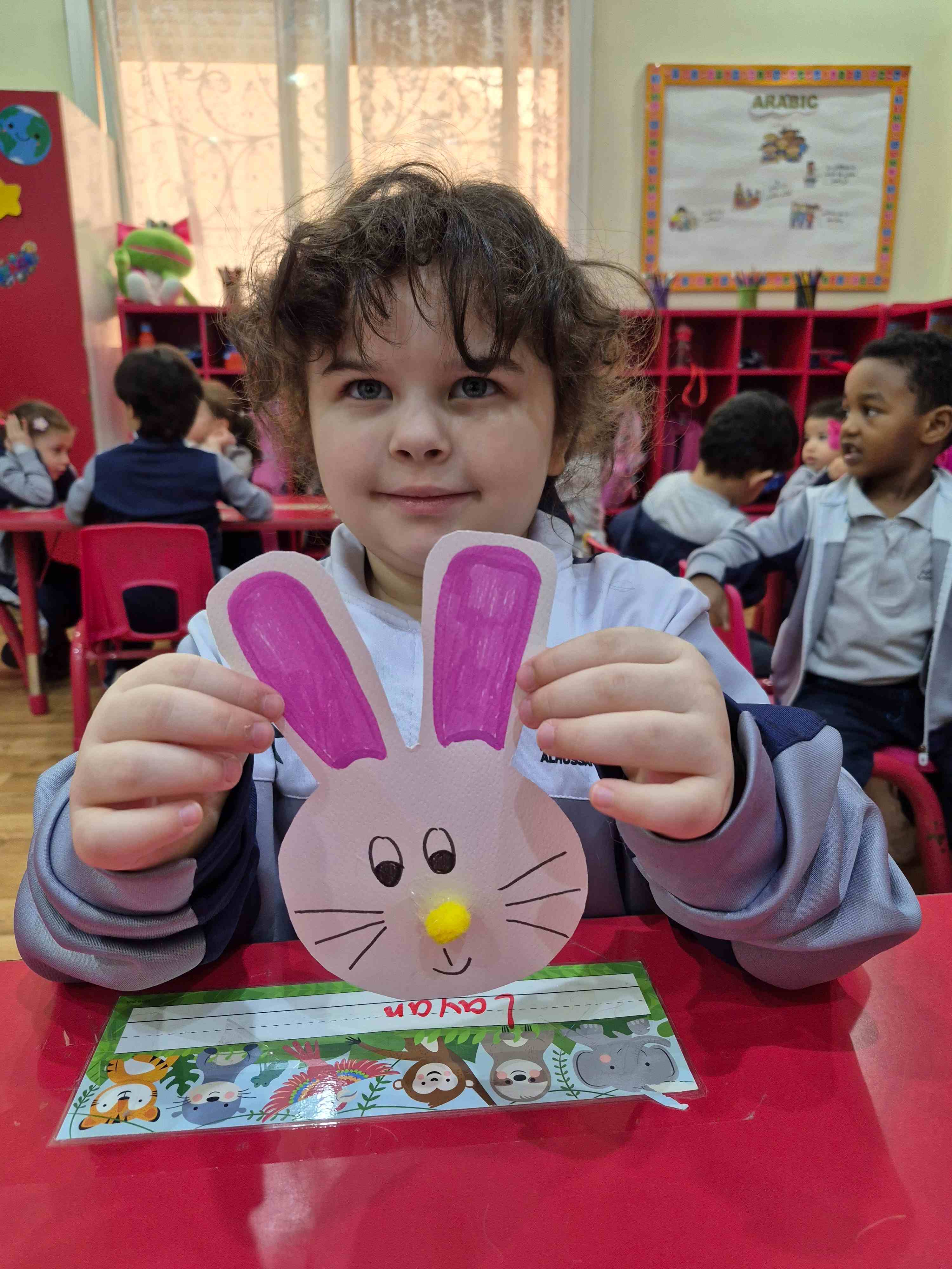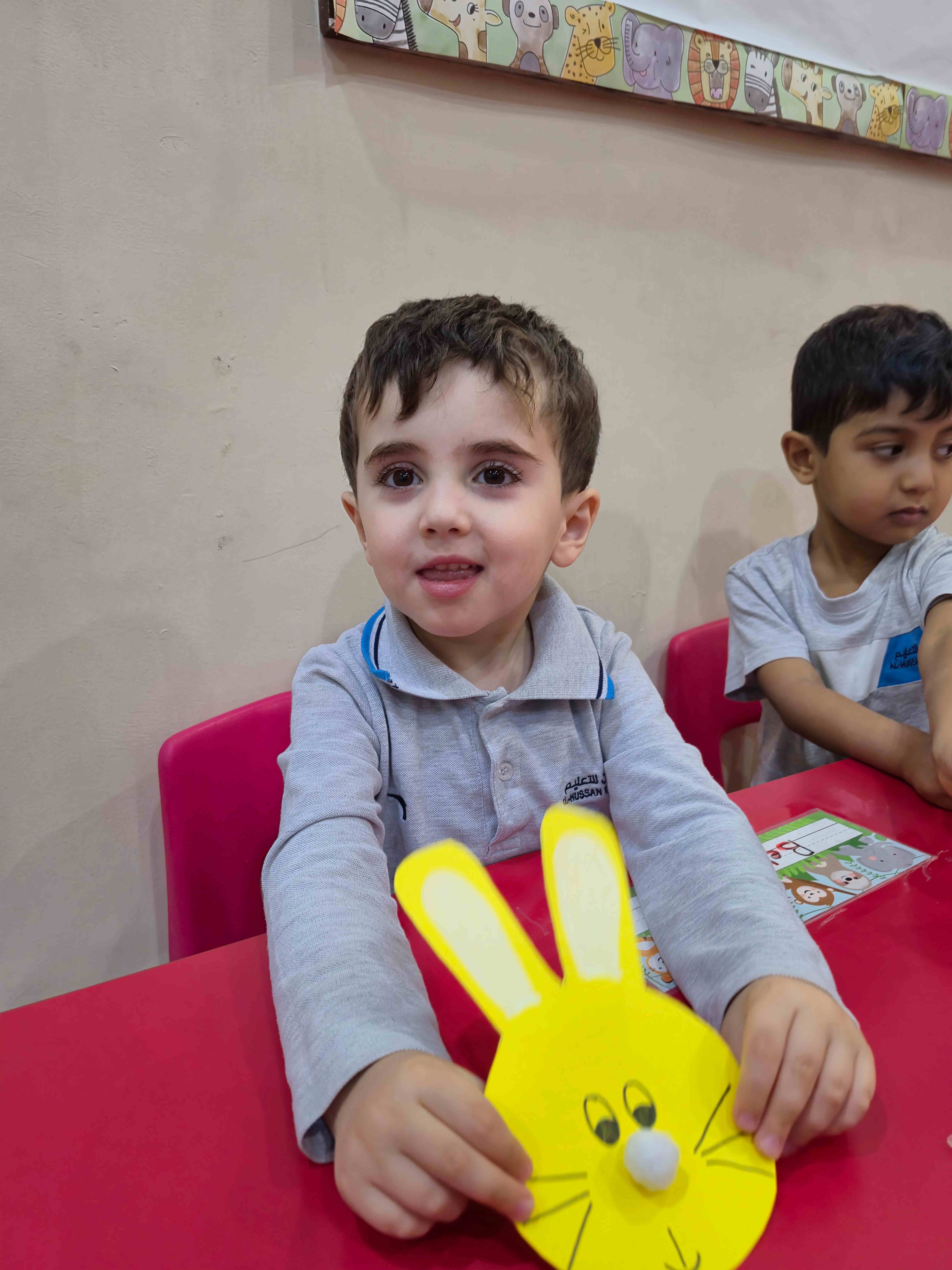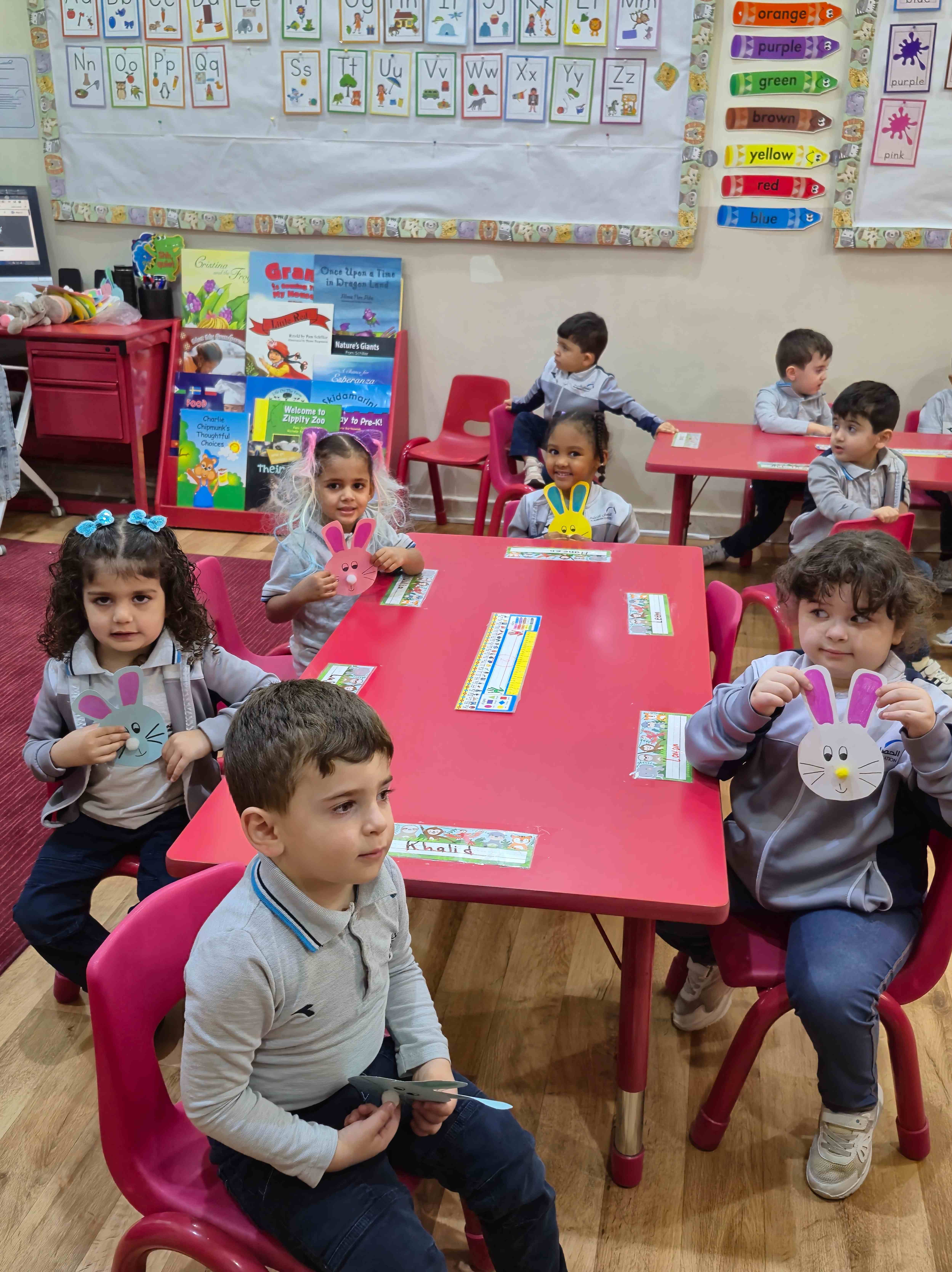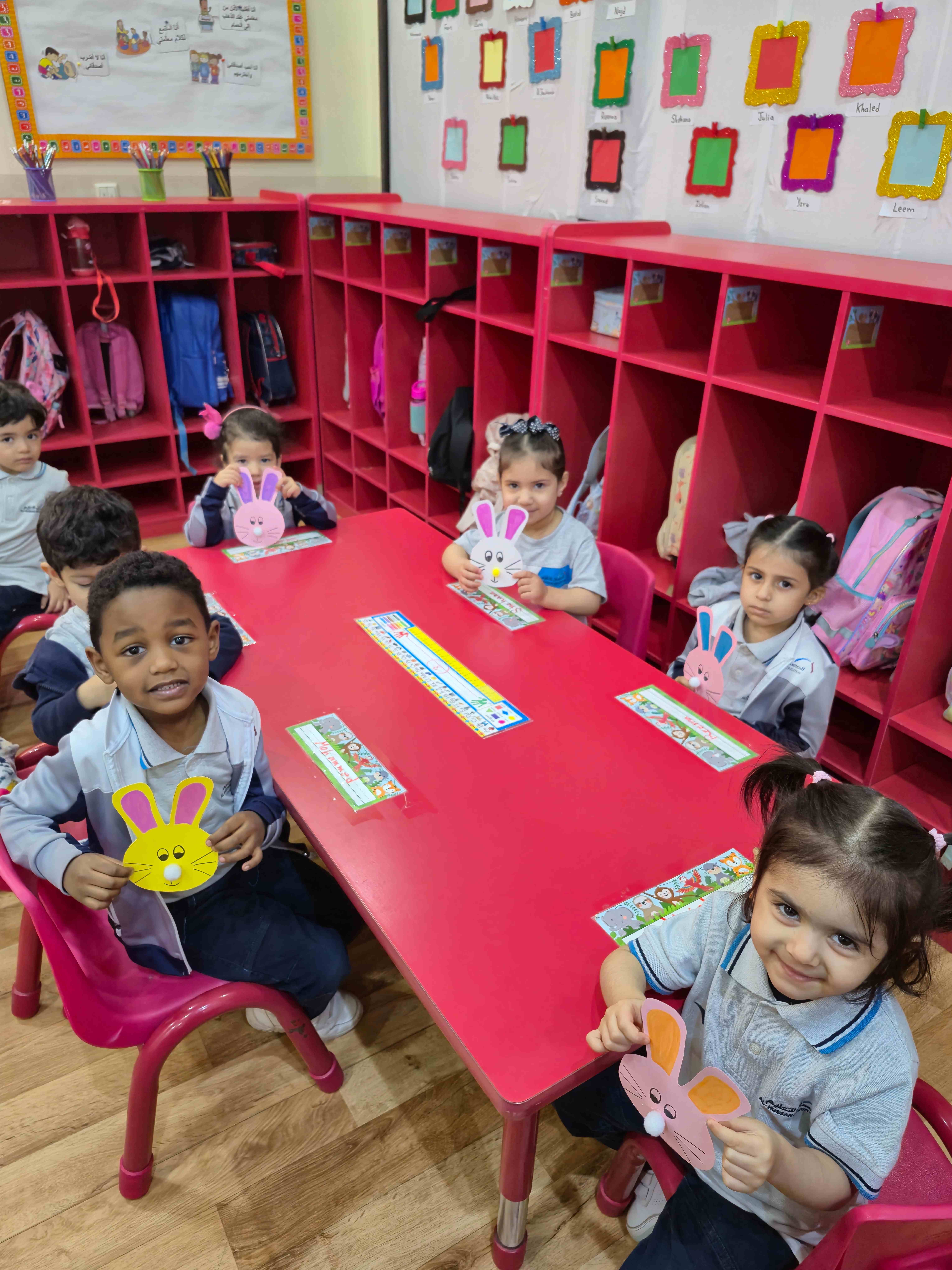 Our KG1s students made a cute rabbit face craft for the letter R. They added the rabbit’s ears, nose, eyes, and whiskers to complete the face. The children enjoyed placing each part and learning that R is for Rabbit, which helped them connect the letter to its sound through a fun hands-on activity.