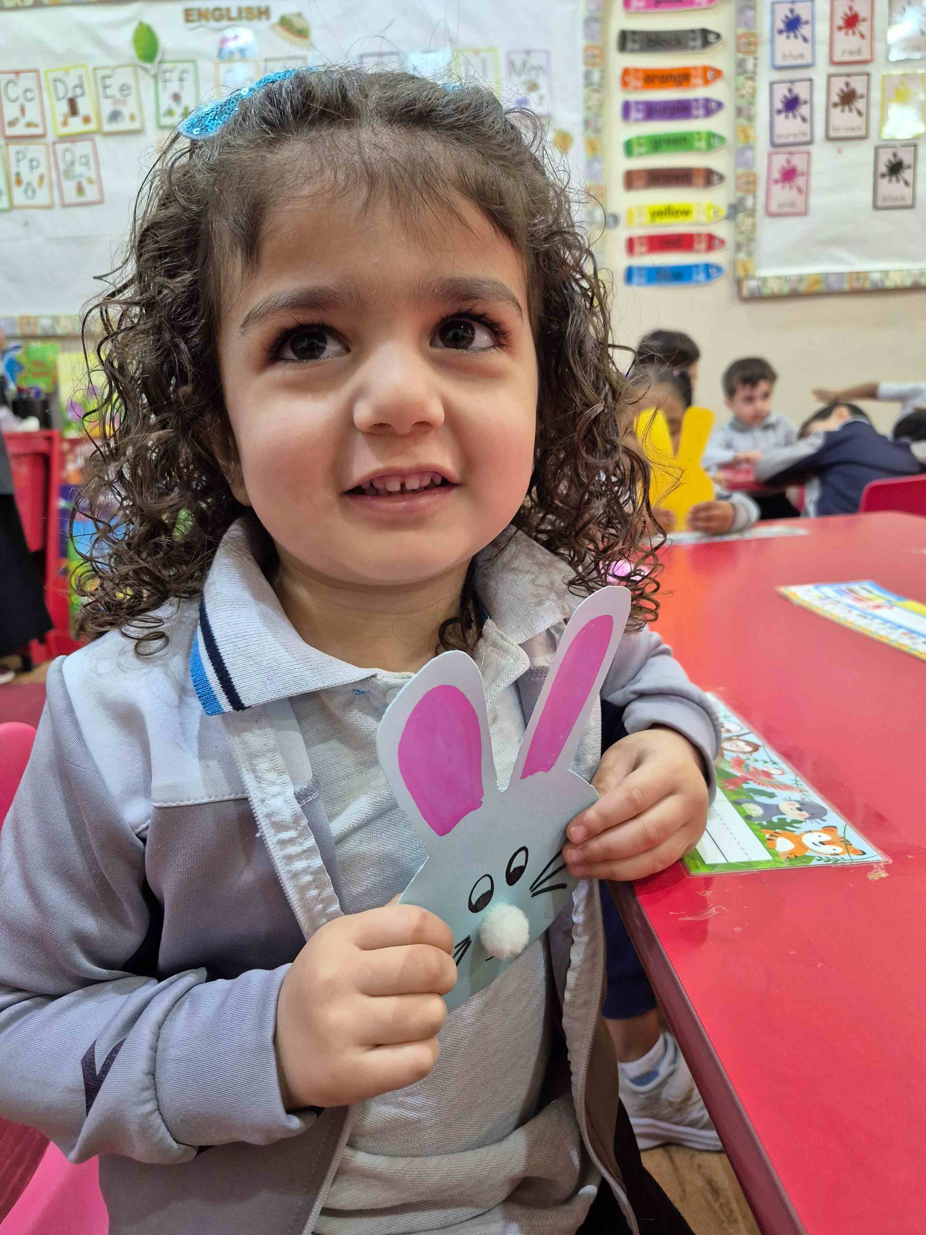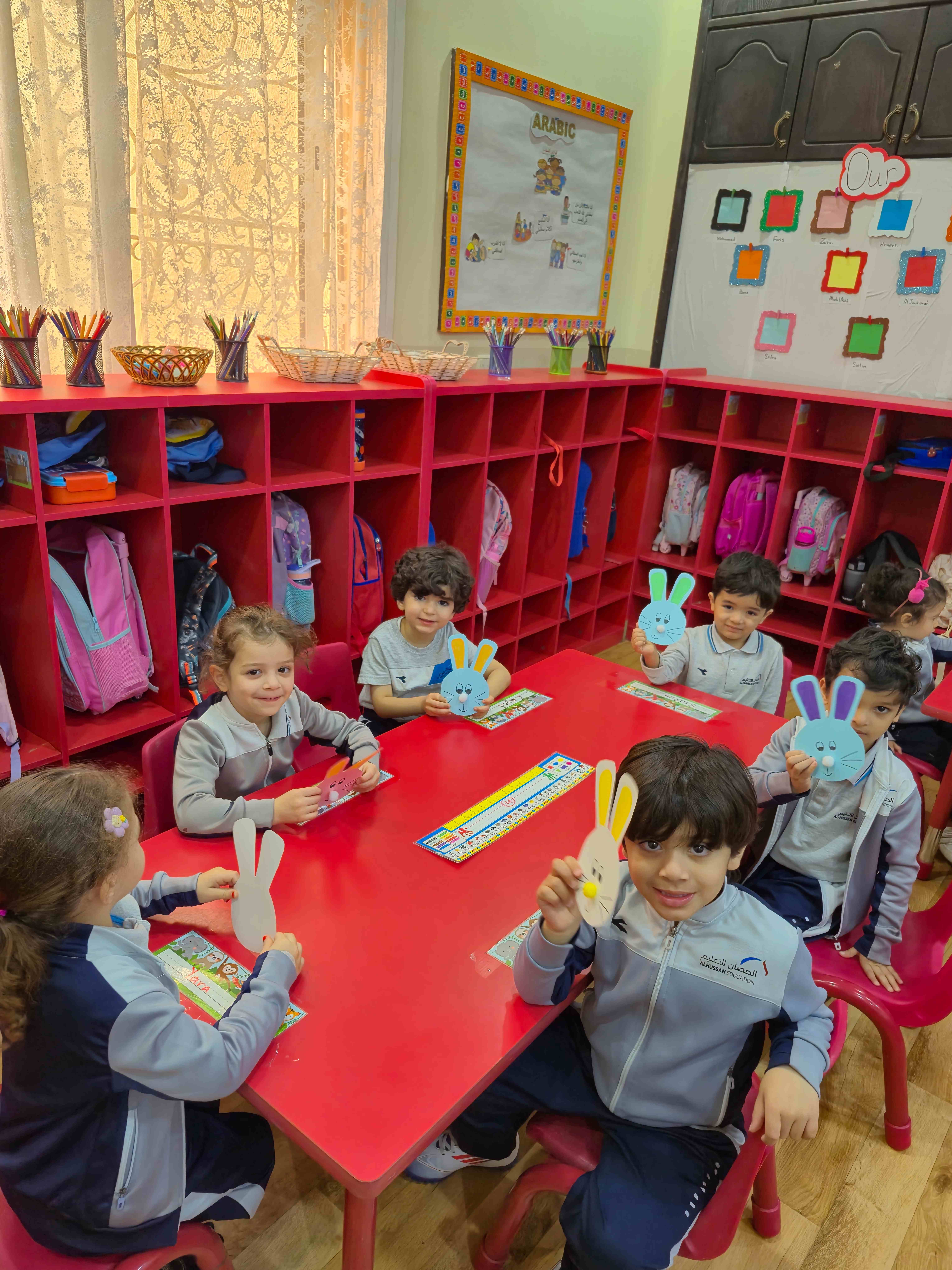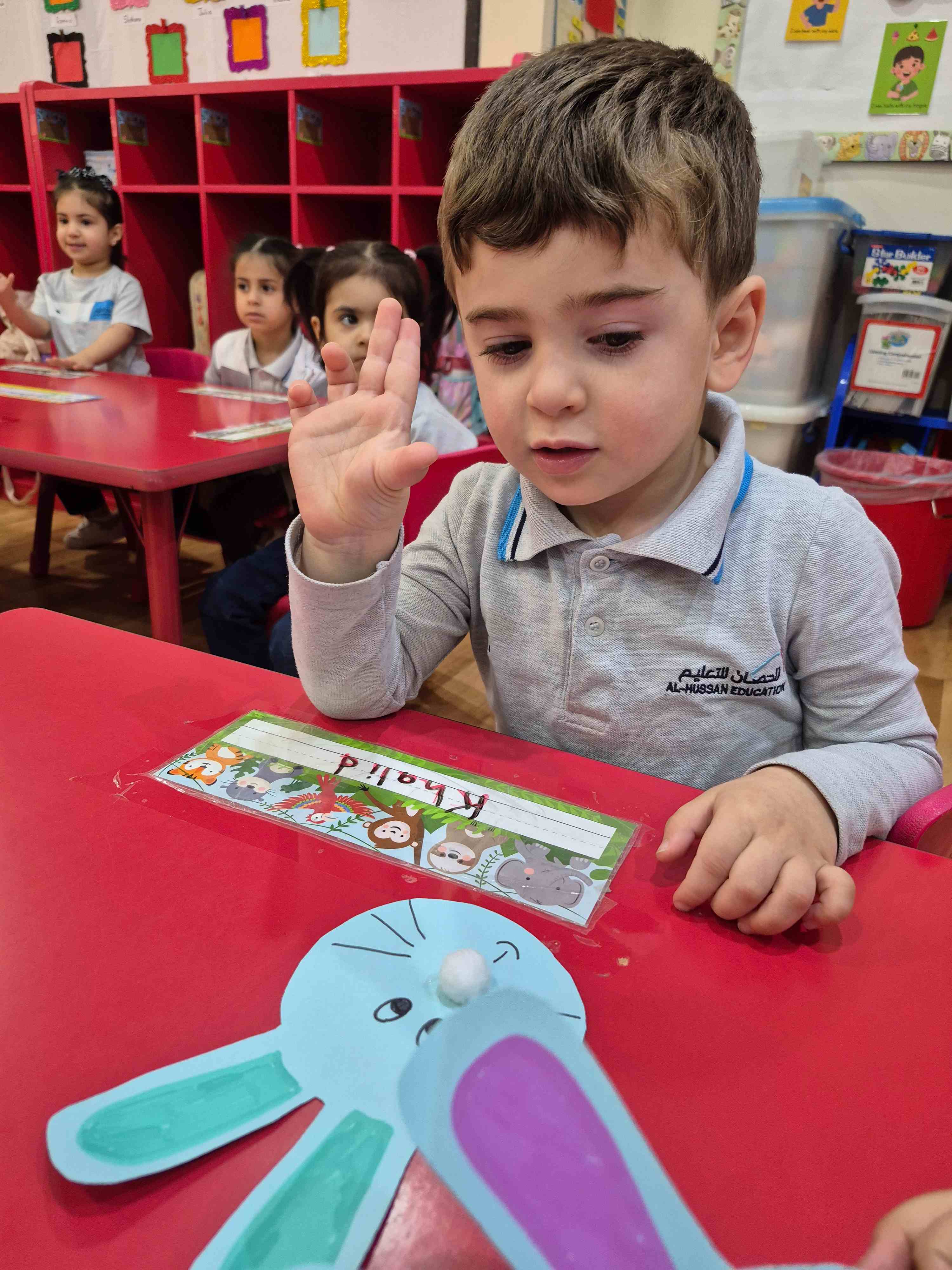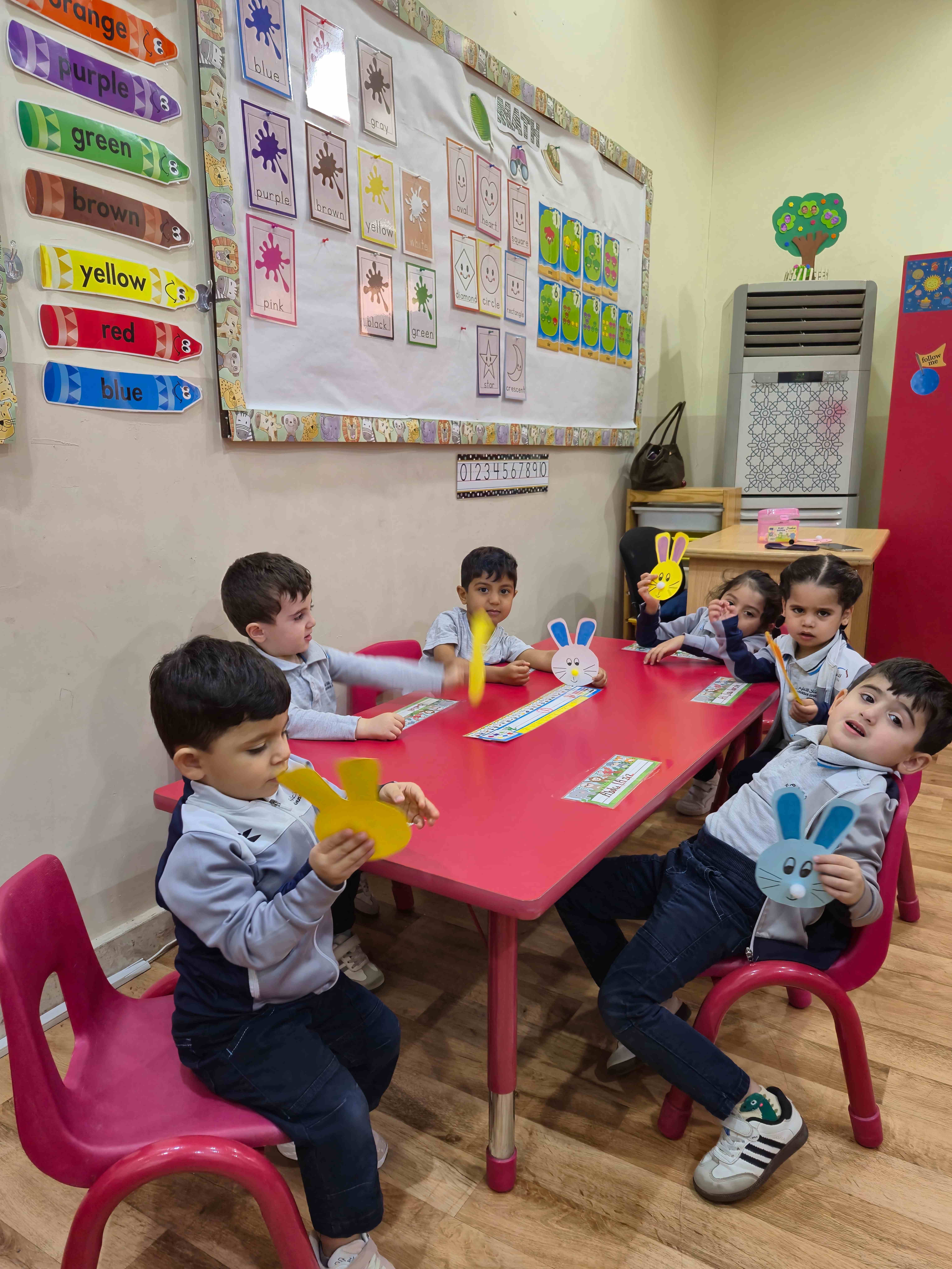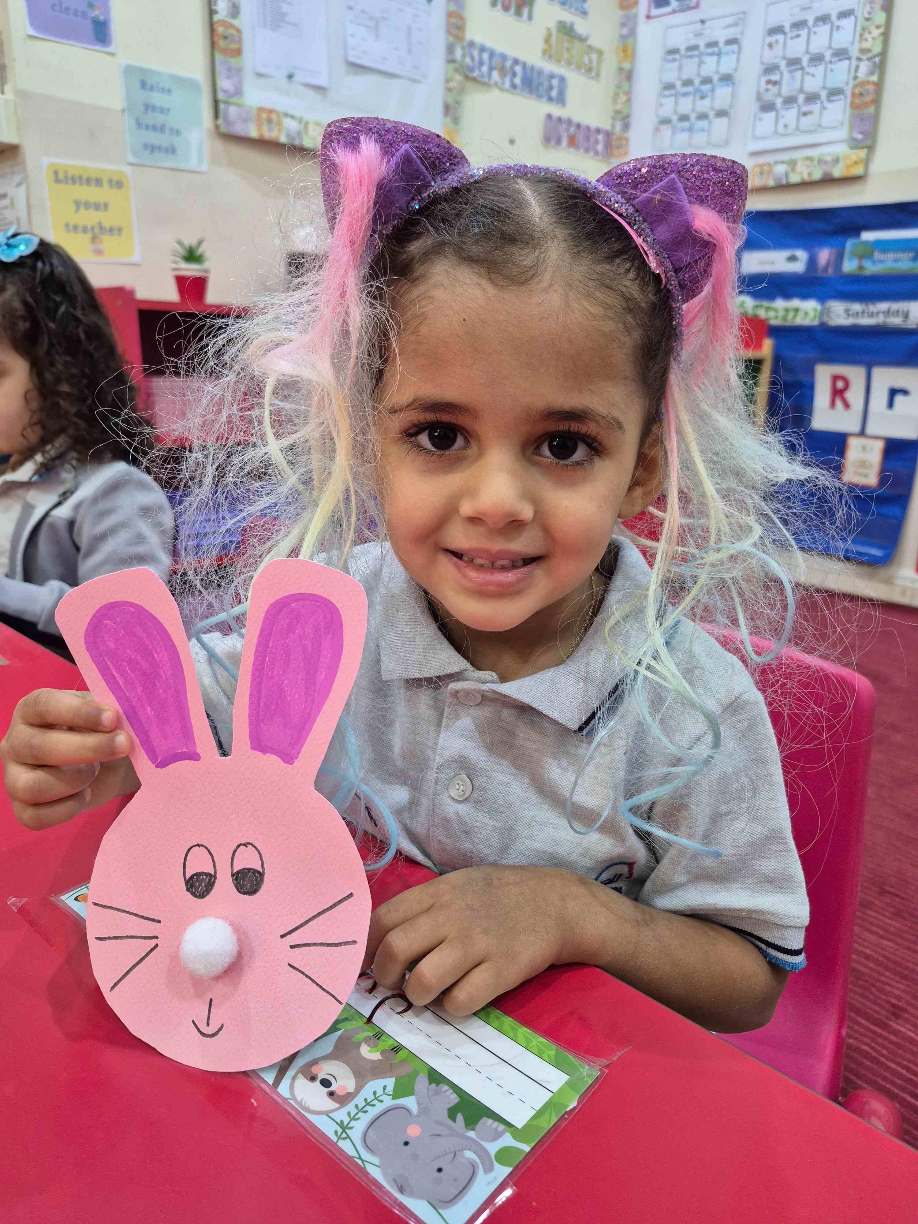 Our KG1s students made a cute rabbit face craft for the letter R. They added the rabbit’s ears, nose, eyes, and whiskers to complete the face. The children enjoyed placing each part and learning that R is for Rabbit, which helped them connect the letter to its sound through a fun hands-on activity.