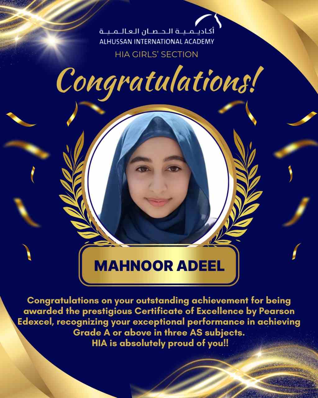 The Girls Section is delighted to celebrate a remarkable accomplishment! Congratulations to our outstanding student, Mahnoor Adeel!