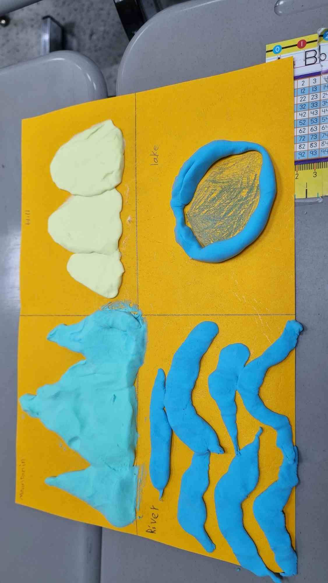 Grade 2 O students created simple 3D models using clay, sand, and colored paper. They built mountains, valleys, rivers, lakes, and oceans. They labeled each feature and strengthened their understanding through hands on learning.