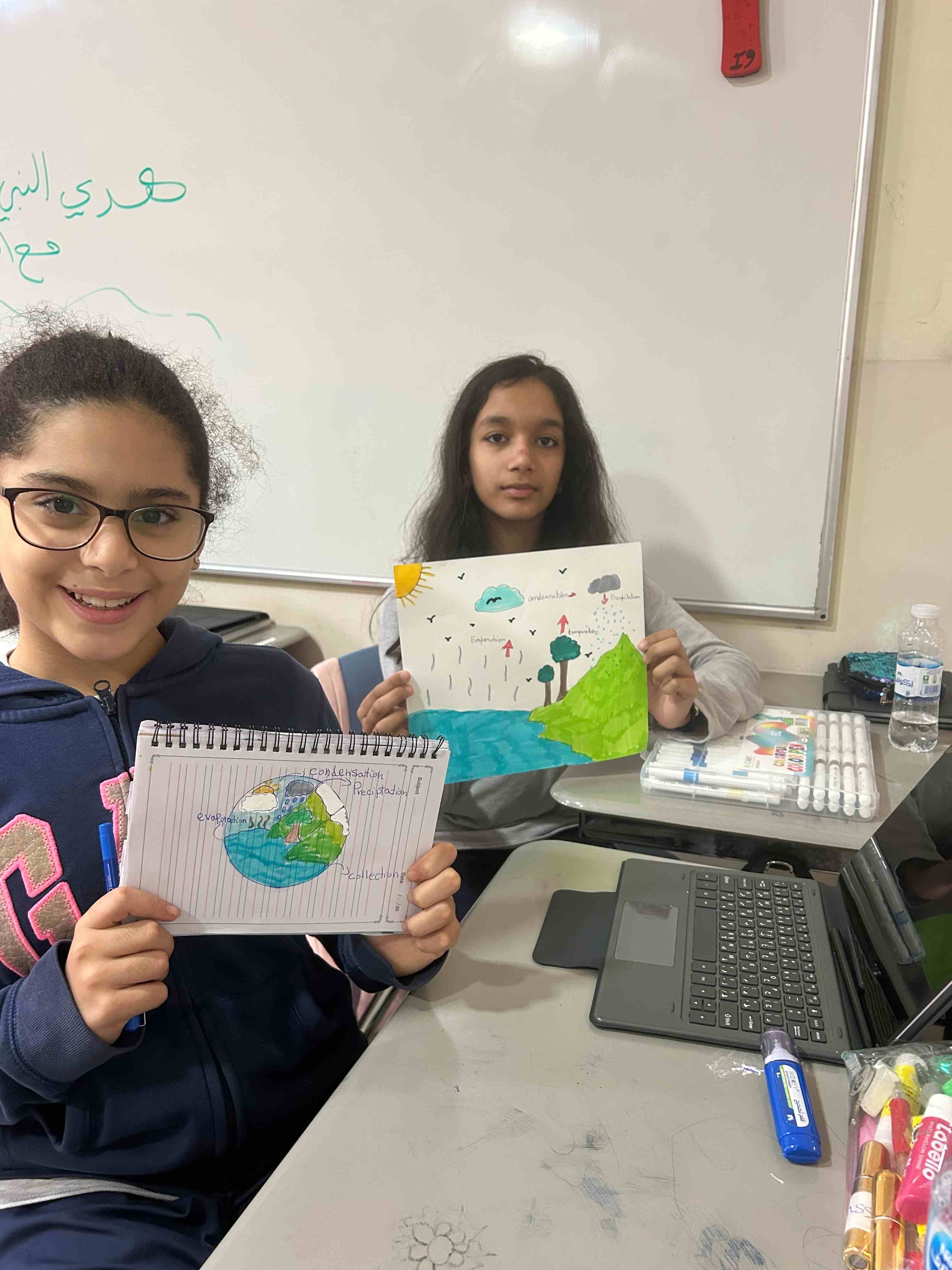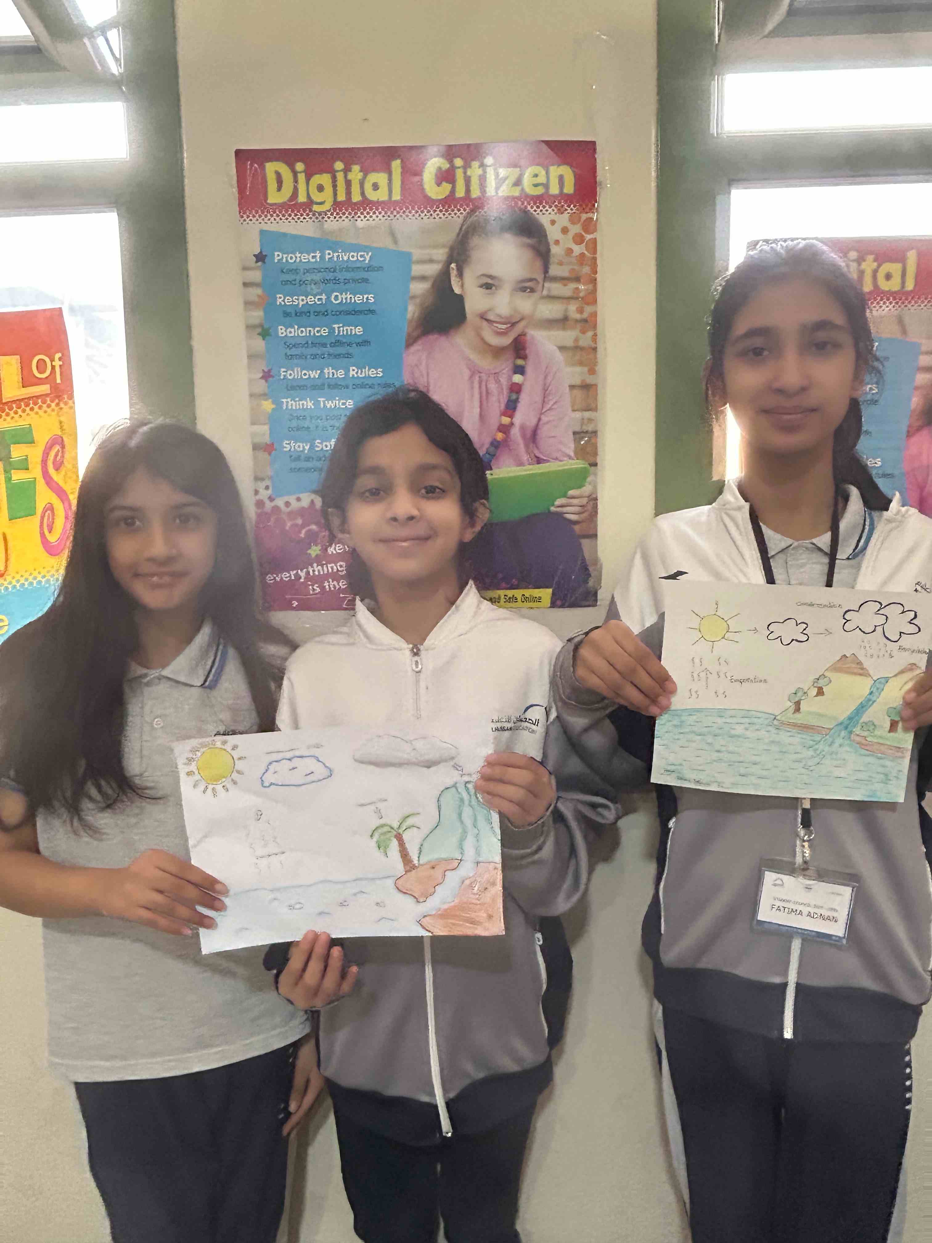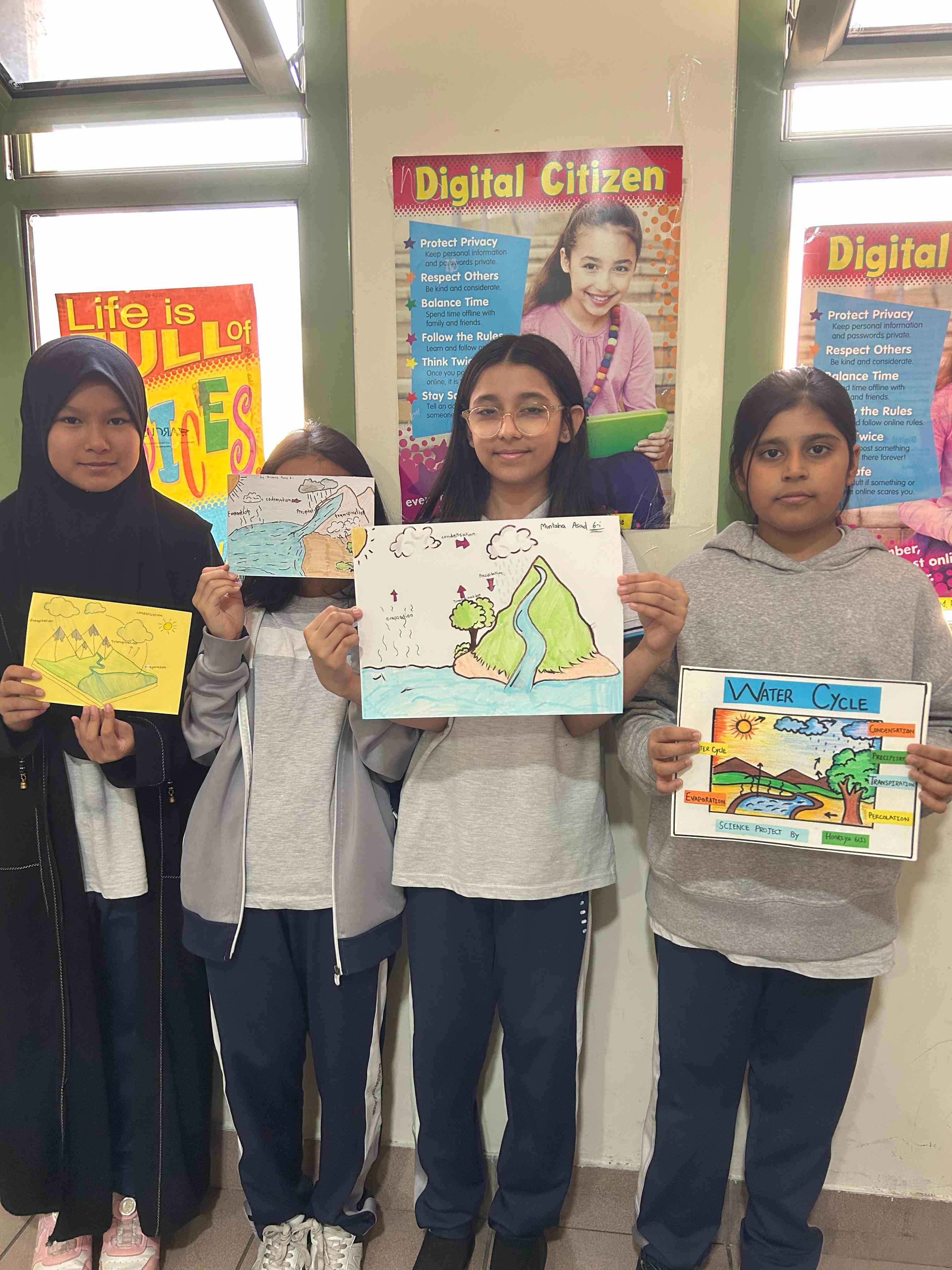 Grade 6 I girls showed their understanding of the water cycle through a simple class activity. They drew clear diagrams and labeled each stage. They also displayed their creativity through their artwork.