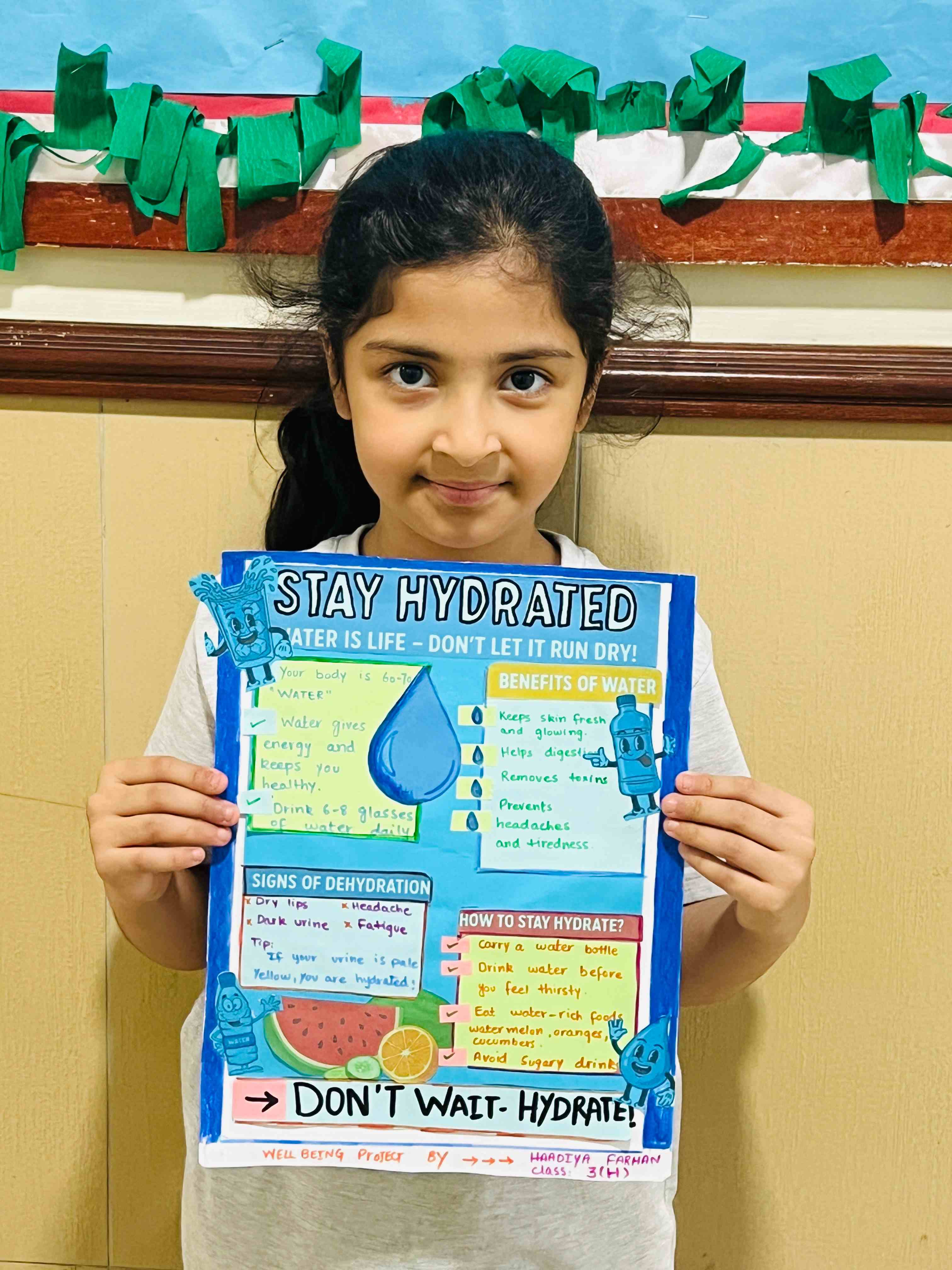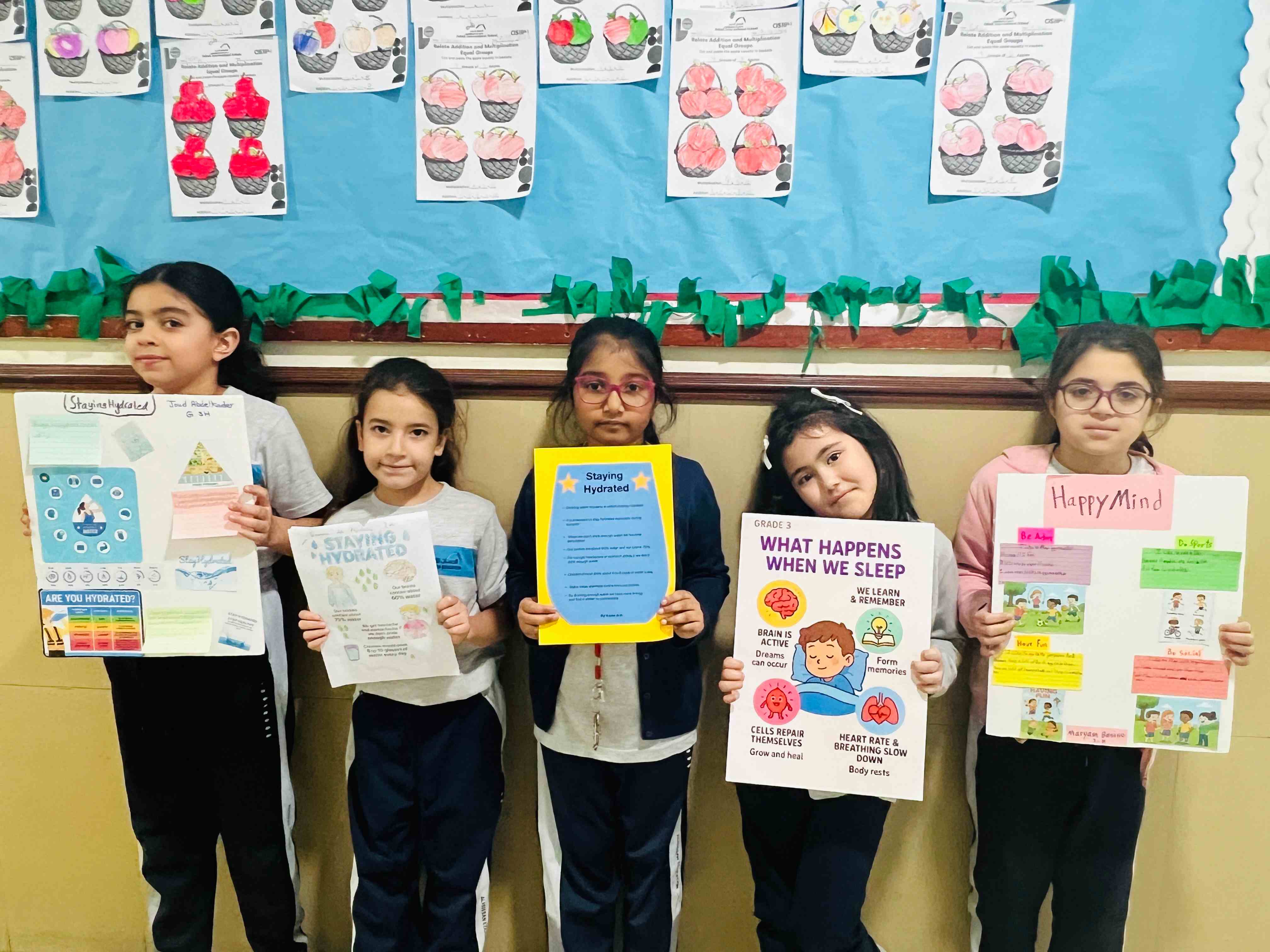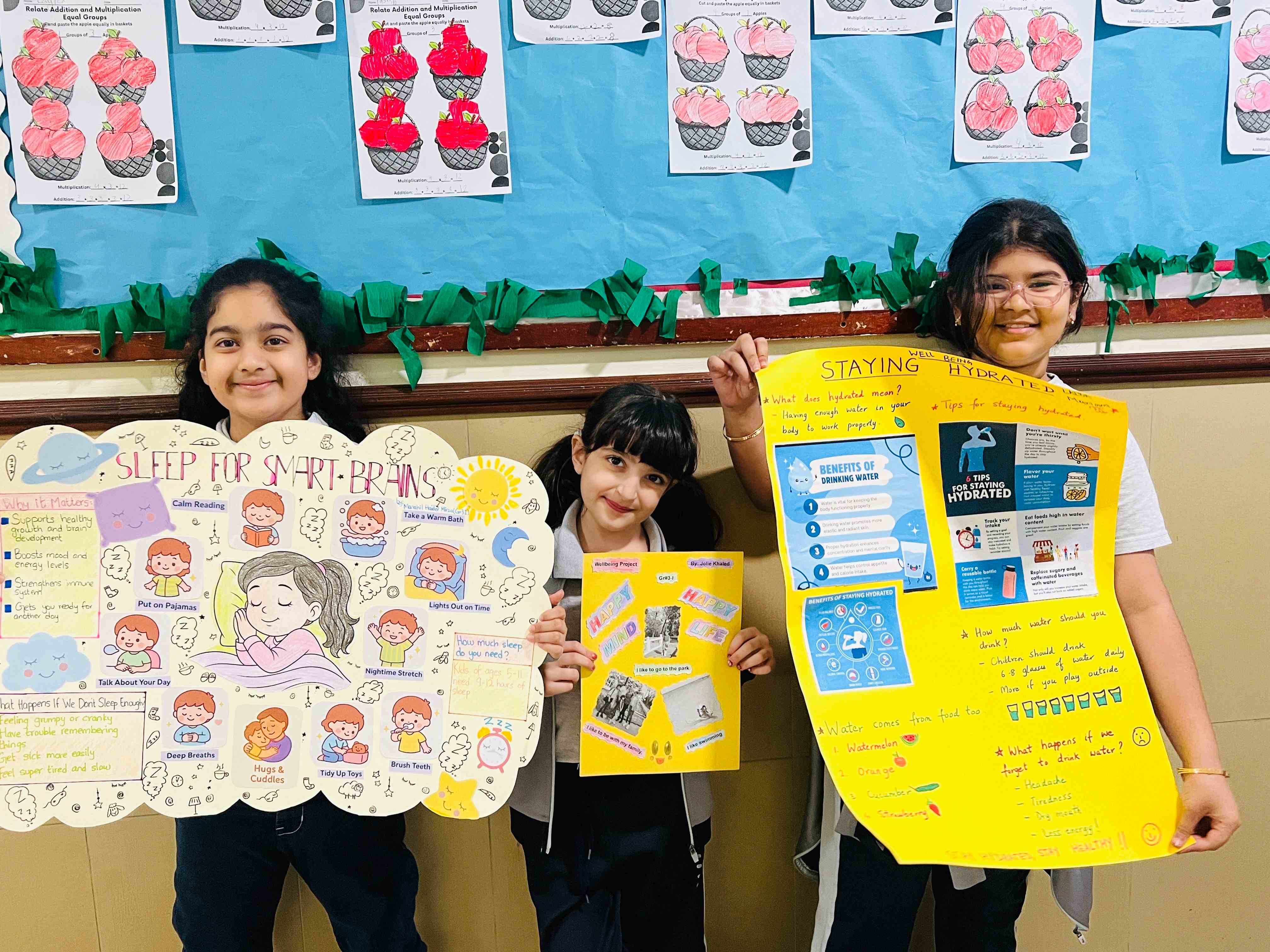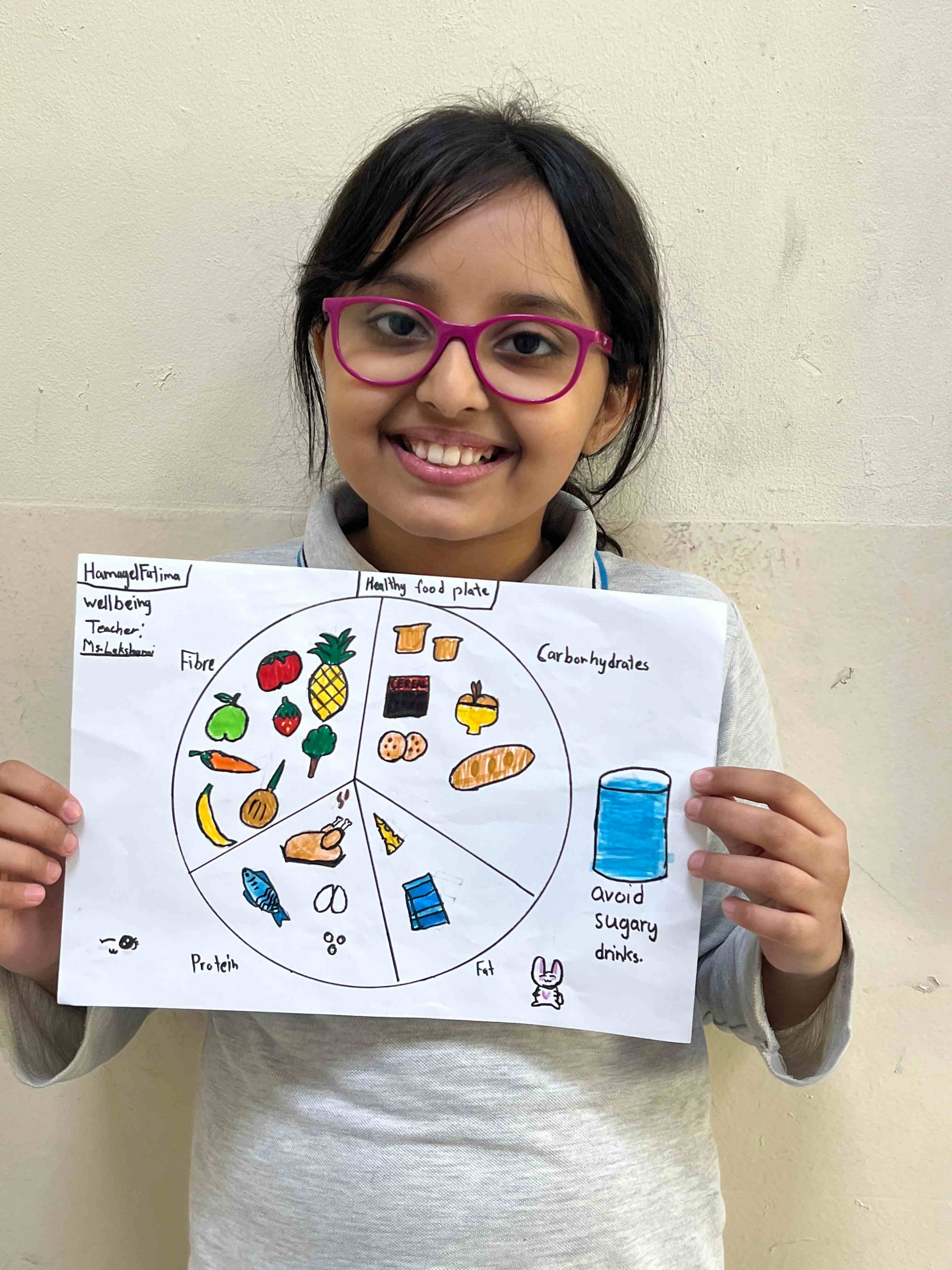 The girls in Grades 3, 4, and 5 created posters on healthy plate making, stress management, happy mind, and staying hydrated. They used clear messages and bright drawings to show their understanding. The activity supported teamwork, self-expression, and stronger awareness of healthy habits.
