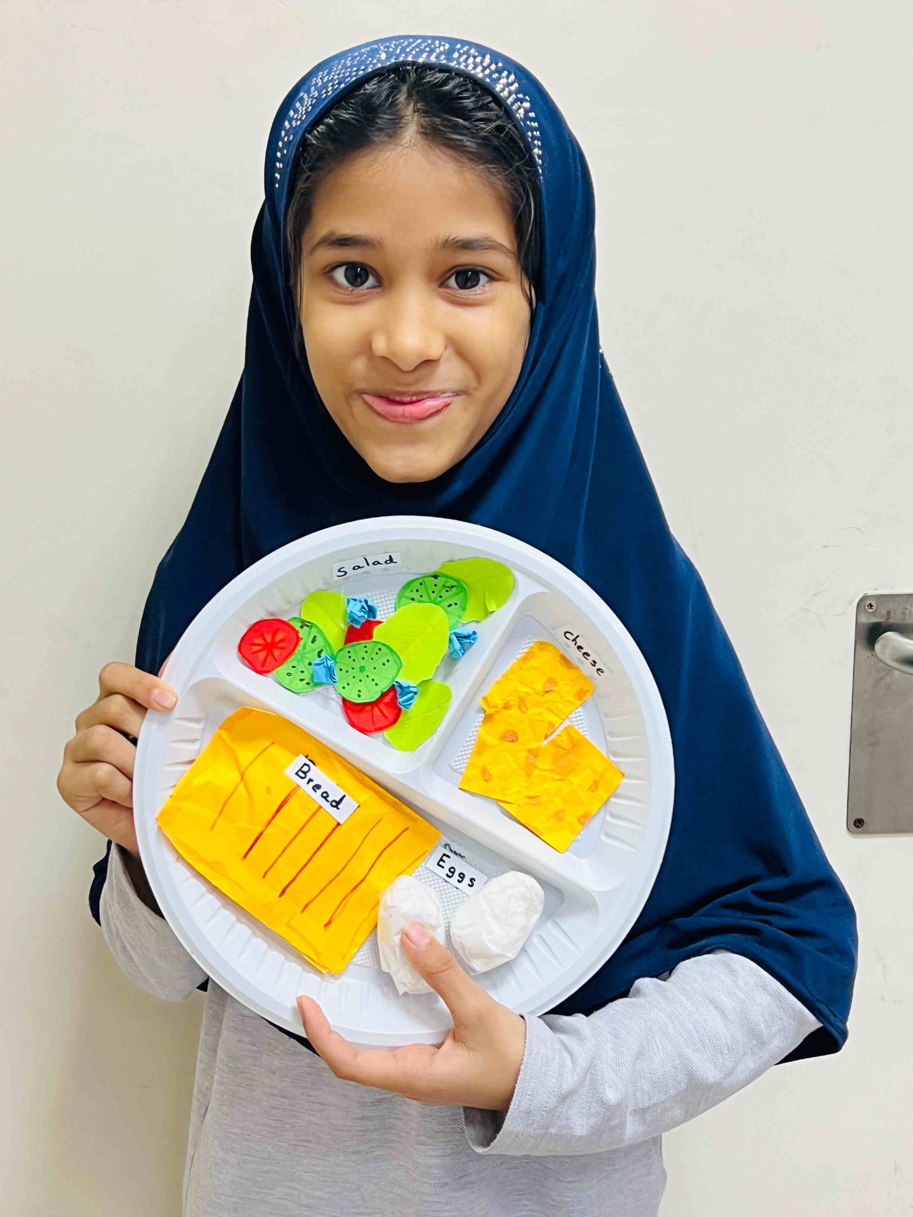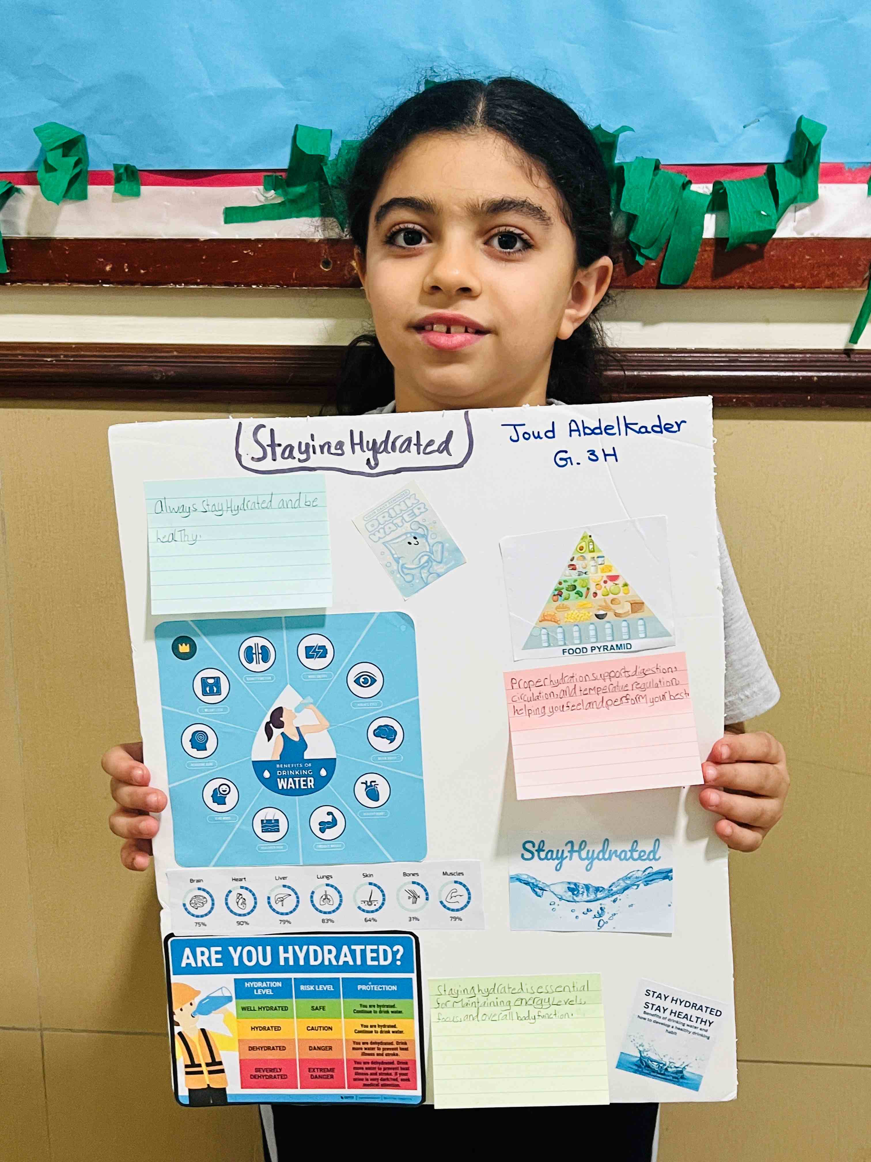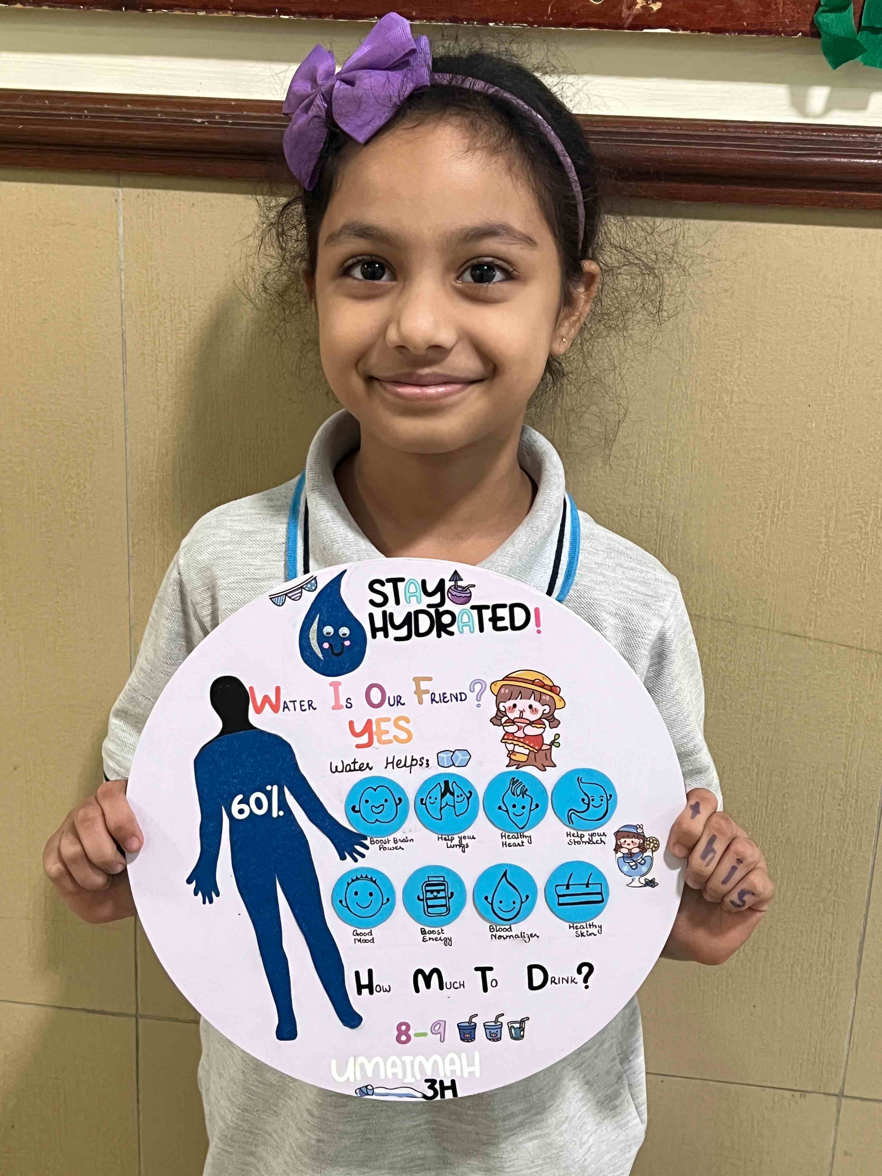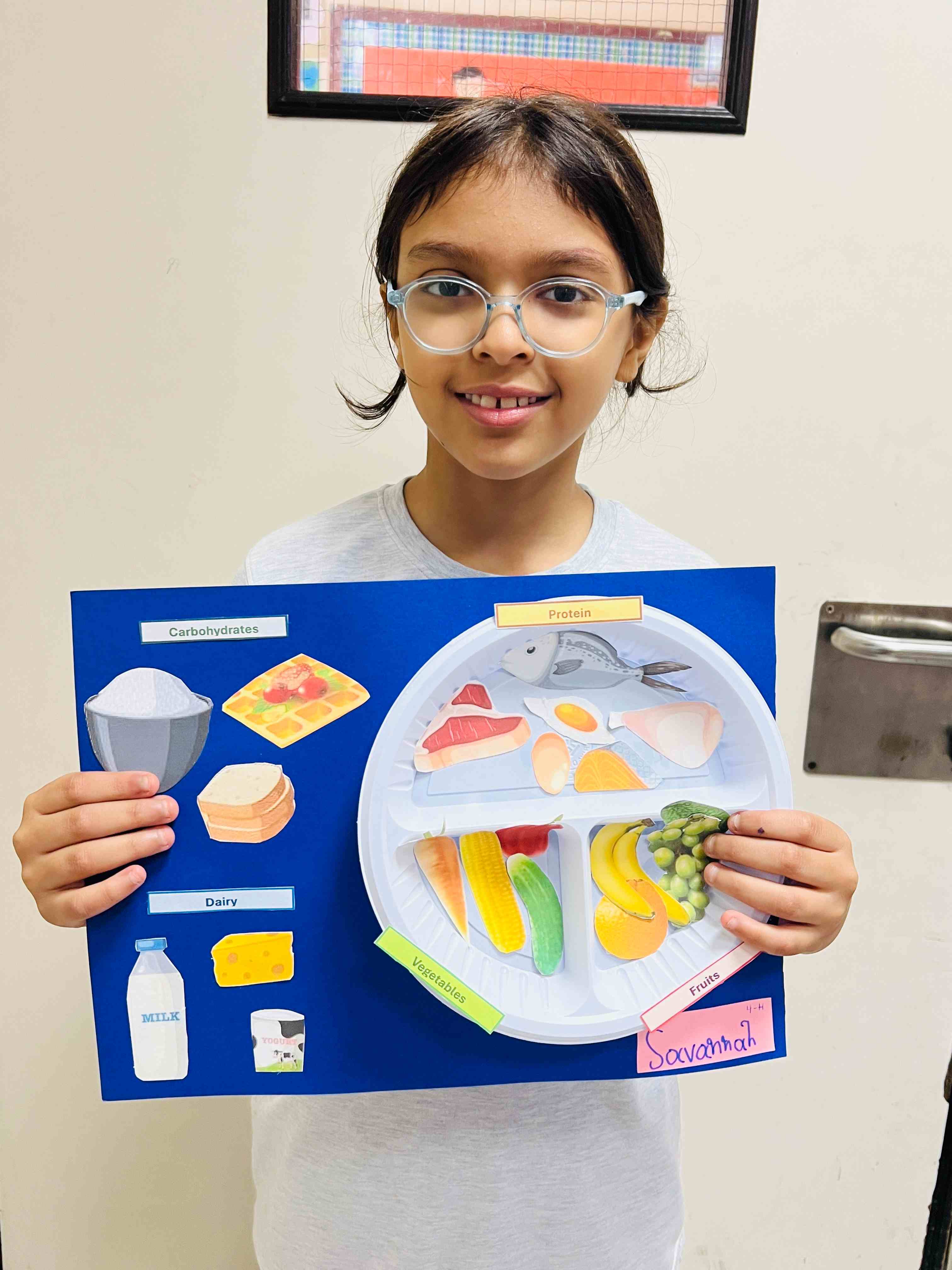 The girls in Grades 3, 4, and 5 created posters on healthy plate making, stress management, happy mind, and staying hydrated. They used clear messages and bright drawings to show their understanding. The activity supported teamwork, self-expression, and stronger awareness of healthy habits.
