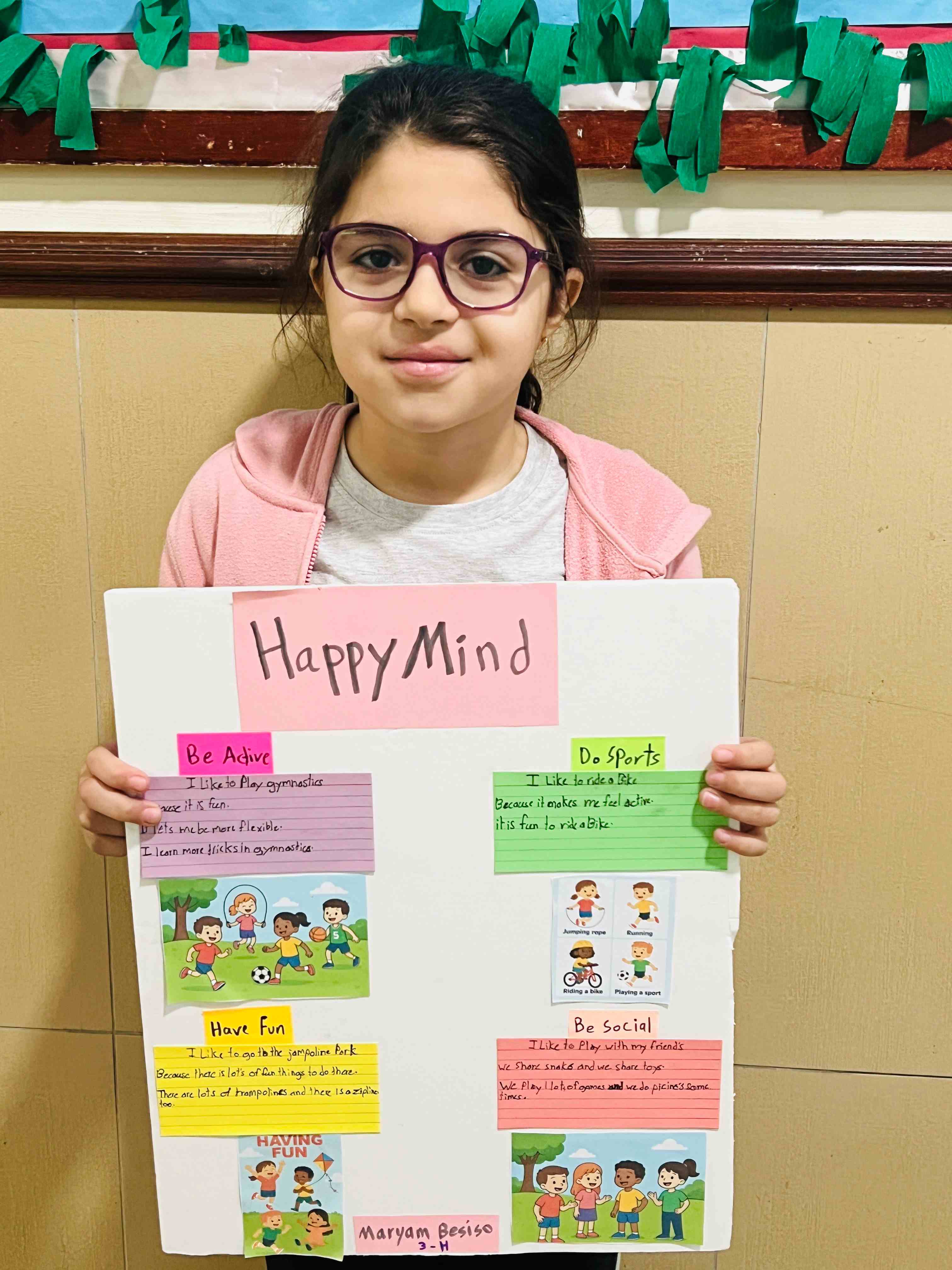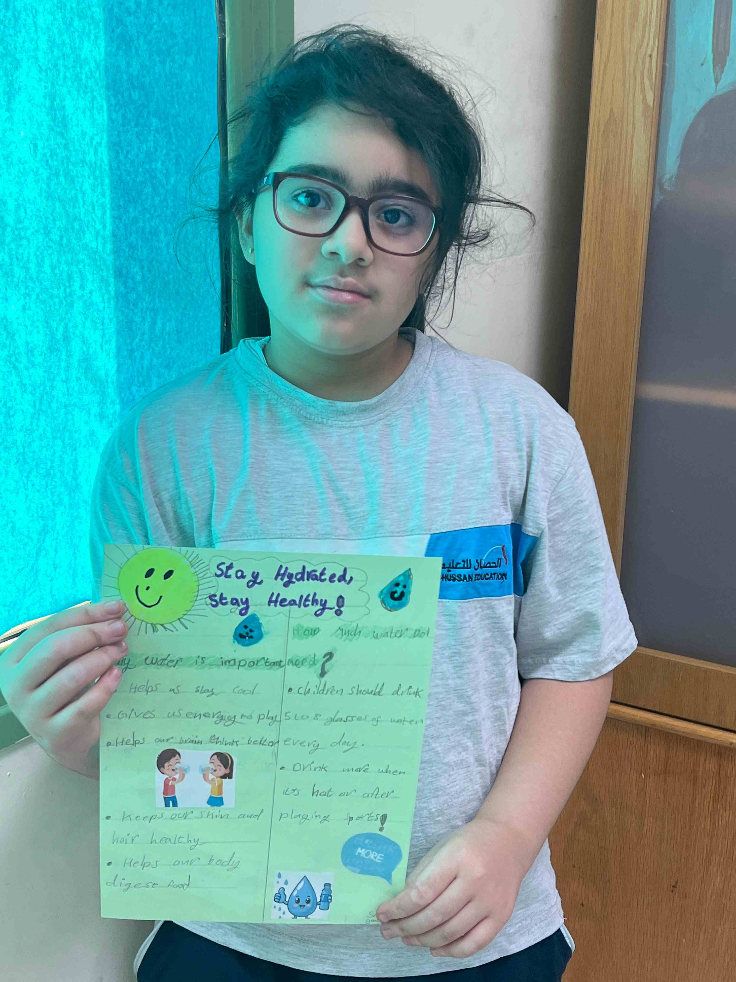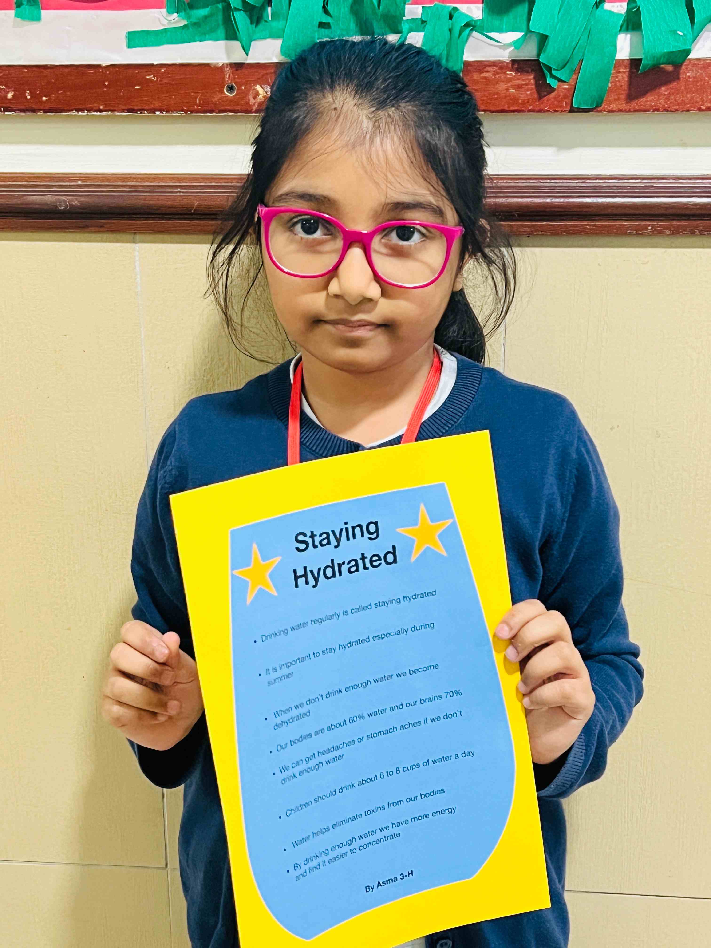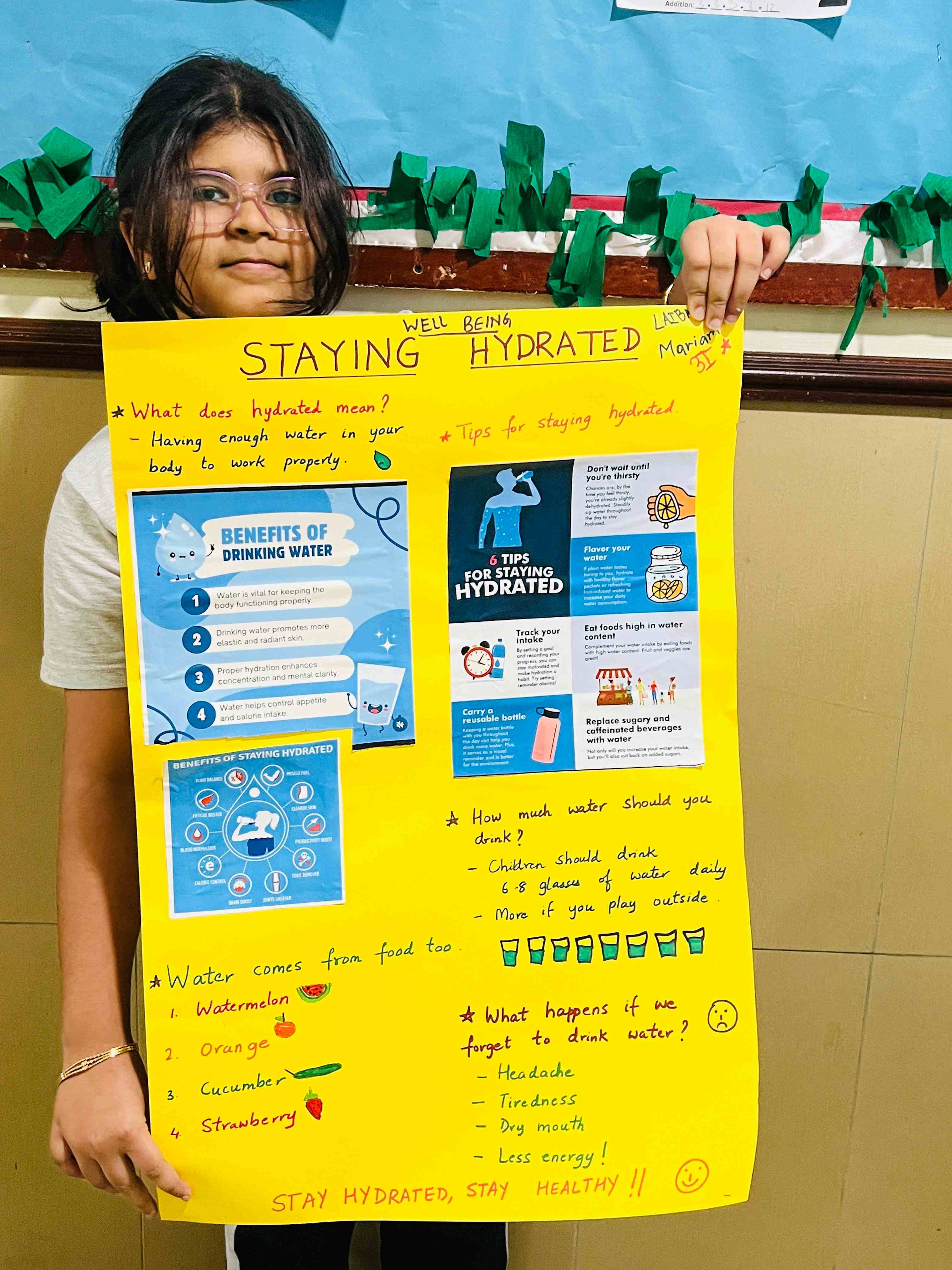 The girls in Grades 3, 4, and 5 created posters on healthy plate making, stress management, happy mind, and staying hydrated. They used clear messages and bright drawings to show their understanding. The activity supported teamwork, self-expression, and stronger awareness of healthy habits.