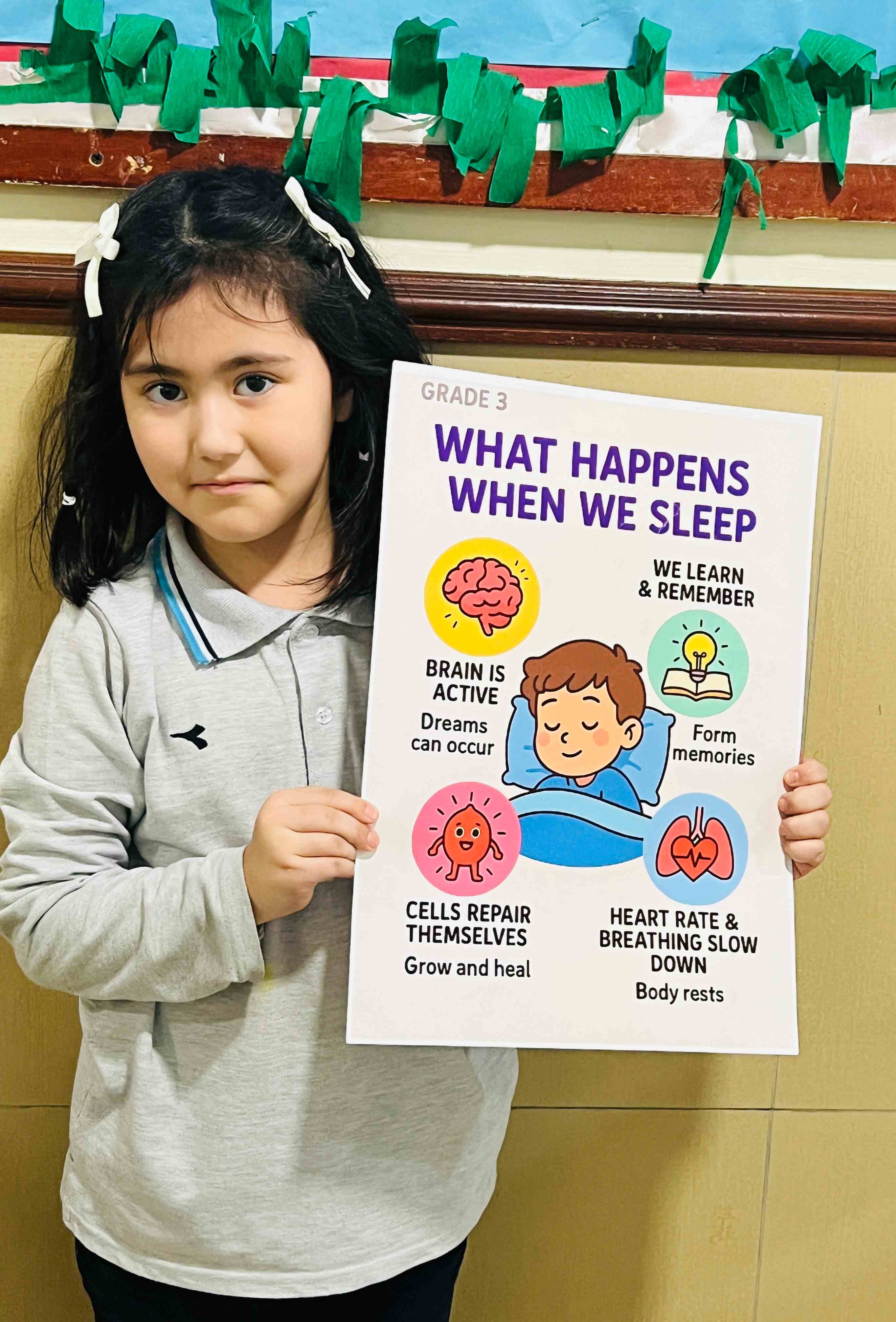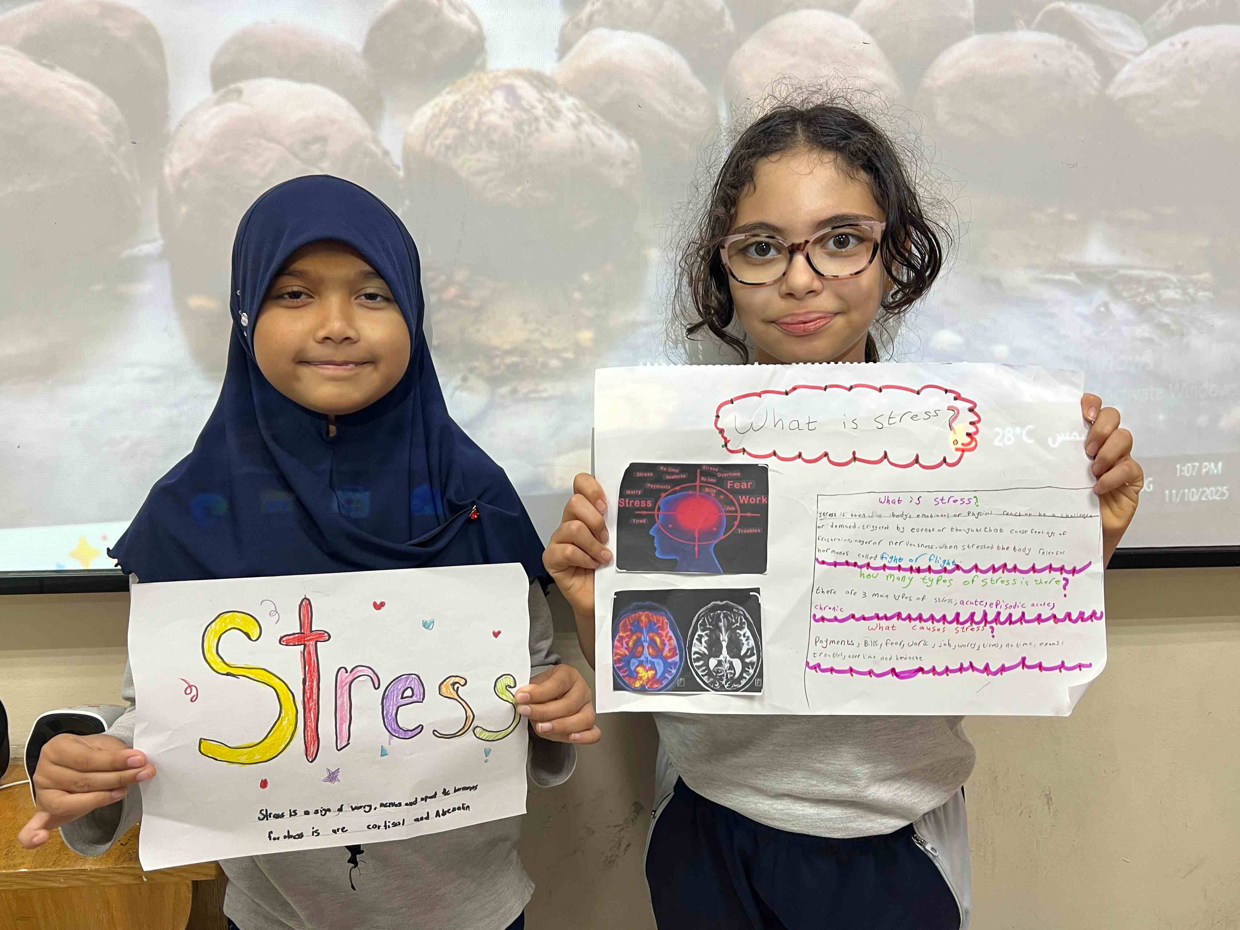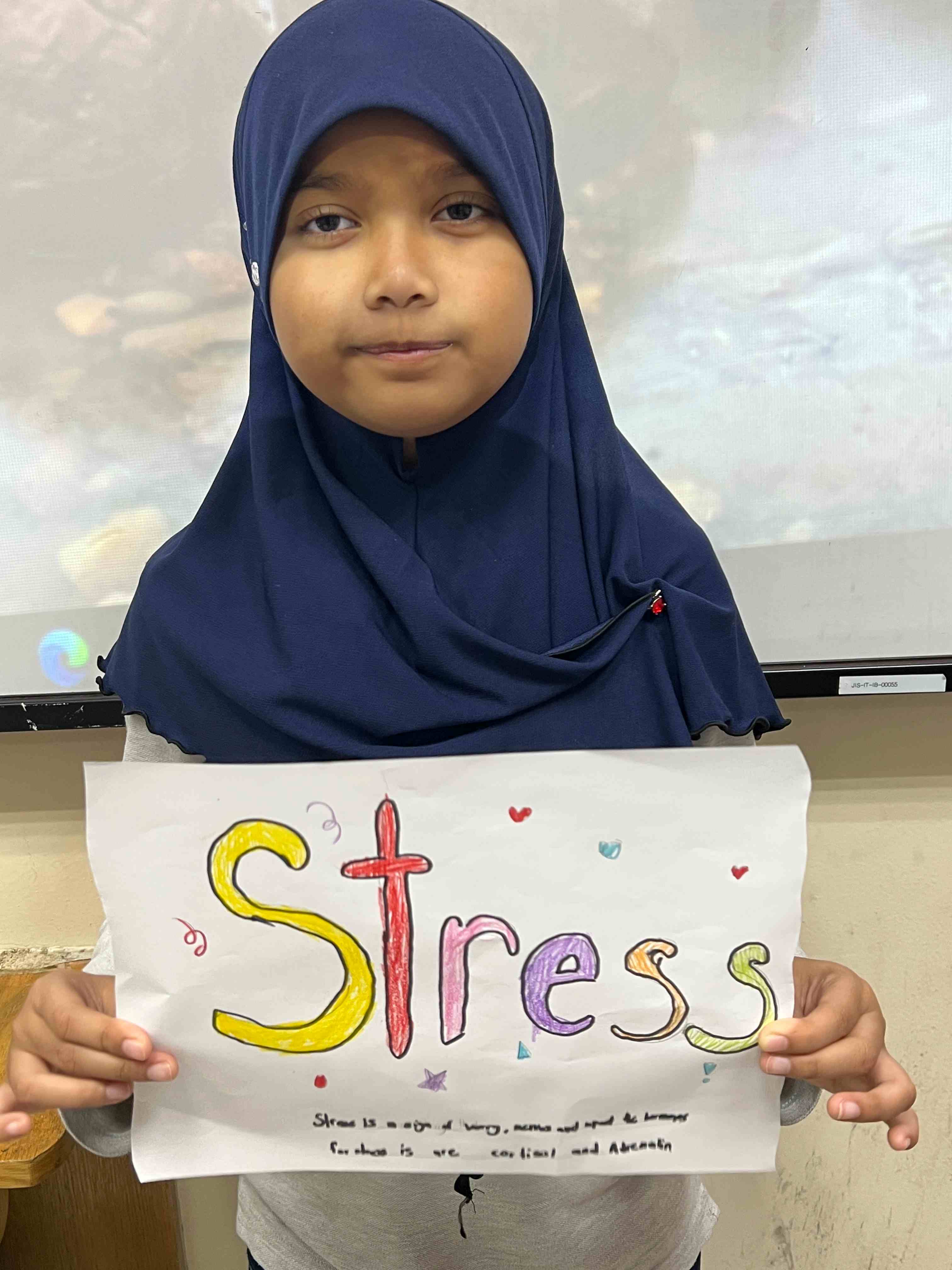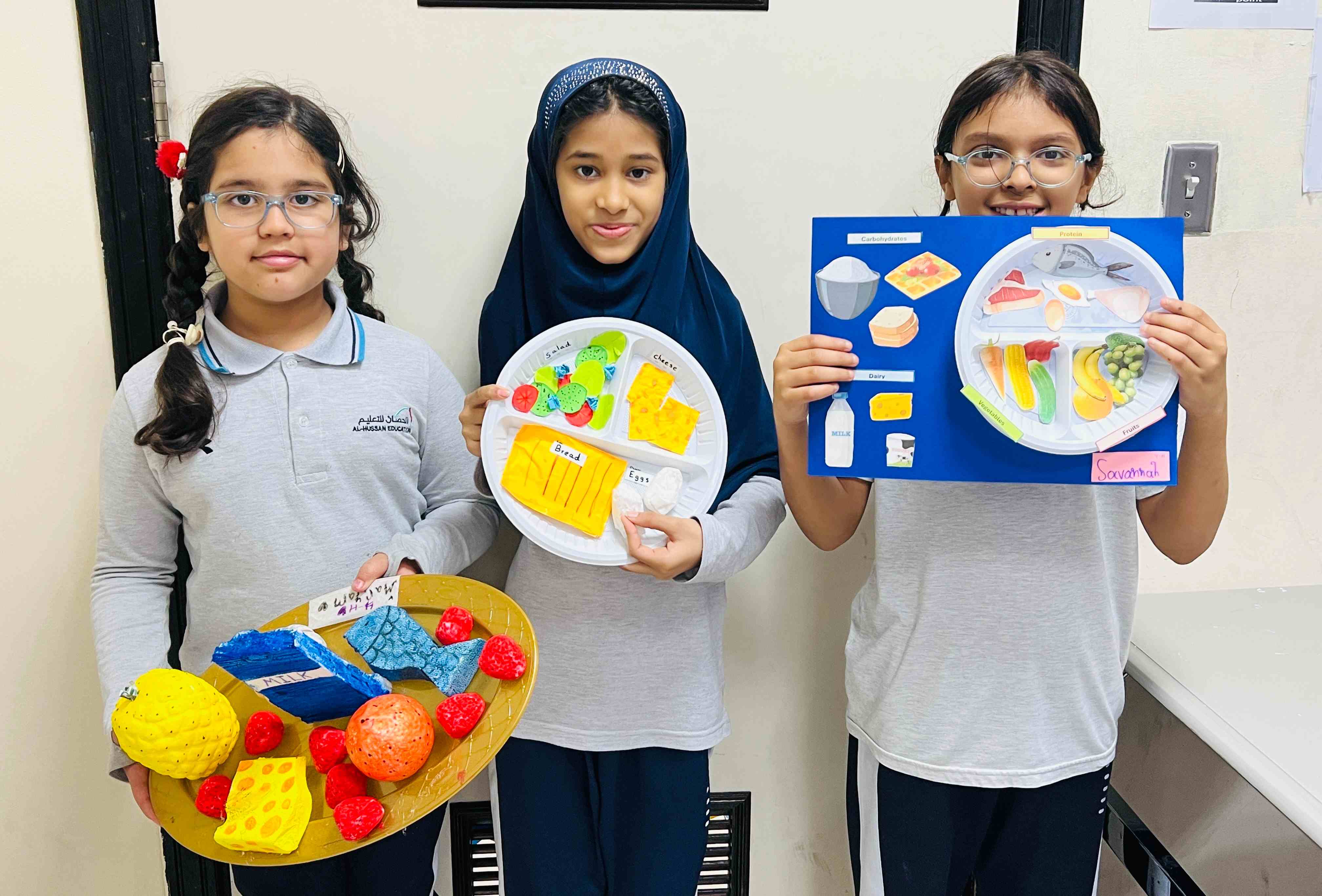 The girls in Grades 3, 4, and 5 created posters on healthy plate making, stress management, happy mind, and staying hydrated. They used clear messages and bright drawings to show their understanding. The activity supported teamwork, self-expression, and stronger awareness of healthy habits.