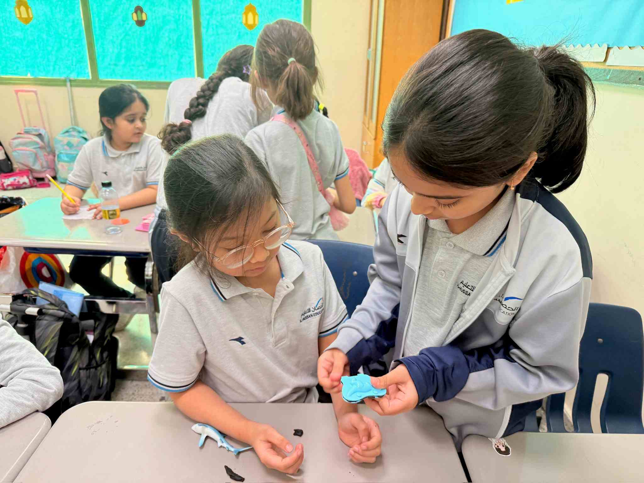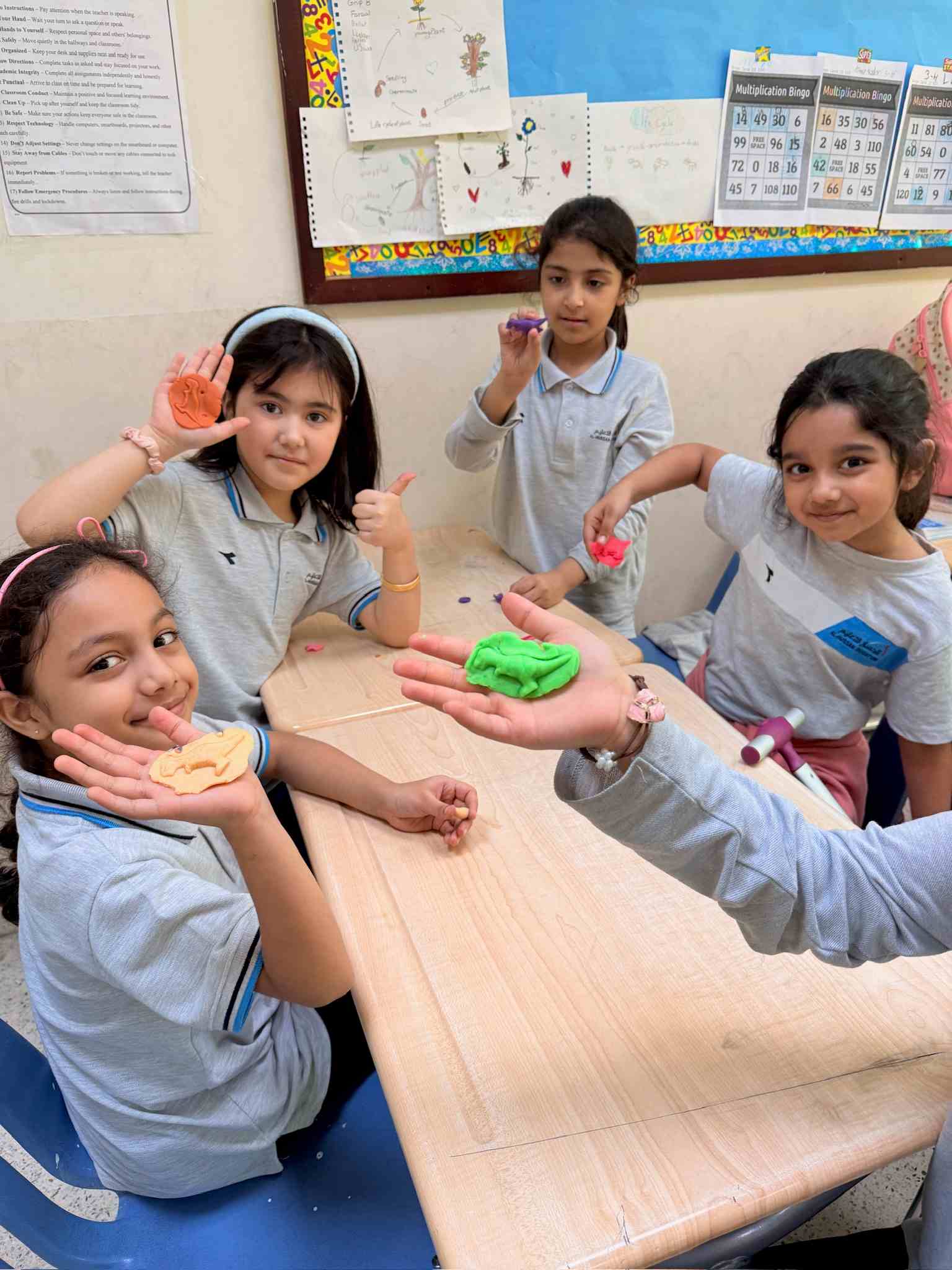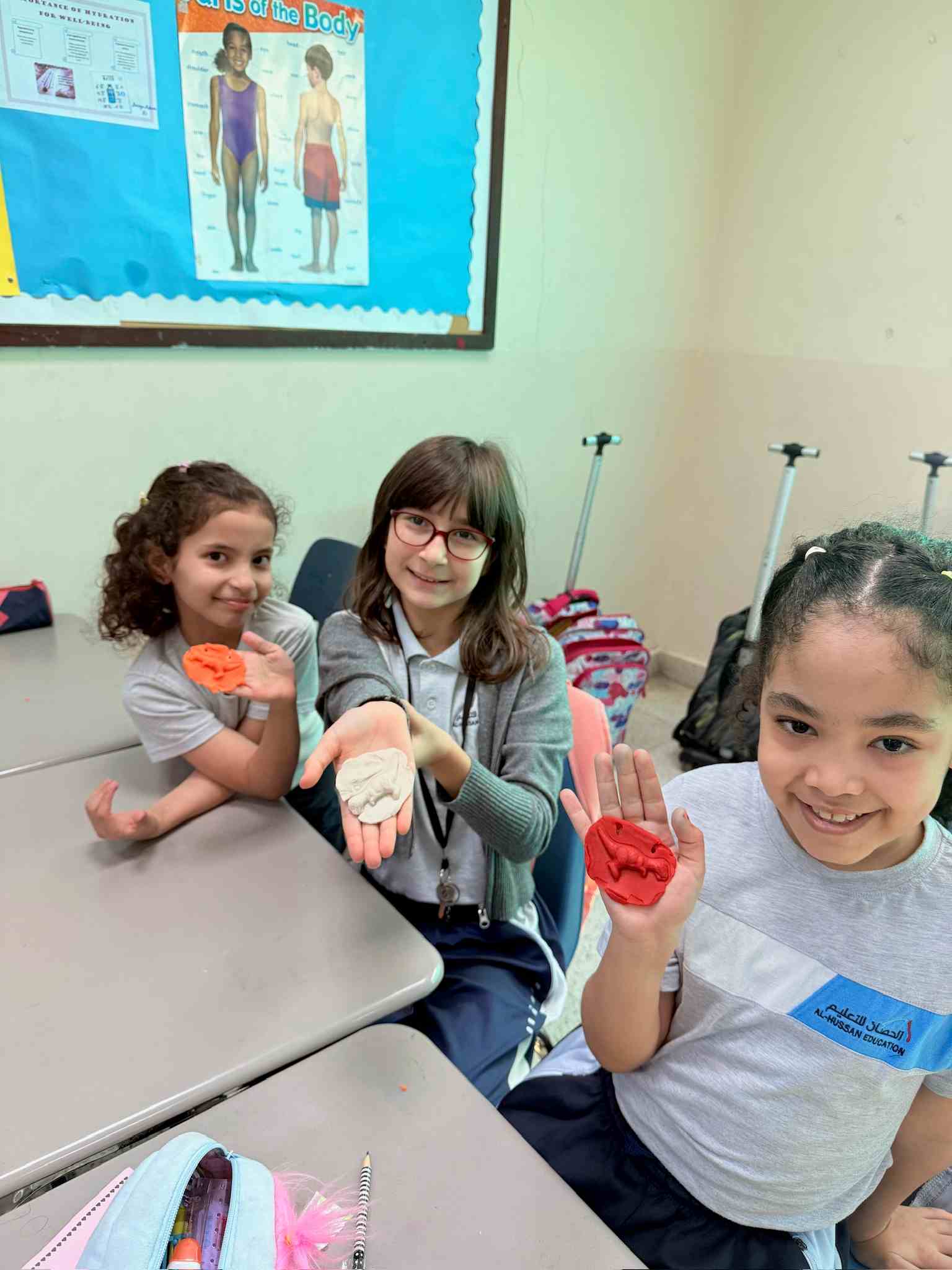 Our Grade 3 students engaged in a hands-on fossils activity using play dough and dinosaur toys.