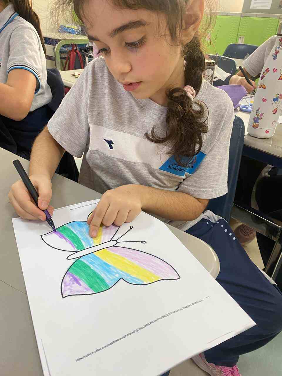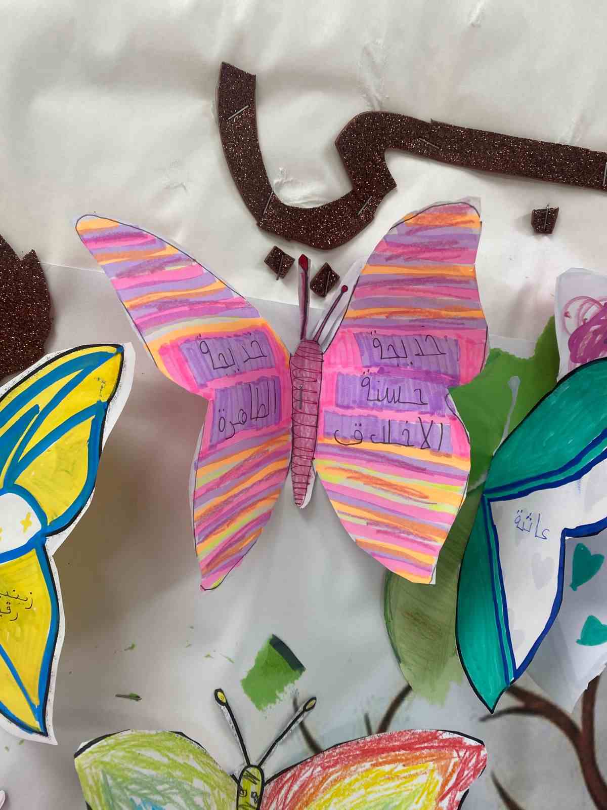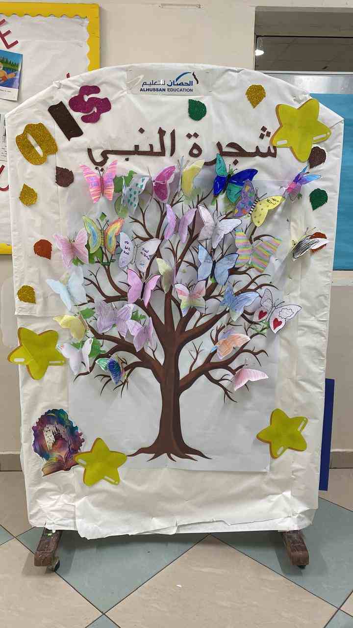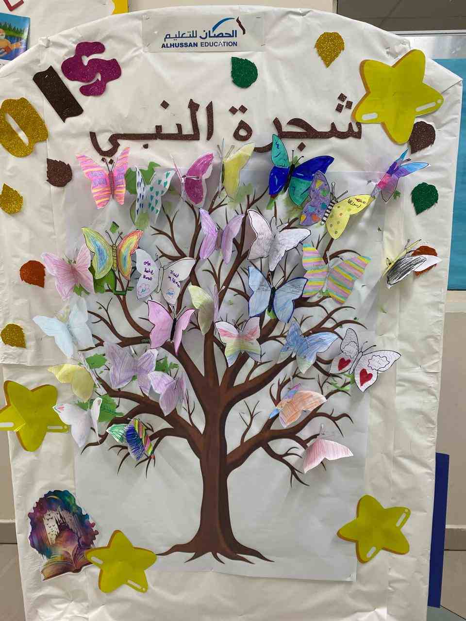 We presented The Prophet's Tree Activity, During the Islamic Education class for the fourth and fifth grades, the students created the Prophet Muhammad's tree activity by writing the names of the Prophet's wives and children in the form of butterflies. The students wrote and colored them, then hung them on a tree to complete the Prophet's family tree.