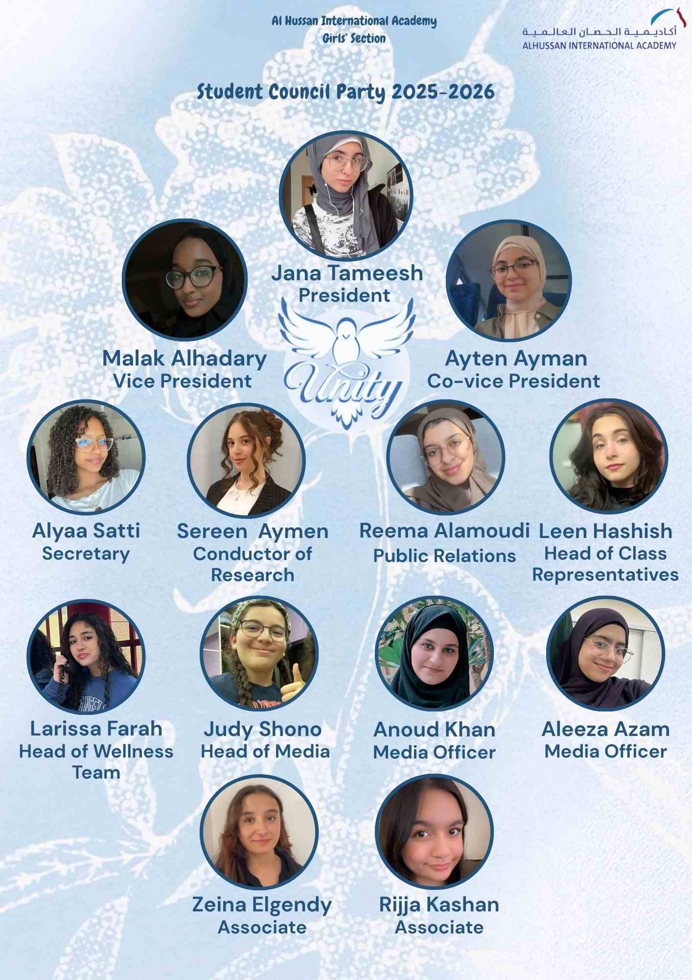 In the Girls’ Section, we are proud to introduce our Unity Student Council along with the Class Representatives and Assistants for the Academic Year 2025–2026.