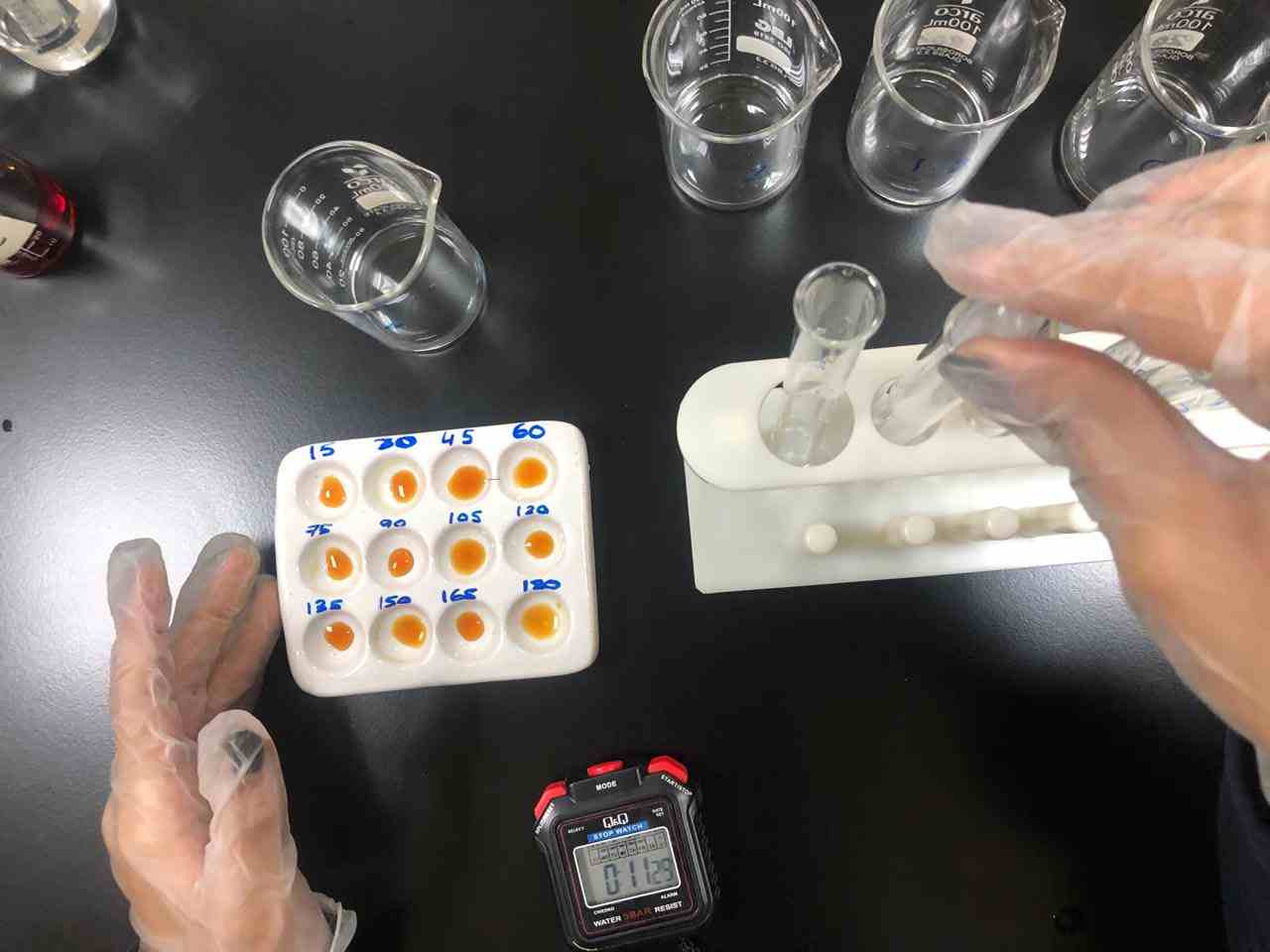 Our Grade 11 AS Biology students from the Girls Section carried out an enzyme assay experiment to investigate how amylase concentration affects the rate of reaction. Using the iodine test, students monitored the breakdown of starch and analyzed how enzyme concentration influences the reaction speed.