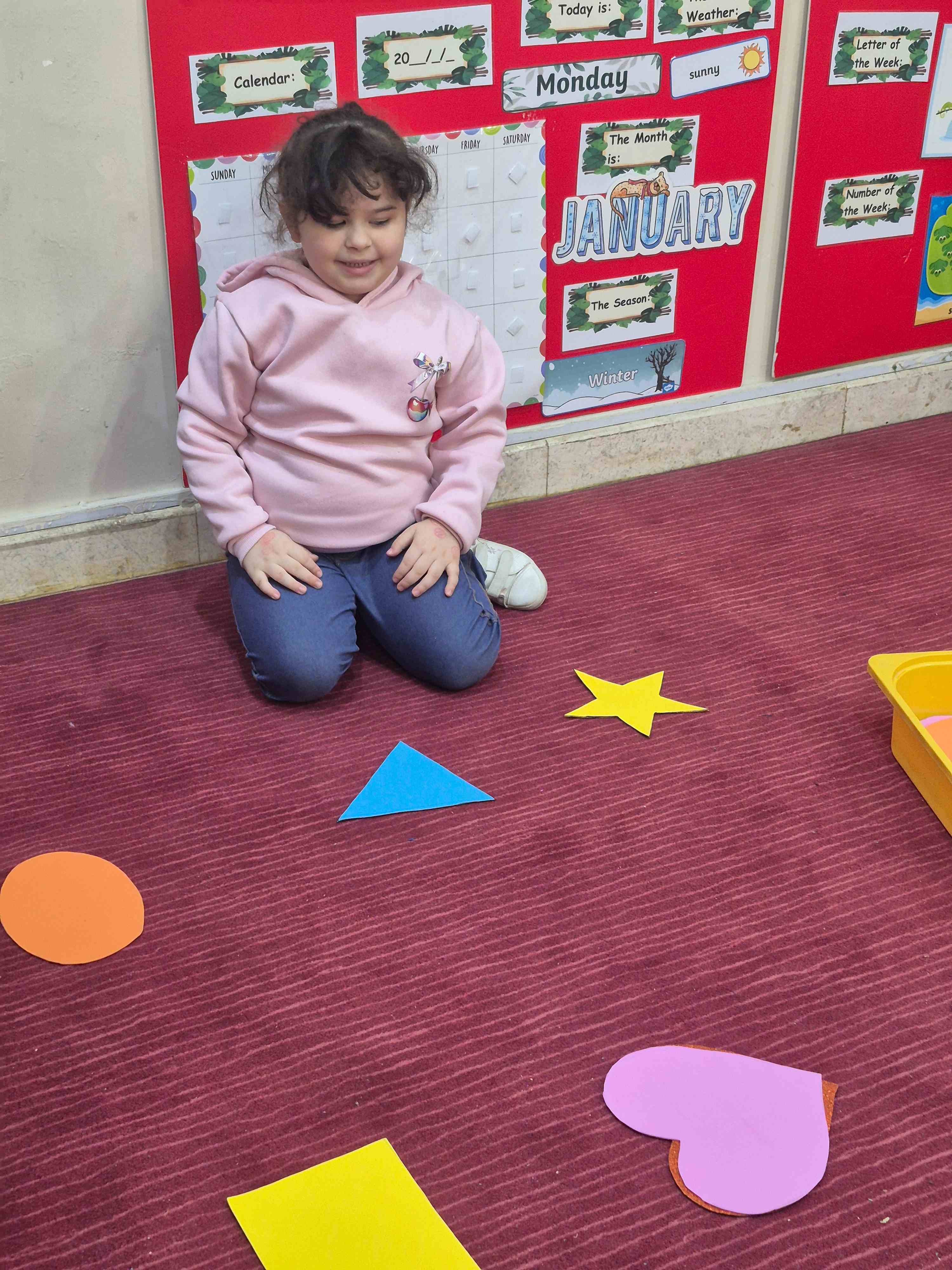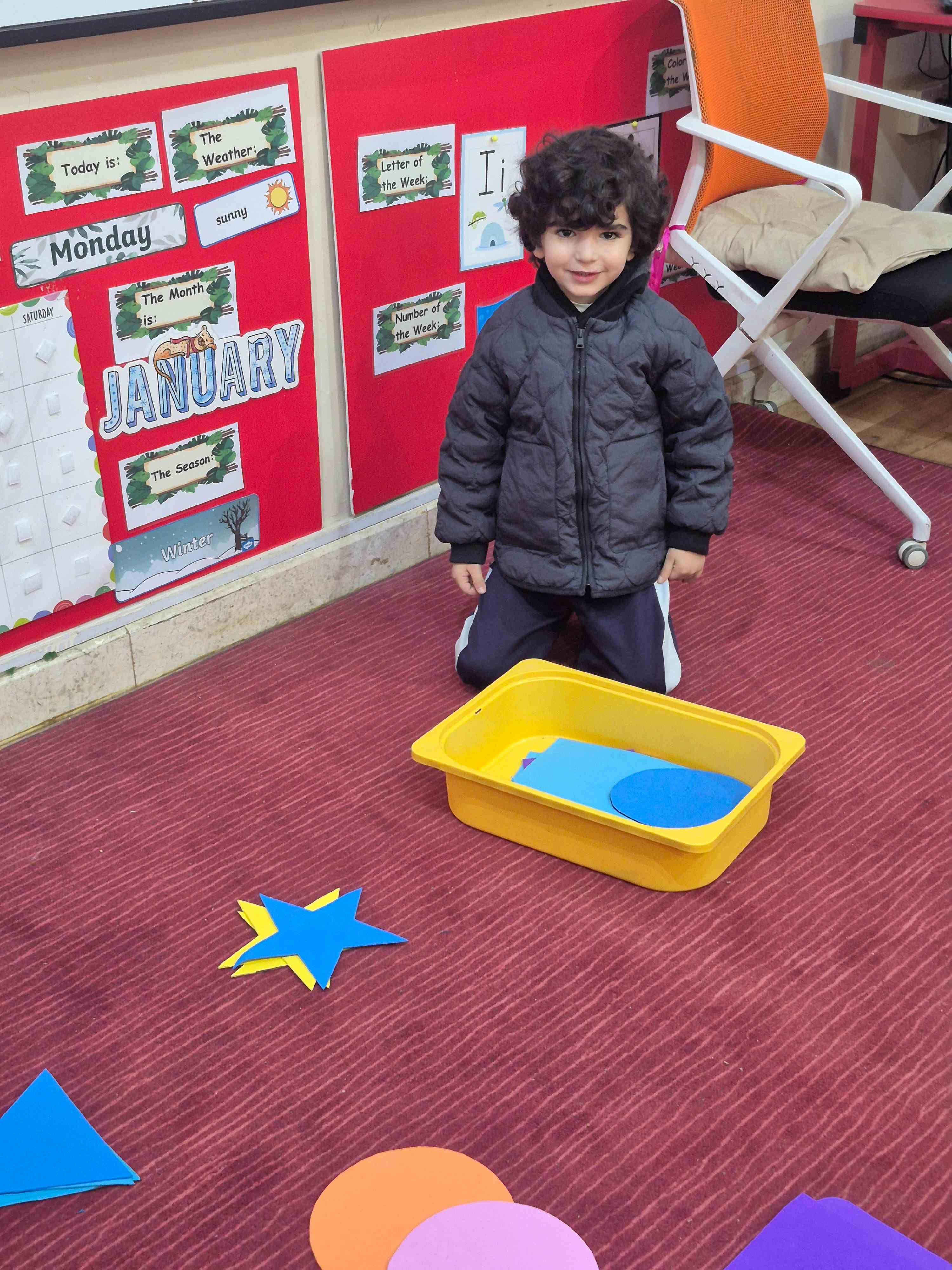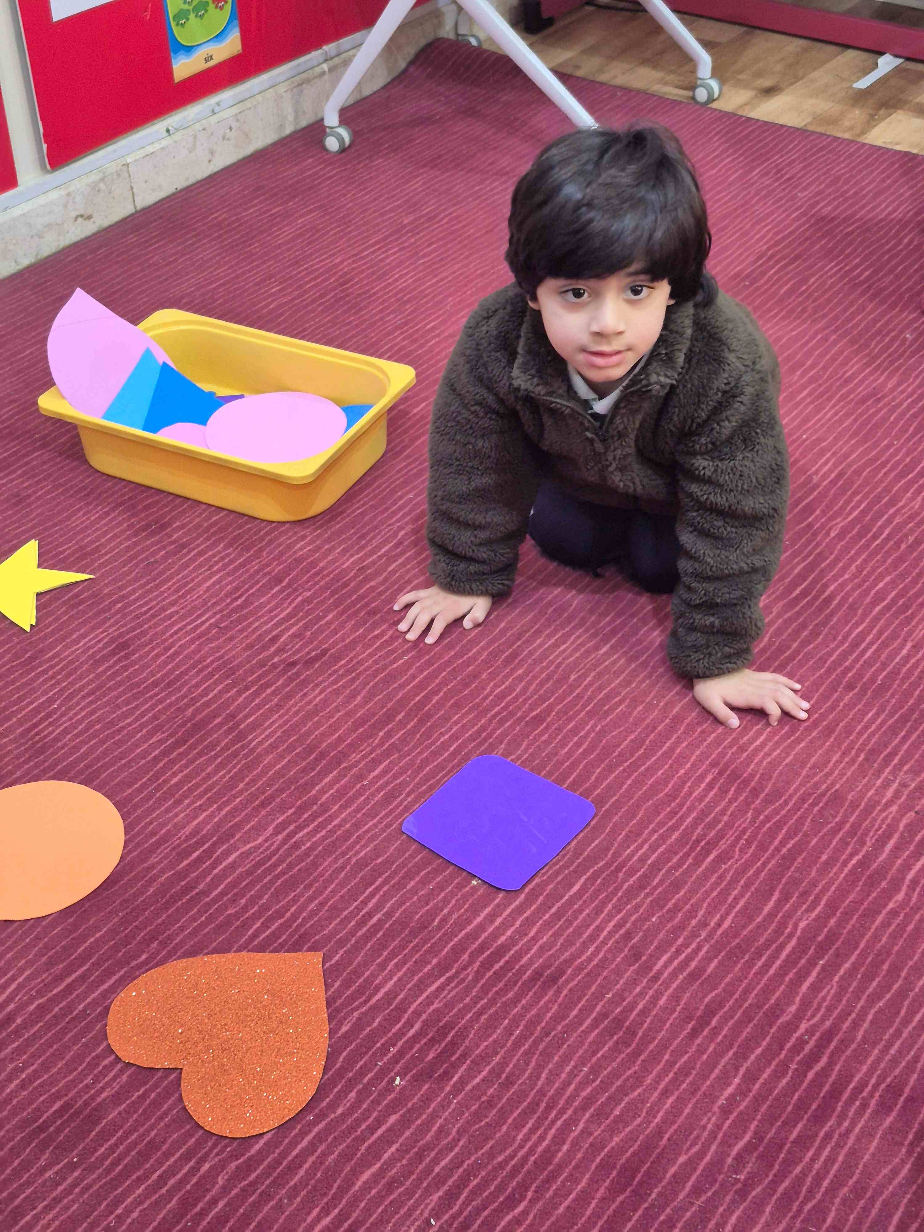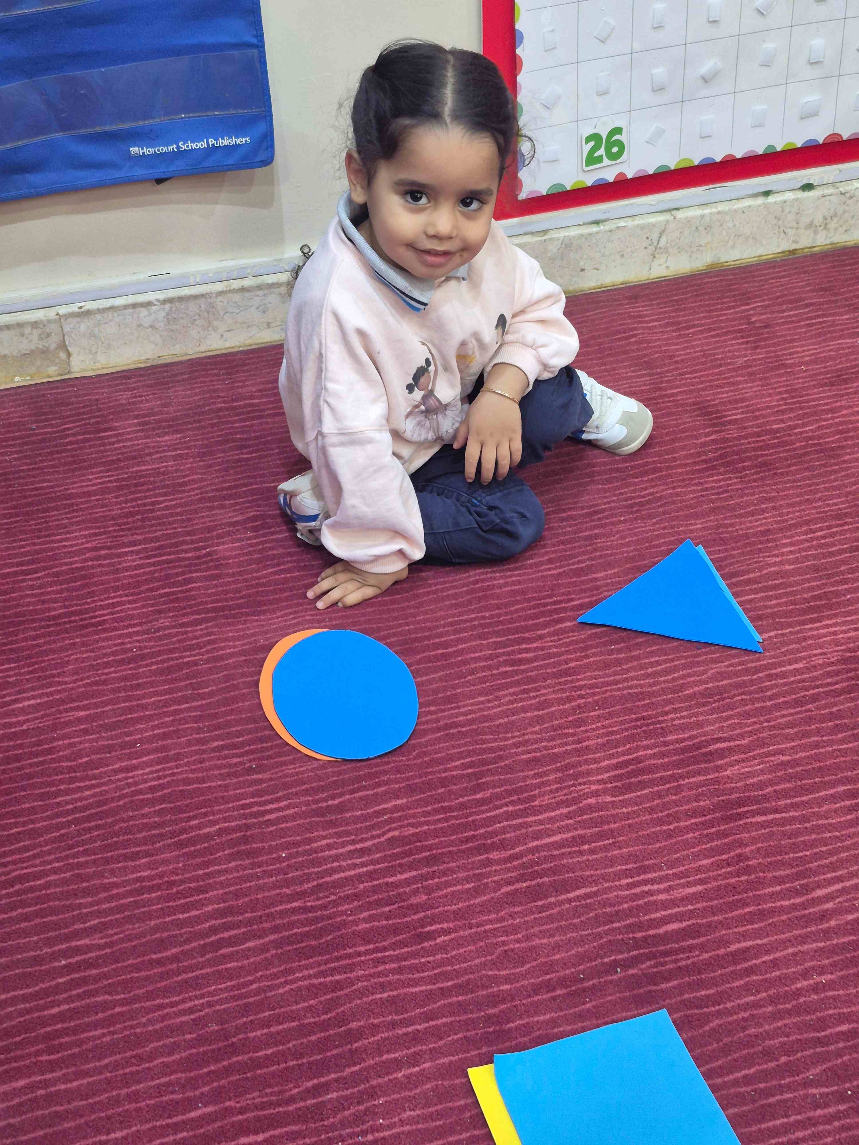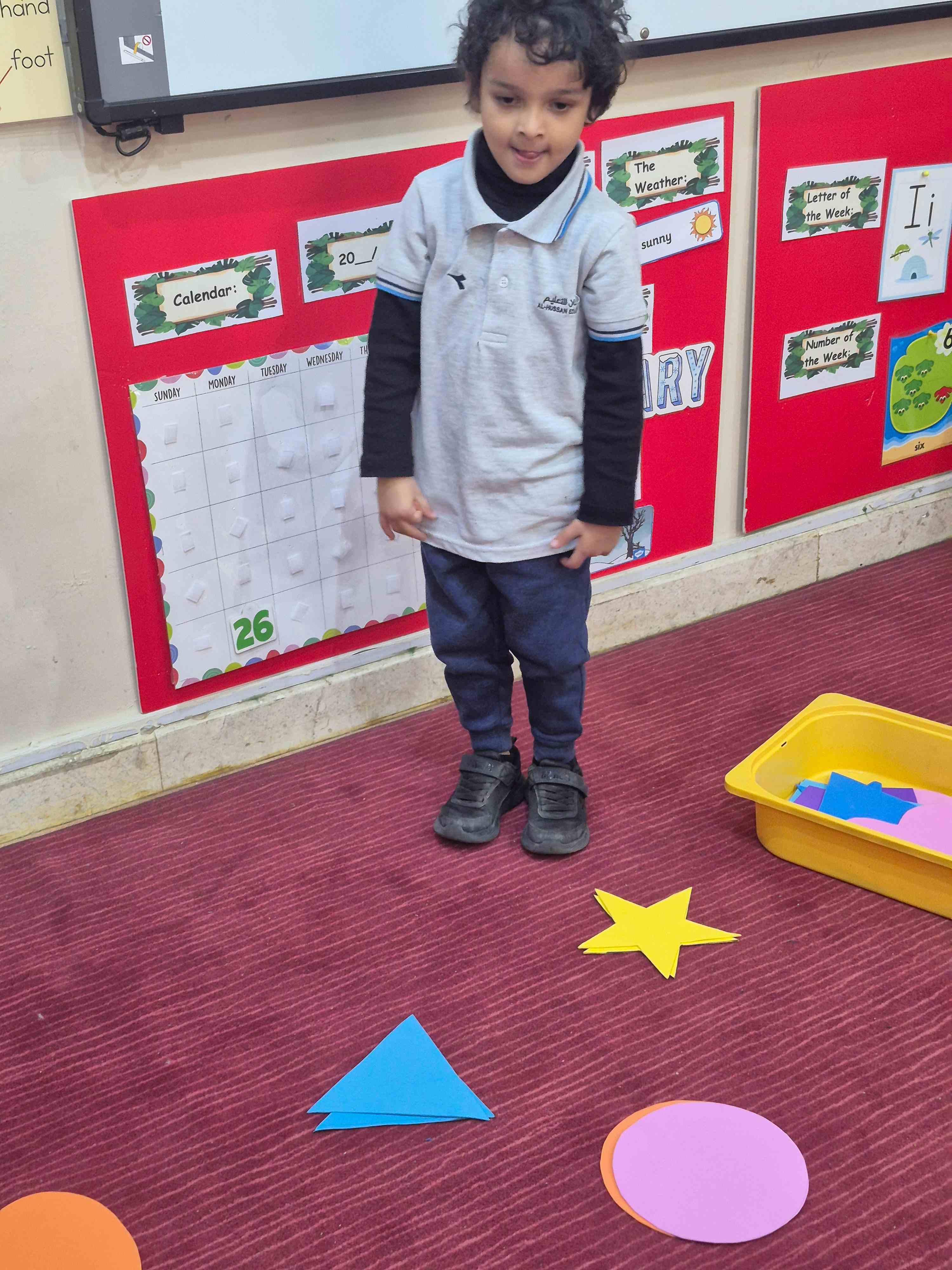 Our KG1 students matched identical shapes by finding the same shape from a box and placing it on the corresponding shape on the floor. Students picked a shape from the box, identified it, and then matched it with the same shape on the floor.