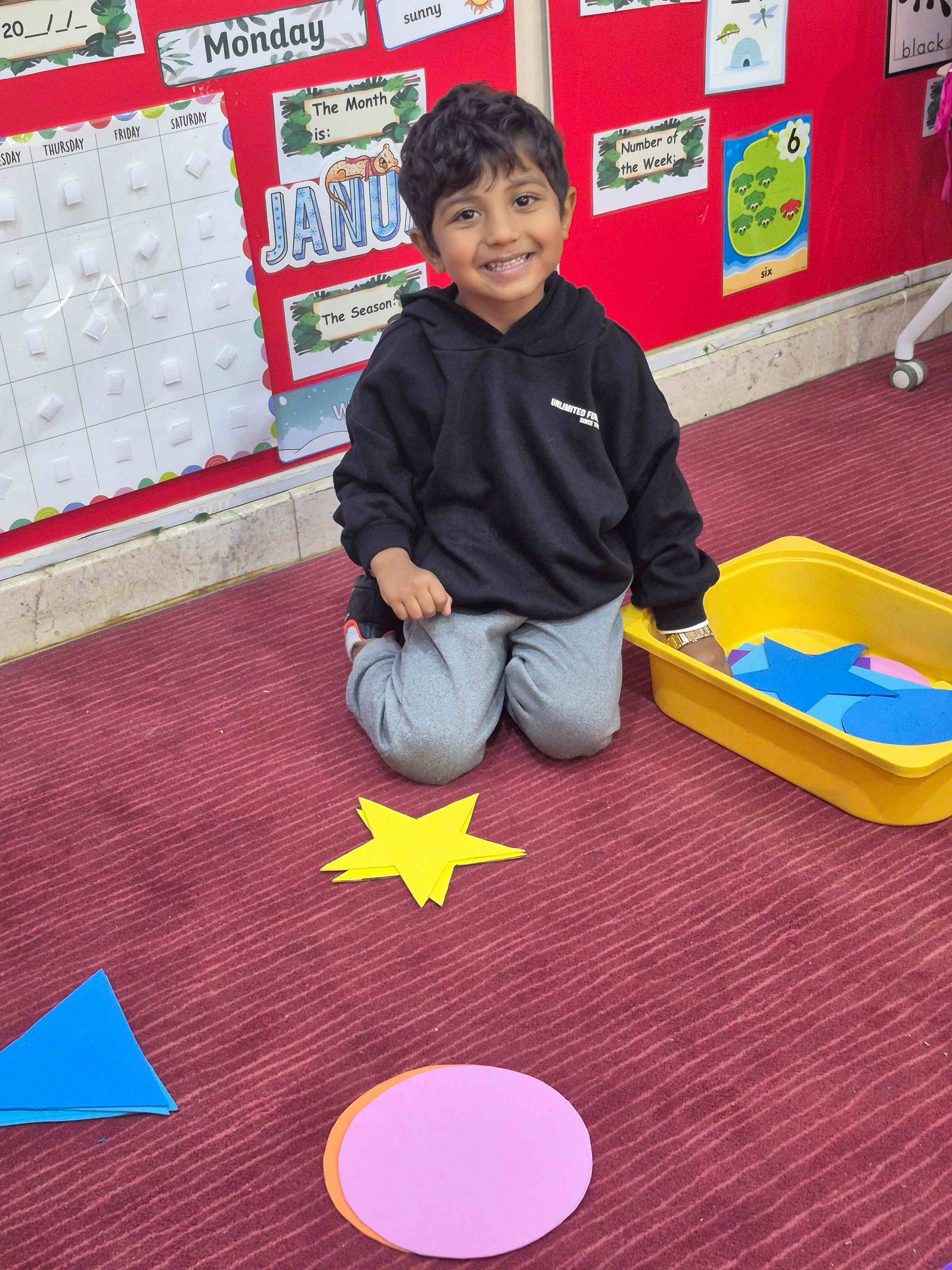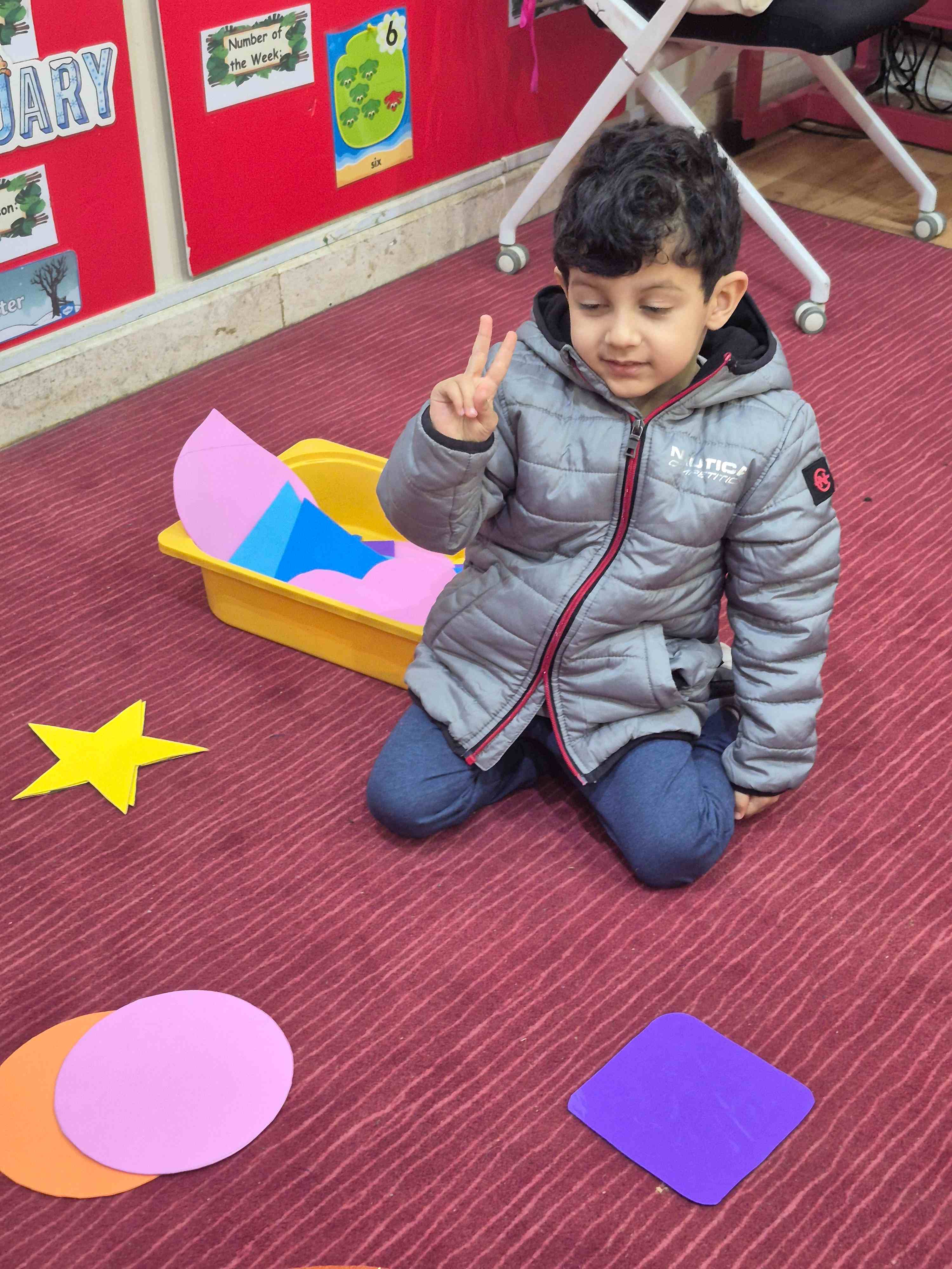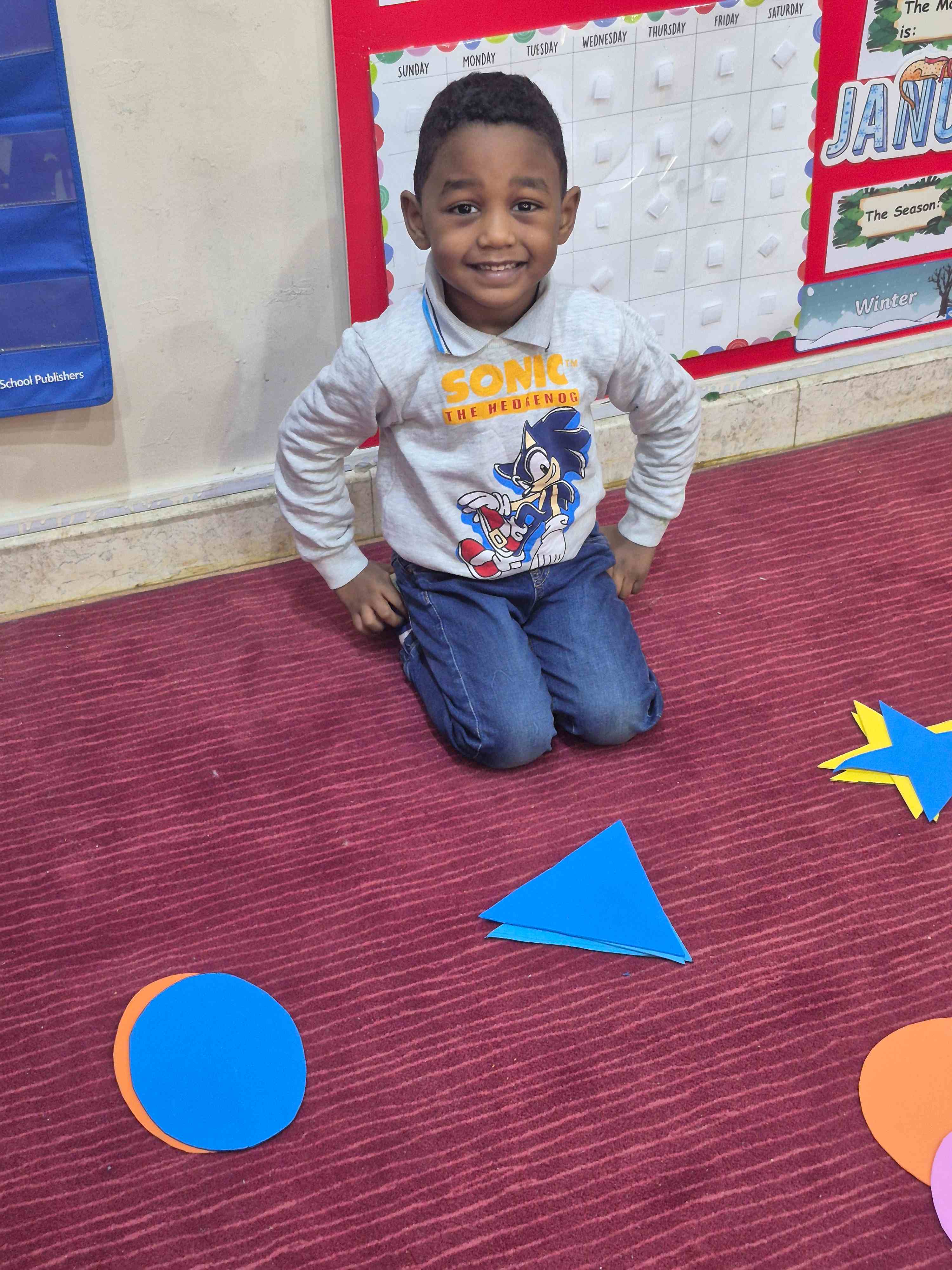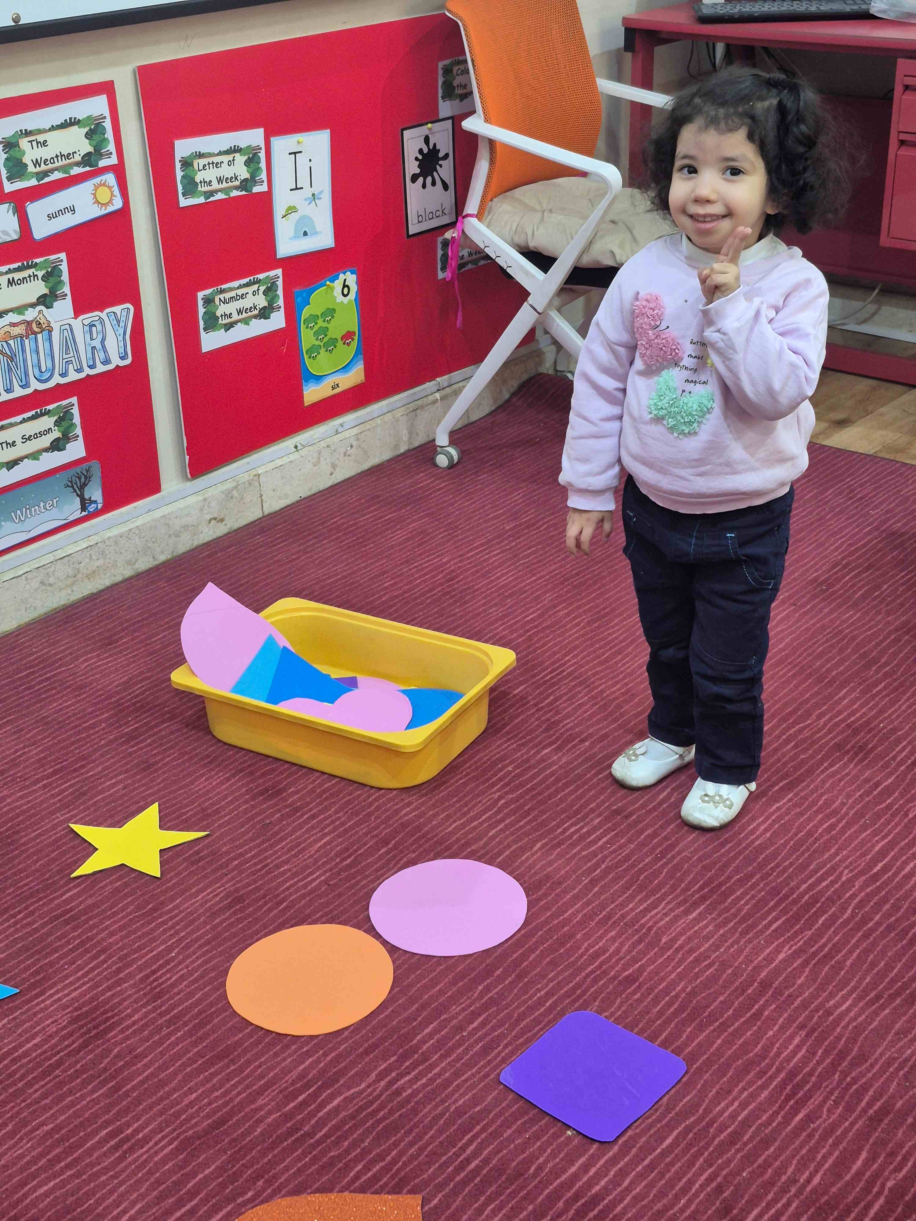 Our KG1 students matched identical shapes by finding the same shape from a box and placing it on the corresponding shape on the floor. Students picked a shape from the box, identified it, and then matched it with the same shape on the floor.