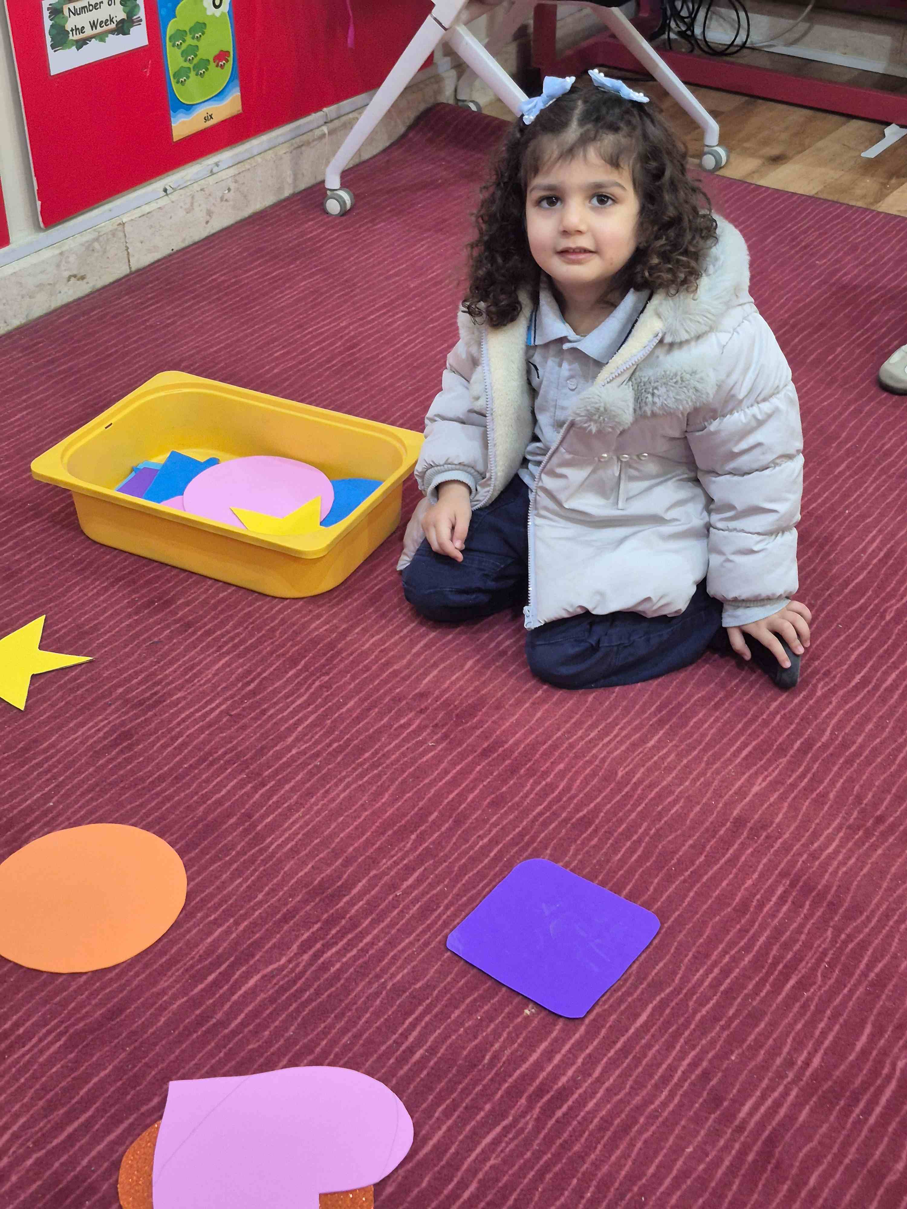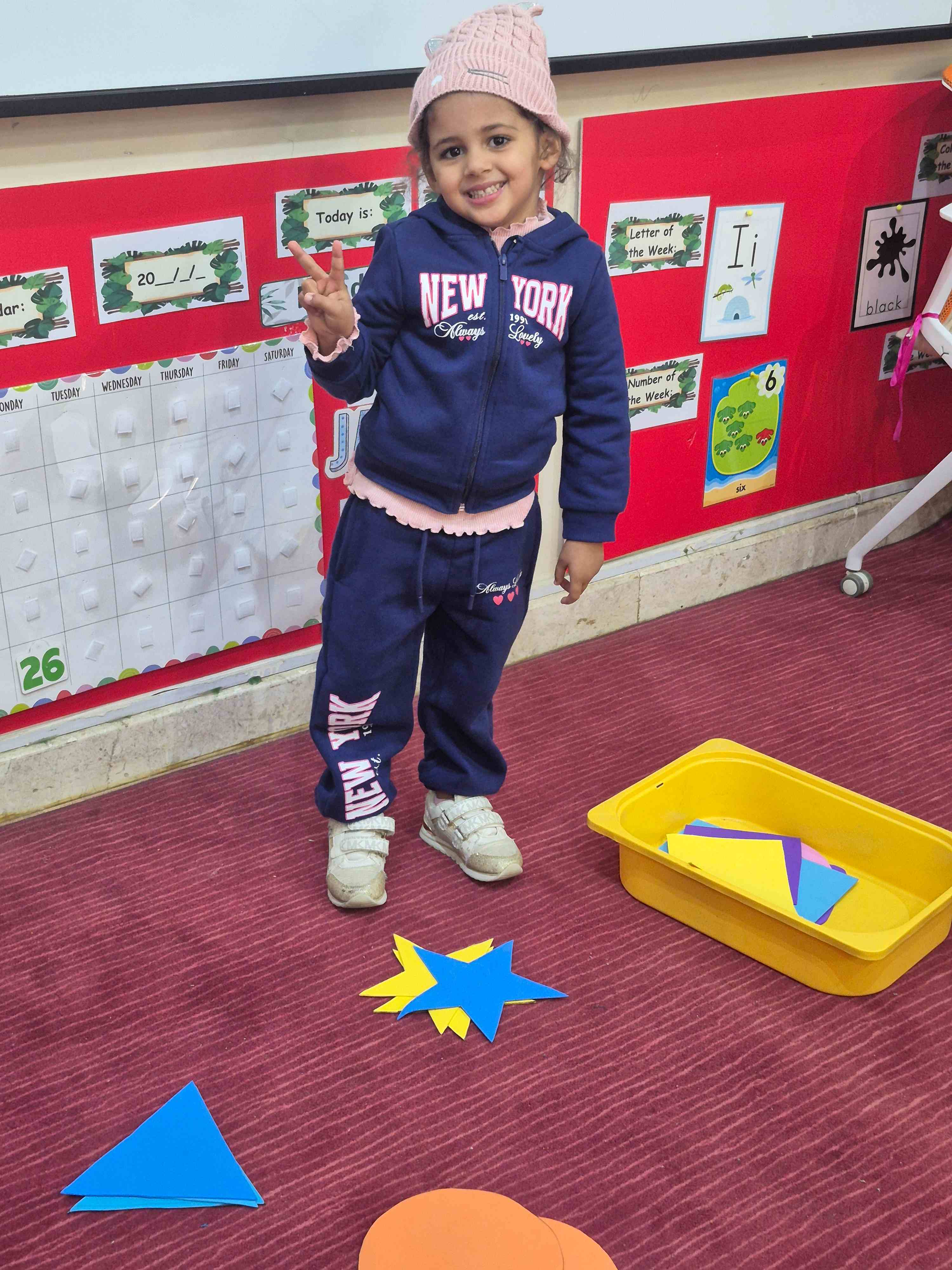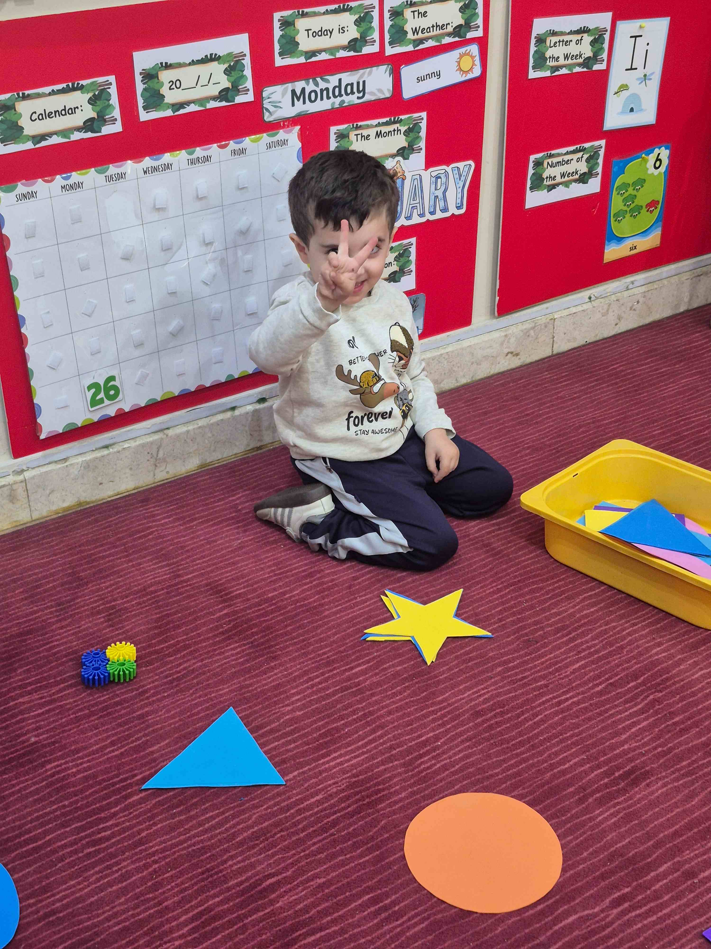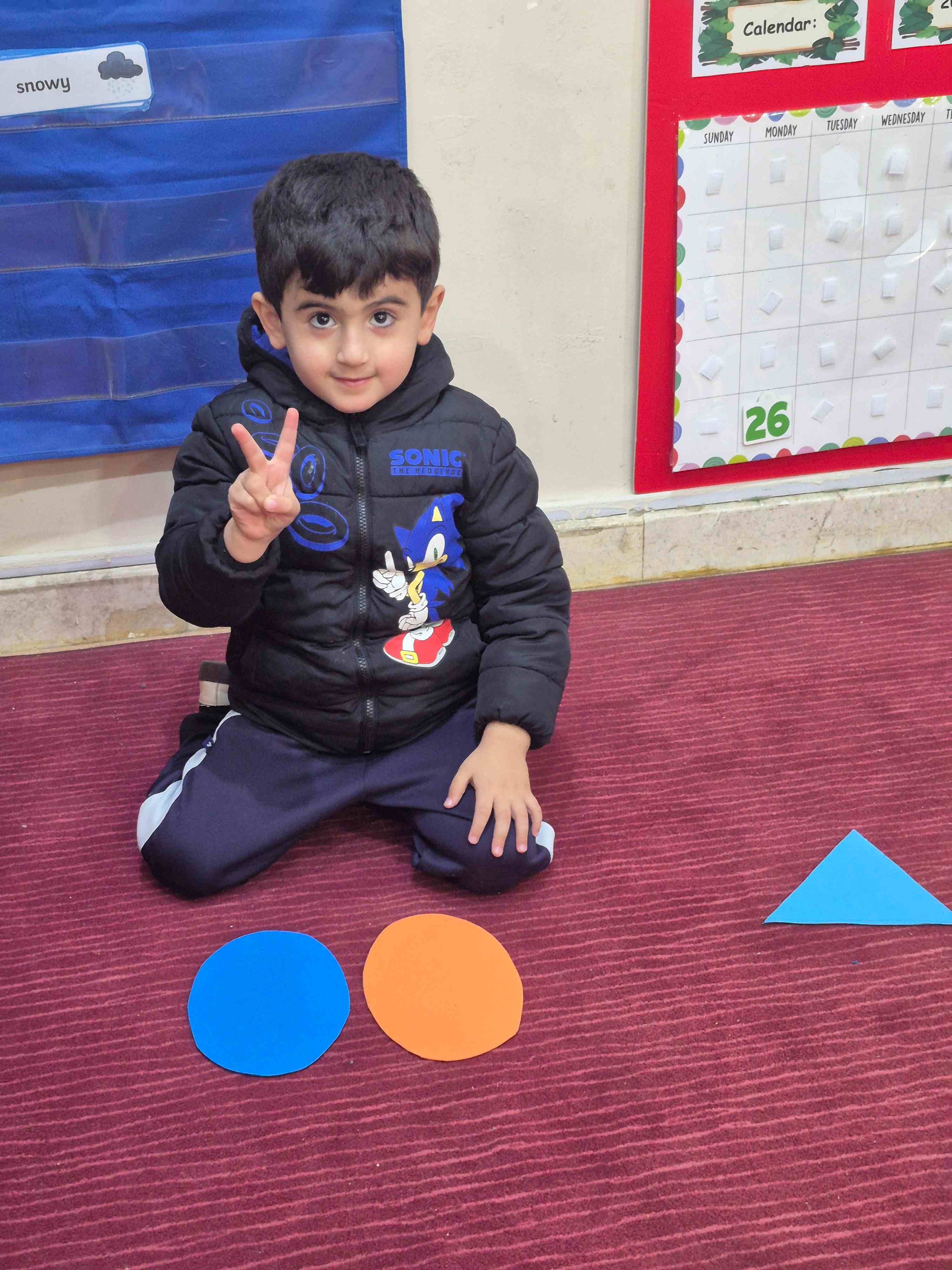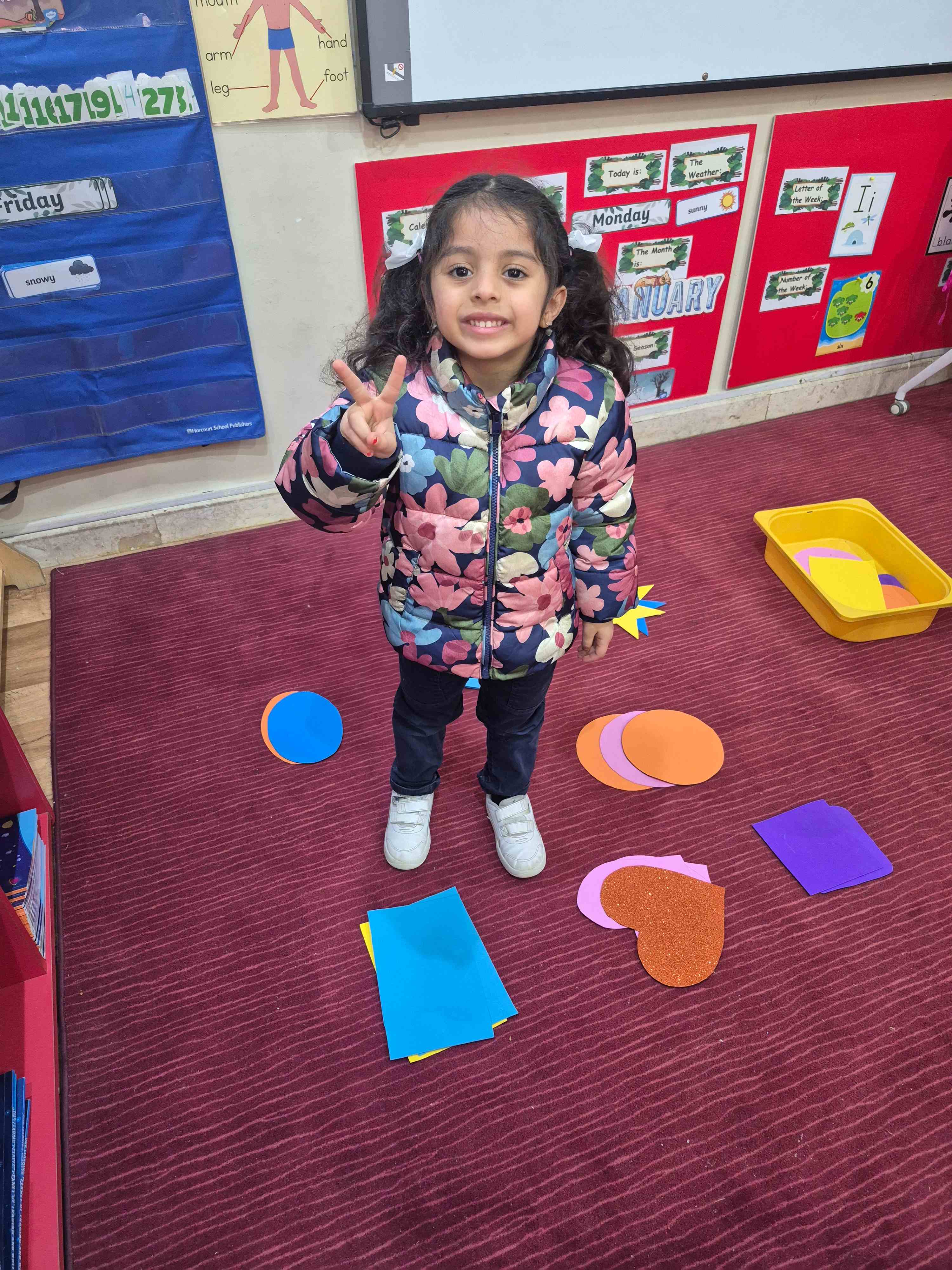 Our KG1 students matched identical shapes by finding the same shape from a box and placing it on the corresponding shape on the floor. Students picked a shape from the box, identified it, and then matched it with the same shape on the floor.
