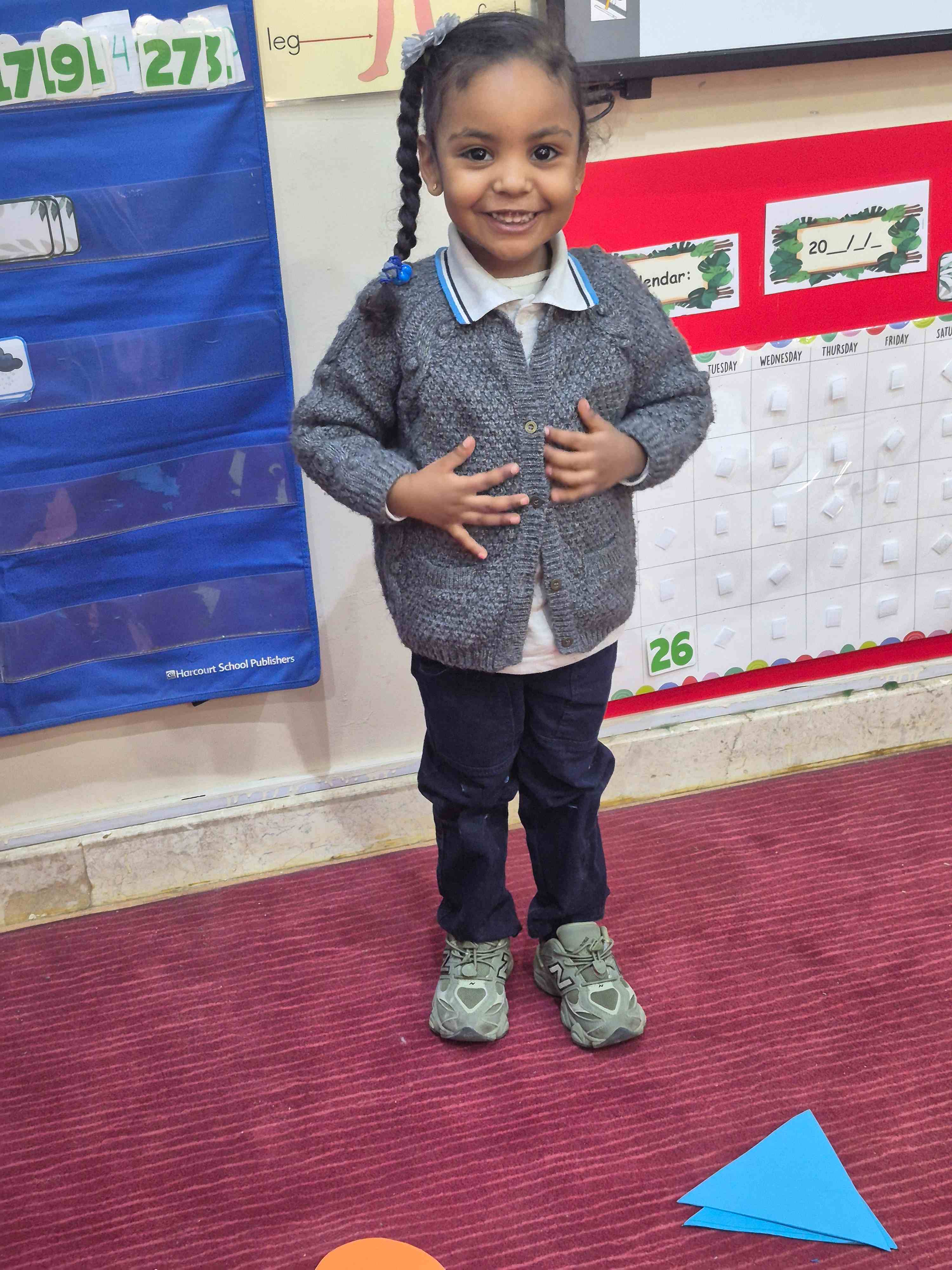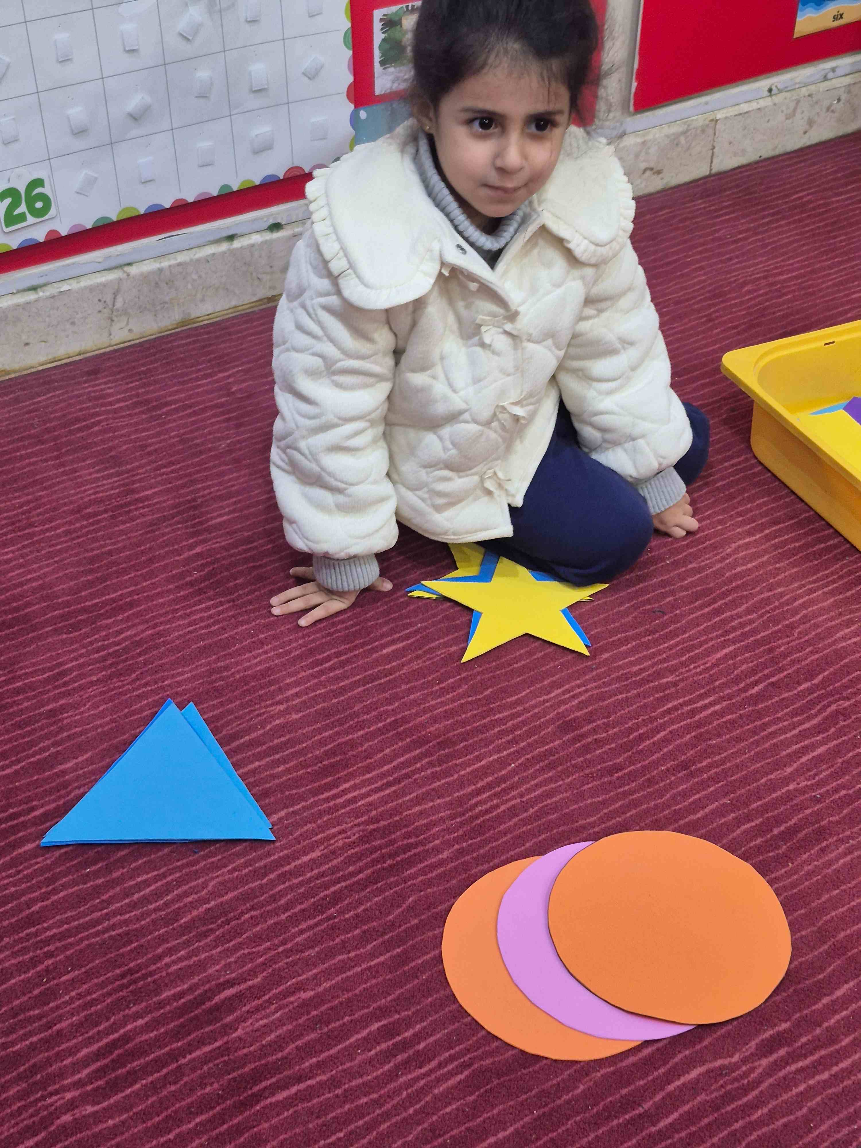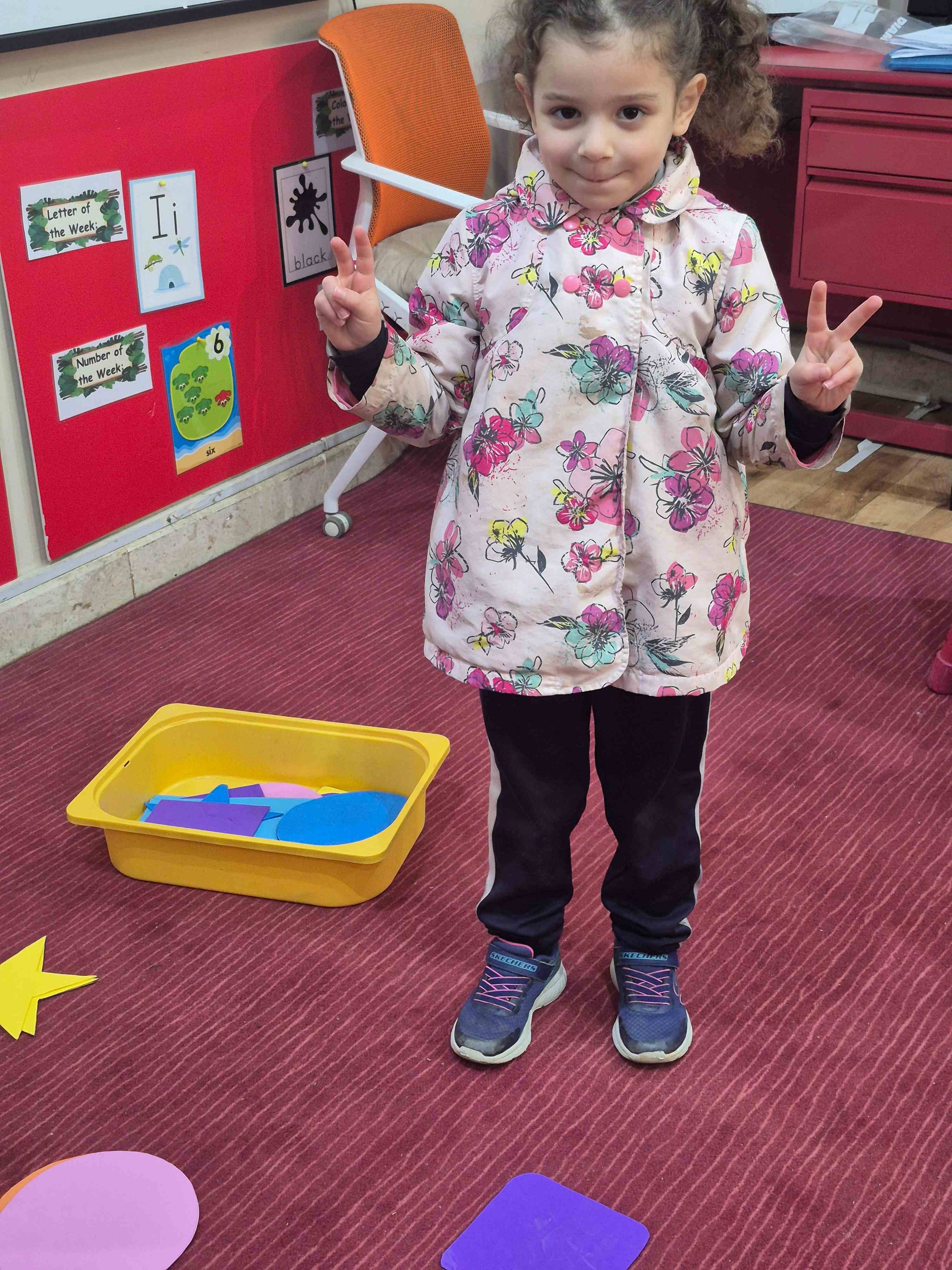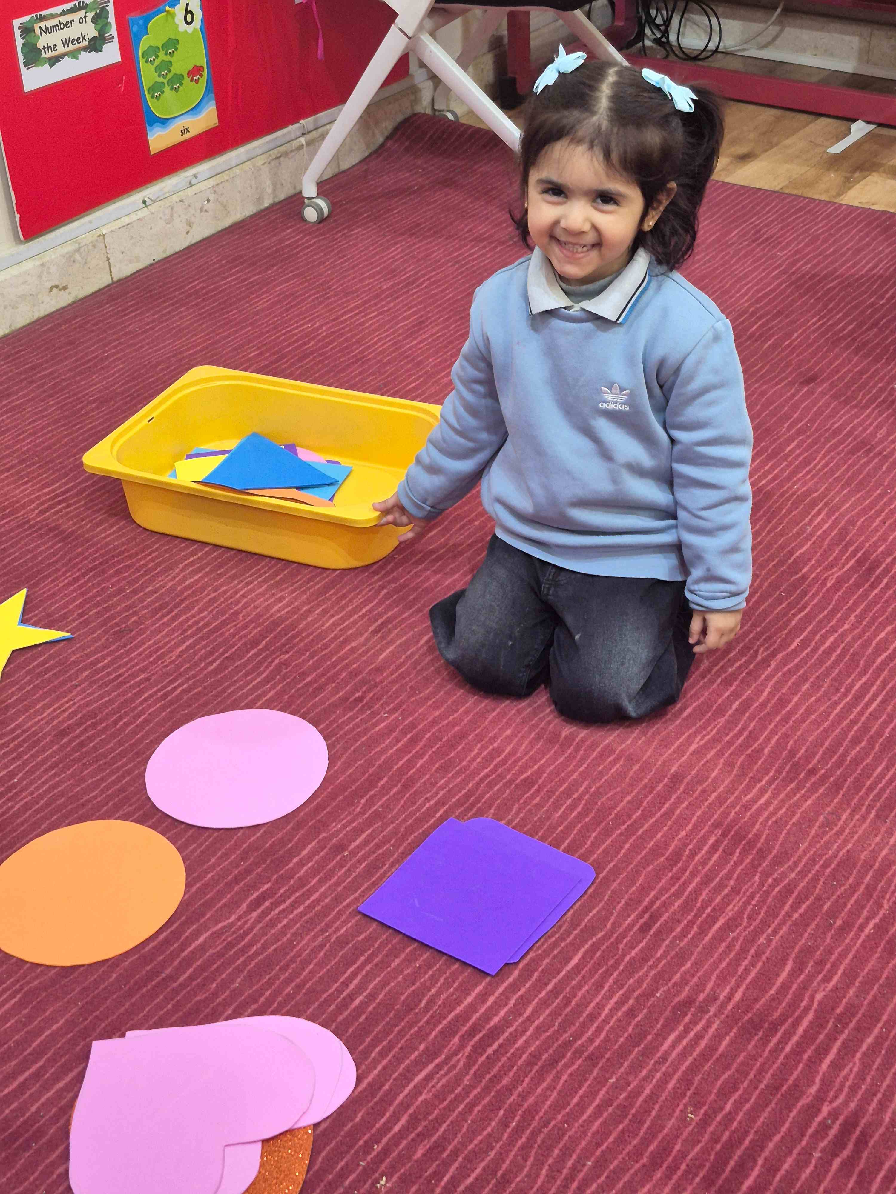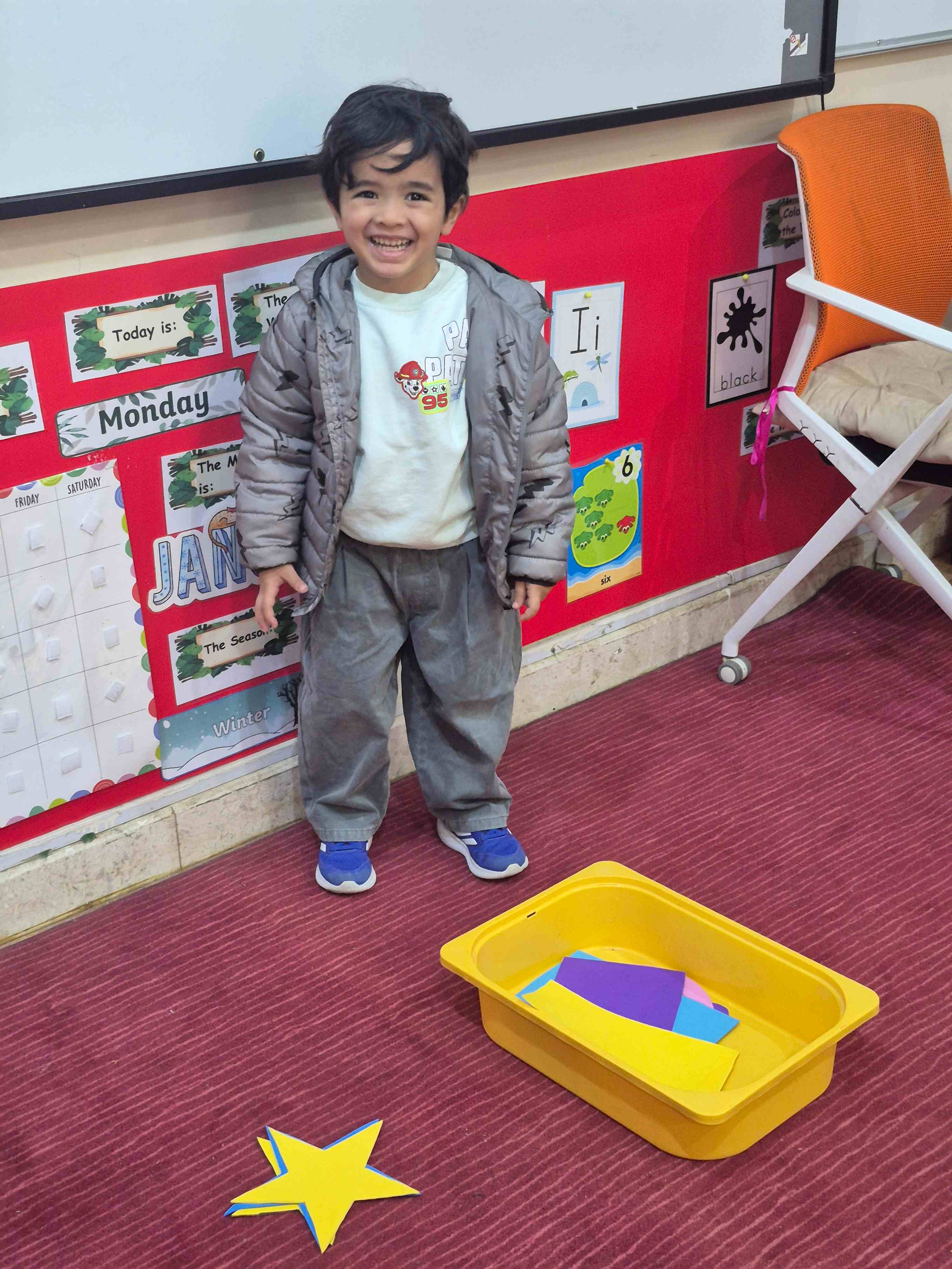 Our KG1 students matched identical shapes by finding the same shape from a box and placing it on the corresponding shape on the floor. Students picked a shape from the box, identified it, and then matched it with the same shape on the floor.