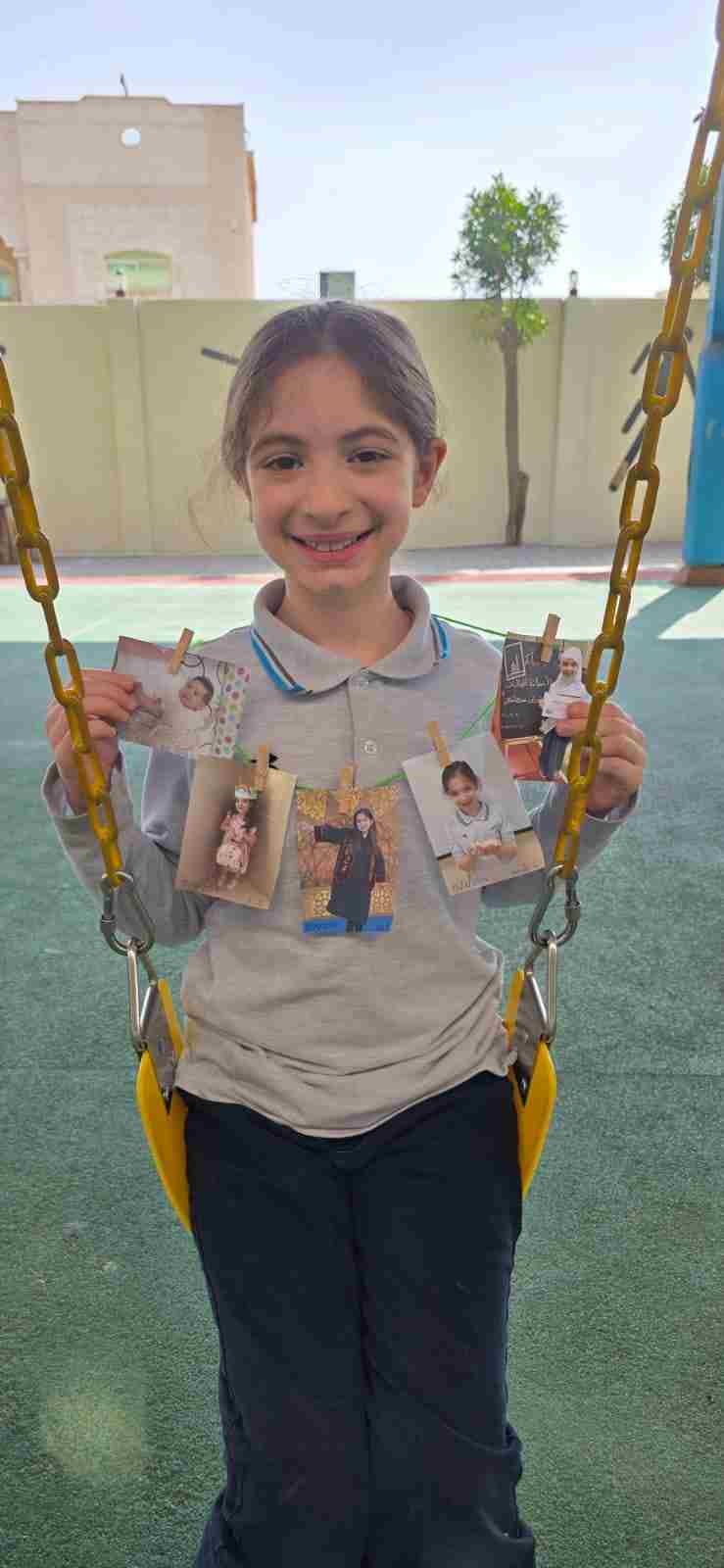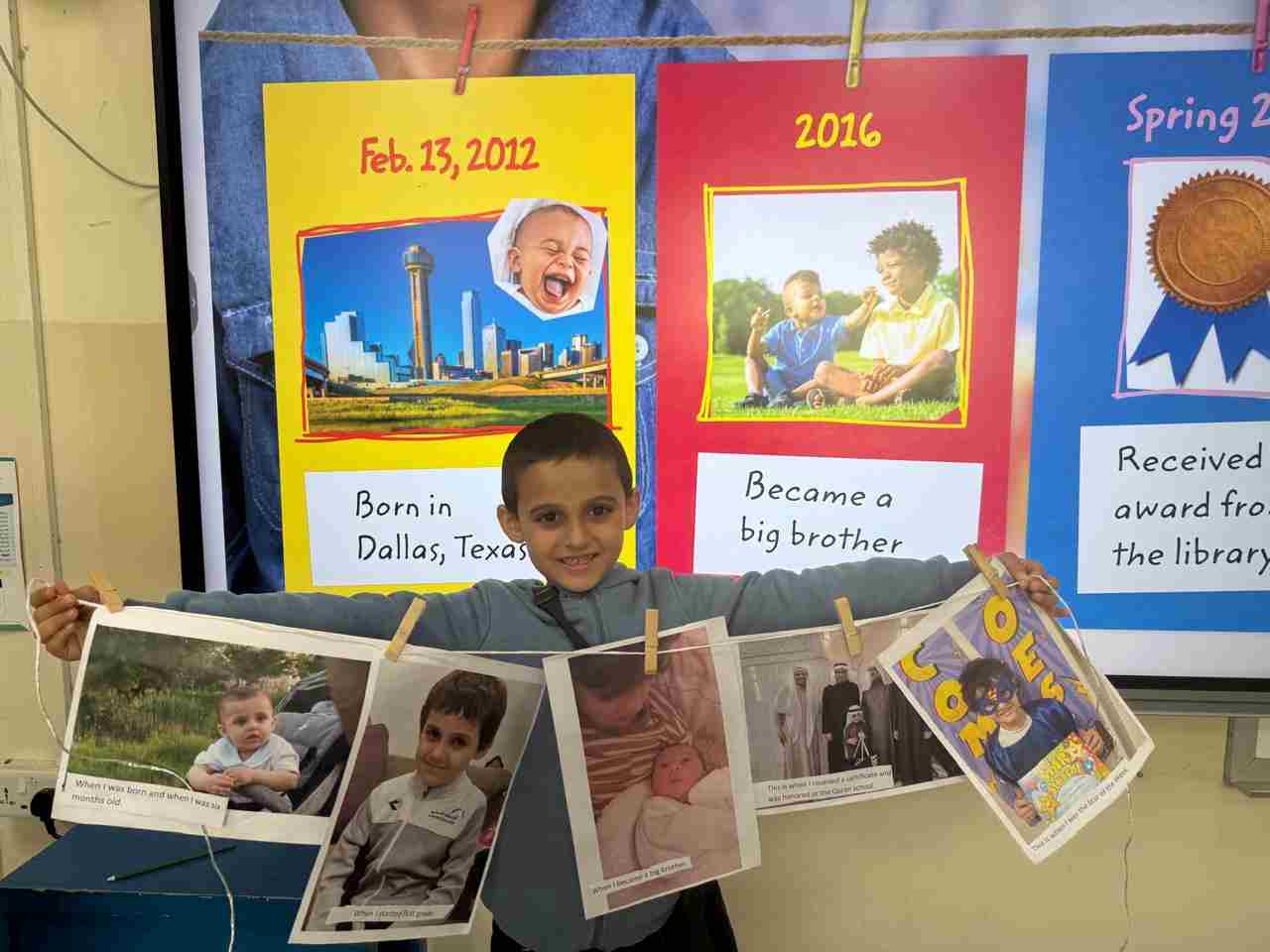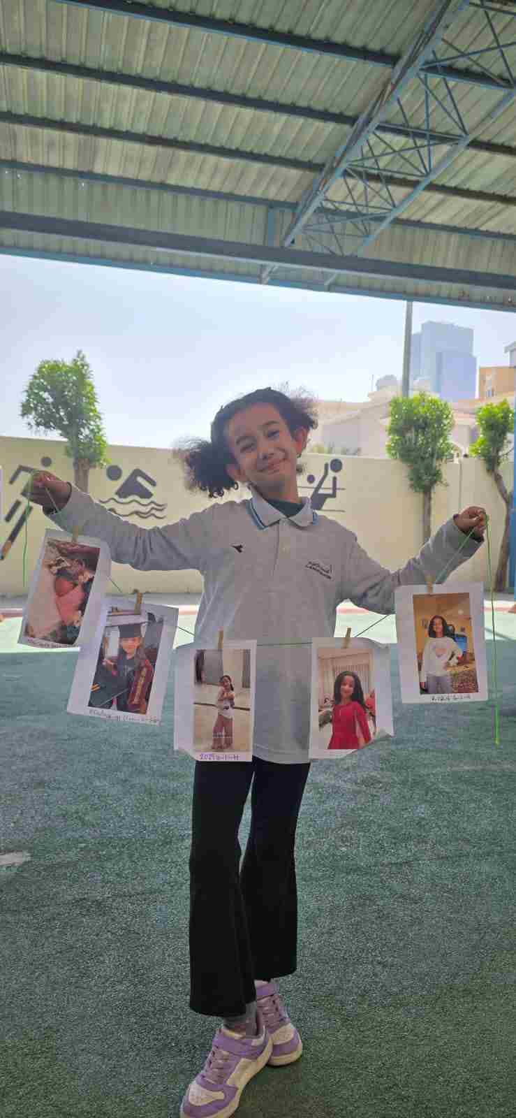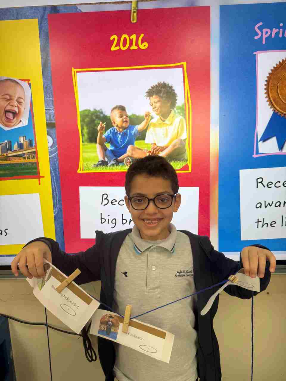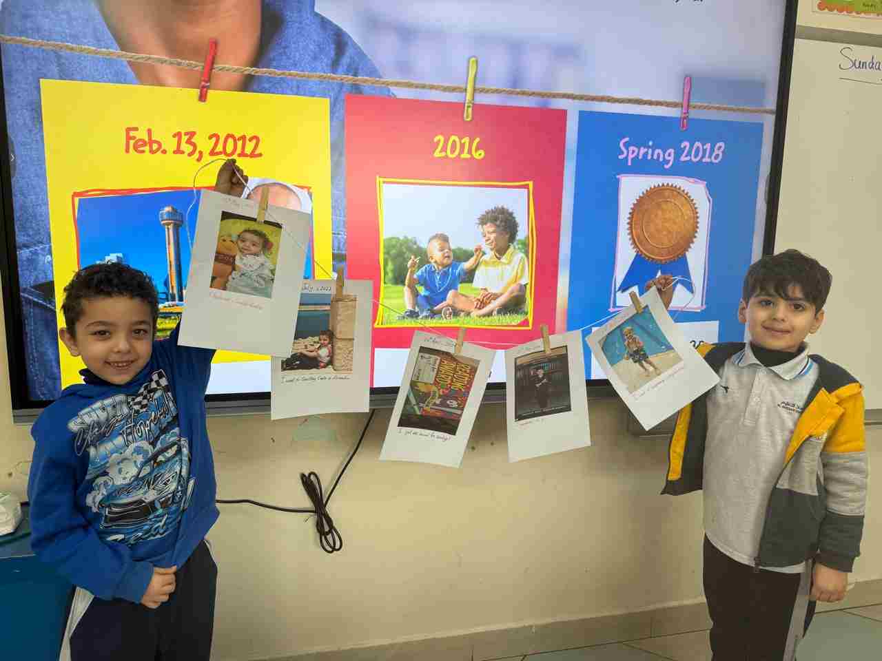 Students in Grade 2, enjoy the English timeline activity at the playground. They talk about events from their life, starting when they were a baby and growing into a child.