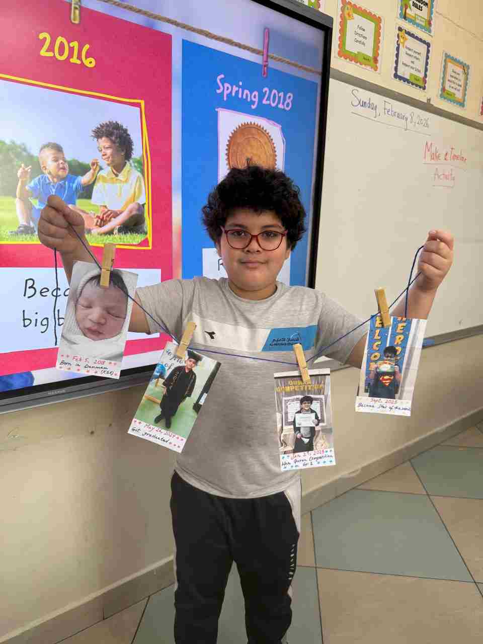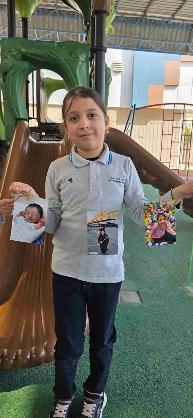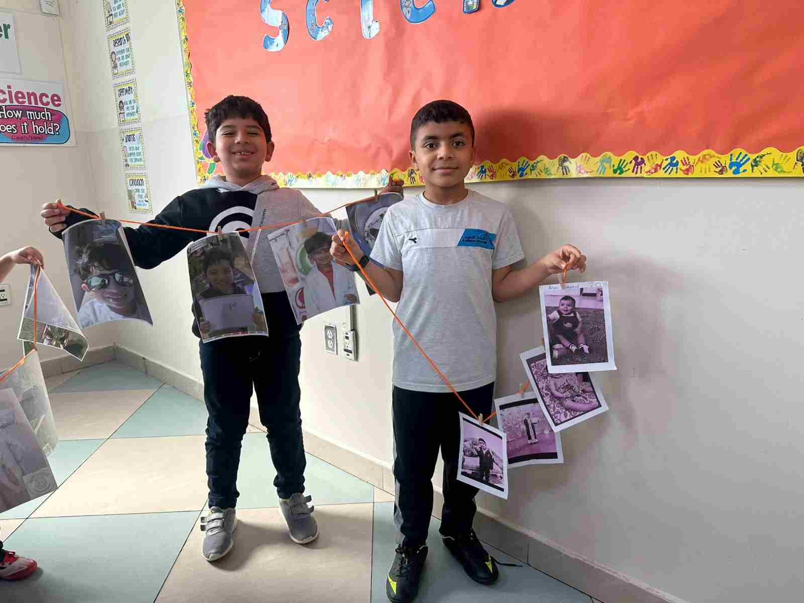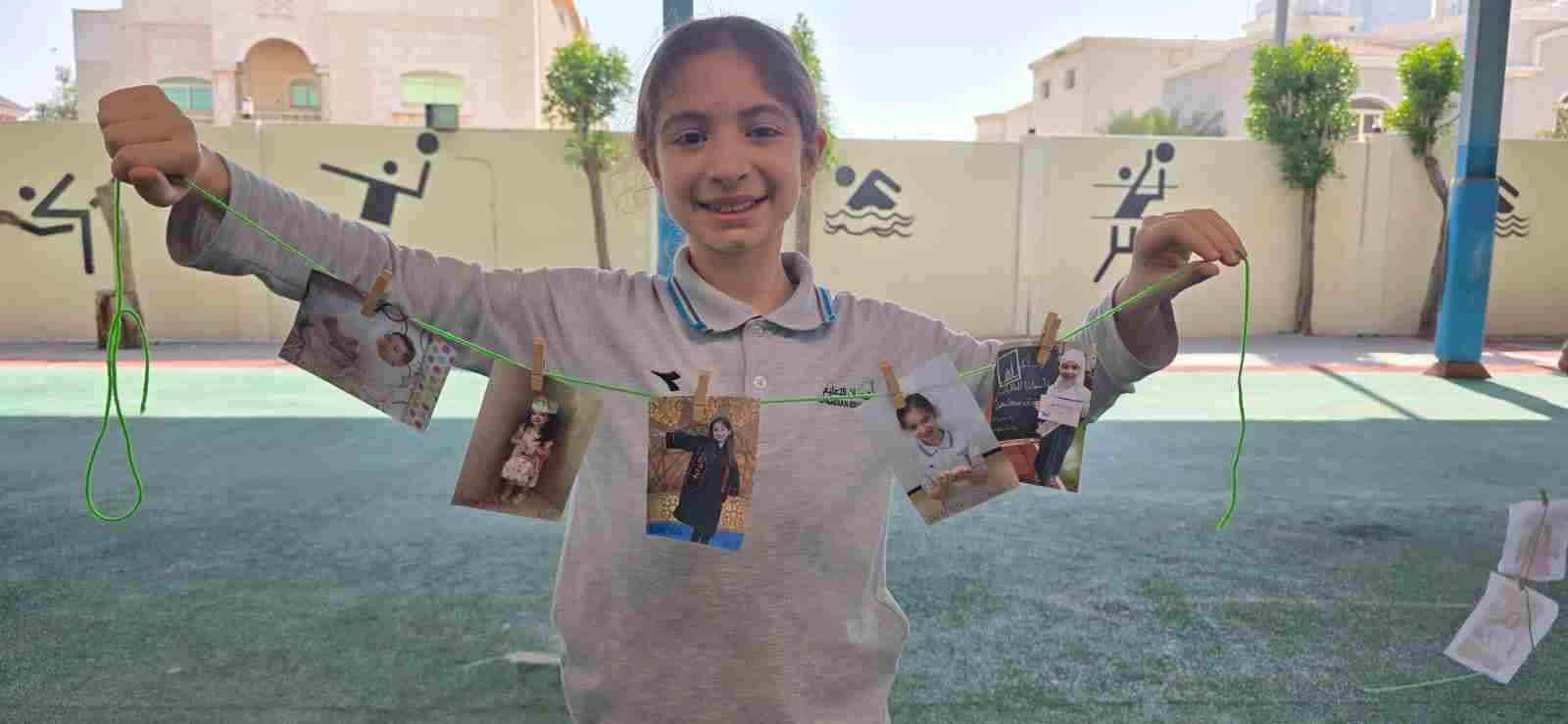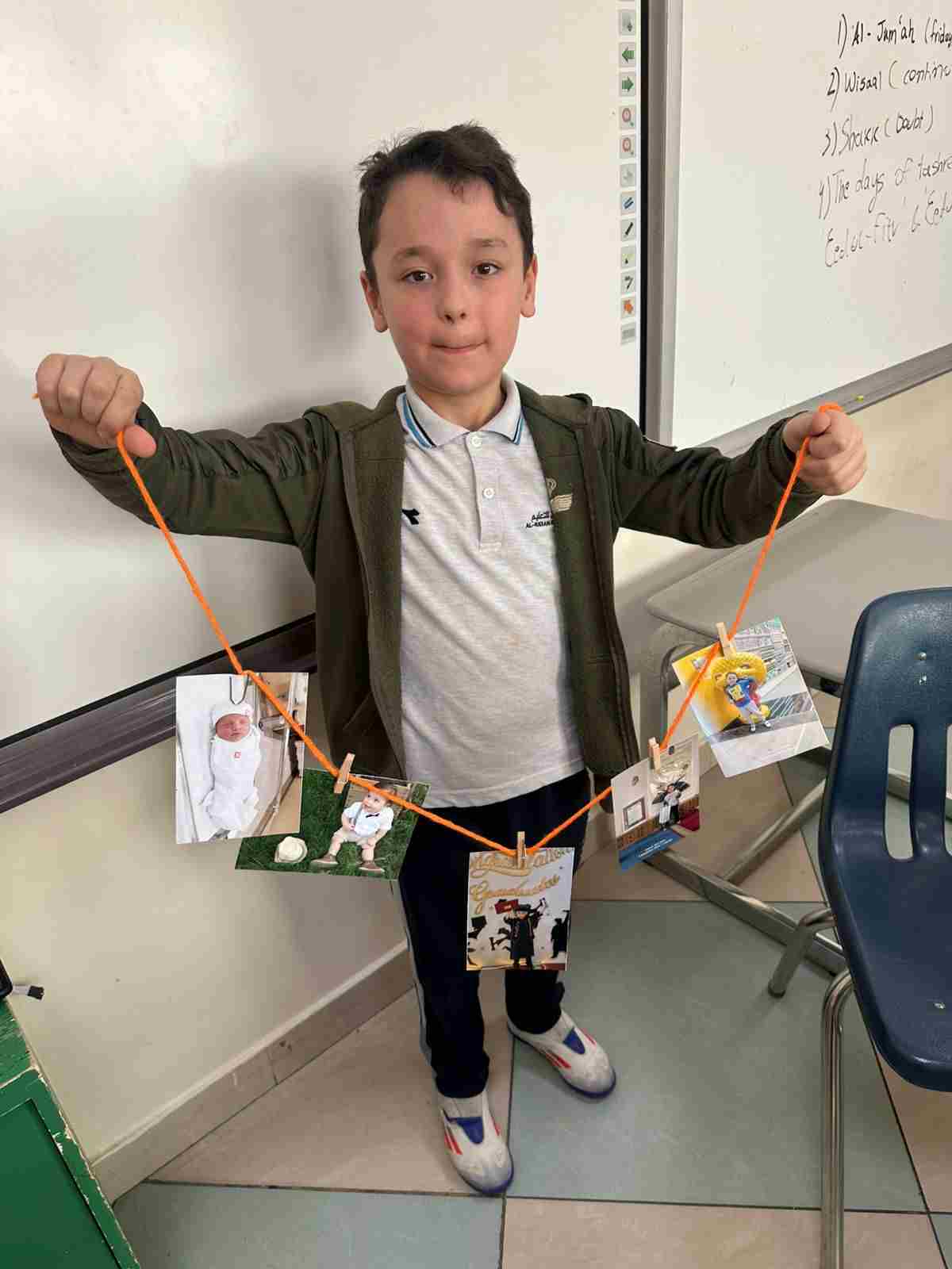 Students in Grade 2, enjoy the English timeline activity at the playground. They talk about events from their life, starting when they were a baby and growing into a child.