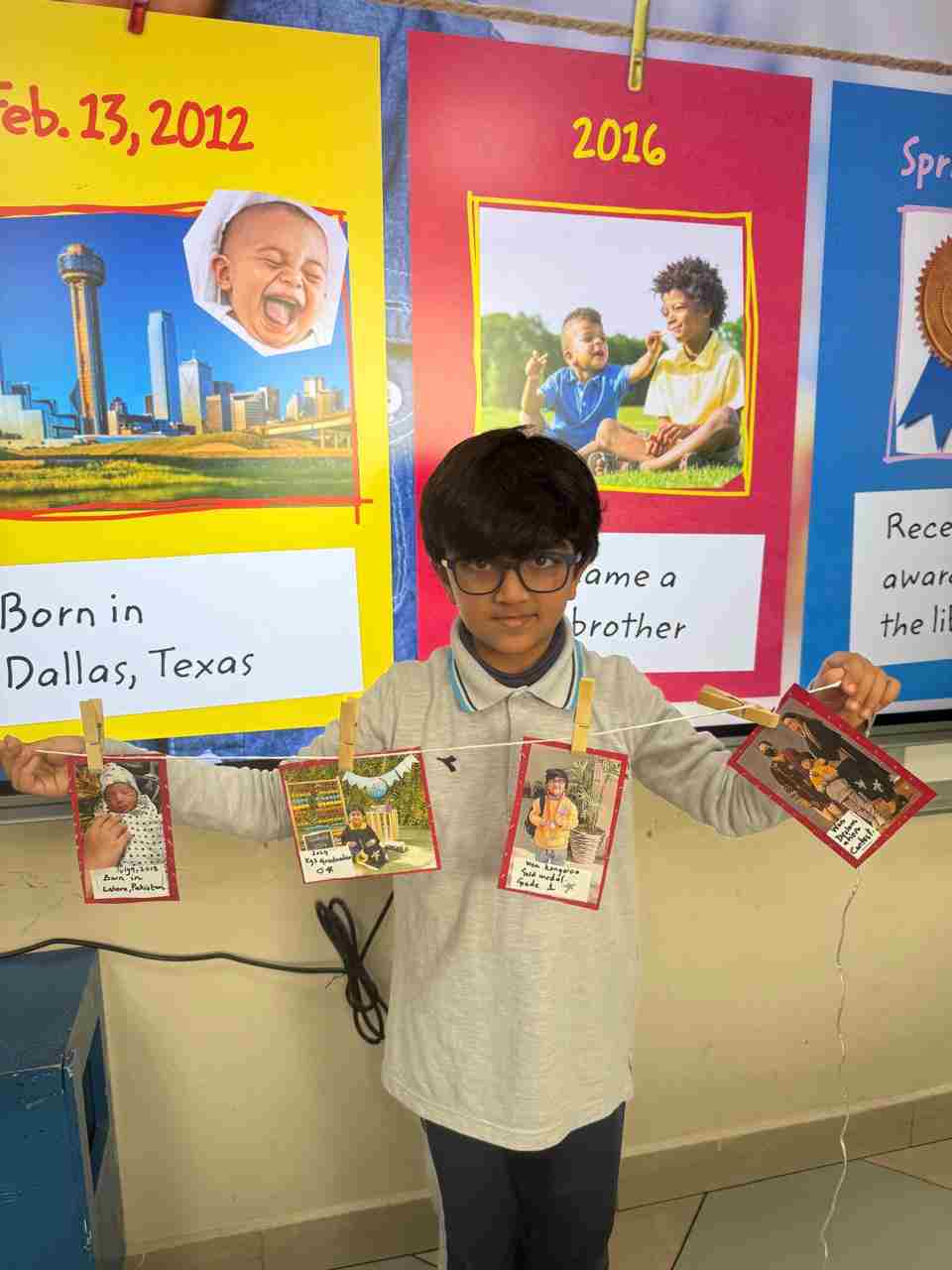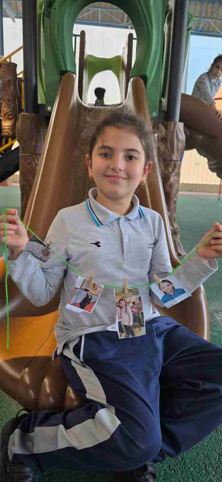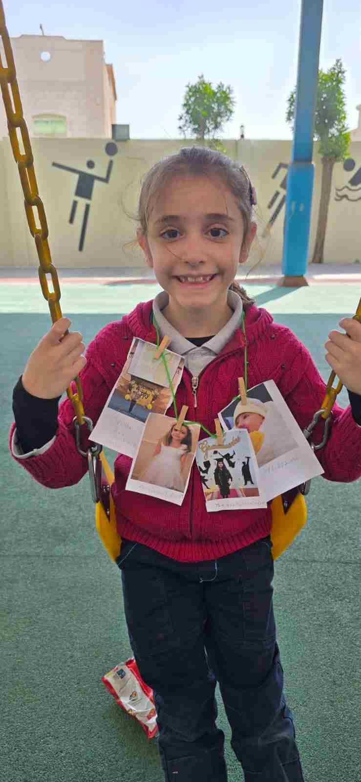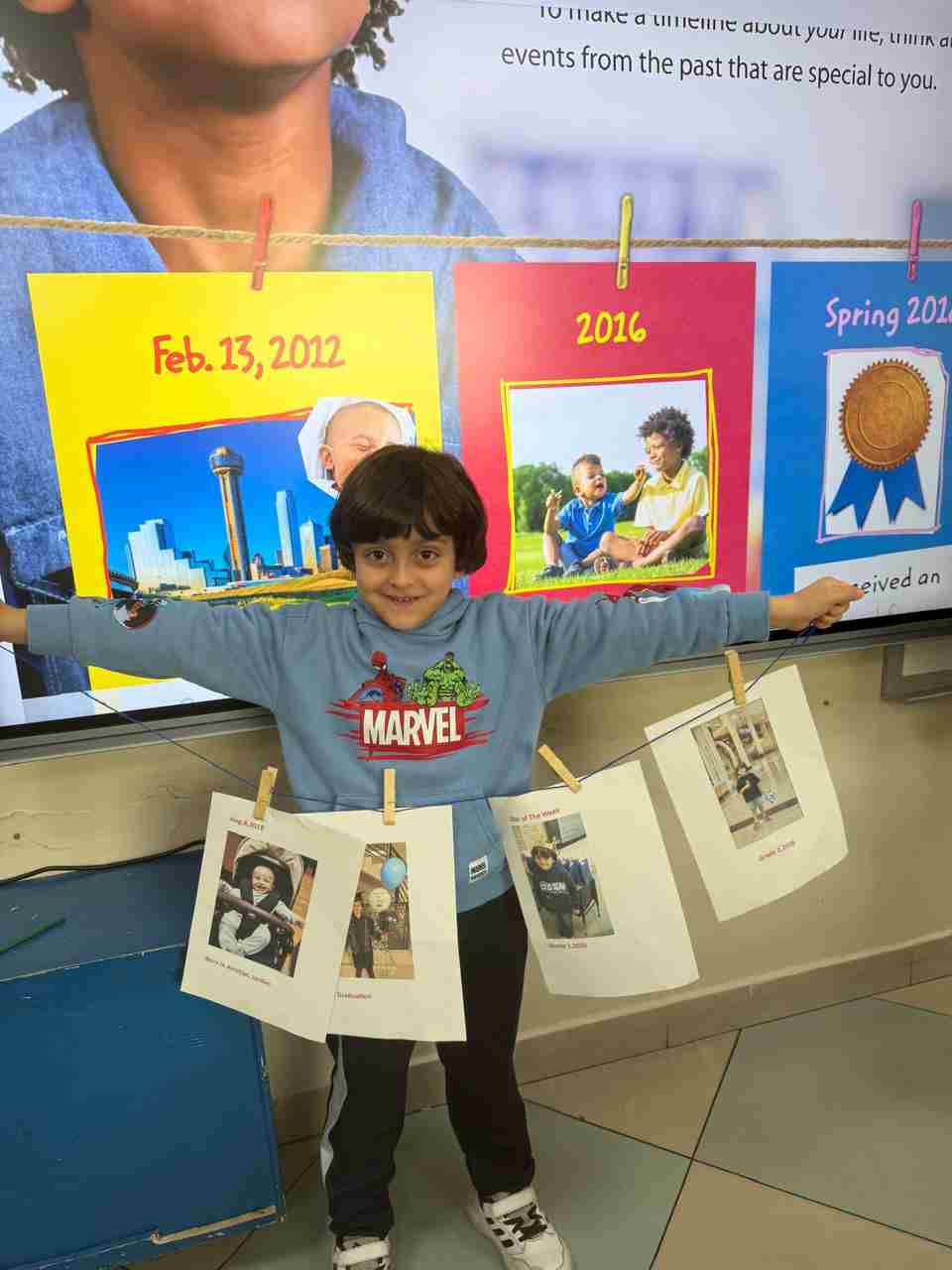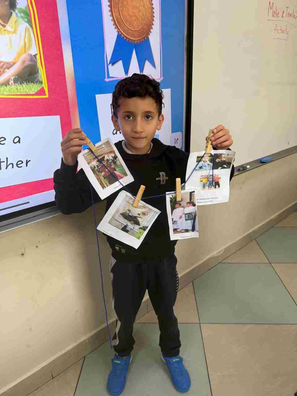 Students in Grade 2, enjoy the English timeline activity at the playground. They talk about events from their life, starting when they were a baby and growing into a child.