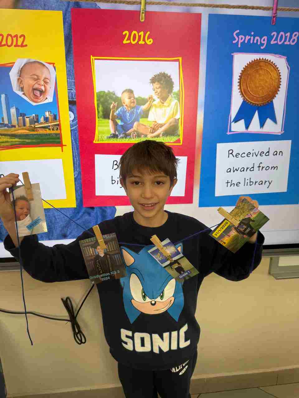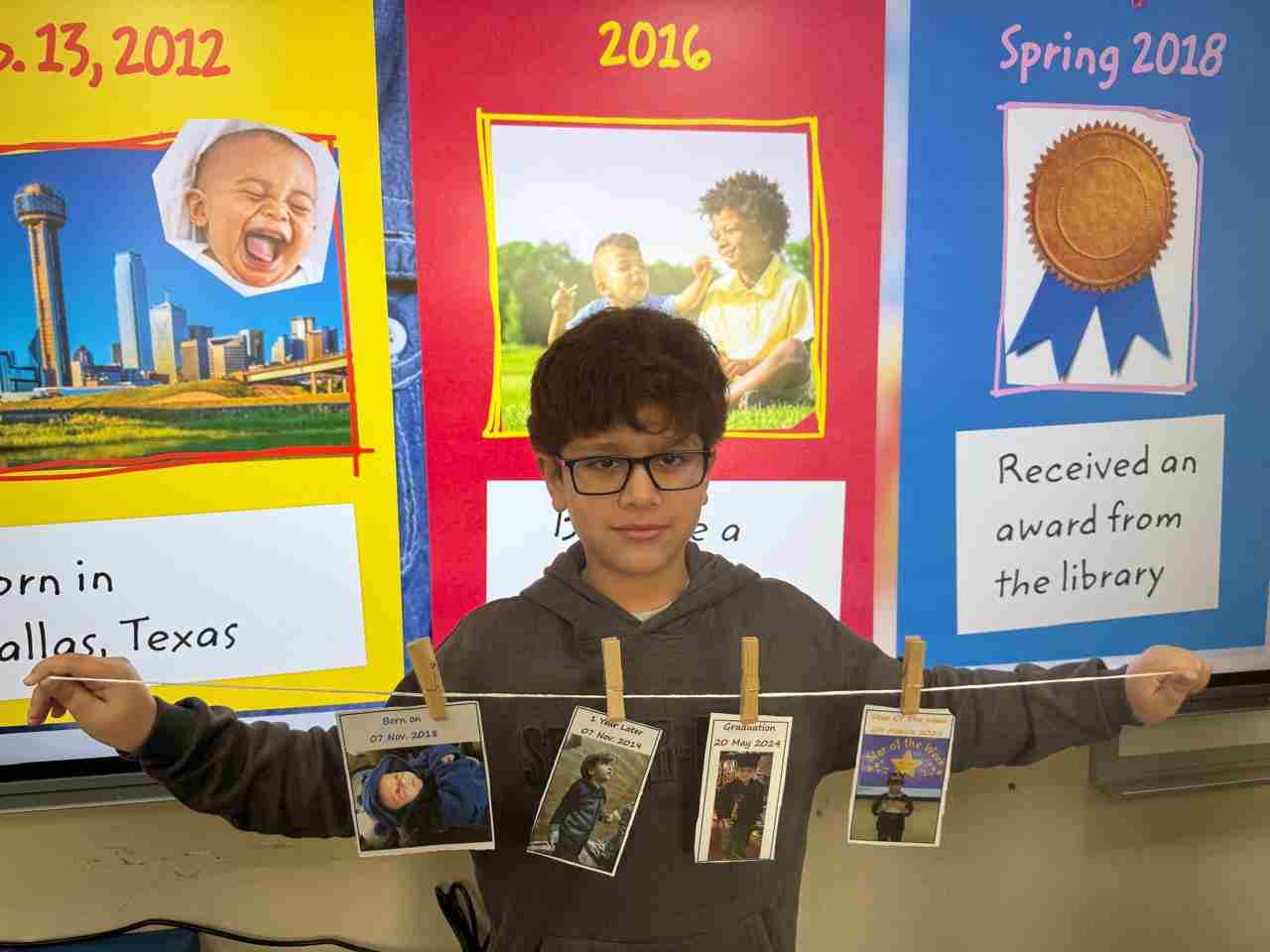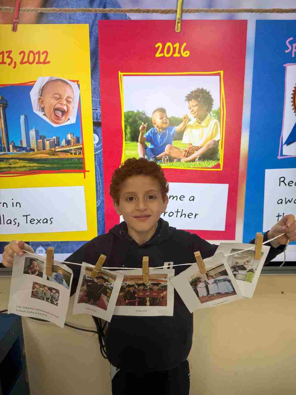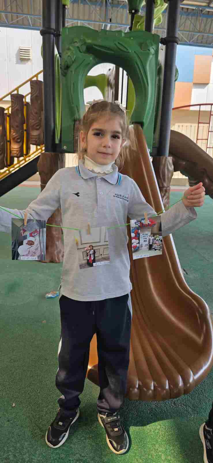 Students in Grade 2, enjoy the English timeline activity at the playground. They talk about events from their life, starting when they were a baby and growing into a child.